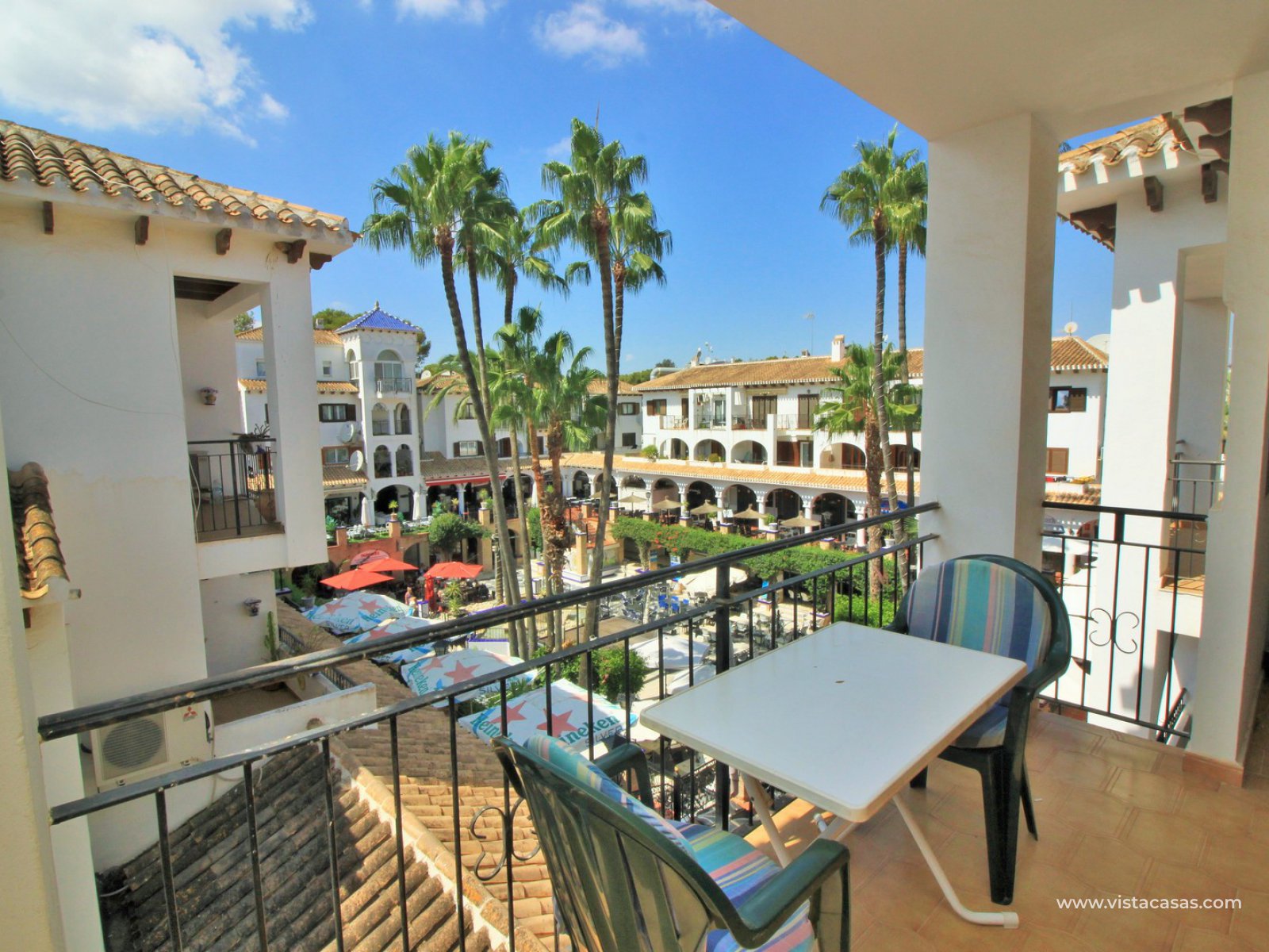 Comprising of a entrance hallway leading into a good sized lounge-dining area with French doors leading out onto the covered balcony, which overlooks the Villamartin Plaza square, and a small utility area to the side. There is a fully fitted separate kitchen, 2 bedrooms with fitted wardrobes, and a family bathroom. The master bedroom is spacious, and has its own en-suite bathroom. The community offers the use of a lovely communal pool, and large garden areas. The Villamartin golf course is just a few minutes walk away! The beaches of the Orihuela Costa, and the Zenia Boulevard shopping mall, are less than a 8 minutes drive away.