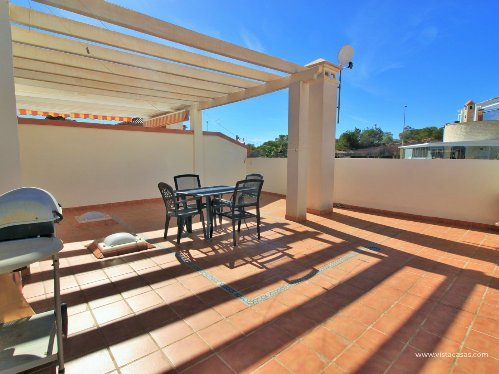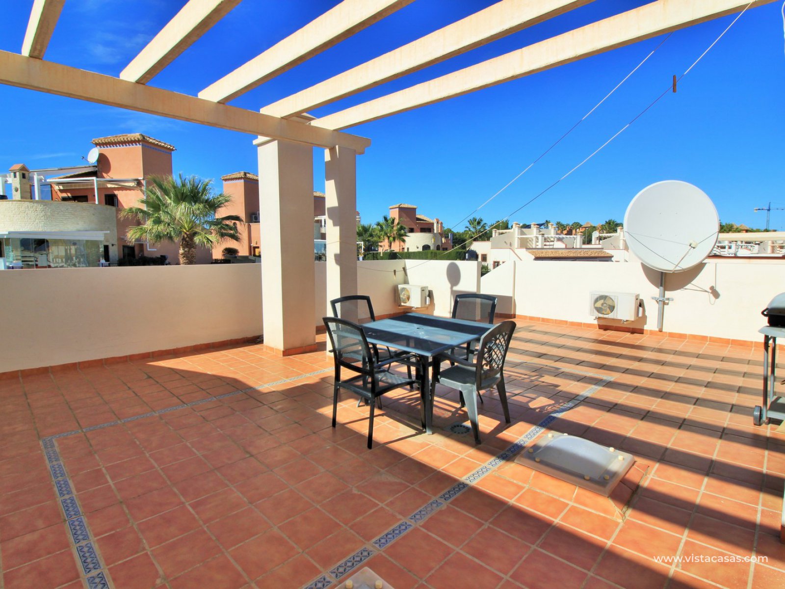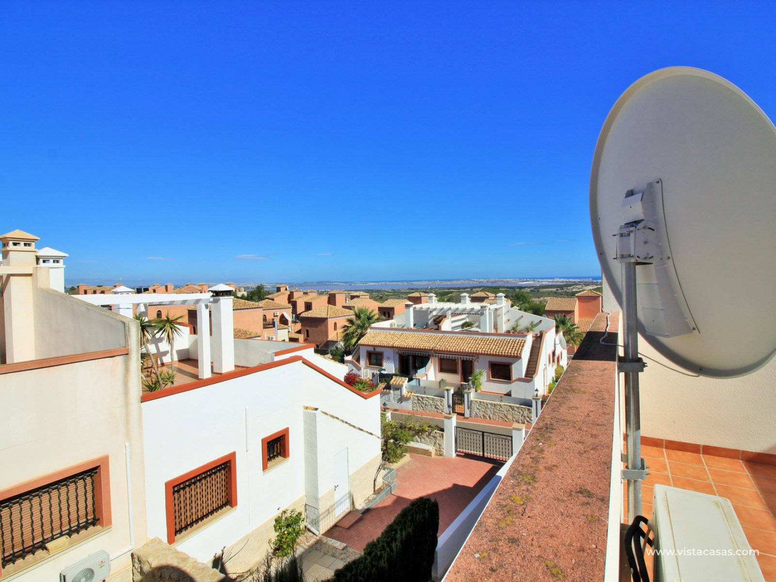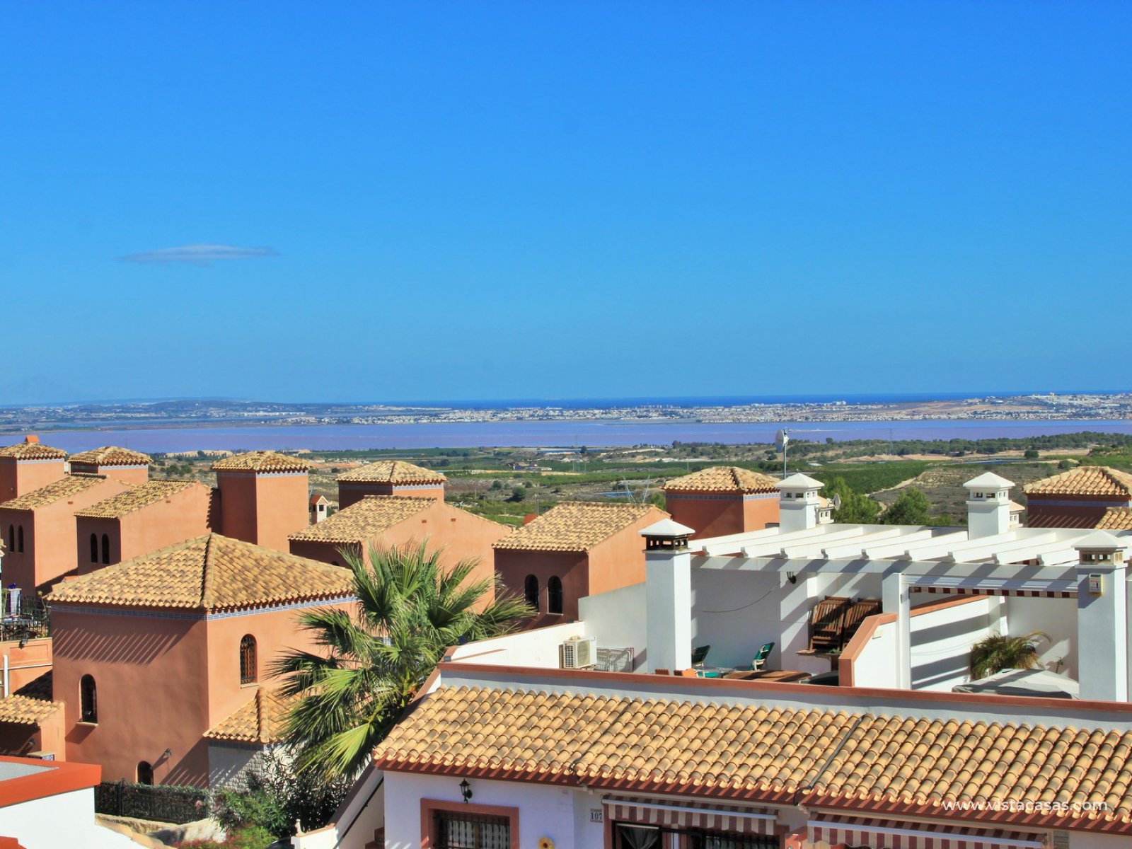 Wonderful Jumilla style bungalow for sale in the gated complex of La Cañada in San Miguel de Salinas. The bungalow is located in the secure gated community of La Cañada Phase II, with use of a communal pool, and offers great views of the sea, countryside and the Torrevieja salt lakes from the massive roof solarium. The current owners have taken very good care of the property, and is sold furnished with white goods. The property offers a very generous plot size with off-road parking and storage room.