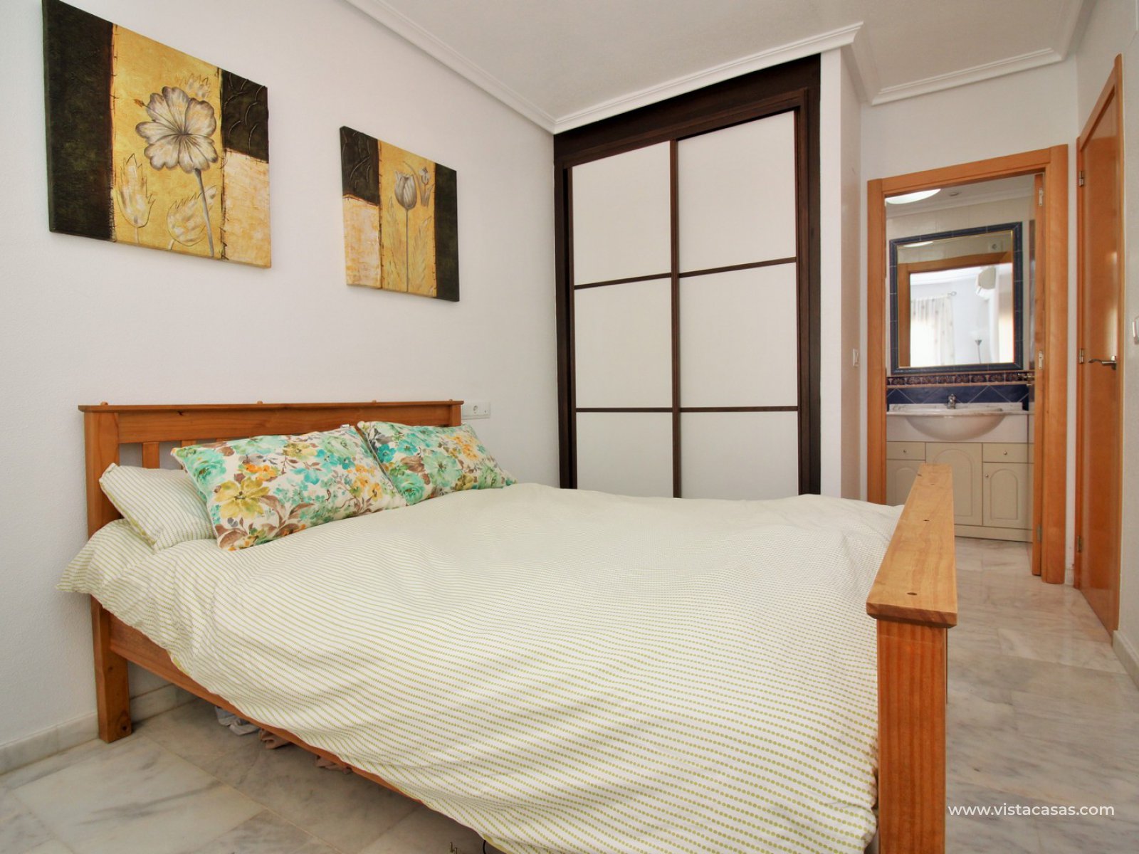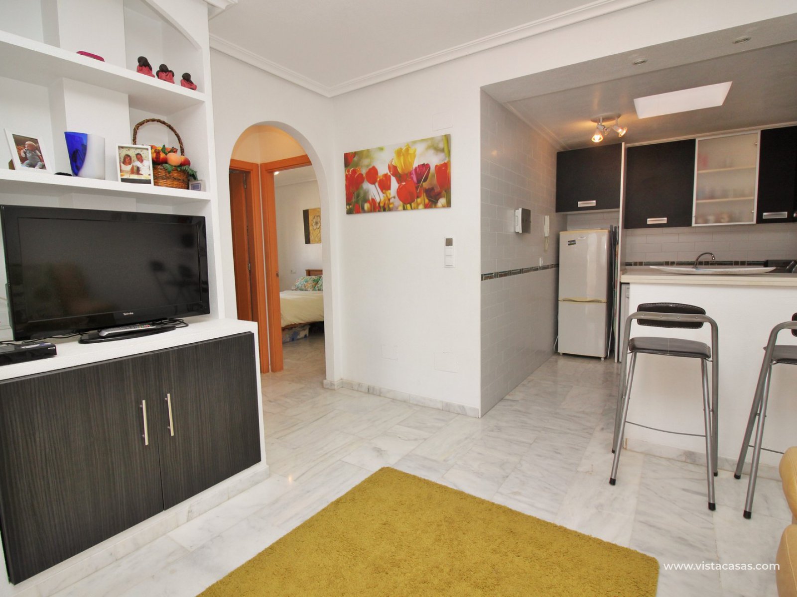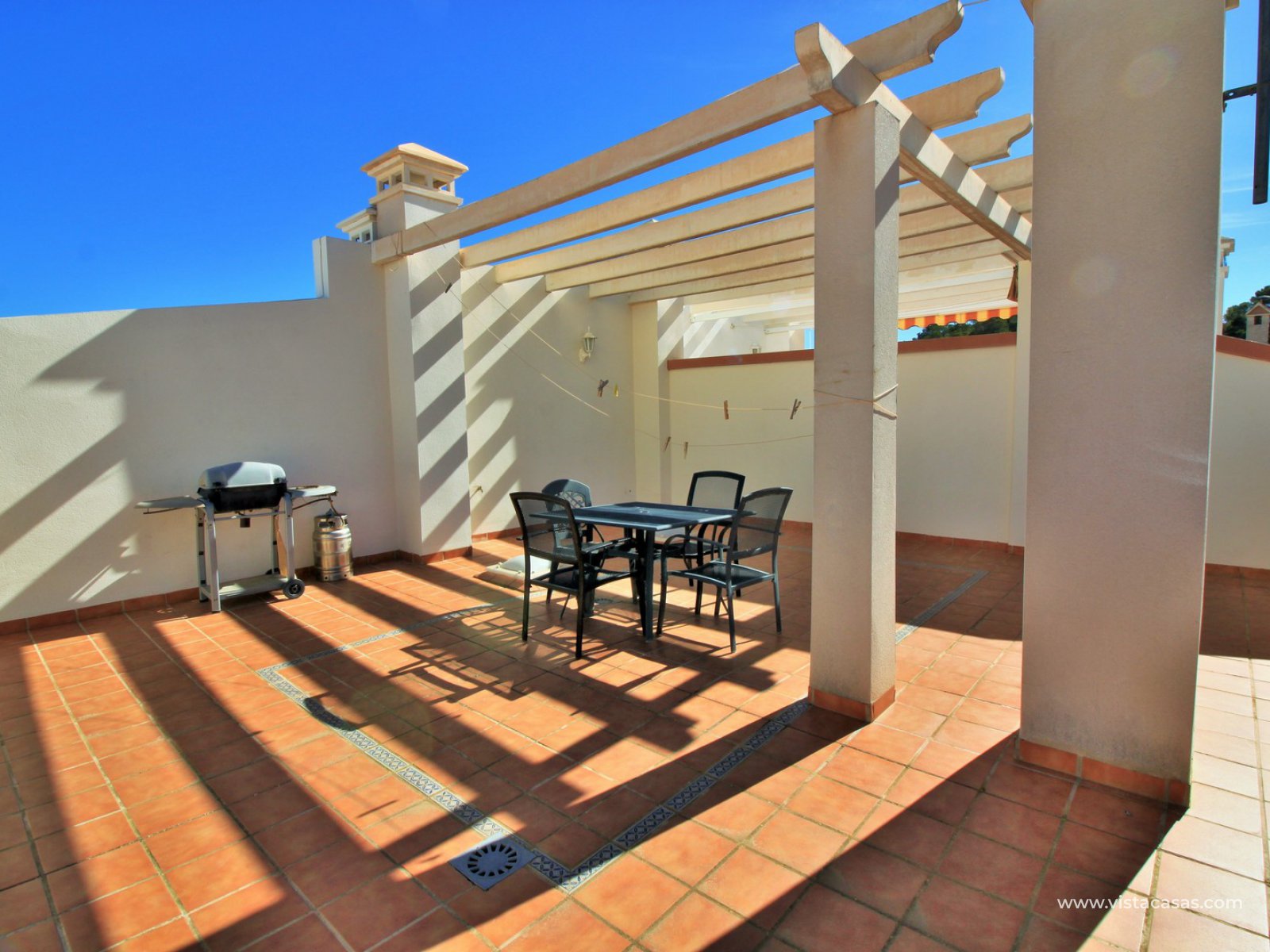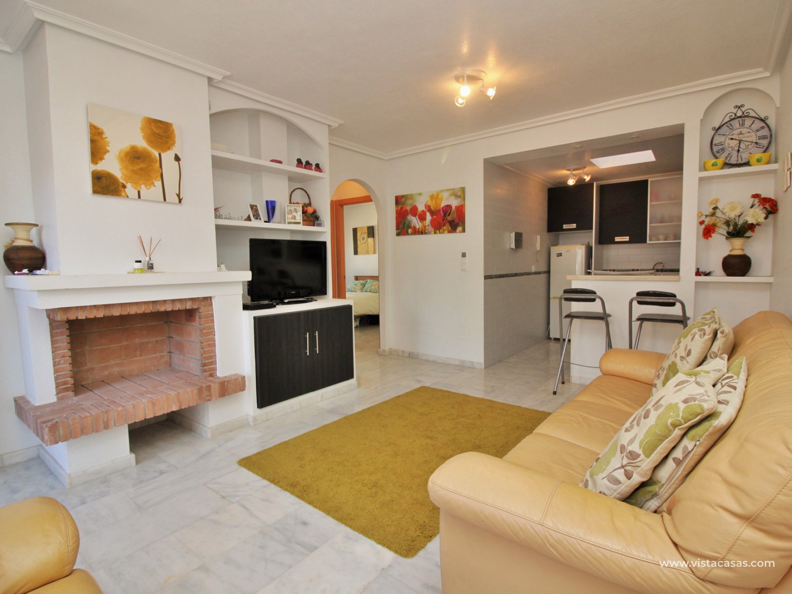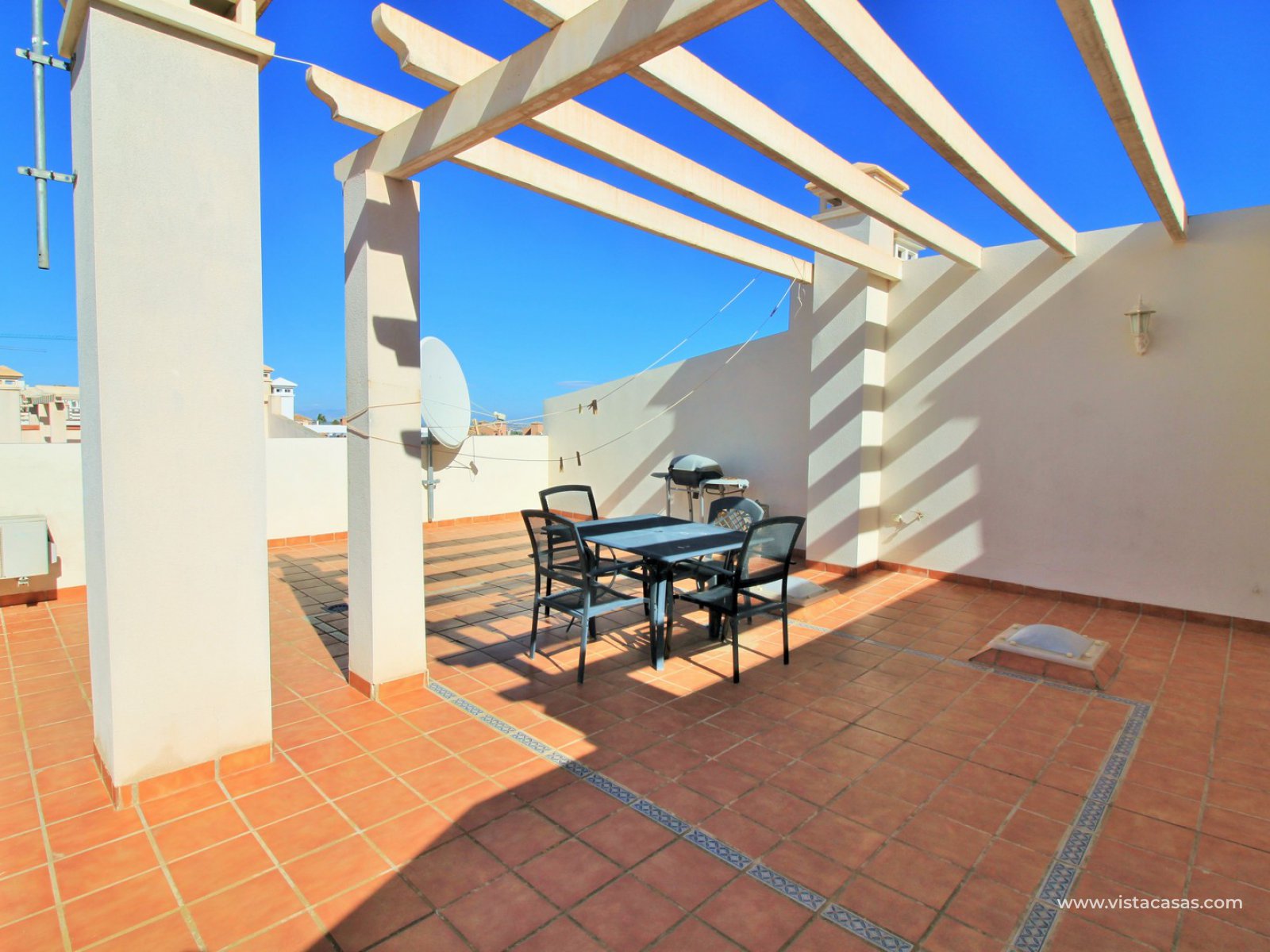 The living accommodation comprises of a lounge-dining area with feature fireplace, a renovated kitchen to the rear with breakfast bar, 2 bedrooms with fitted wardrobes and a family bathroom. The master bedroom benefits from its own en-suite bathroom with walk-in shower. The property is bright and has beautiful marble flooring throughout. Another great additional is that the kitchen and en-suite bathroom have skylights to fully take advantage of natural light. Outside, there is a raised terrace perfect for dining on. External stairs leads up to the huge roof solarium offering the most amazing views of the Mediterranean sea and the Torrevieja salt lakes.