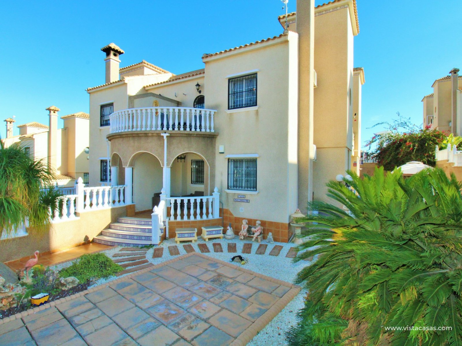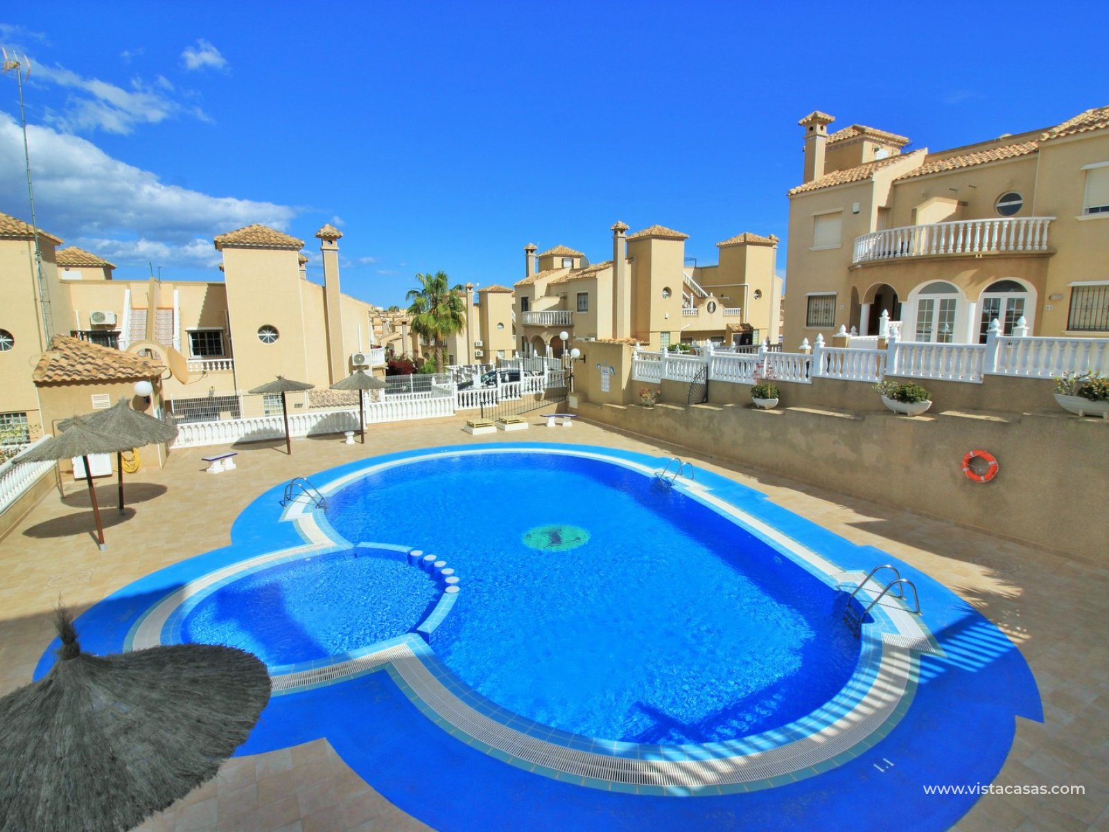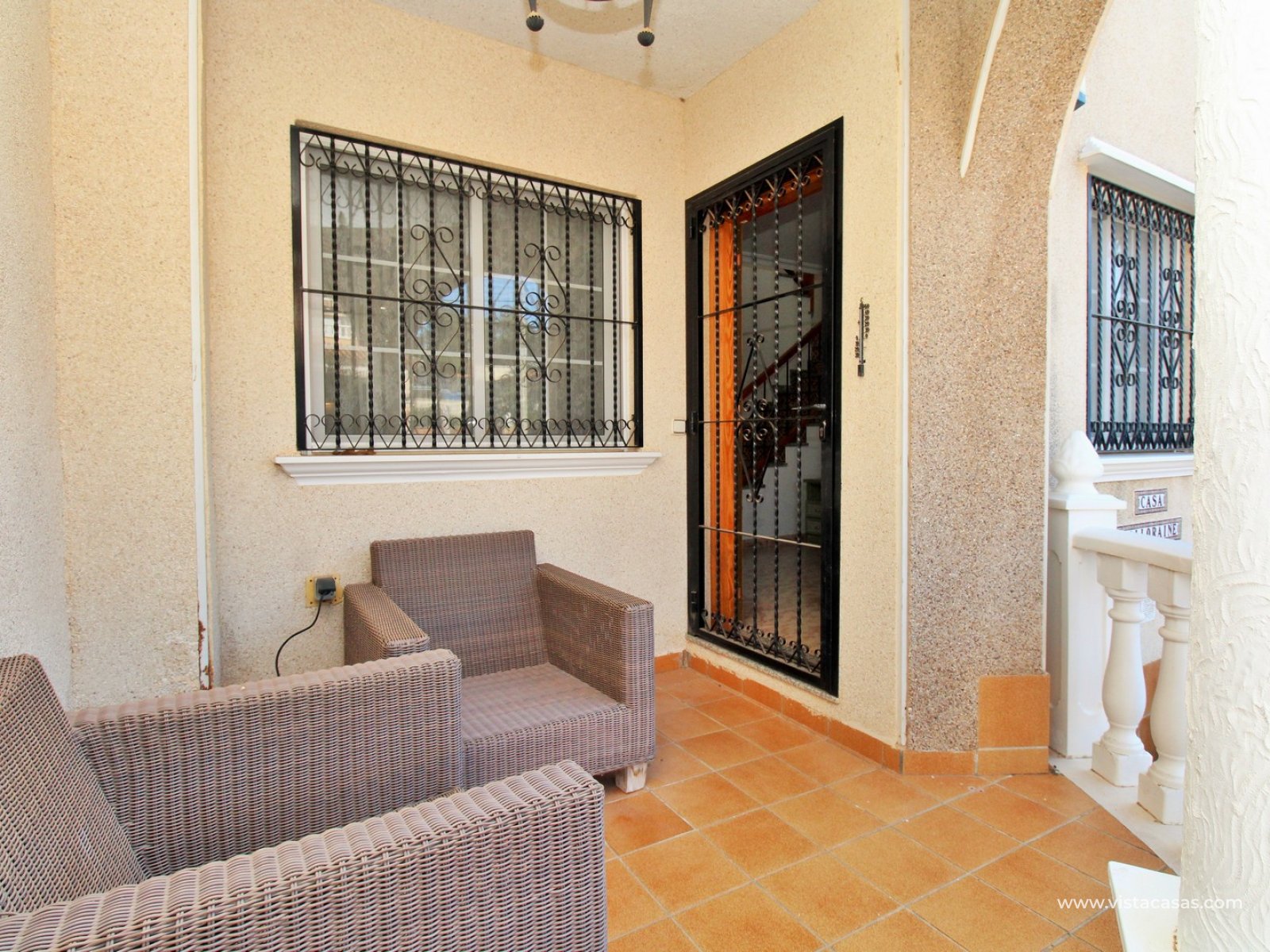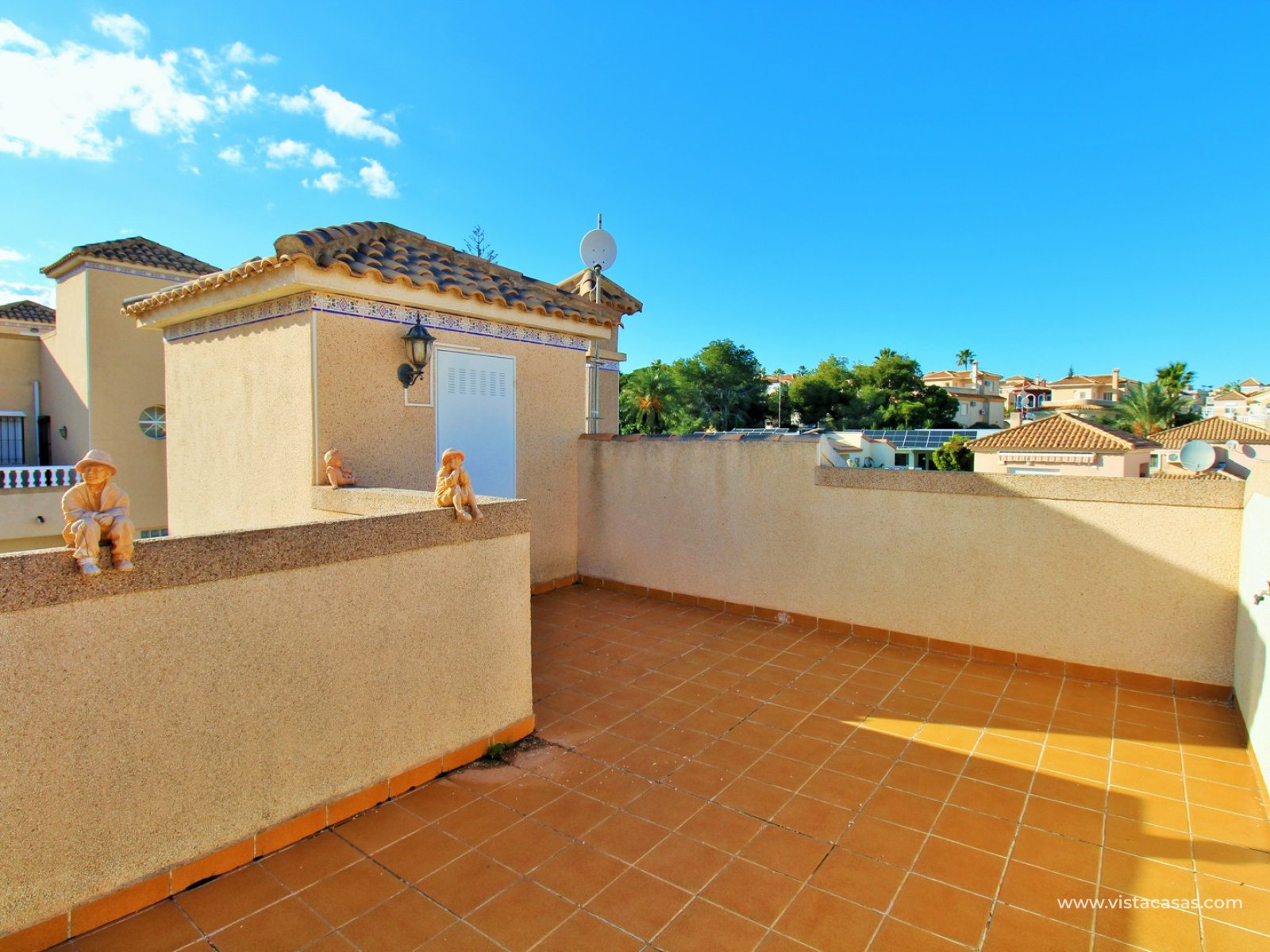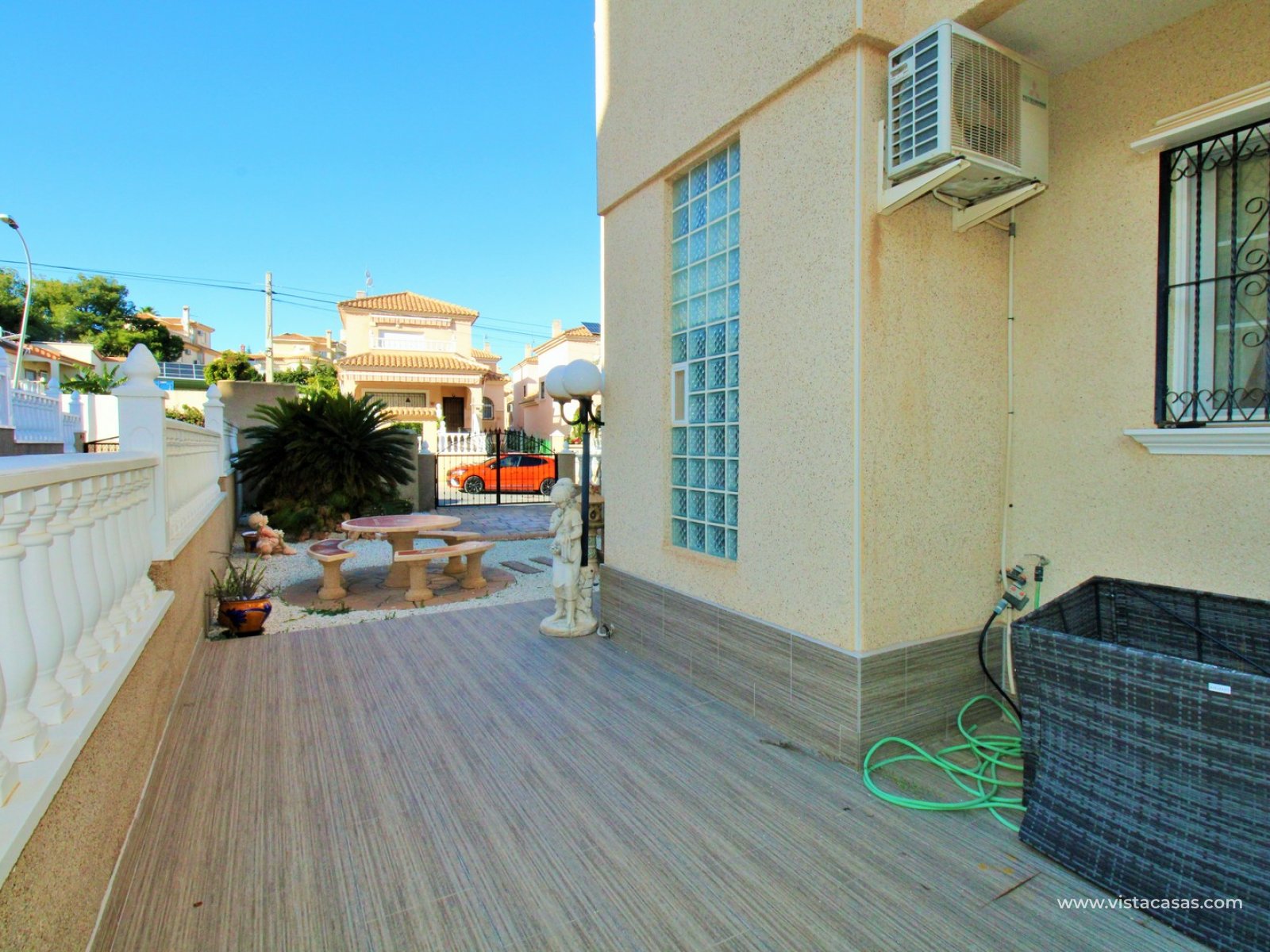 Trädgården är delvis kaklad med planterade ytor och ger en bra balans mellan användbar uteplats och grönska. Bostaden ligger nära det gemensamma poolområdet och i ett populärt bostadsområde i Villamartin.