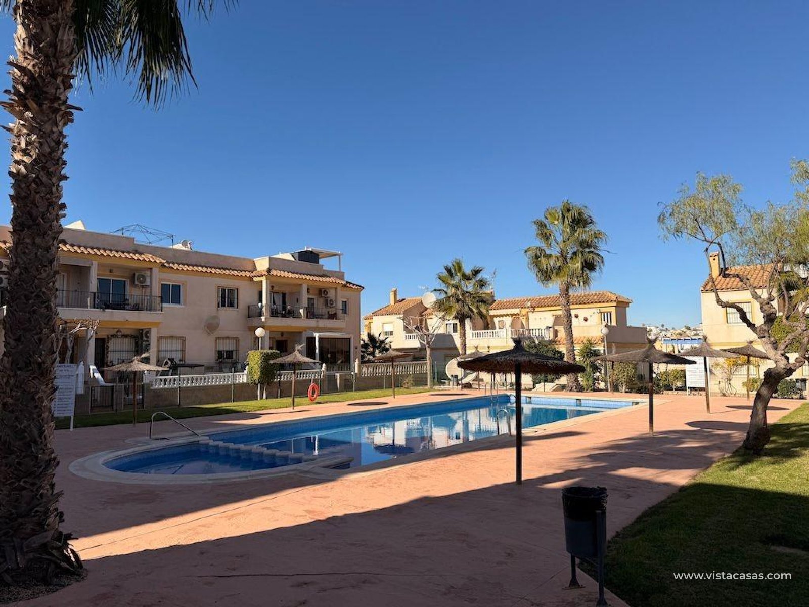 Villamartin, Wohnanlage St. James Hills – Erdgeschoss-Bungalow gegenüber einem 50 m2 großen Gemeinschaftsgarten.. Er verfügt über ein privates Grundstück von ca. 20 m2 sowie über eine Wohnfläche mit 2 Schlafzimmern, 1 Badezimmer, einer Küche und einem Wohn-Esszimmer. Die Immobilie wird möbliert und mit Klimaanlage verkauft, verfügt über einen eigenen Parkplatz und bietet Zugang zu einem großen Gemeinschaftspool.