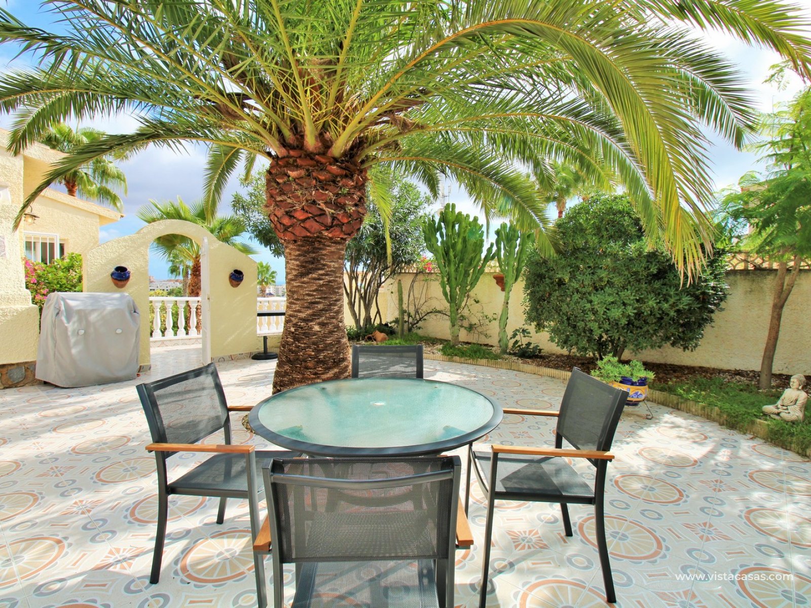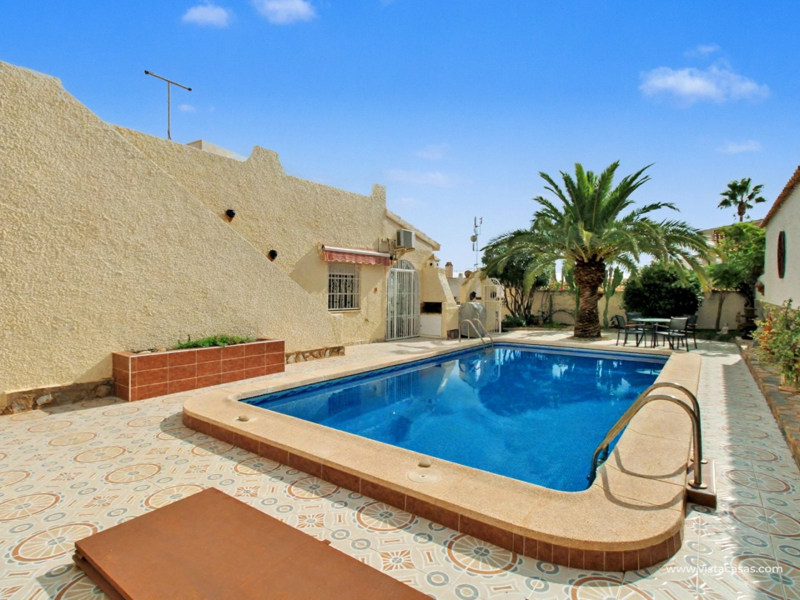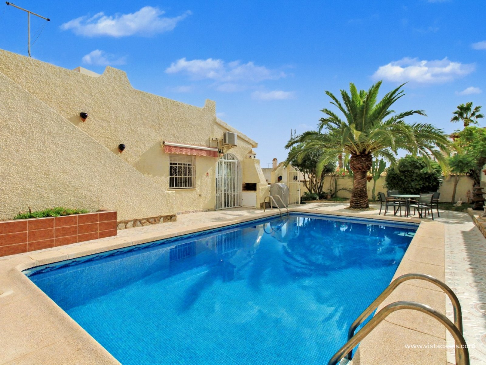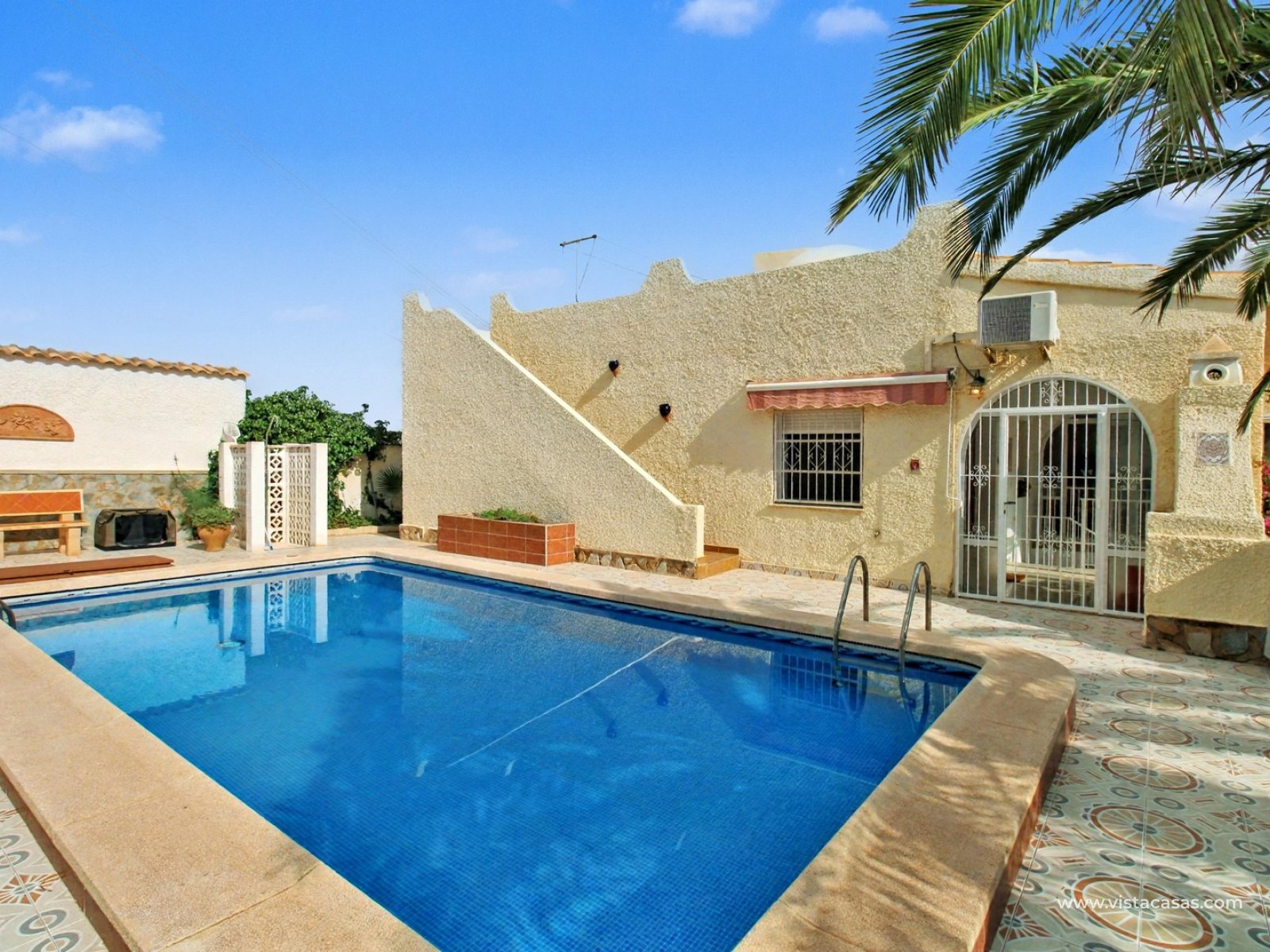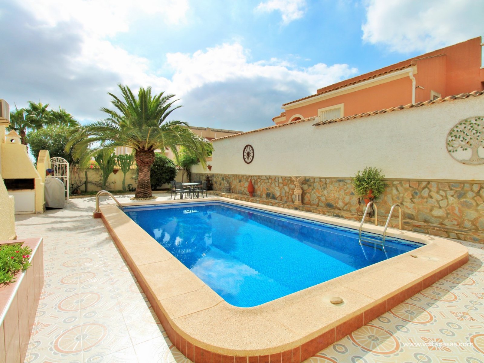 Bonita villa independiente de cuatro dormitorios con piscina privada situada en la zona de Blue Lagoon, Villamartin. Construida sobre una parcela de 430m², la vivienda ofrece la comodidad de tener la mayoría de las estancias en una sola planta. En el exterior hay una amplia piscina, varias terrazas, un garaje y un solárium con vistas abiertas al mar y al campo. A solo 500 metros de bares, restaurantes y tiendas.
