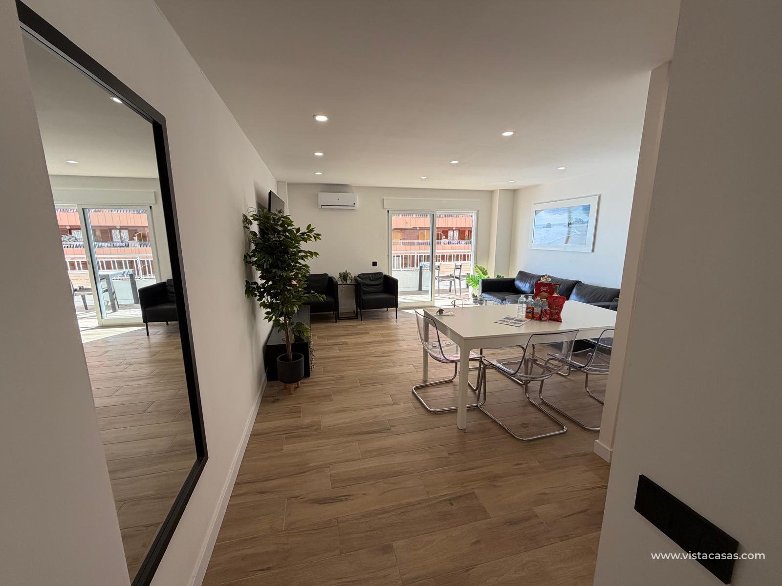 Te presentamos este magnífico apartamento totalmente reformado, situado en una 4ª planta exterior con ascensor. Con 94 m² construidos y orientación sur, este apartamento ofrece una gran luminosidad y hermosas vistas al mar. Además, cuenta con una terraza de 12 m² perfecta para disfrutar del clima y las vistas.Precio 289.000 €Ubicación Torrevieja, en primera línea de playaLa distribución incluye3 habitaciones (2 con cama doble, 1 con litera)2 baños completos modernos Salón-comedor luminoso con acceso a la terrazaCocina nueva y equipada con horno, microondas, lavavajillas, placa eléctrica y frigorífico grande con congeladorArmarios empotrados en todas las habitacionesCaracterísticas principalesAire acondicionado para un confort ideal durante todo el añoPiscina comunitaria (abierta de junio a octubre)Comercios cercanos supermercado, tiendas y una variada oferta de restaurantes a pocos pasosPlanta 4ª exterior con vistas directas al marTerraza de 12 m² para disfrutar del exteriorEste apartamento está en excelente estado, listo para entrar a vivir. Además, se encuentra a solo 40 minutos en coche del aeropuerto de Alicante.Una oportunidad única para disfrutar del sol, la playa y la tranquilidad en una ubicación privilegiada en Torrevieja. Perfecto como vivienda habitual, segunda residencia o para alquiler vacacional.