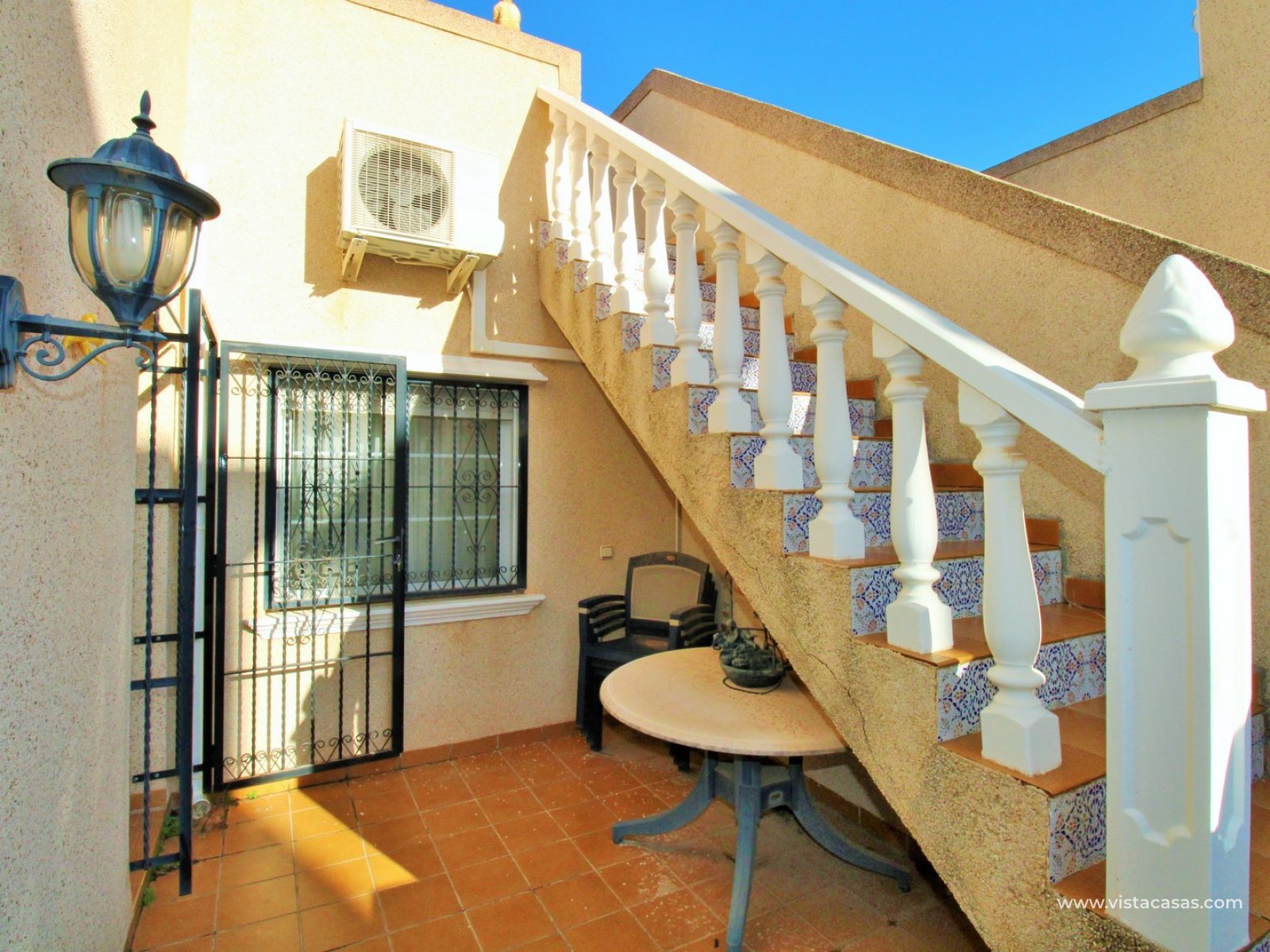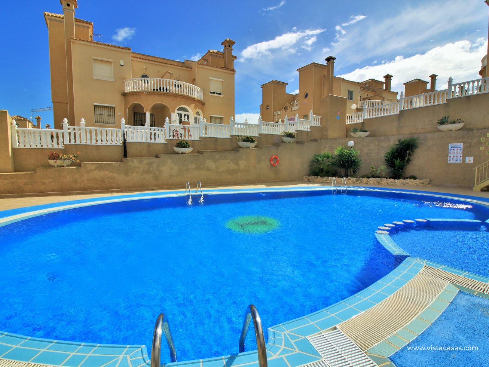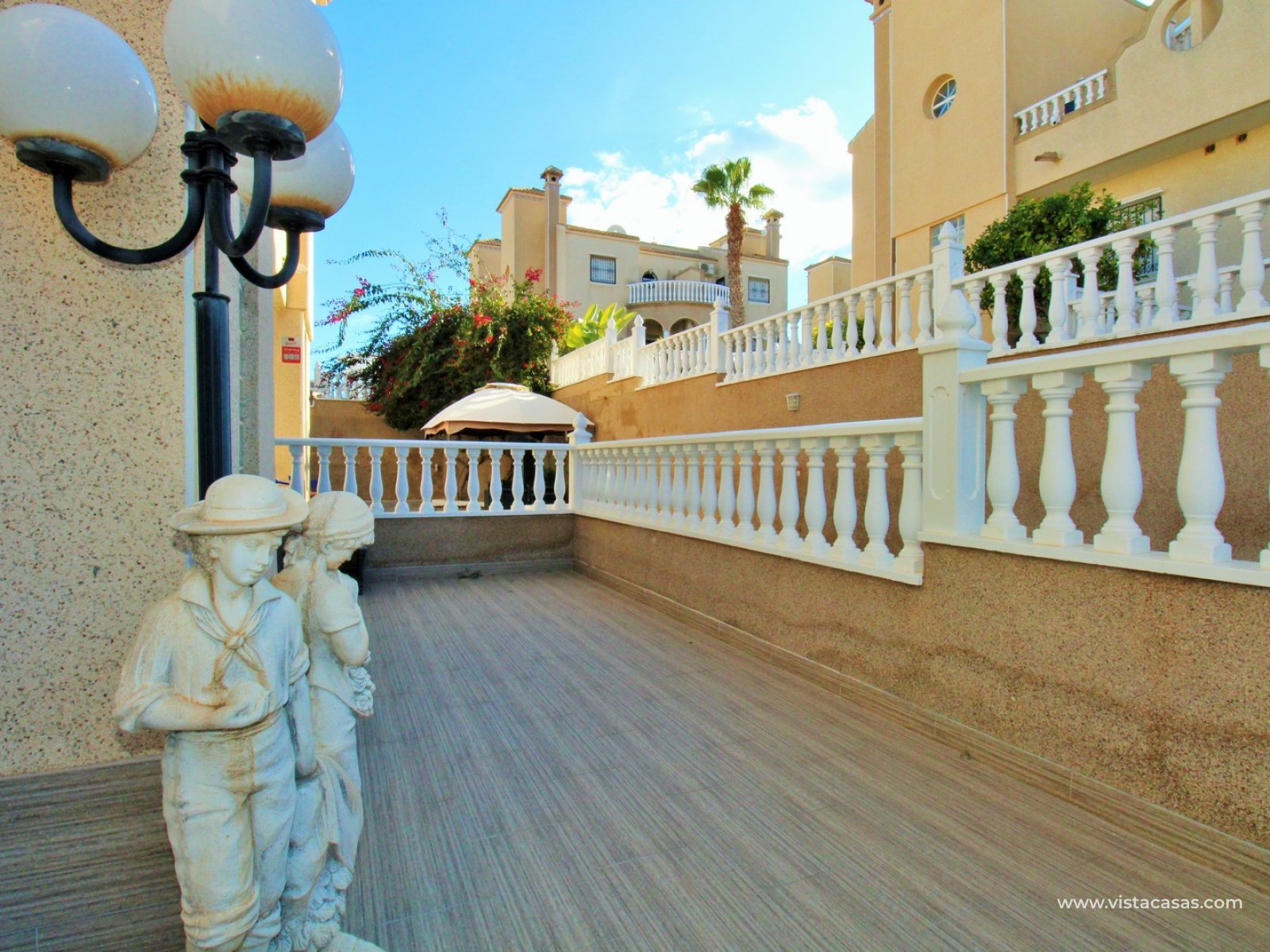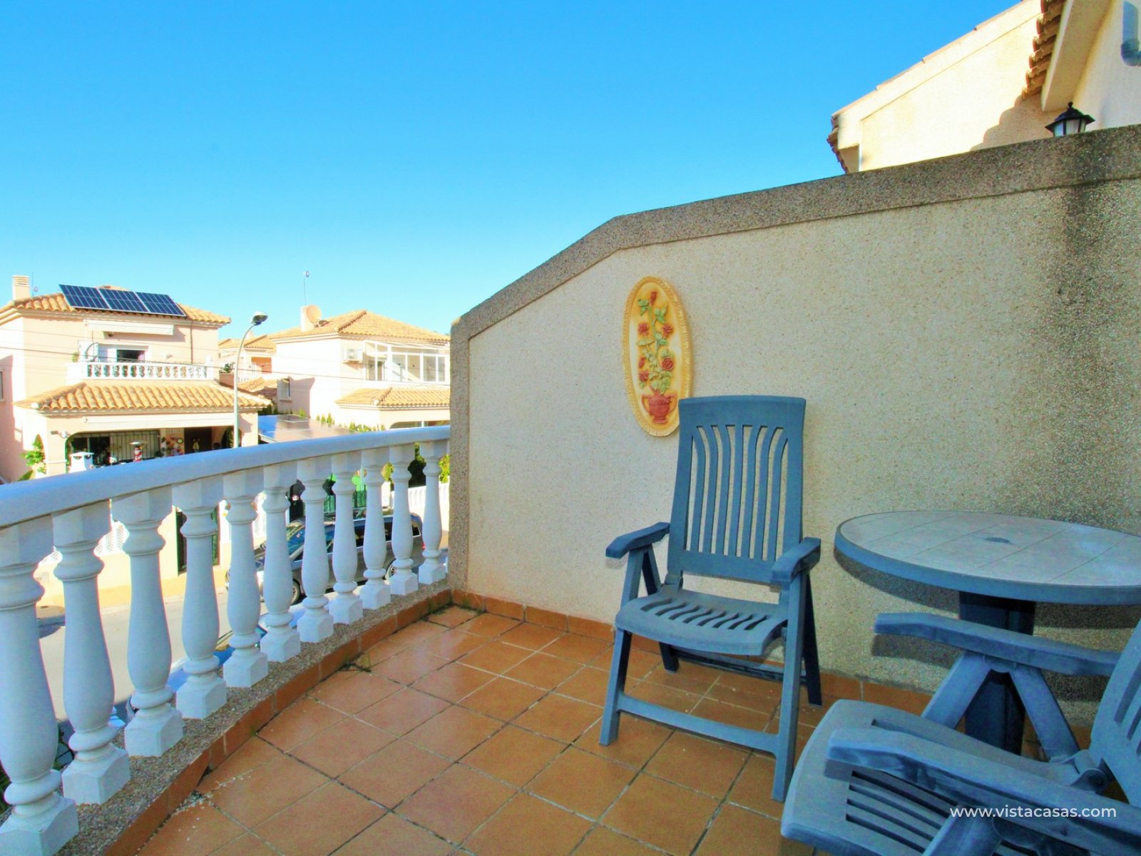Le jardin est partiellement carrelé et comprend des zones plantées, offrant un bon équilibre entre espace extérieur et verdure. La propriété est située à proximité de la piscine communautaire et fait partie d’un quartier résidentiel prisé de Villamartin.