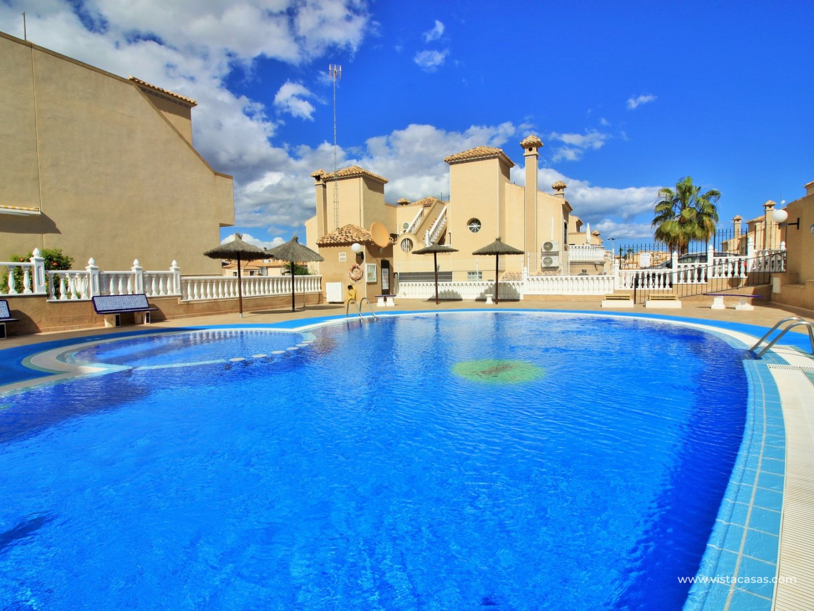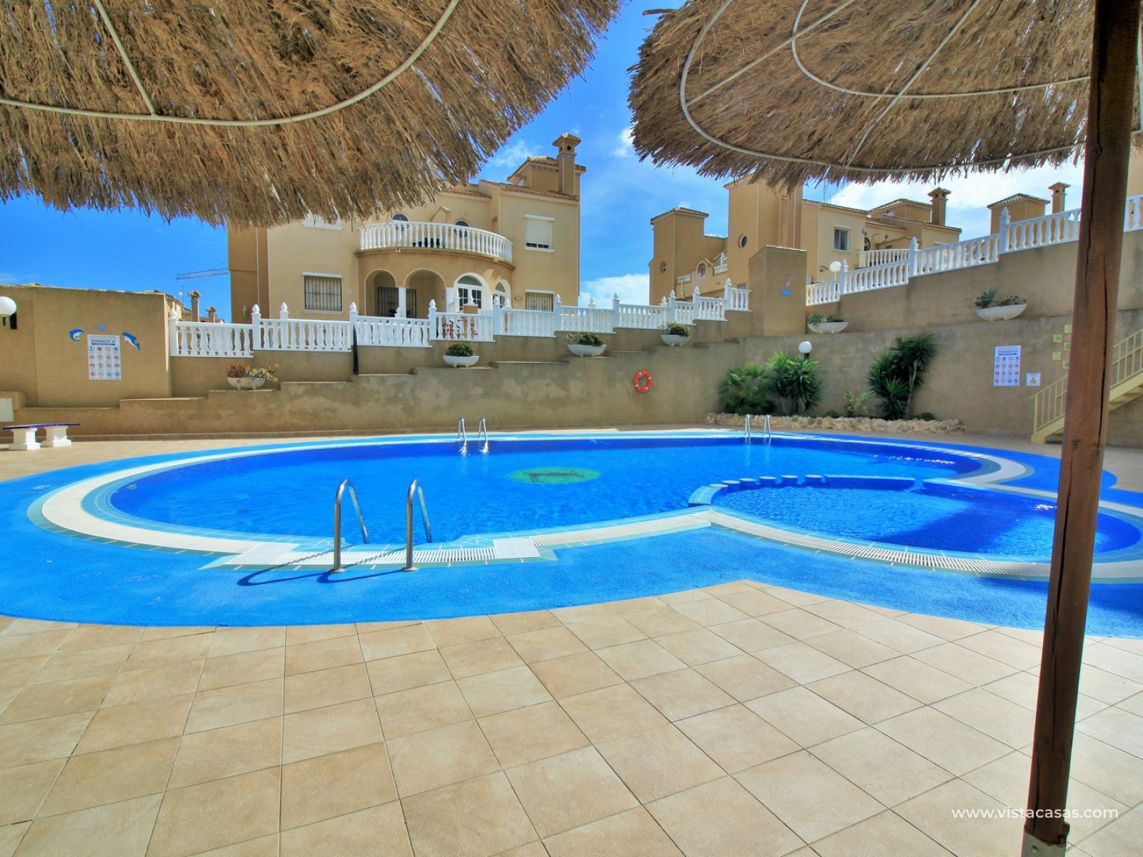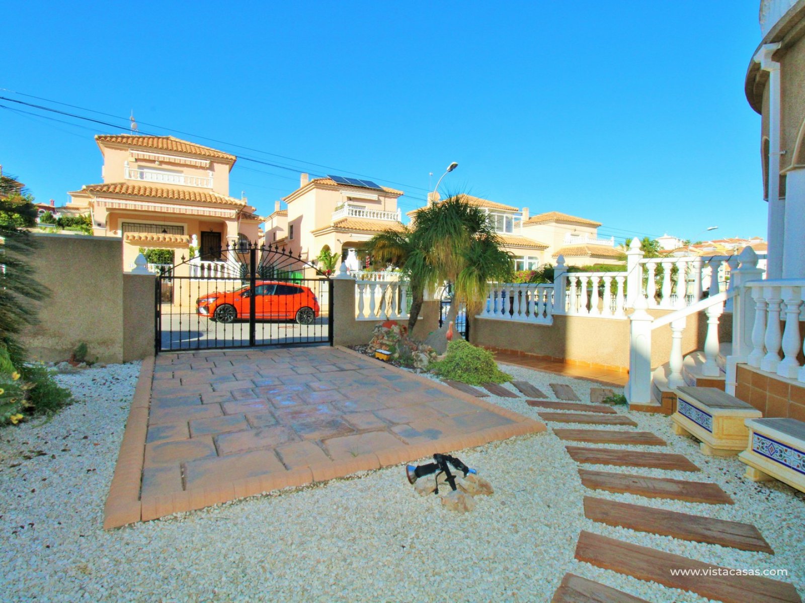 Le jardin est partiellement carrelé et comprend des zones plantées, offrant un bon équilibre entre espace extérieur et verdure. La propriété est située à proximité de la piscine communautaire et fait partie d’un quartier résidentiel prisé de Villamartin.