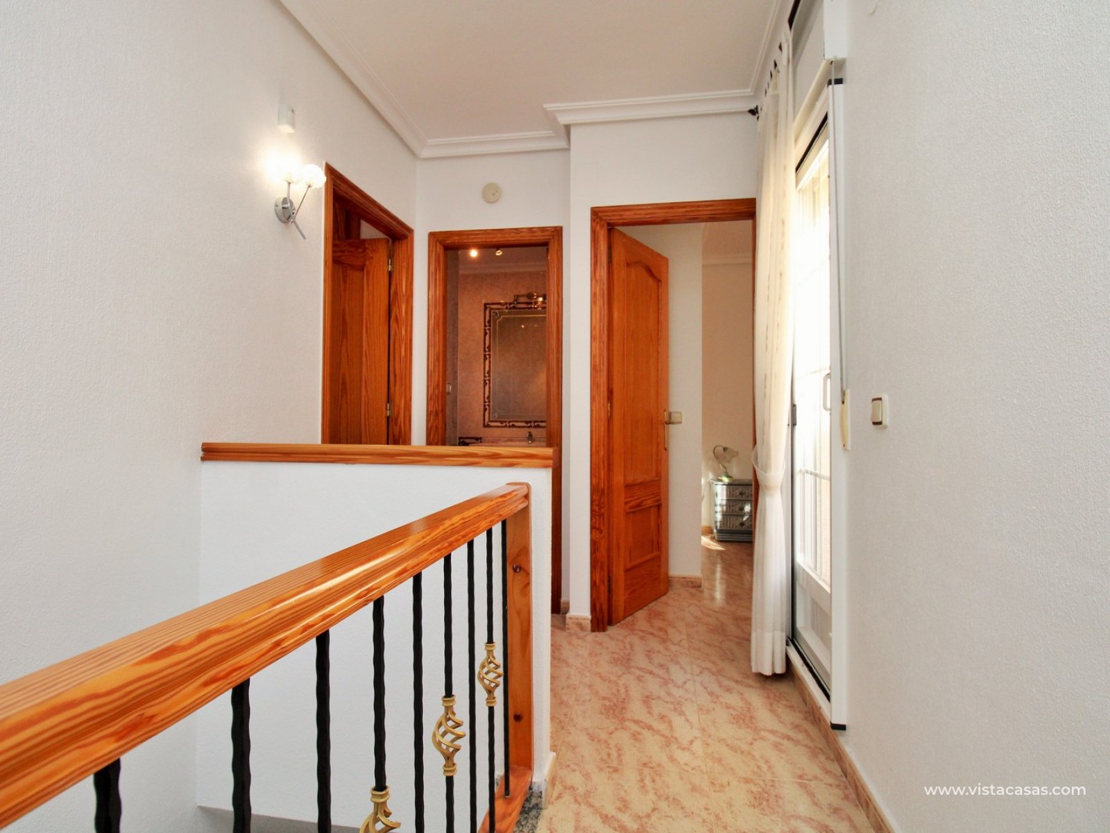 Le premier étage dispose de la chambre principale avec balcon privé, d’une seconde chambre double et d’une salle de bains familiale. Toutes les chambres sont équipées de placards intégrés.