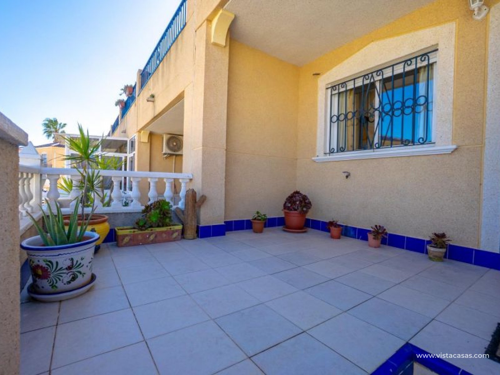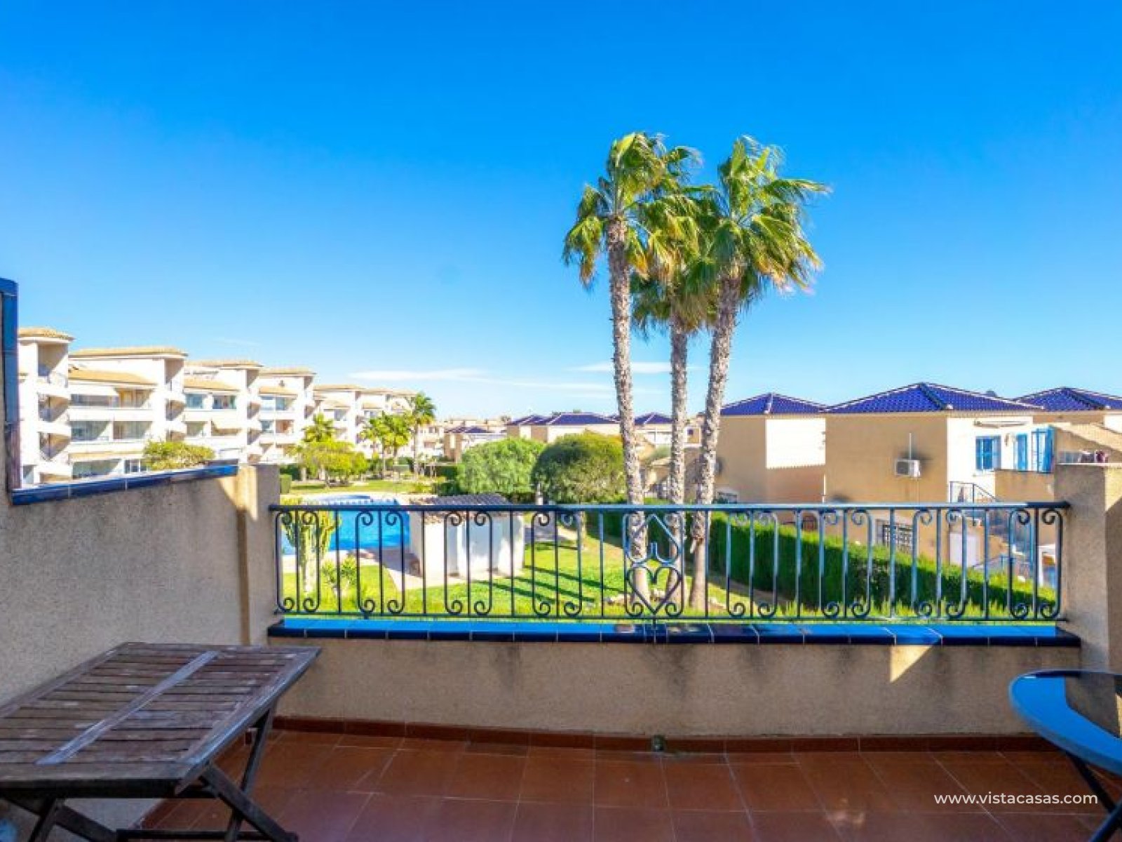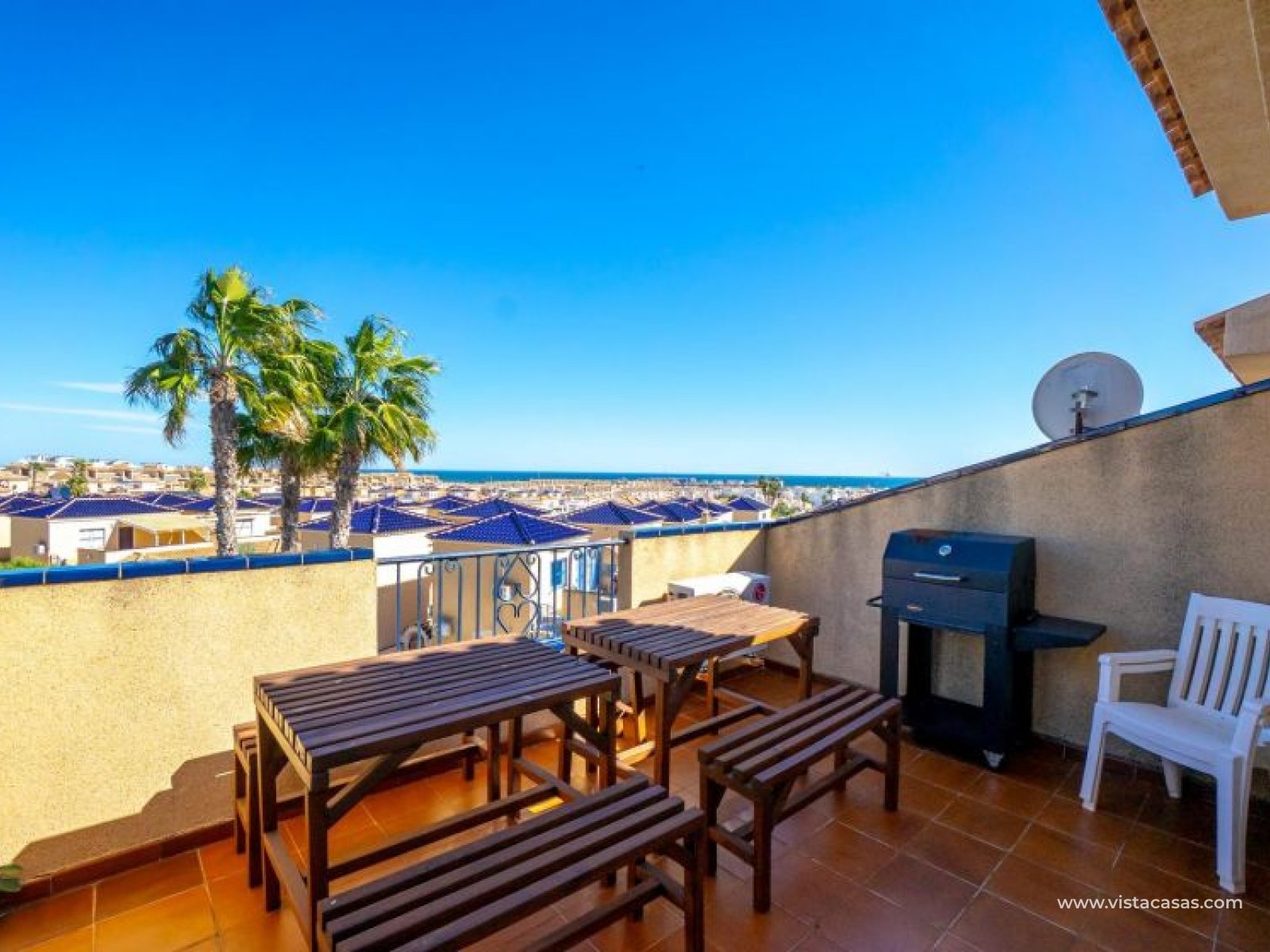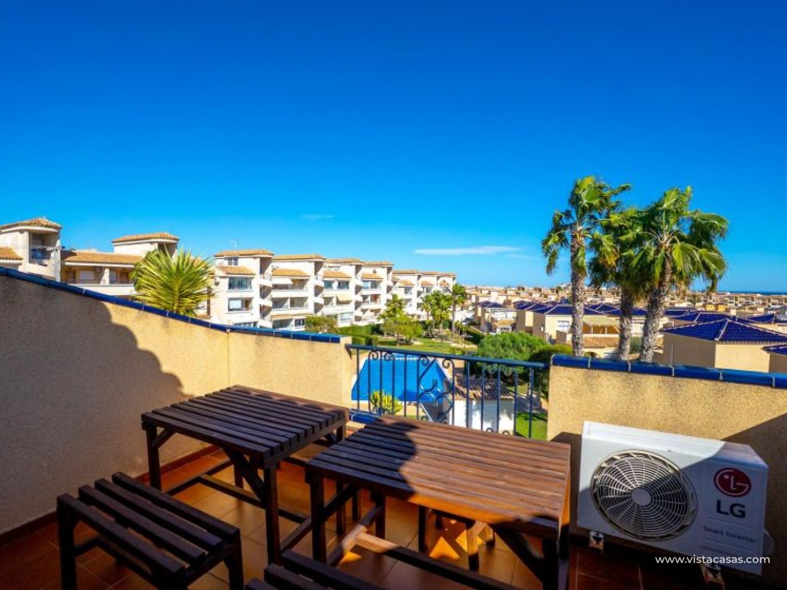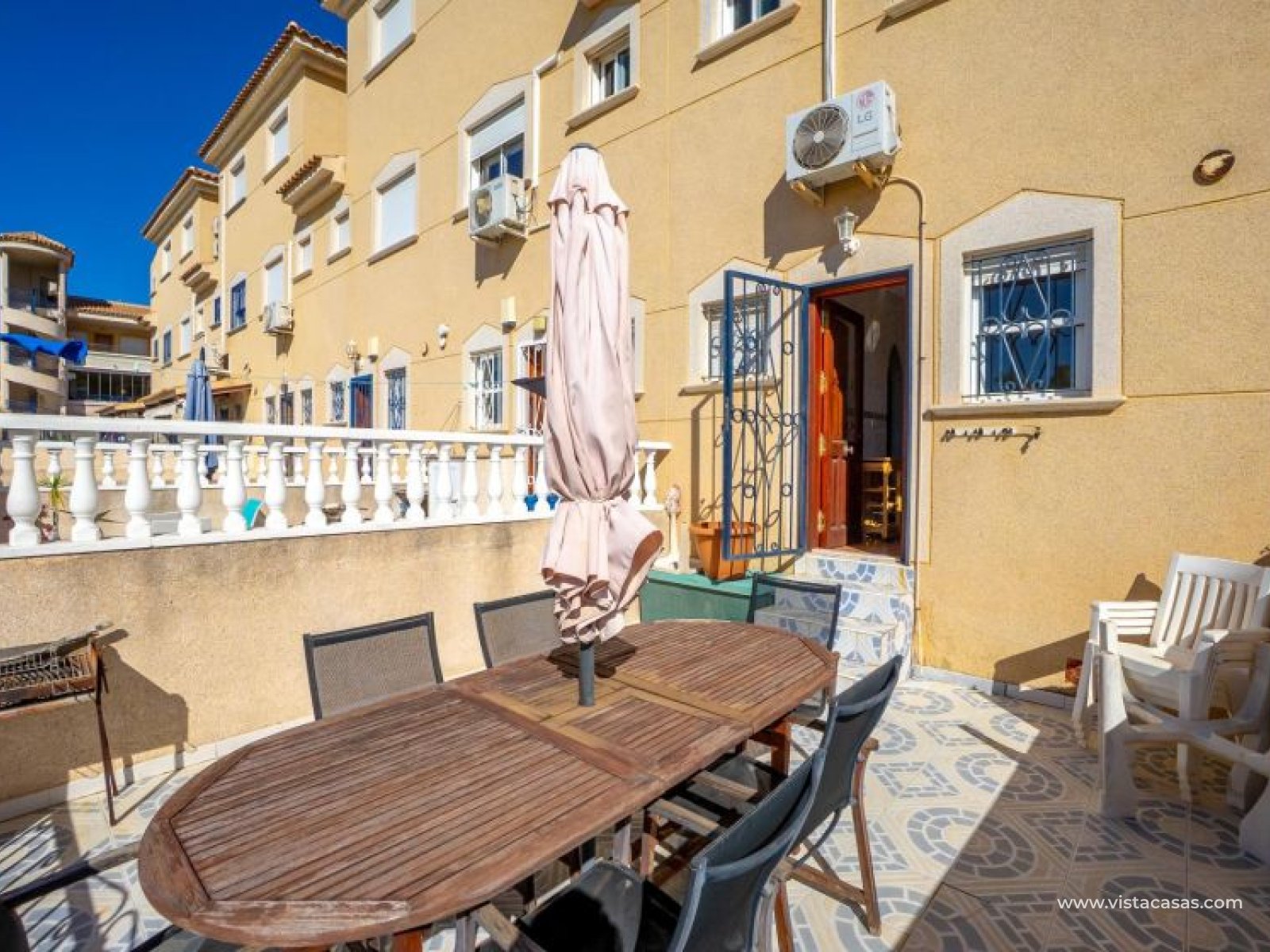 Au sein du Residencial Don Sancho – Orihuela Costa, découvrez cette agréable maison mitoyenne de trois niveaux avec solarium privé. Elle bénéficie d’un emplacement privilégié, avec supermarché à quelques mètres et un accès facile à tous les services : écoles, centres médicaux, hôpitaux, centres commerciaux, restaurants et zones de loisirs, ainsi qu’aux plages à courte distance. La propriété fait partie d’un complexe résidentiel avec piscine commune et se situe juste en face de celle-ci, offrant ainsi une vue dégagée et un environnement agréable. Depuis le solarium, vous profitez de belles vues sur la mer et la piscine, un espace idéal pour profiter du soleil toute l’année. Distribution par niveaux : Rez-de-chaussée : Salon-salle à manger spacieux et lumineux avec accès à une terrasse frontale. À ce niveau se trouvent également des toilettes invités et une cuisine indépendante entièrement équipée avec électroménagers. Depuis la cuisine, accès direct à un patio arrière carrelé, parfait comme terrasse privée supplémentaire ou place de stationnement. Premier étage : Deux chambres et une salle de bain complète. Accès à une terrasse avec agréables vues sur la piscine commune et la mer. Deuxième étage : Une troisième chambre avec accès au solarium privé, offrant des vues dégagées sur la piscine et la mer. La propriété bénéficie d’une double orientation, permettant de profiter du soleil ou de l’ombre selon l’heure de la journée. Vendue entièrement meublée et équipée d’électroménagers, prête à emménager. Une maison lumineuse et fonctionnelle, idéale comme résidence principale, résidence secondaire ou investissement sur la Costa Blanca. Contactez-nous pour plus d’informations ou pour organiser une visite.