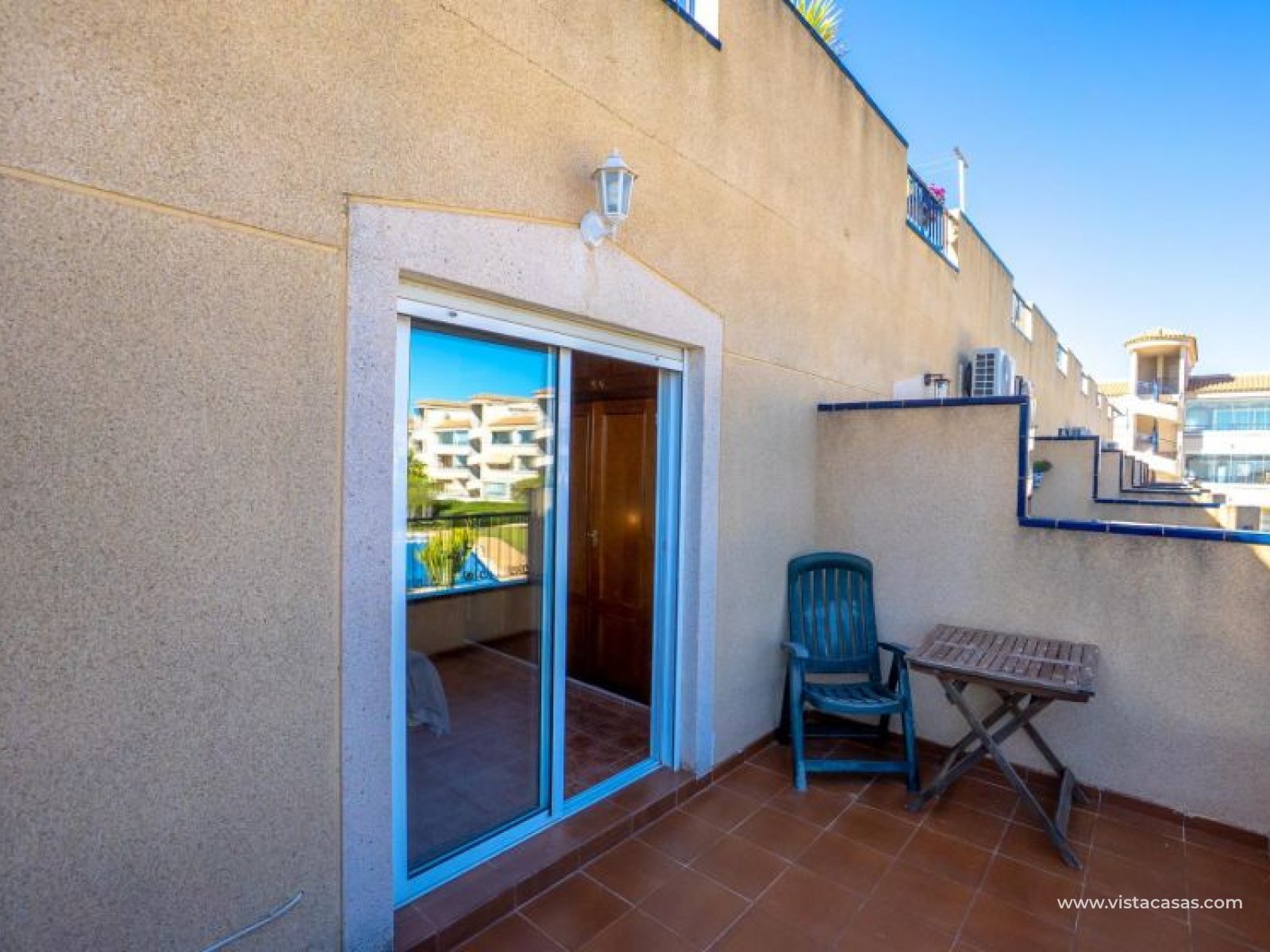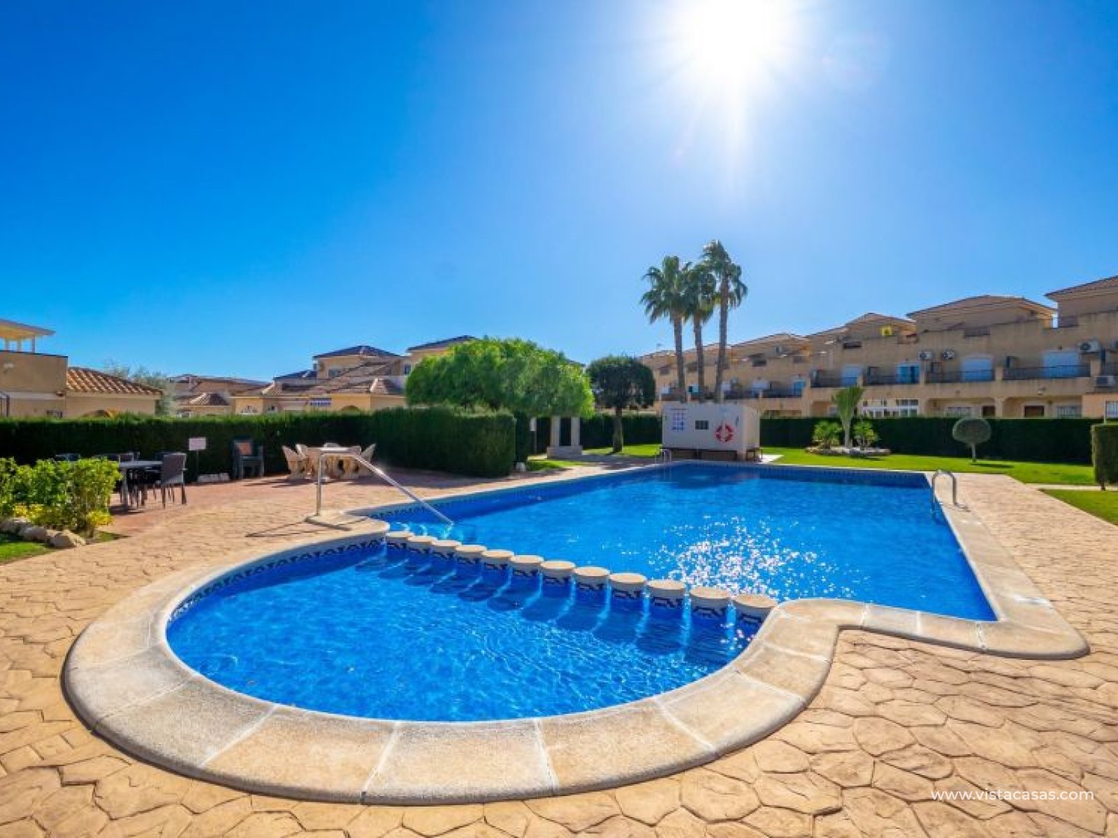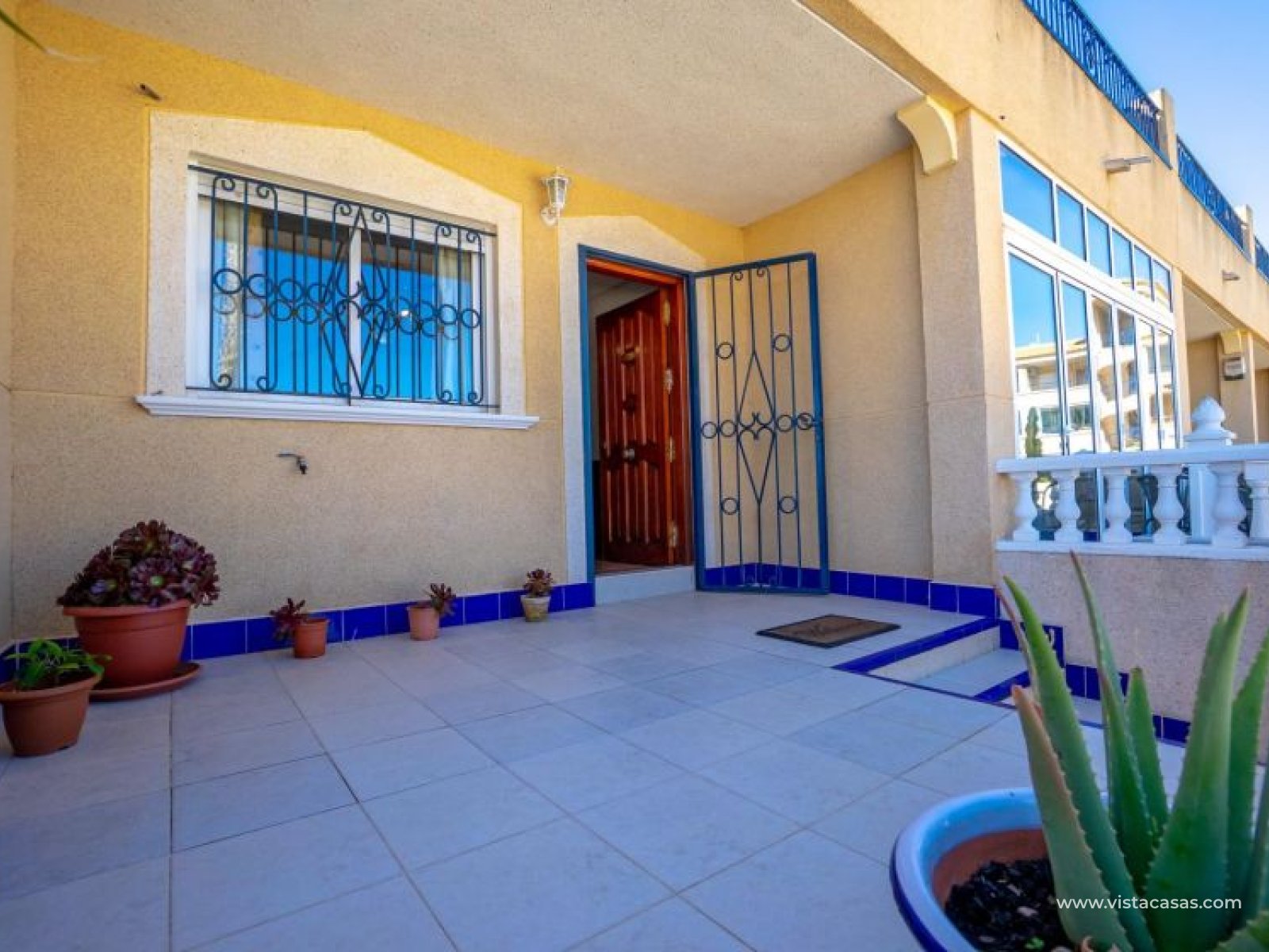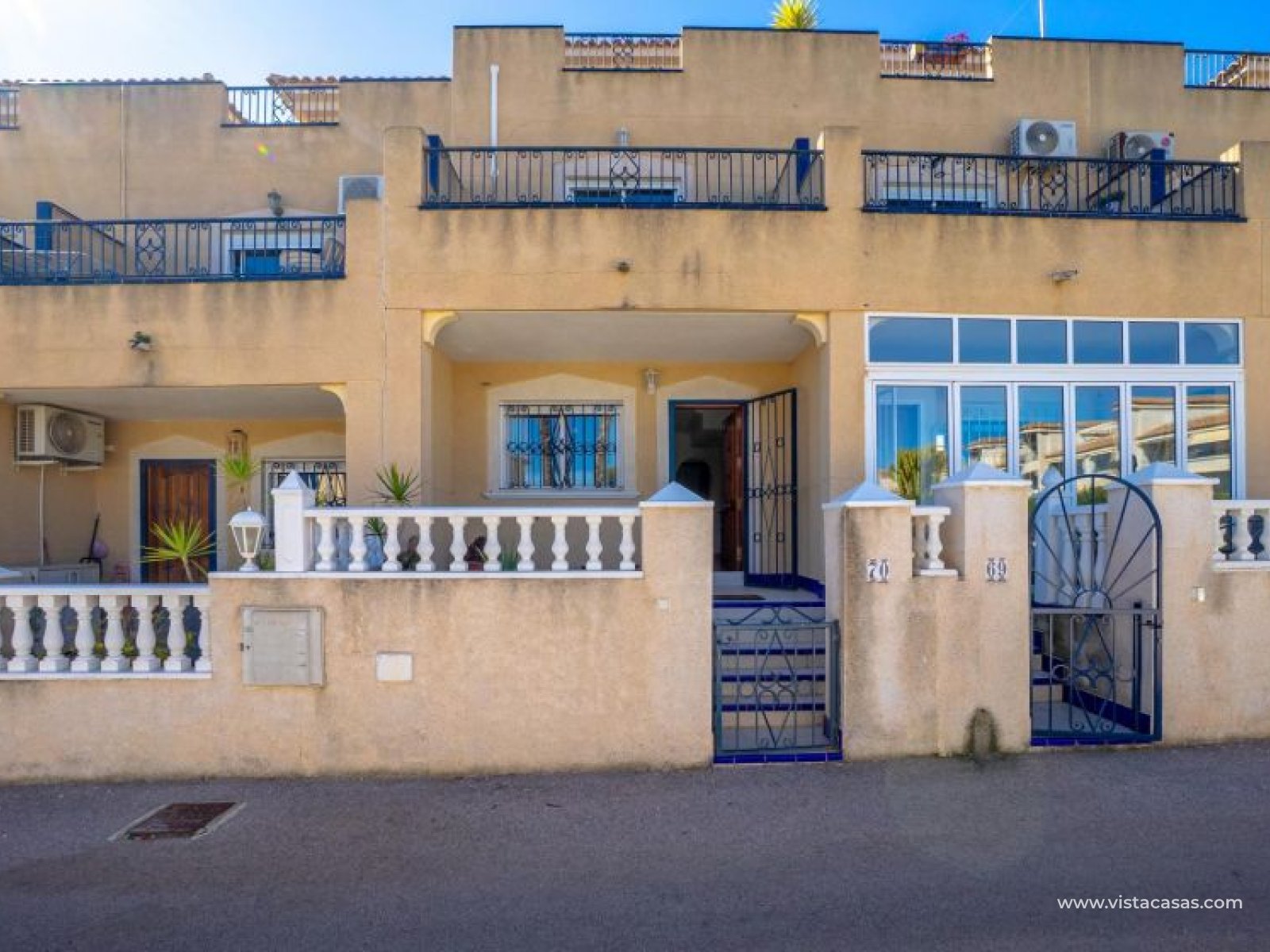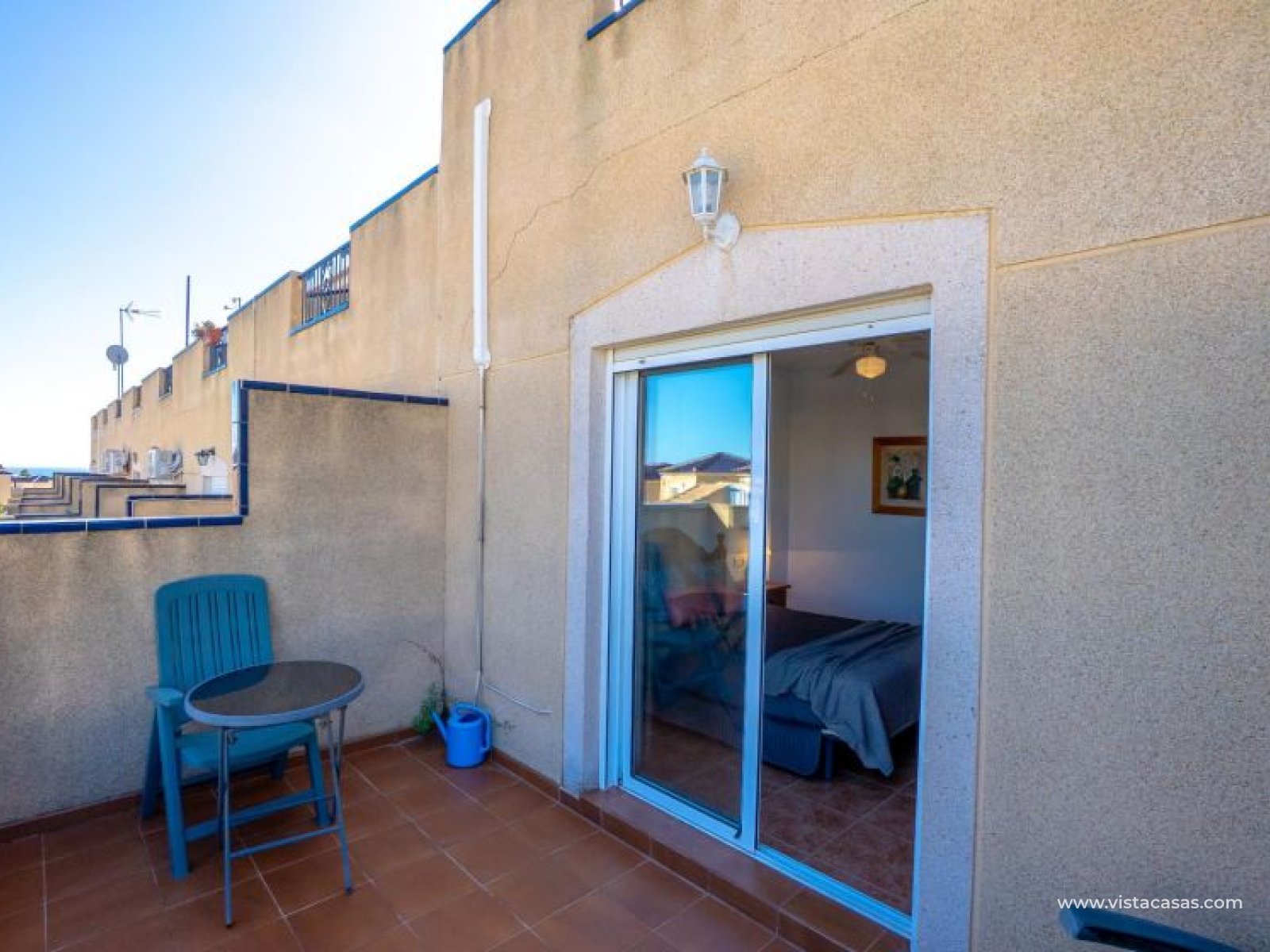 Au sein du Residencial Don Sancho – Orihuela Costa, découvrez cette agréable maison mitoyenne de trois niveaux avec solarium privé. Elle bénéficie d’un emplacement privilégié, avec supermarché à quelques mètres et un accès facile à tous les services : écoles, centres médicaux, hôpitaux, centres commerciaux, restaurants et zones de loisirs, ainsi qu’aux plages à courte distance. La propriété fait partie d’un complexe résidentiel avec piscine commune et se situe juste en face de celle-ci, offrant ainsi une vue dégagée et un environnement agréable. Depuis le solarium, vous profitez de belles vues sur la mer et la piscine, un espace idéal pour profiter du soleil toute l’année. Distribution par niveaux : Rez-de-chaussée : Salon-salle à manger spacieux et lumineux avec accès à une terrasse frontale. À ce niveau se trouvent également des toilettes invités et une cuisine indépendante entièrement équipée avec électroménagers. Depuis la cuisine, accès direct à un patio arrière carrelé, parfait comme terrasse privée supplémentaire ou place de stationnement. Premier étage : Deux chambres et une salle de bain complète. Accès à une terrasse avec agréables vues sur la piscine commune et la mer. Deuxième étage : Une troisième chambre avec accès au solarium privé, offrant des vues dégagées sur la piscine et la mer. La propriété bénéficie d’une double orientation, permettant de profiter du soleil ou de l’ombre selon l’heure de la journée. Vendue entièrement meublée et équipée d’électroménagers, prête à emménager. Une maison lumineuse et fonctionnelle, idéale comme résidence principale, résidence secondaire ou investissement sur la Costa Blanca. Contactez-nous pour plus d’informations ou pour organiser une visite.
