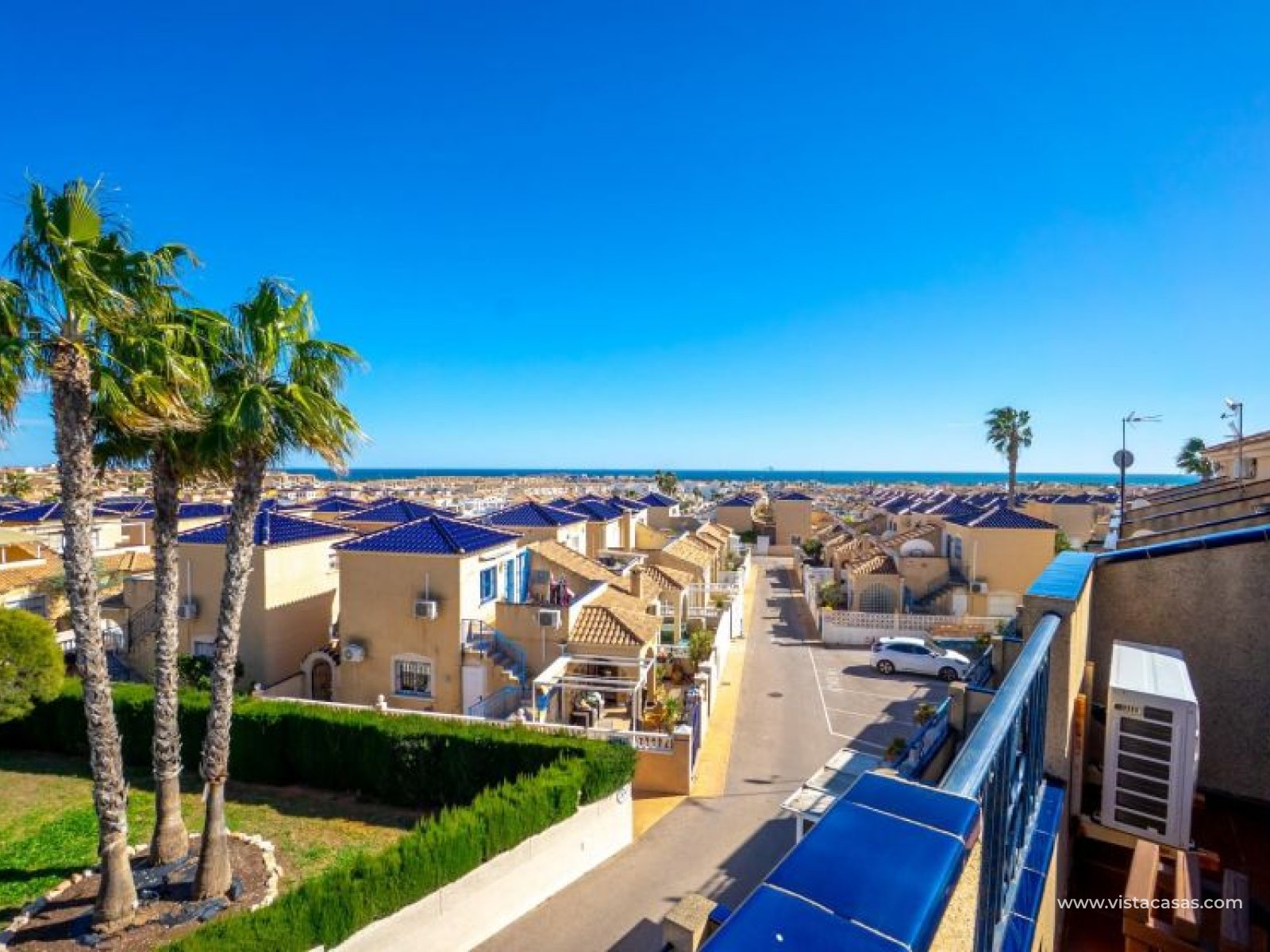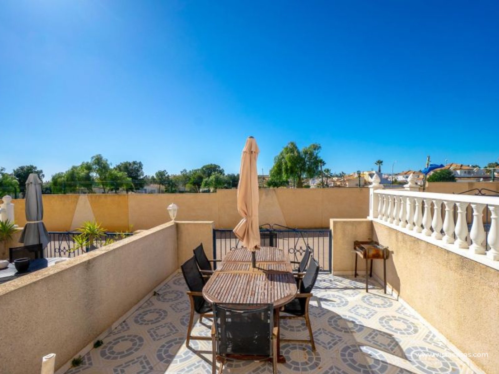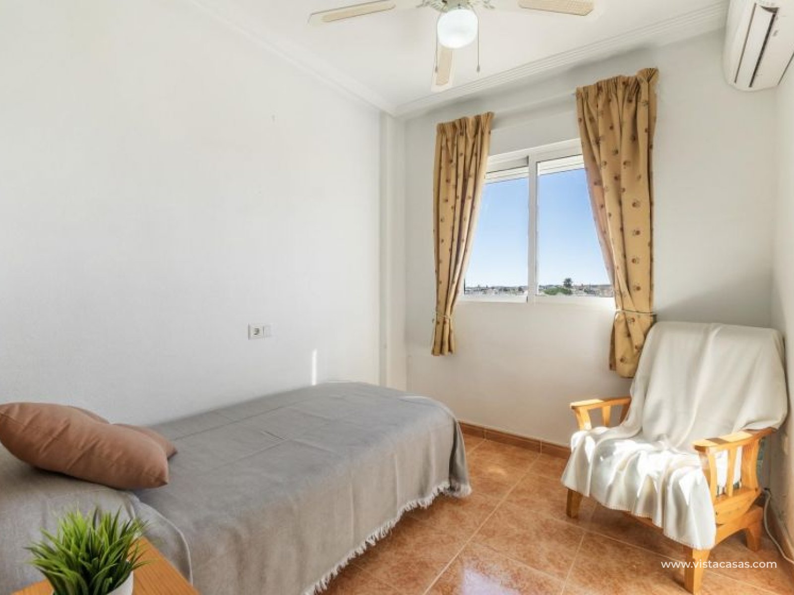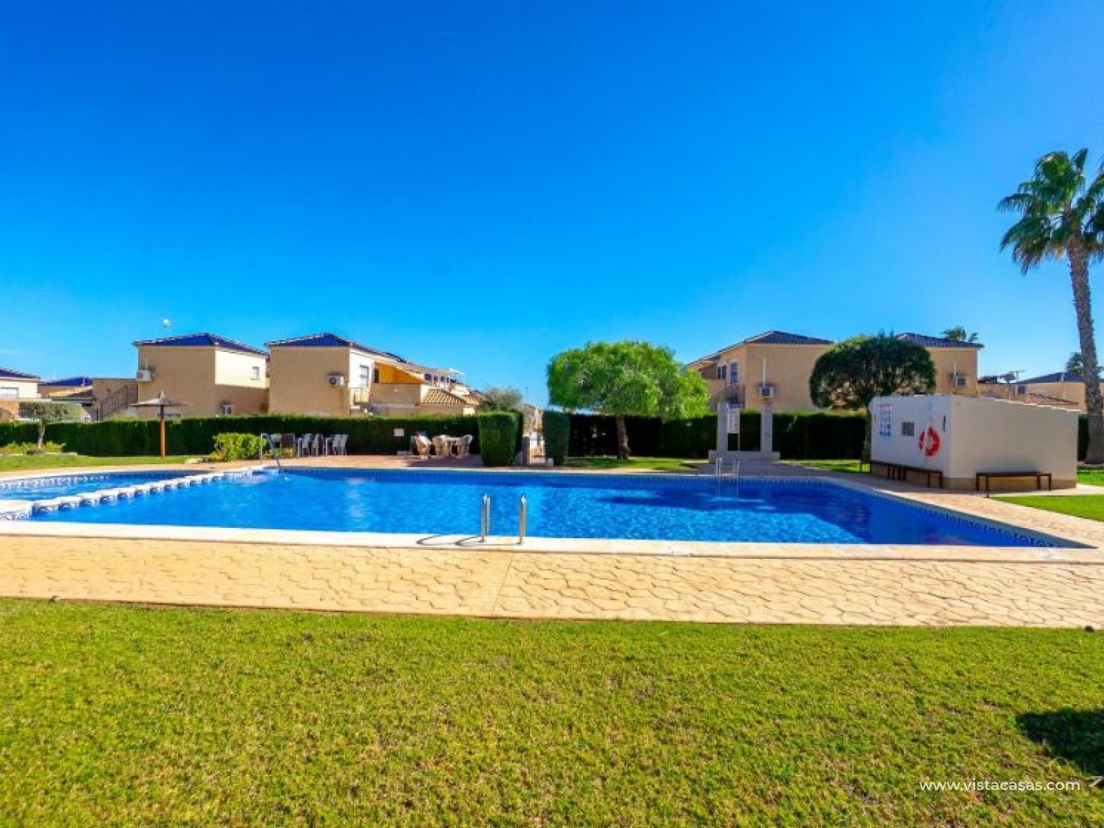 Au sein du Residencial Don Sancho – Orihuela Costa, découvrez cette agréable maison mitoyenne de trois niveaux avec solarium privé. Elle bénéficie d’un emplacement privilégié, avec supermarché à quelques mètres et un accès facile à tous les services : écoles, centres médicaux, hôpitaux, centres commerciaux, restaurants et zones de loisirs, ainsi qu’aux plages à courte distance. La propriété fait partie d’un complexe résidentiel avec piscine commune et se situe juste en face de celle-ci, offrant ainsi une vue dégagée et un environnement agréable. Depuis le solarium, vous profitez de belles vues sur la mer et la piscine, un espace idéal pour profiter du soleil toute l’année. Distribution par niveaux : Rez-de-chaussée : Salon-salle à manger spacieux et lumineux avec accès à une terrasse frontale. À ce niveau se trouvent également des toilettes invités et une cuisine indépendante entièrement équipée avec électroménagers. Depuis la cuisine, accès direct à un patio arrière carrelé, parfait comme terrasse privée supplémentaire ou place de stationnement. Premier étage : Deux chambres et une salle de bain complète. Accès à une terrasse avec agréables vues sur la piscine commune et la mer. Deuxième étage : Une troisième chambre avec accès au solarium privé, offrant des vues dégagées sur la piscine et la mer. La propriété bénéficie d’une double orientation, permettant de profiter du soleil ou de l’ombre selon l’heure de la journée. Vendue entièrement meublée et équipée d’électroménagers, prête à emménager. Une maison lumineuse et fonctionnelle, idéale comme résidence principale, résidence secondaire ou investissement sur la Costa Blanca. Contactez-nous pour plus d’informations ou pour organiser une visite.