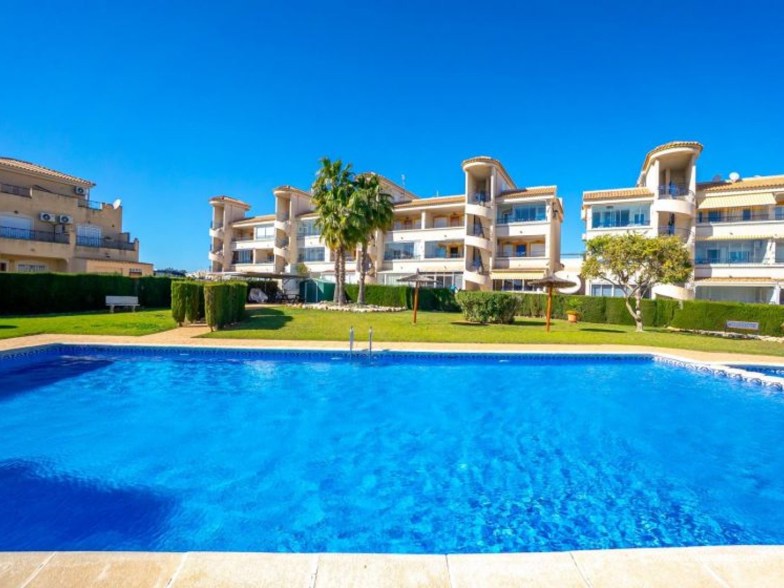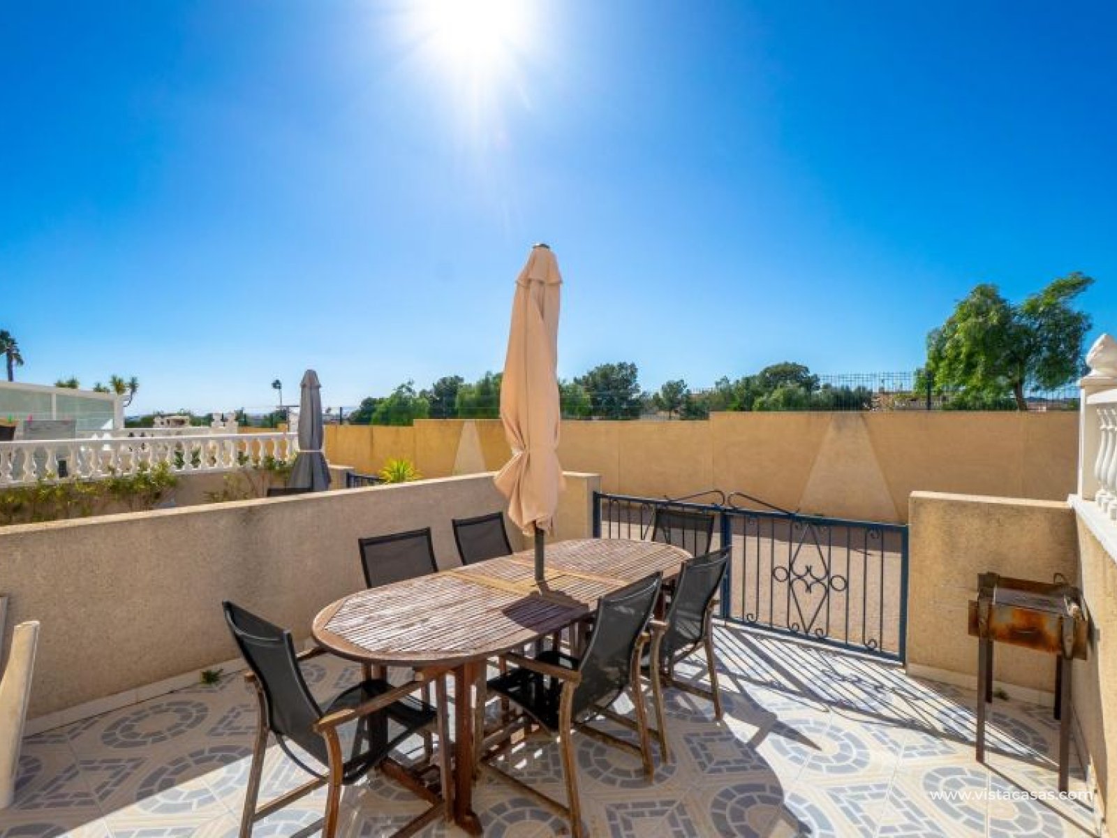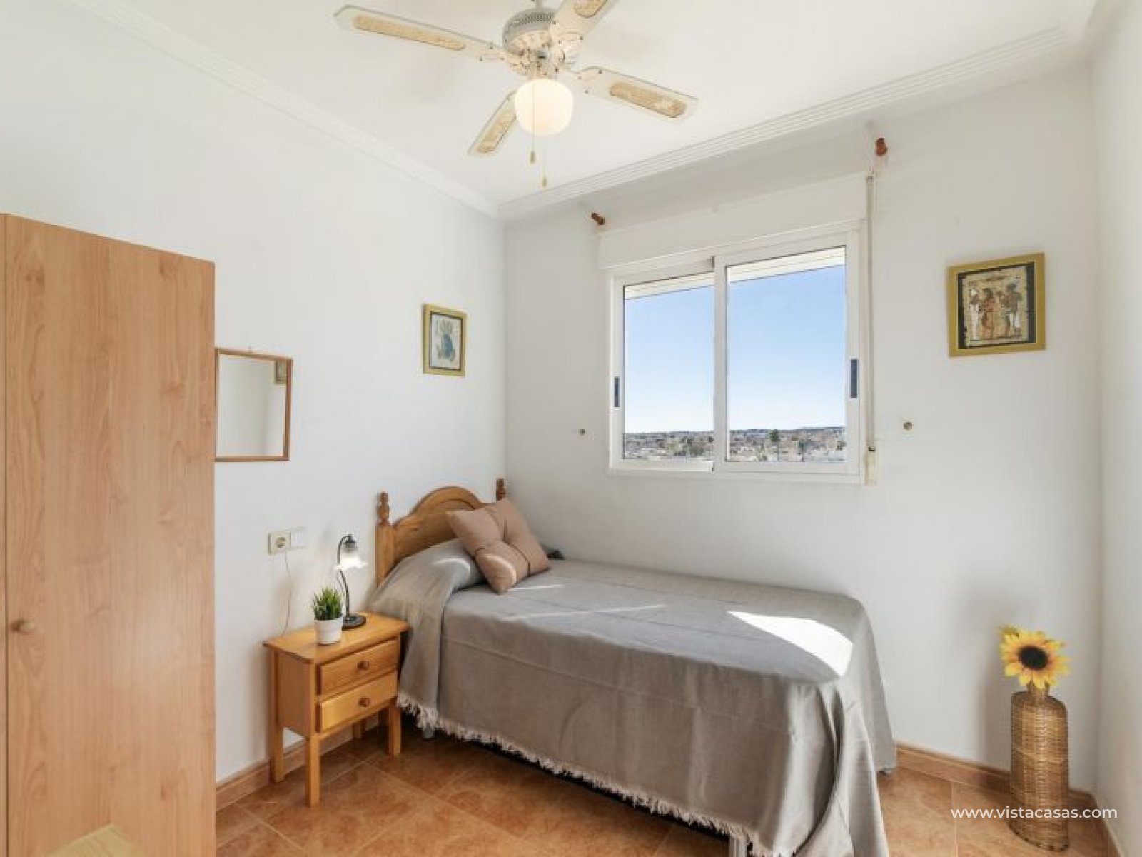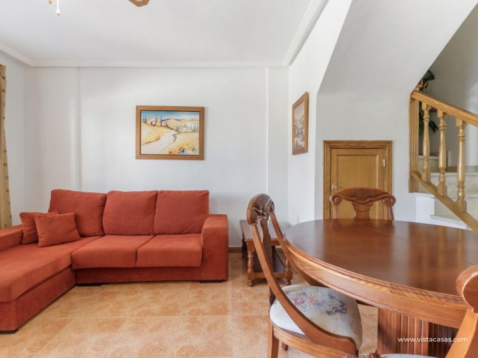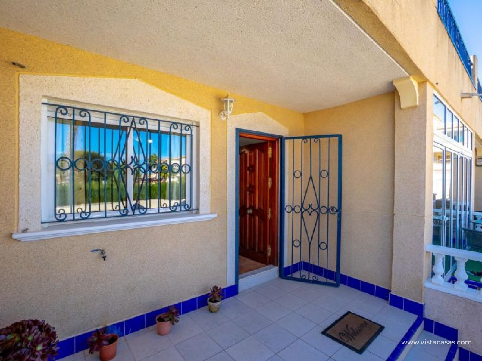 Au sein du Residencial Don Sancho – Orihuela Costa, découvrez cette agréable maison mitoyenne de trois niveaux avec solarium privé. Elle bénéficie d’un emplacement privilégié, avec supermarché à quelques mètres et un accès facile à tous les services : écoles, centres médicaux, hôpitaux, centres commerciaux, restaurants et zones de loisirs, ainsi qu’aux plages à courte distance. La propriété fait partie d’un complexe résidentiel avec piscine commune et se situe juste en face de celle-ci, offrant ainsi une vue dégagée et un environnement agréable. Depuis le solarium, vous profitez de belles vues sur la mer et la piscine, un espace idéal pour profiter du soleil toute l’année. Distribution par niveaux : Rez-de-chaussée : Salon-salle à manger spacieux et lumineux avec accès à une terrasse frontale. À ce niveau se trouvent également des toilettes invités et une cuisine indépendante entièrement équipée avec électroménagers. Depuis la cuisine, accès direct à un patio arrière carrelé, parfait comme terrasse privée supplémentaire ou place de stationnement. Premier étage : Deux chambres et une salle de bain complète. Accès à une terrasse avec agréables vues sur la piscine commune et la mer. Deuxième étage : Une troisième chambre avec accès au solarium privé, offrant des vues dégagées sur la piscine et la mer. La propriété bénéficie d’une double orientation, permettant de profiter du soleil ou de l’ombre selon l’heure de la journée. Vendue entièrement meublée et équipée d’électroménagers, prête à emménager. Une maison lumineuse et fonctionnelle, idéale comme résidence principale, résidence secondaire ou investissement sur la Costa Blanca. Contactez-nous pour plus d’informations ou pour organiser une visite.