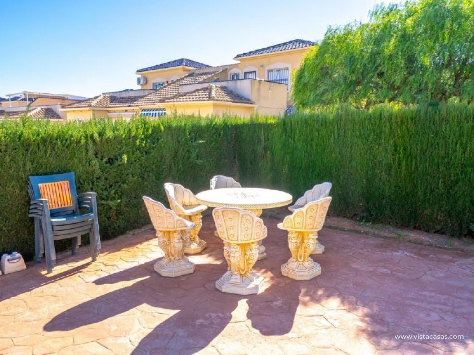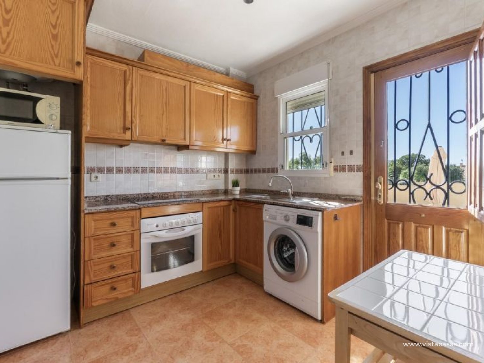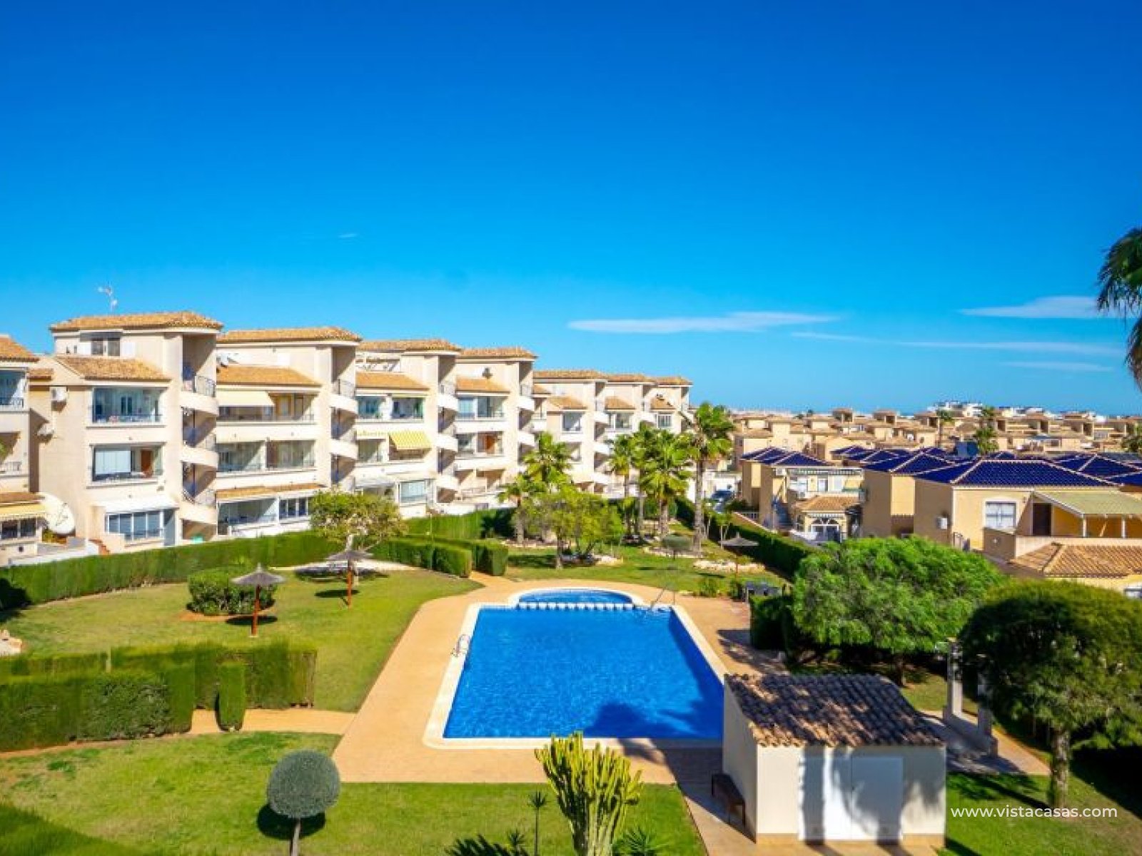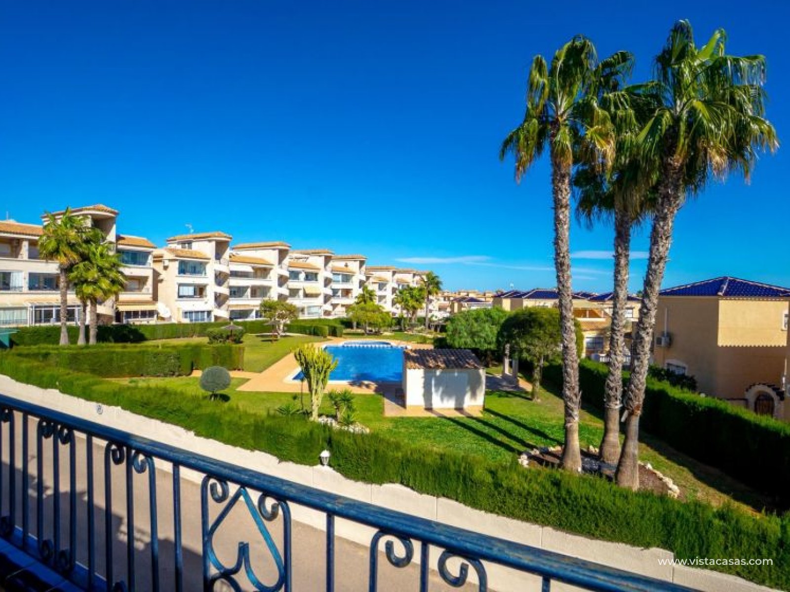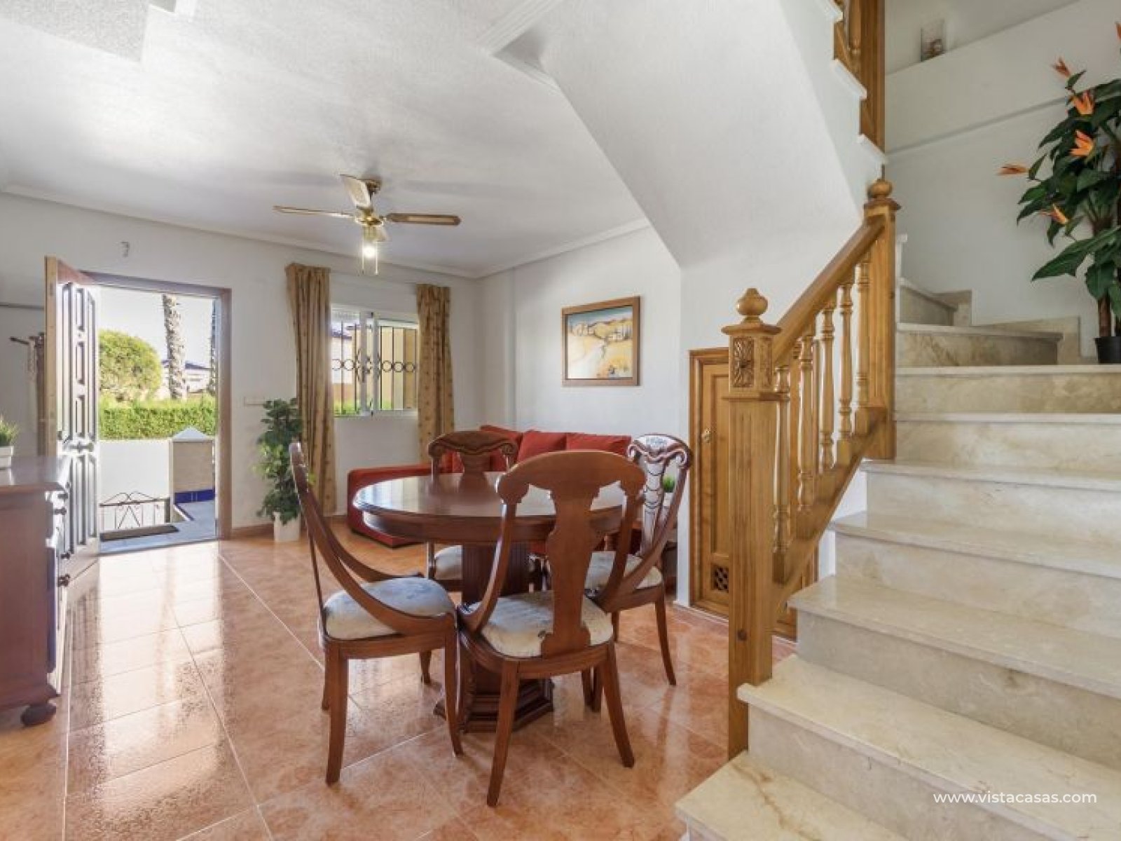 Au sein du Residencial Don Sancho – Orihuela Costa, découvrez cette agréable maison mitoyenne de trois niveaux avec solarium privé. Elle bénéficie d’un emplacement privilégié, avec supermarché à quelques mètres et un accès facile à tous les services : écoles, centres médicaux, hôpitaux, centres commerciaux, restaurants et zones de loisirs, ainsi qu’aux plages à courte distance. La propriété fait partie d’un complexe résidentiel avec piscine commune et se situe juste en face de celle-ci, offrant ainsi une vue dégagée et un environnement agréable. Depuis le solarium, vous profitez de belles vues sur la mer et la piscine, un espace idéal pour profiter du soleil toute l’année. Distribution par niveaux : Rez-de-chaussée : Salon-salle à manger spacieux et lumineux avec accès à une terrasse frontale. À ce niveau se trouvent également des toilettes invités et une cuisine indépendante entièrement équipée avec électroménagers. Depuis la cuisine, accès direct à un patio arrière carrelé, parfait comme terrasse privée supplémentaire ou place de stationnement. Premier étage : Deux chambres et une salle de bain complète. Accès à une terrasse avec agréables vues sur la piscine commune et la mer. Deuxième étage : Une troisième chambre avec accès au solarium privé, offrant des vues dégagées sur la piscine et la mer. La propriété bénéficie d’une double orientation, permettant de profiter du soleil ou de l’ombre selon l’heure de la journée. Vendue entièrement meublée et équipée d’électroménagers, prête à emménager. Une maison lumineuse et fonctionnelle, idéale comme résidence principale, résidence secondaire ou investissement sur la Costa Blanca. Contactez-nous pour plus d’informations ou pour organiser une visite.