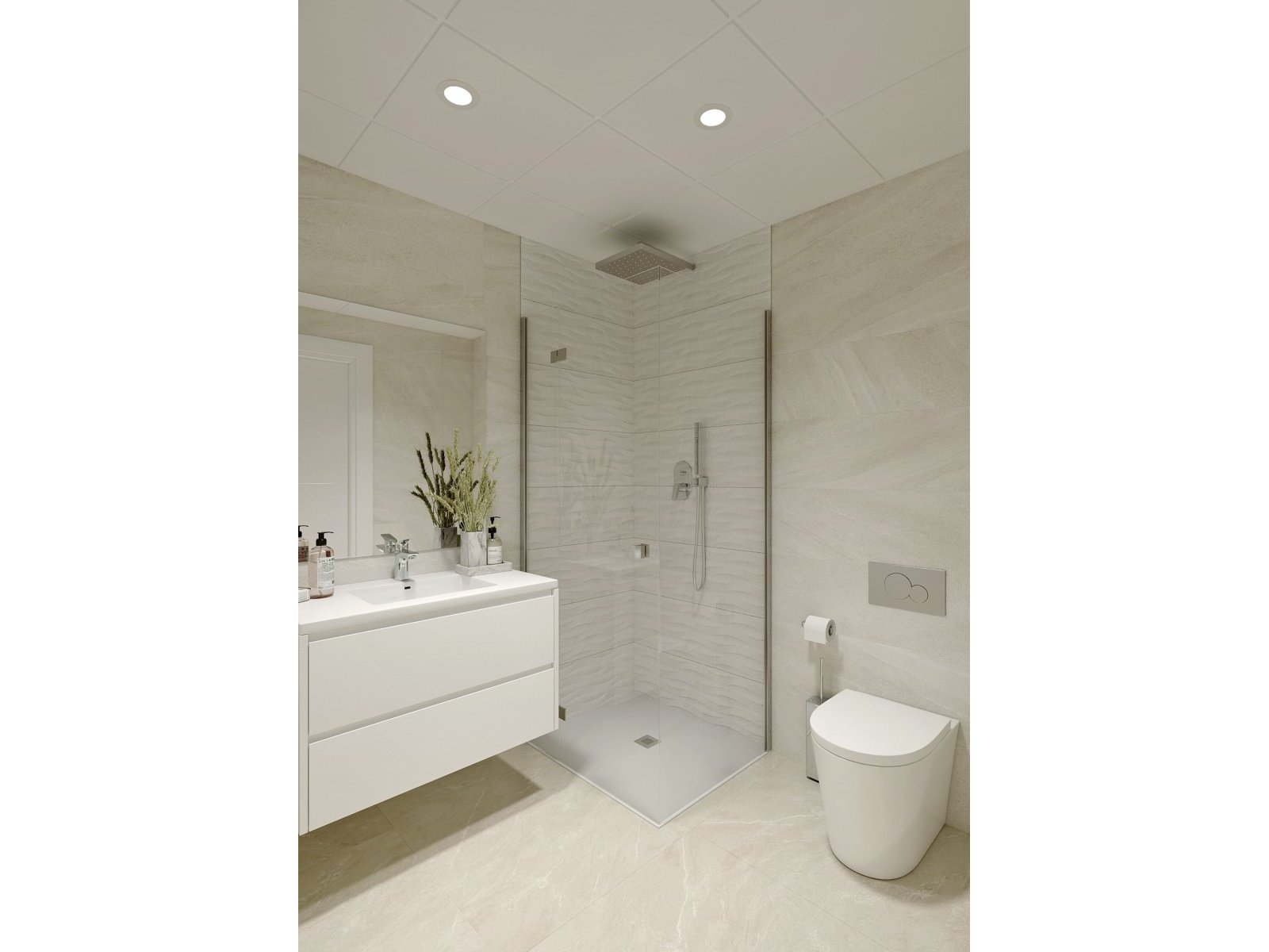 Het interieur van deze woningen is ontworpen met een focus op kwaliteit en comfort. De appartementen bieden opties van 2 of 3 slaapkamers en 1 of 2 badkamers, die zich aanpassen aan verschillende gezinsbehoeften. De vloeren van porselein bieden niet alleen elegantie, maar ook duurzaamheid, terwijl de elektrische rolluiken en de video-intercom een extra niveau van comfort en veiligheid toevoegen. De inbouwkasten bieden efficiënte opslag, en de vloerverwarming zorgt voor een warme sfeer tijdens de koudere maanden. Elk detail is zorgvuldig doordacht om een gezellig en functioneel thuis te bieden.