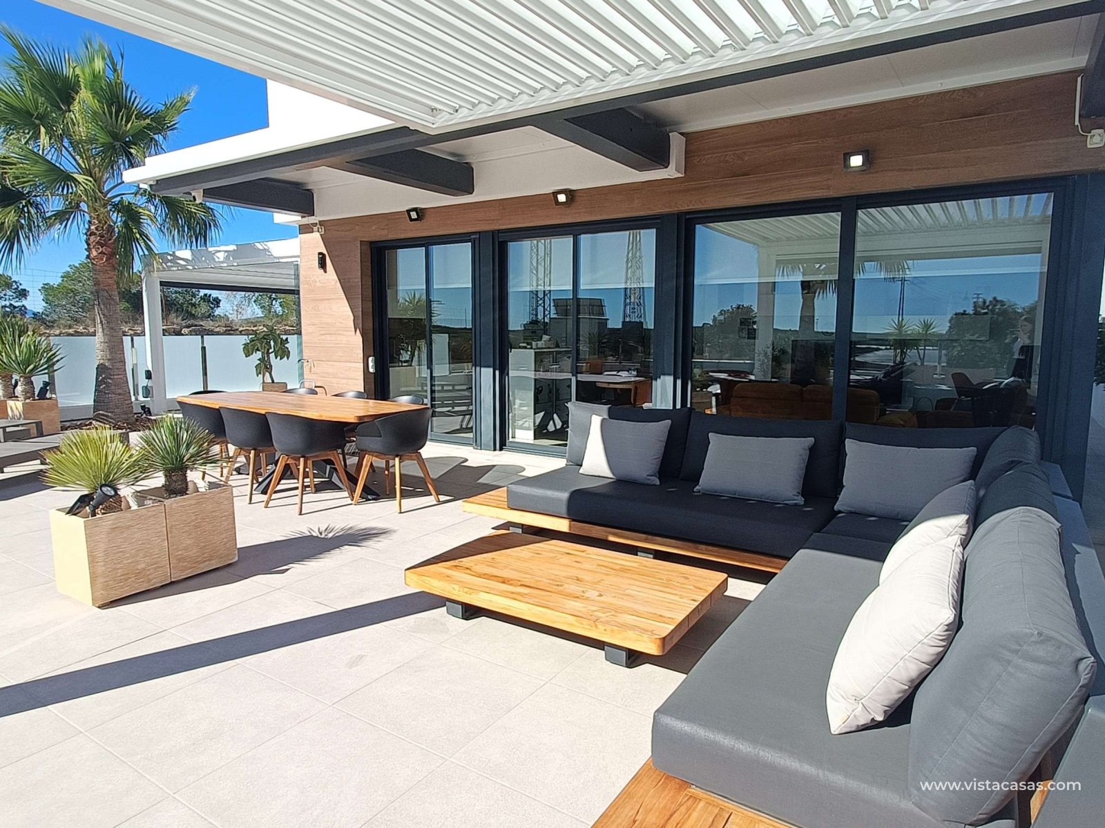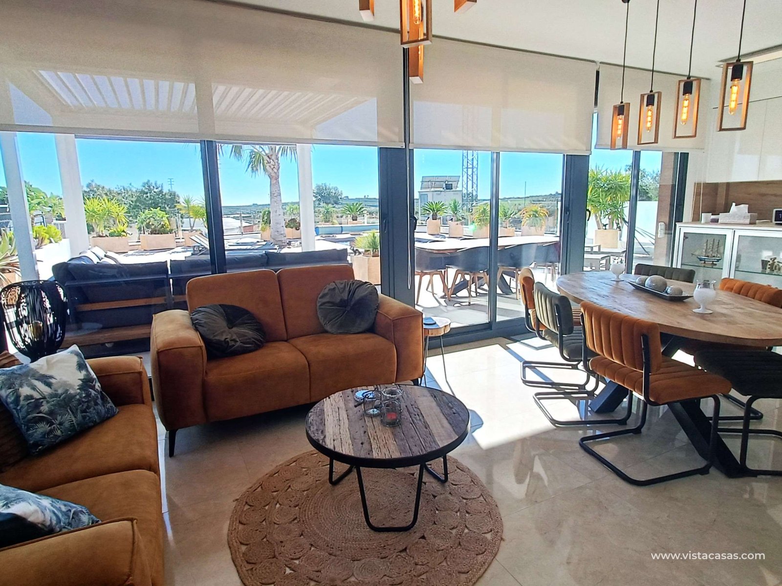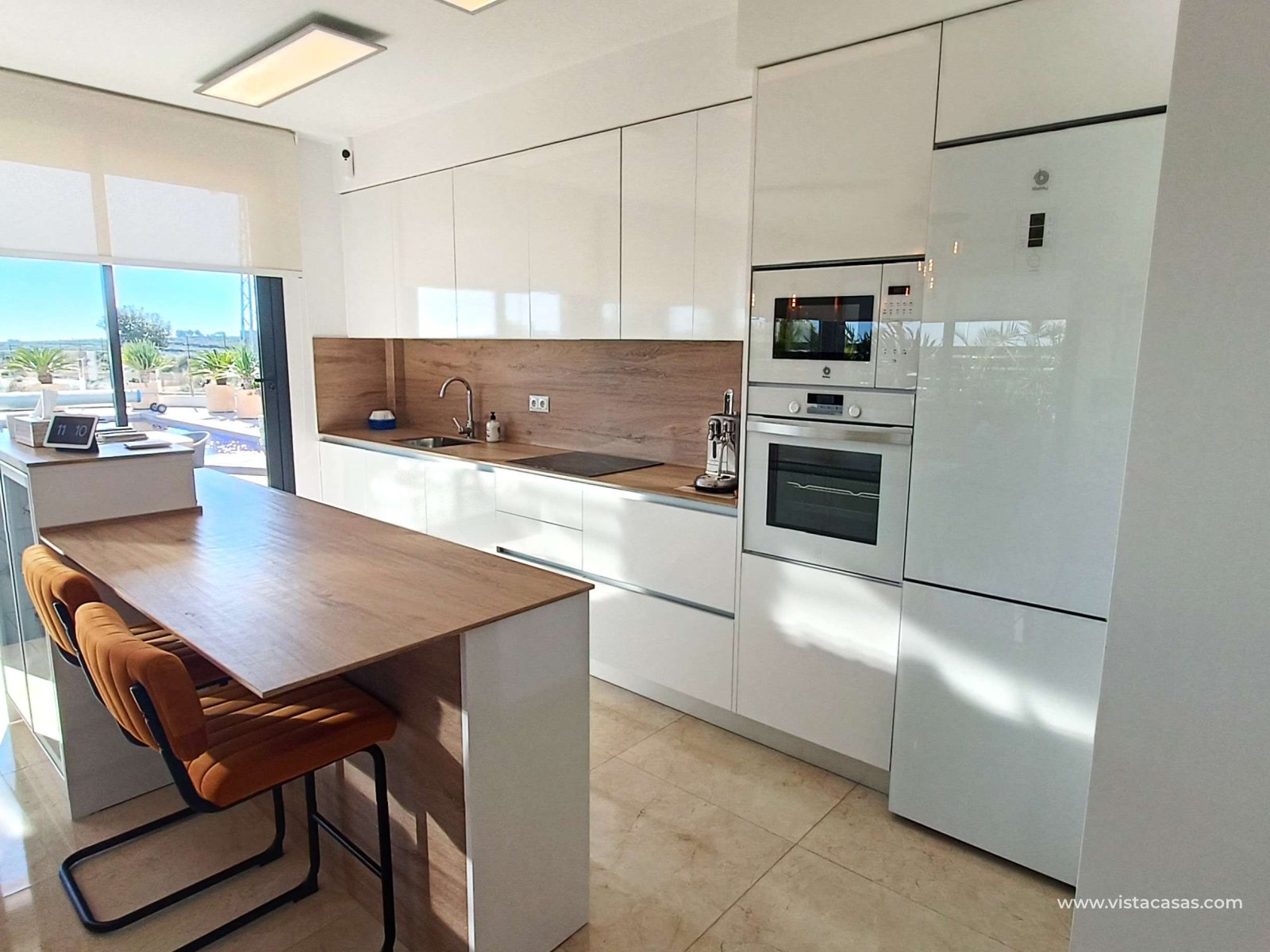 Deze uitzonderlijke vrijstaande villa is ideaal gelegen in het prestigieuze La Finca Golf & Spa Resort en biedt een perfecte mix van modern design, comfort en uitstekend buitenleven. De woning ligt op een gewilde locatie en geniet van een rustige omgeving, terwijl het op loopafstand ligt van het commerciële centrum van La Finca en op slechts 10 minuten rijden van de charmante stadjes Algorfa en Ciudad Quesada. Bij binnenkomst in de villa wordt u verwelkomd in een lichte en ruime open woon- en eetkamer, die naadloos aansluit op een volledig ingerichte moderne keuken. Kamerhoge ramen laten veel natuurlijk licht binnen en creëren een heerlijk gevoel van openheid, terwijl ze ook een prachtig uitzicht op het terras en het omringende landschap bieden. De smetteloze keuken is voorzien van een stijlvolle ontbijtbar die zowel extra opbergruimte als een praktische sociale ruimte biedt, perfect voor een informele maaltijd of om gasten te ontvangen. Op de begane grond bevindt zich ook een van de drie royale slaapkamers, compleet met inbouwkasten en elegante glazen schuifdeuren die uitkomen op een eigen zijterras - een ideale plek om 's ochtends in de frisse lucht van een kopje koffie te genieten. Een moderne familiebadkamer met een strakke inloopdouche en minimalistische inrichting bevindt zich vlakbij. In de hal bevindt zich ook een discrete kledingkast die dienst doet als centrale hub voor de elektriciteit van het pand, die het afgelopen jaar is vernieuwd, wat extra gemoedsrust biedt. Op de eerste verdieping bevindt zich de indrukwekkende hoofdslaapkamer, voorzien van inbouwkasten, een stijlvolle en-suite badkamer en een prachtig uitzicht vanuit de grote ramen. Op deze verdieping bevinden zich ook de derde slaapkamer en een tweede familiebadkamer. Beide slaapkamers hebben directe toegang tot het balkon op de eerste verdieping, een prachtige uitbreiding van de leefruimte waar u kunt genieten van de zon en naadloze toegang heeft tot het uitgestrekte solarium boven. Een van de opvallende kenmerken van deze villa is het spectaculaire solarium op het dak, dat een ongelooflijk 360 graden panoramisch uitzicht biedt, inclusief uitzicht op de zee in de verte. Deze royale ruimte is perfect om gasten te ontvangen, te ontspannen met het gezin of gewoon te zonnebaden terwijl u geniet van het mediterrane klimaat. Het pand beschikt ook over een indrukwekkende kelder die zorgvuldig is omgetoverd tot een veelzijdige recreatieruimte, compleet met een thuisbioscoop en bar - een ideale setting voor entertainment. Deze flexibele ruimte kan gemakkelijk worden aangepast aan de behoeften van de nieuwe eigenaar, of het nu gaat om een speelkamer, fitnessruimte, kantoor of extra woonruimte. De huidige eigenaren hebben de functionaliteit verbeterd door een binnenmuur te plaatsen die de hoofdrecreatieruimte scheidt van de ruime dubbele garage, die ook is voorzien van kamerhoge kasten voor uitgebreide opslagruimte en plaats biedt aan twee grote voertuigen. Grenzend aan de entertainmentruimte bevindt zich een ruime bijkeuken, slim gepositioneerd om wasapparatuur discreet uit het zicht te houden en tegelijkertijd een praktische werkruimte te bieden voor dagelijks gebruik. Aan de buitenkant blinkt de villa echt uit door zijn overvloed aan buitenruimte. De prachtig ontworpen buitenruimte is toegankelijk vanuit zowel de hoofdlounge als de omheinde ingang en beschikt over een groot verwarmd zwembad dat dankzij de gunstige ligging van het pand de hele dag zon heeft. Rondom het zwembad bevindt zich een speciale eet- en zithoek, perfect om te genieten van lange zomerdagen en ontspannen avonden in de buitenlucht. Twee bioklimatische pergola's bieden flexibele schaduw en privacy, waardoor de buitenruimte het hele jaar door beter bruikbaar is. Deze prachtige woning wordt verder verrijkt door een reeks hoogwaardige extra's, waaronder airconditioning in het hele huis, zonnepanelen, elektrische zonwering, horren aangebracht op de schuifdeuren van de woonkamer en alle slaapkamers, een buitendouche, versterkte betonnen fundering met structurele balken, vloerverwarming in de badkamers, een uitgebreid beveiligingssysteem met camera's en een zwembadafdekking. De woning wordt gedeeltelijk gemeubileerd aangeboden, waarbij over bepaalde meubelstukken kan worden onderhandeld. De villa ligt in het gerenommeerde La Finca Golf & Spa Resort en profiteert van een prachtig onderhouden omgeving rondom een bekroonde golfbaan, luxe spafaciliteiten en een levendig winkelgebied met restaurants, cafés en essentiële voorzieningen. Het resort staat bekend om zijn rustige sfeer, schilderachtige omgeving en uitstekende bereikbaarheid, waardoor het een zeer gewilde locatie is voor zowel permanent wonen als vakantieplezier aan de Costa Blanca.