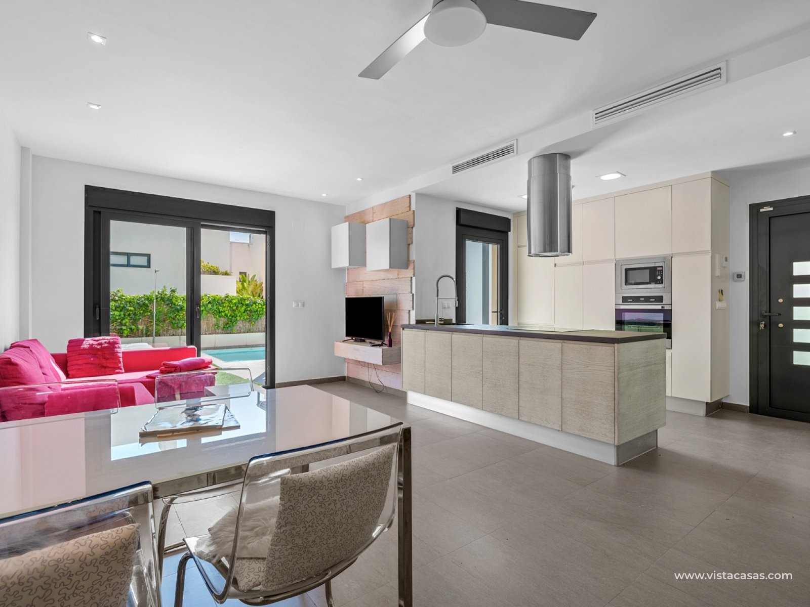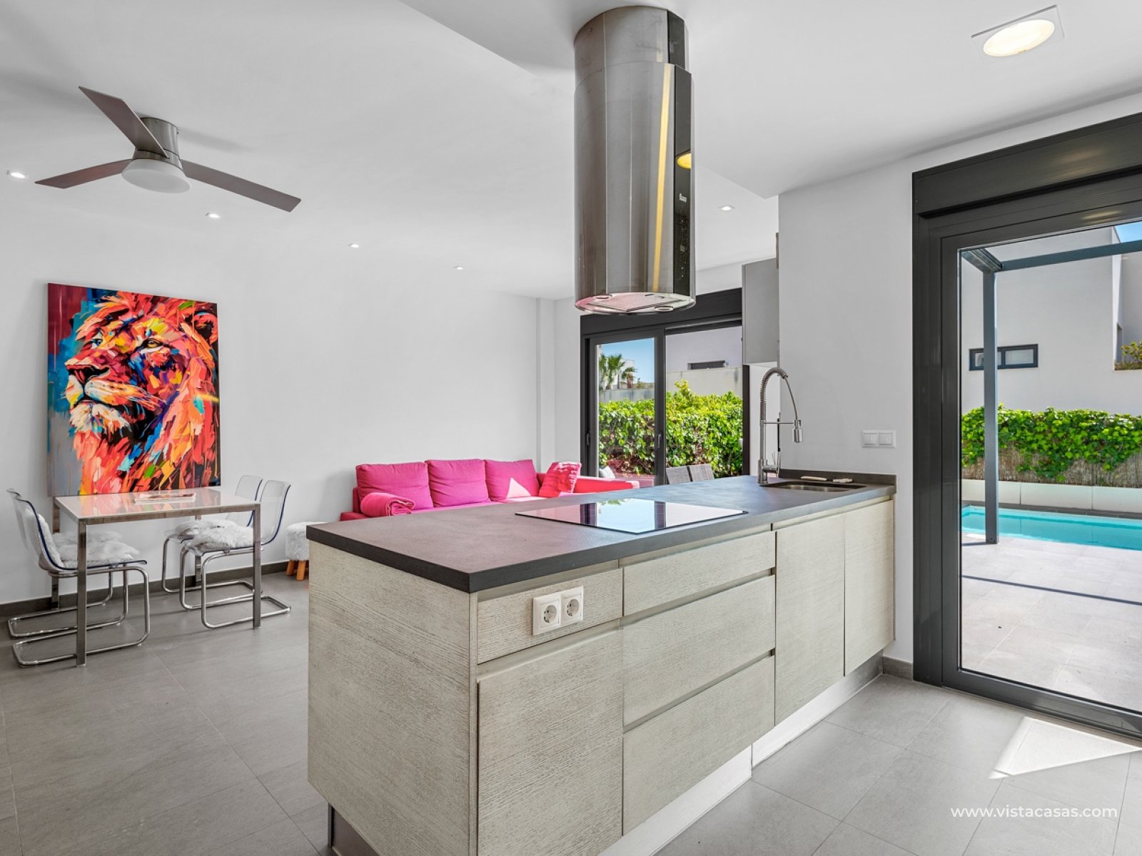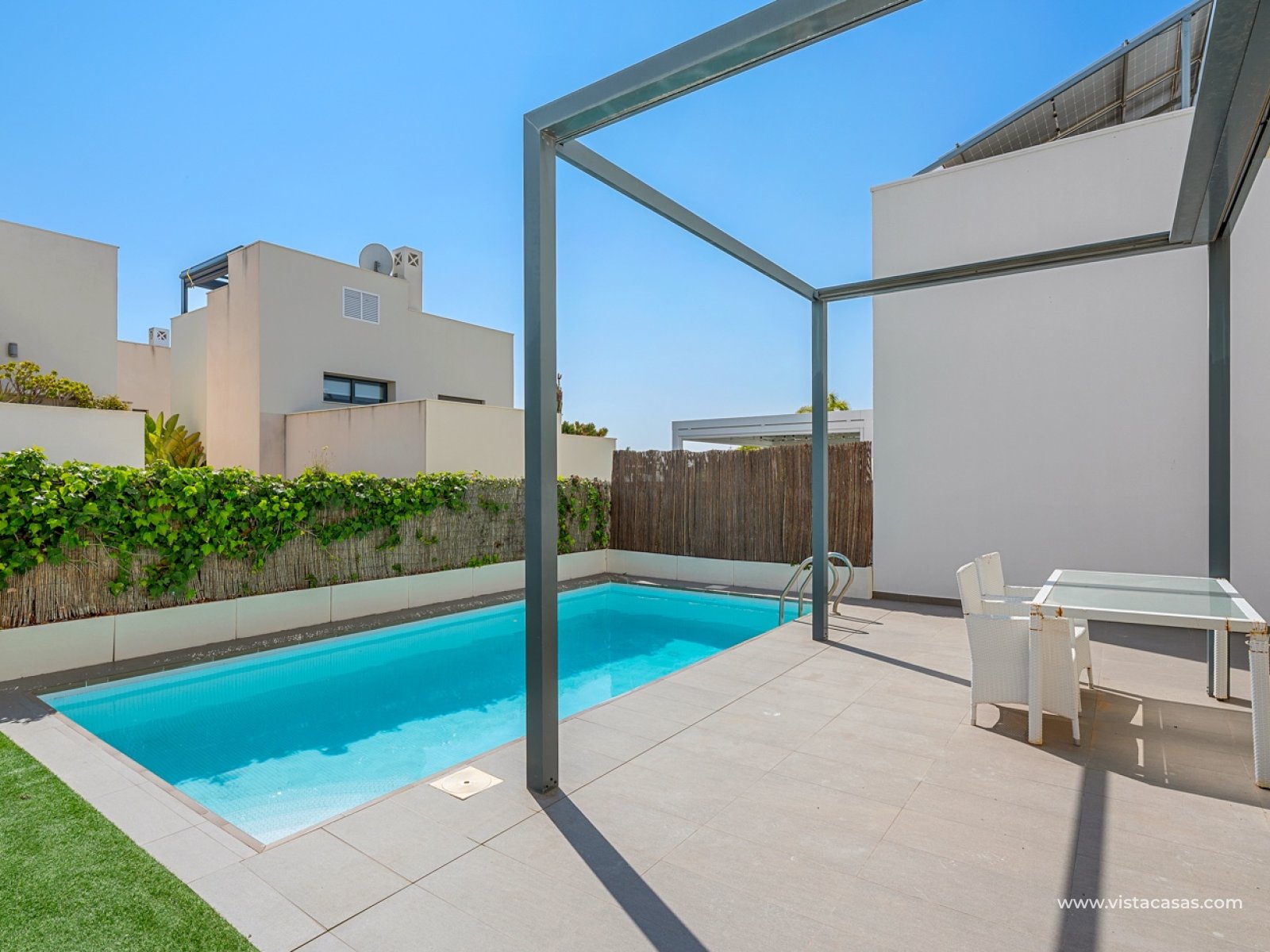 Ontdek deze exclusieve vrijstaande villa in het gewilde Ciudad Quesada, een van de meest gevraagde locaties aan de Costa Blanca dankzij de hoge levenskwaliteit, het uitstekende klimaat en de nabijheid van stranden, voorzieningen en golfbanen. Deze prachtige woning onderscheidt zich door de zuidelijke oriëntatie, die de hele dag door natuurlijk licht garandeert, en het privézwembad – perfect om in alle privacy van de mediterrane levensstijl te genieten. Op de begane grond biedt de villa een modern en functioneel ontwerp met een open keuken die volledig geïntegreerd is in een ruime en lichte woonkamer. Er is ook een complete badkamer op deze verdieping. Op de eerste verdieping zijn er twee tweepersoonsslaapkamers en een tweede badkamer. De hoofdslaapkamer heeft een eigen balkon, terwijl de gastenslaapkamer ook een balkon heeft met directe toegang via een trap naar een groot solarium met prachtig uitzicht. De villa ligt in een afgesloten wooncomplex met tropische tuinen, wat zorgt voor een veilige en rustige omgeving. De woning beschikt bovendien over een toegewezen parkeerplaats bij de ingang van het complex. Een perfecte kans als permanente woning, vakantiehuis of investering.