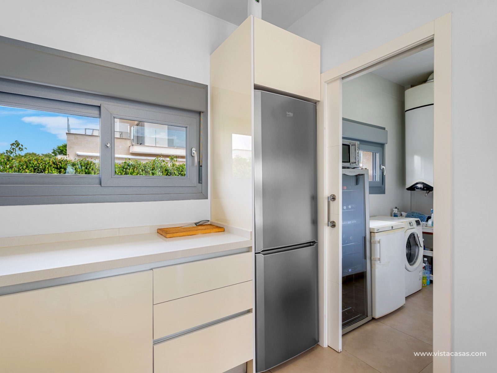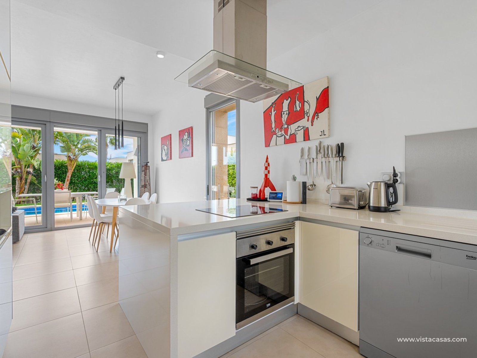 Ta niedawno odświeżona willa oferuje wszystko, czego można oczekiwać od komfortowego i stylowego domu pod słońcem. Nieruchomość składa się z 3 przestronnych sypialni i 2 nowoczesnych łazienek, z których jedna posiada osobne pomieszczenie pralni. Jasny i przestronny salon płynnie łączy się z otwartą kuchnią, wyposażoną w dodatkowe zabudowane szafki wzdłuż całej ściany – idealne rozwiązanie dla dodatkowego miejsca do przechowywania i eleganckiego wykończenia. Całe wnętrze zostało niedawno odmalowane i odświeżone fugami, dzięki czemu dom jest gotowy do zamieszkania. Ciesz się życiem na świeżym powietrzu przez cały rok dzięki podgrzewanemu prywatnemu basenowi, otoczonemu pięknie zagospodarowanym ogrodem z naturalną trawą i ozdobnymi roślinami. Wysokiej jakości drewniany domek ogrodowy o powierzchni 12 m² zapewnia dodatkową przestrzeń do przechowywania lub może służyć jako warsztat czy miejsce do hobby. Unikalną cechą tej nieruchomości jest system oczyszczania wody oparty na osmozie, który dostarcza przefiltrowaną wodę do całego domu – to duży atut pod względem komfortu i zdrowia. Wszystkie okna zostały dodatkowo zabezpieczone, co zapewnia spokój i bezpieczeństwo. Lokalizacja jest idealna: zaledwie 5 minut spacerem do pola golfowego i przytulnego klubu. Niezależnie od tego, czy jesteś zapalonym golfistą, czy po prostu szukasz spokoju i luksusu blisko wszelkich udogodnień – ta willa ma wszystko, czego potrzebujesz.