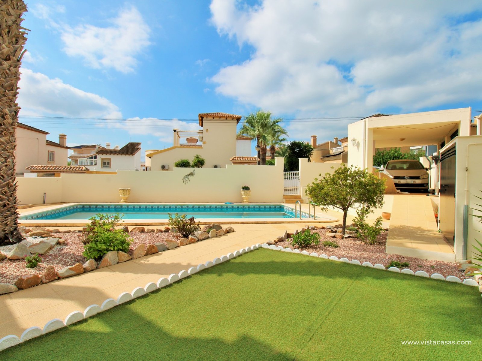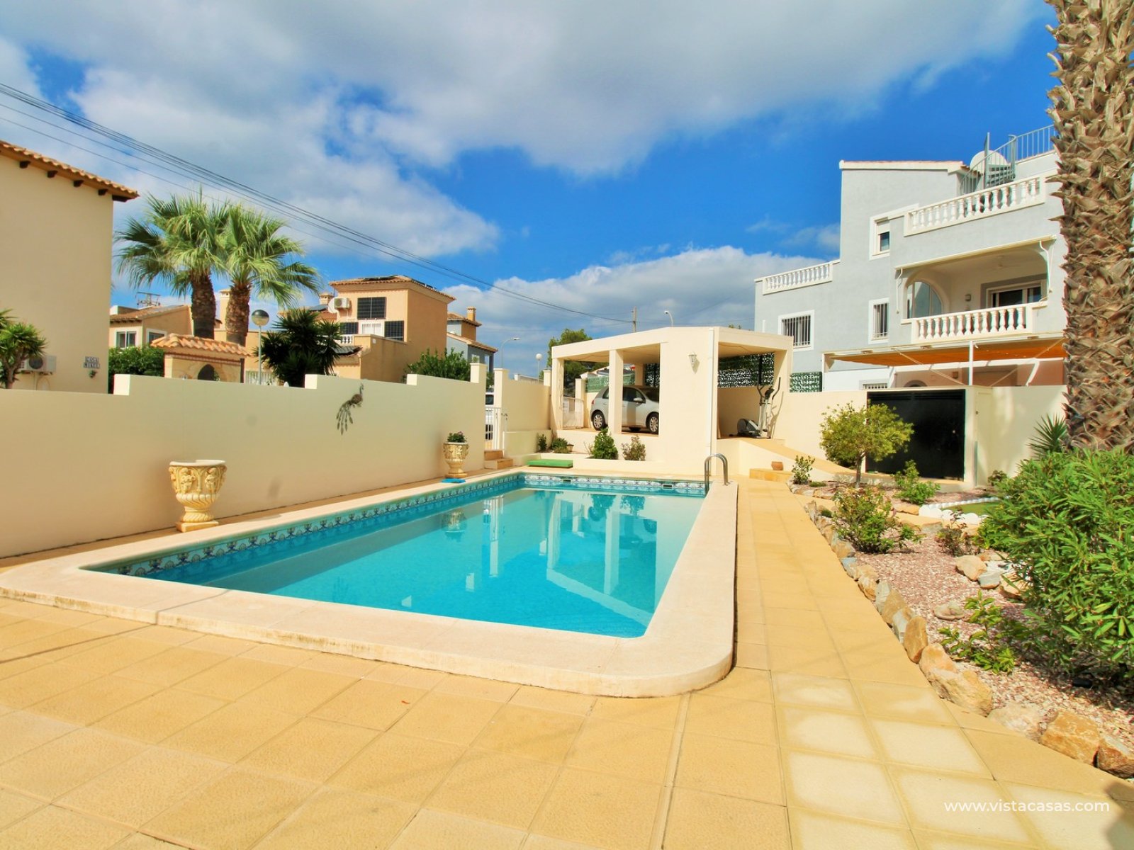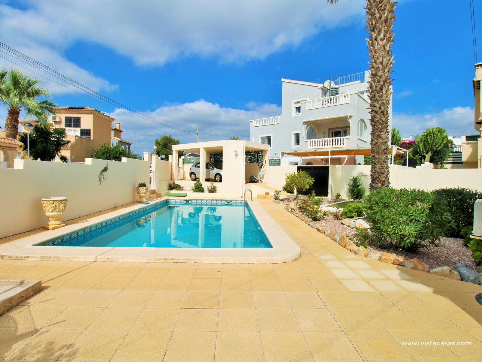 Na zewnątrz willa oferuje duży basen 10 × 5 m, ogród łatwy w utrzymaniu oraz zadaszoną wiatę garażową. Dodatkowo jest instalacja centralnego ogrzewania gazowego oraz liczne tarasy do wypoczynku na świeżym powietrzu. Położenie blisko udogodnień lokalnych, pól golfowych oraz plaż na Costa Orihuela sprawia, że nieruchomość doskonale nadaje się zarówno jako dom stały, jak i dom wakacyjny.