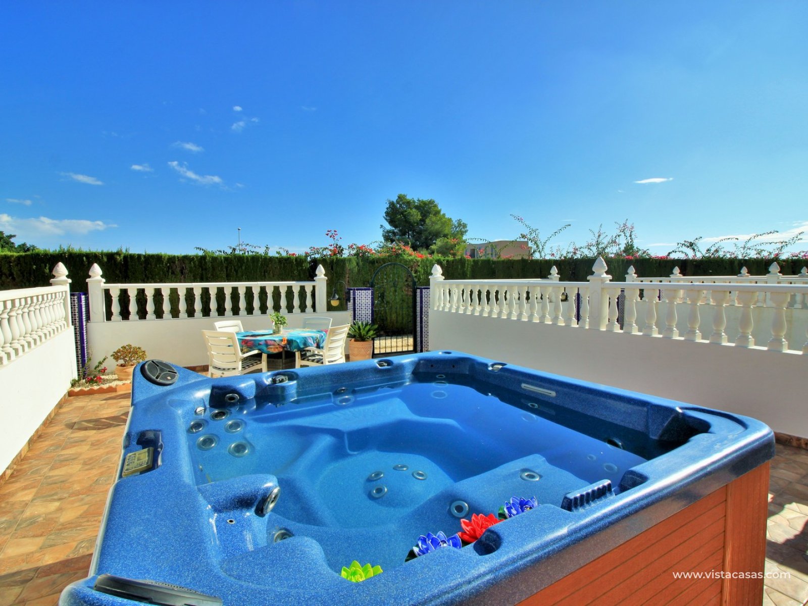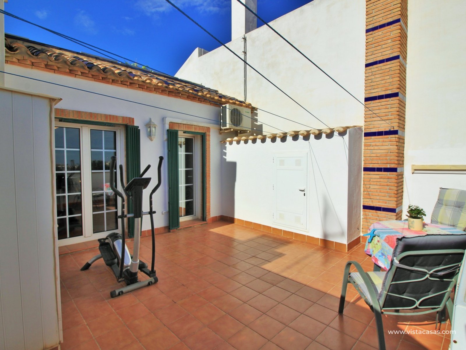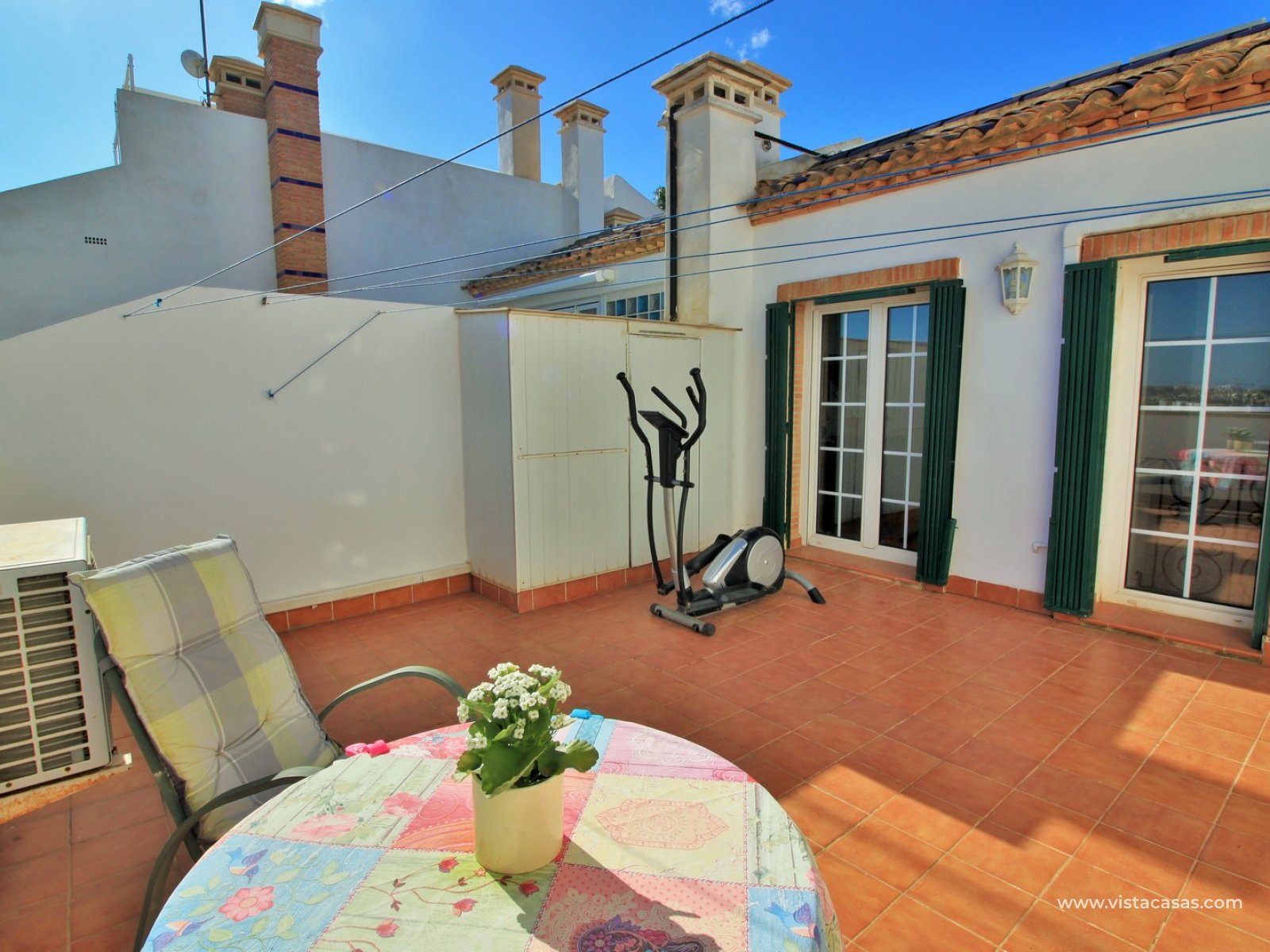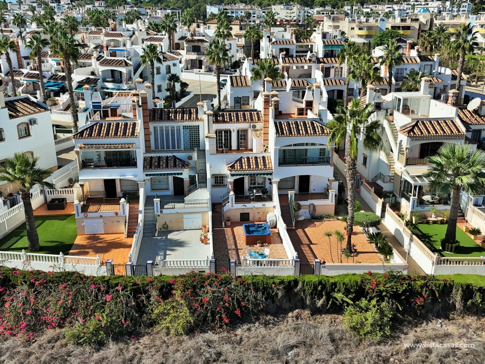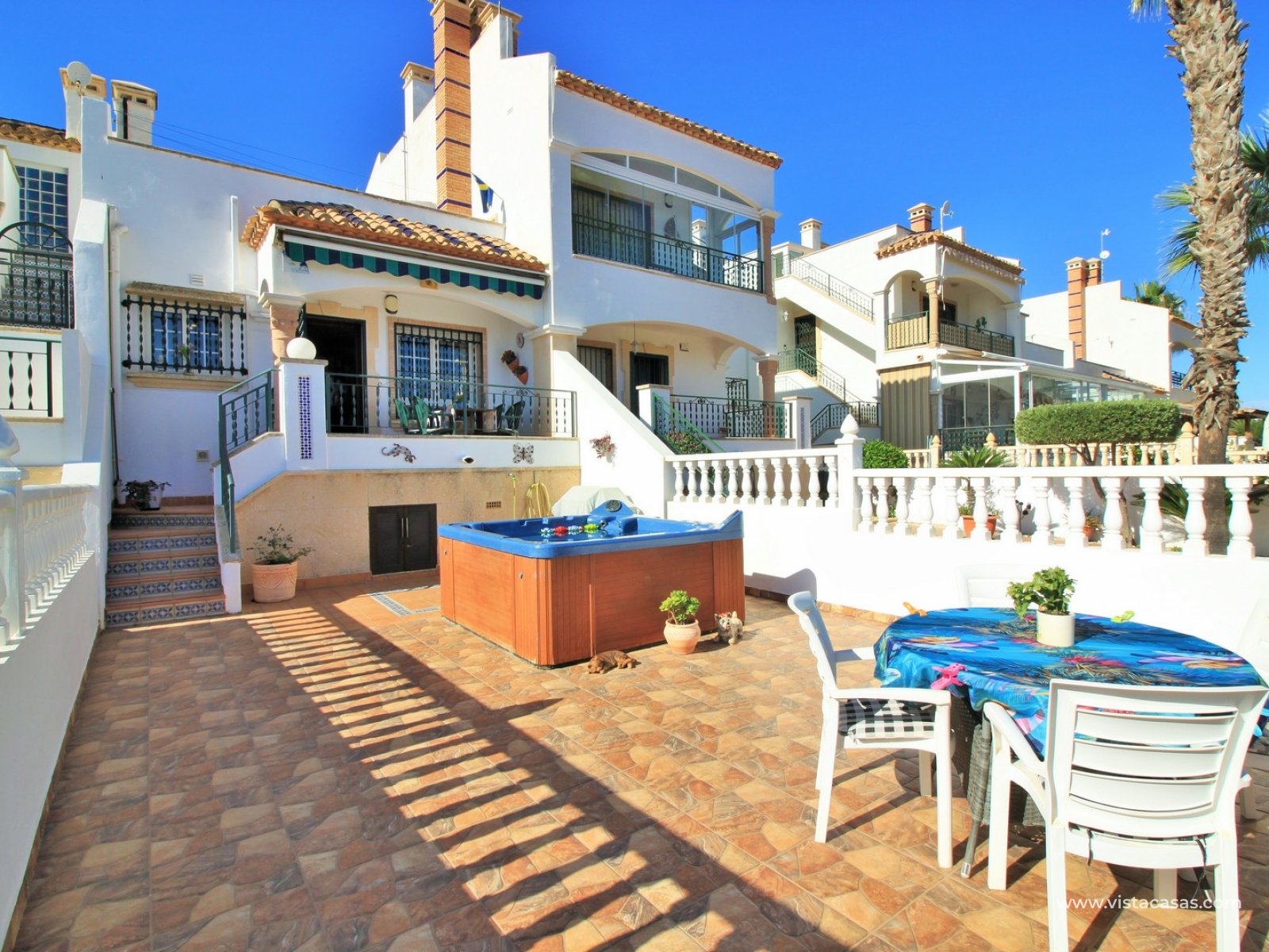 The property is distributed over 2 levels, with the ground floor comprising of a spacious lounge-dining area, with a fully equipped kitchen to the side plus utility area. To the rear are 2 bedrooms with fitted wardrobes, and a family bathroom with walk-in shower. From one of the bedrooms, French doors leads out to the beautiful rear garden, a perfect space to entertain guests. Upstairs you will find the master bedroom, complete with an en-suite bathroom with walk-in shower, plus a large storage area. From the landing, and master bedroom, you can access the roof solarium, which offers further storage areas, and views of the surrounding area and sea. The front garden has a hot tub, and there is a raised terrace area, perfect for your morning coffee! The property is sold furnished, with white goods and air-conditioning. Another added benefit is that the property has a solar water heater (400L tank) which provides hot water throughout the year. There is also central heating. A meticulously maintained property in a prime position. Part of a community with the use of a communal pool and garden areas.
