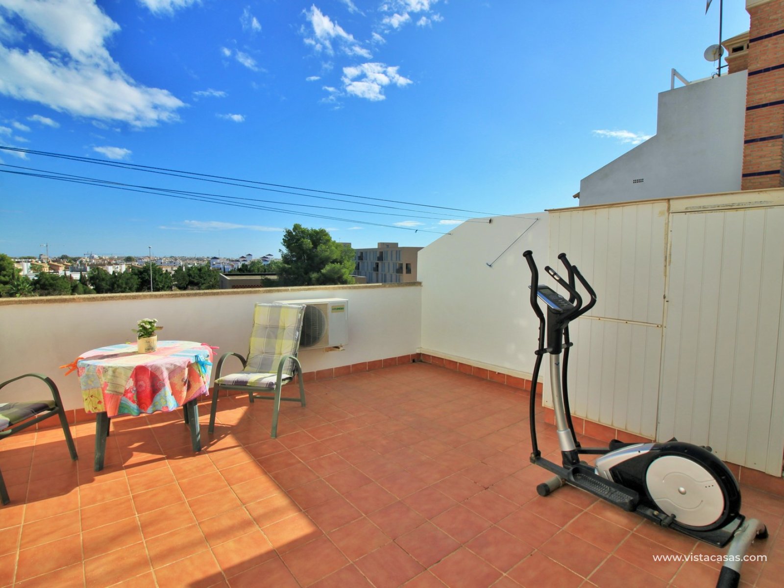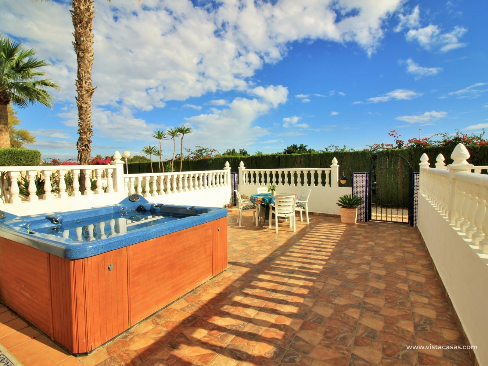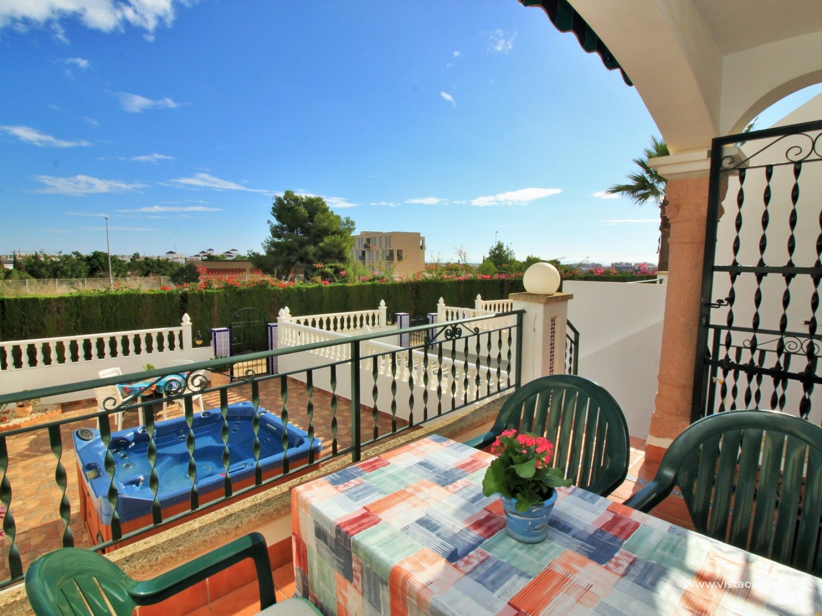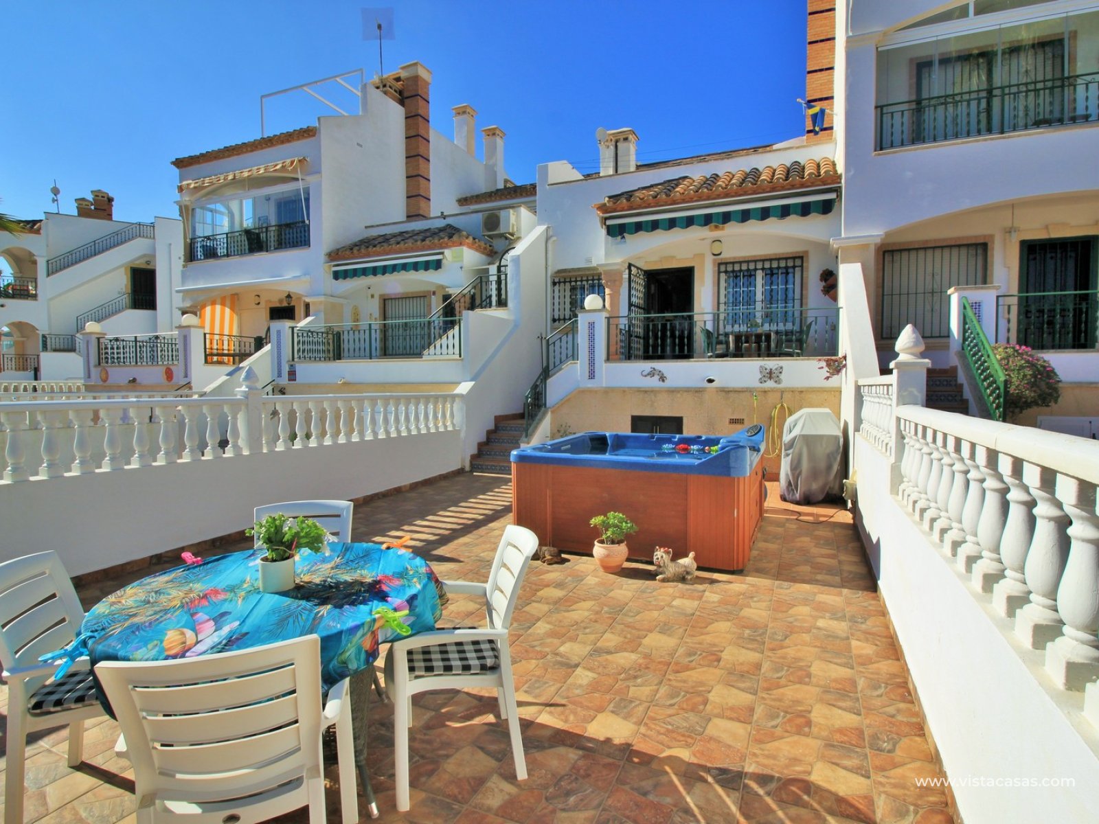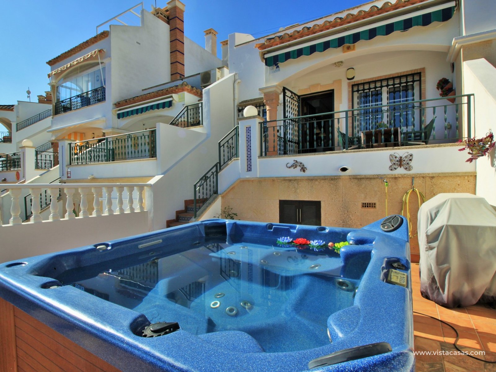 The property is distributed over 2 levels, with the ground floor comprising of a spacious lounge-dining area, with a fully equipped kitchen to the side plus utility area. To the rear are 2 bedrooms with fitted wardrobes, and a family bathroom with walk-in shower. From one of the bedrooms, French doors leads out to the beautiful rear garden, a perfect space to entertain guests. Upstairs you will find the master bedroom, complete with an en-suite bathroom with walk-in shower, plus a large storage area. From the landing, and master bedroom, you can access the roof solarium, which offers further storage areas, and views of the surrounding area and sea. The front garden has a hot tub, and there is a raised terrace area, perfect for your morning coffee! The property is sold furnished, with white goods and air-conditioning. Another added benefit is that the property has a solar water heater (400L tank) which provides hot water throughout the year. There is also central heating. A meticulously maintained property in a prime position. Part of a community with the use of a communal pool and garden areas.