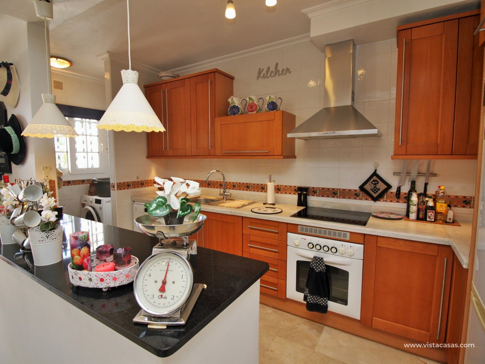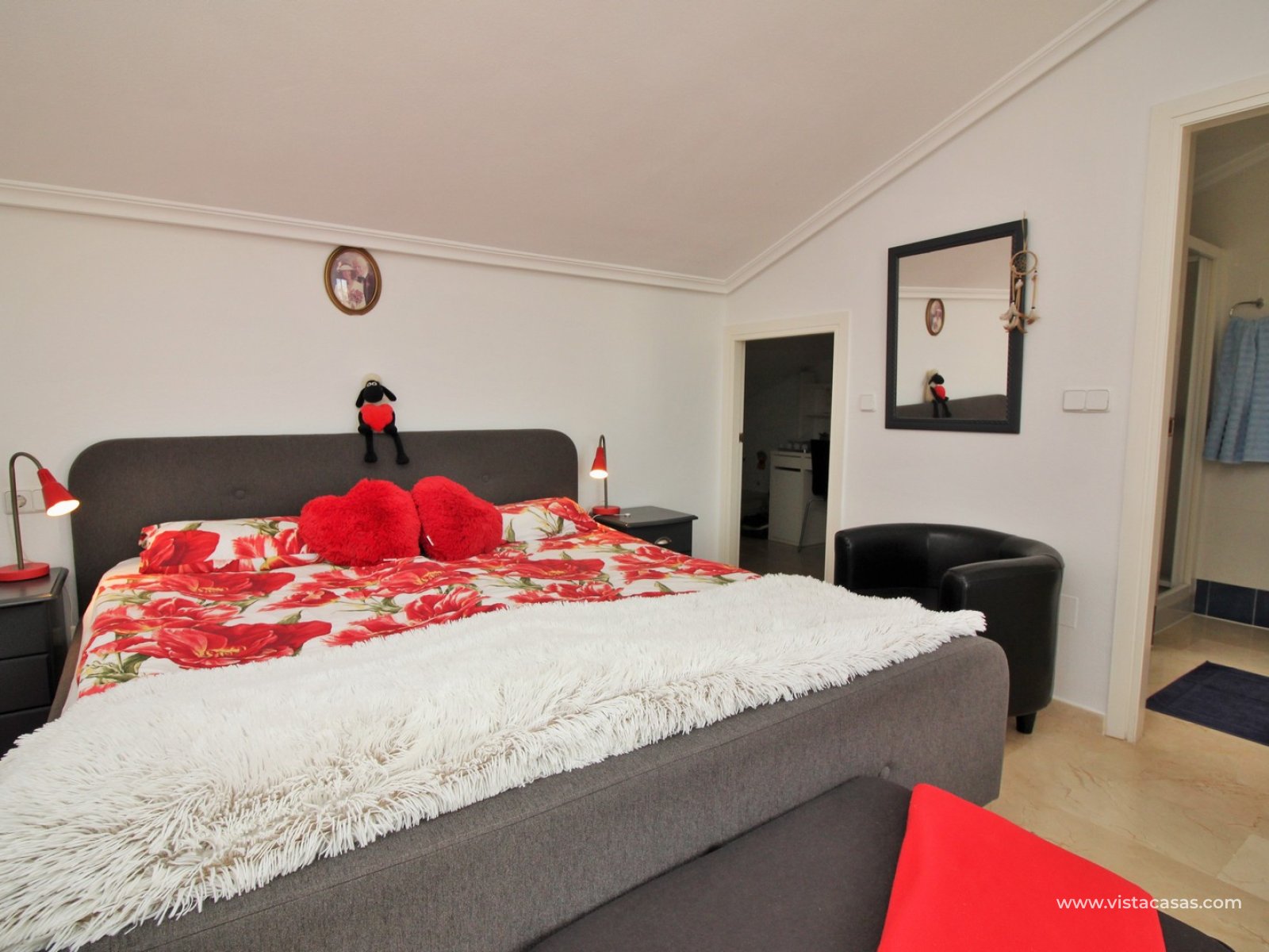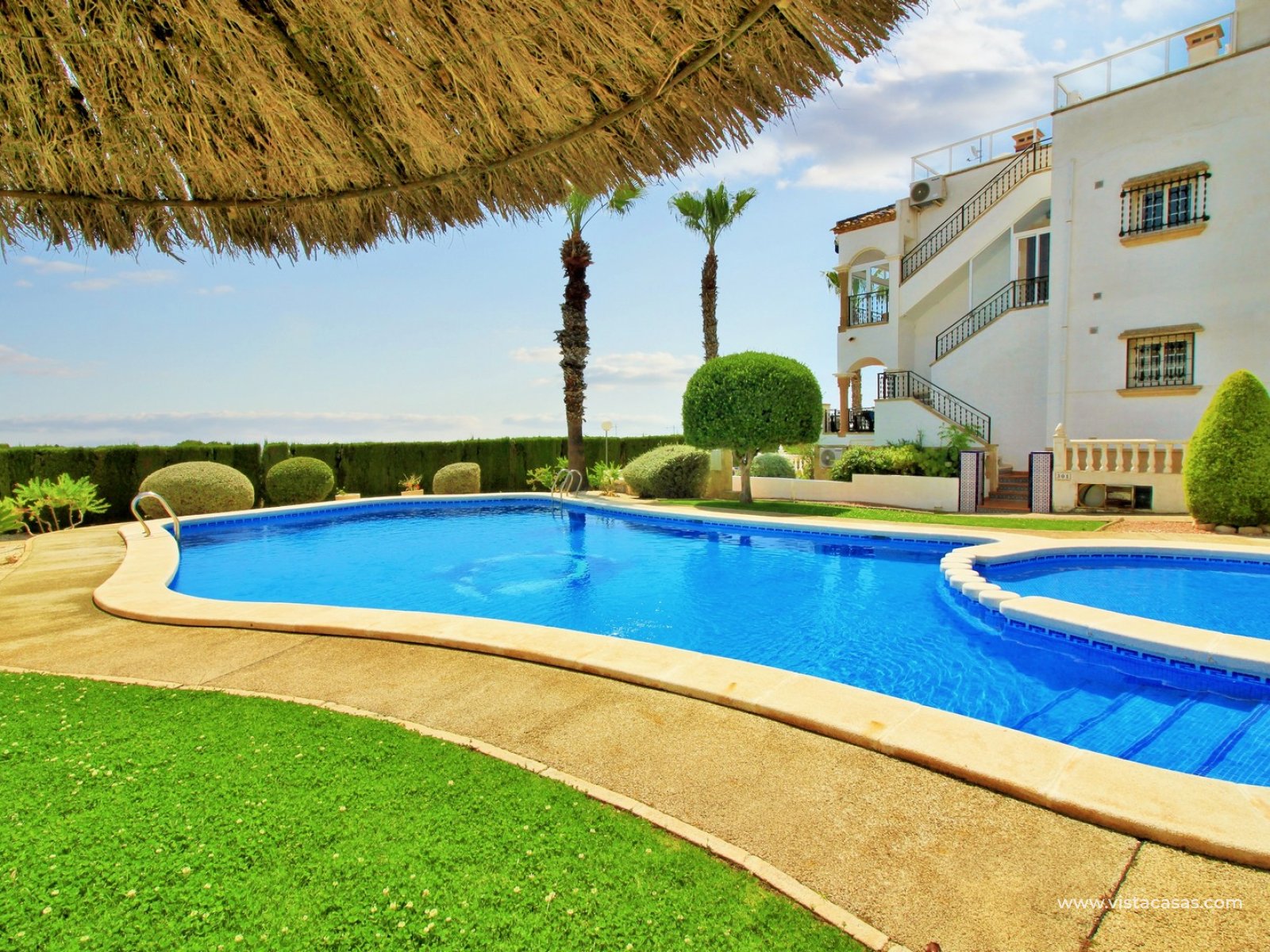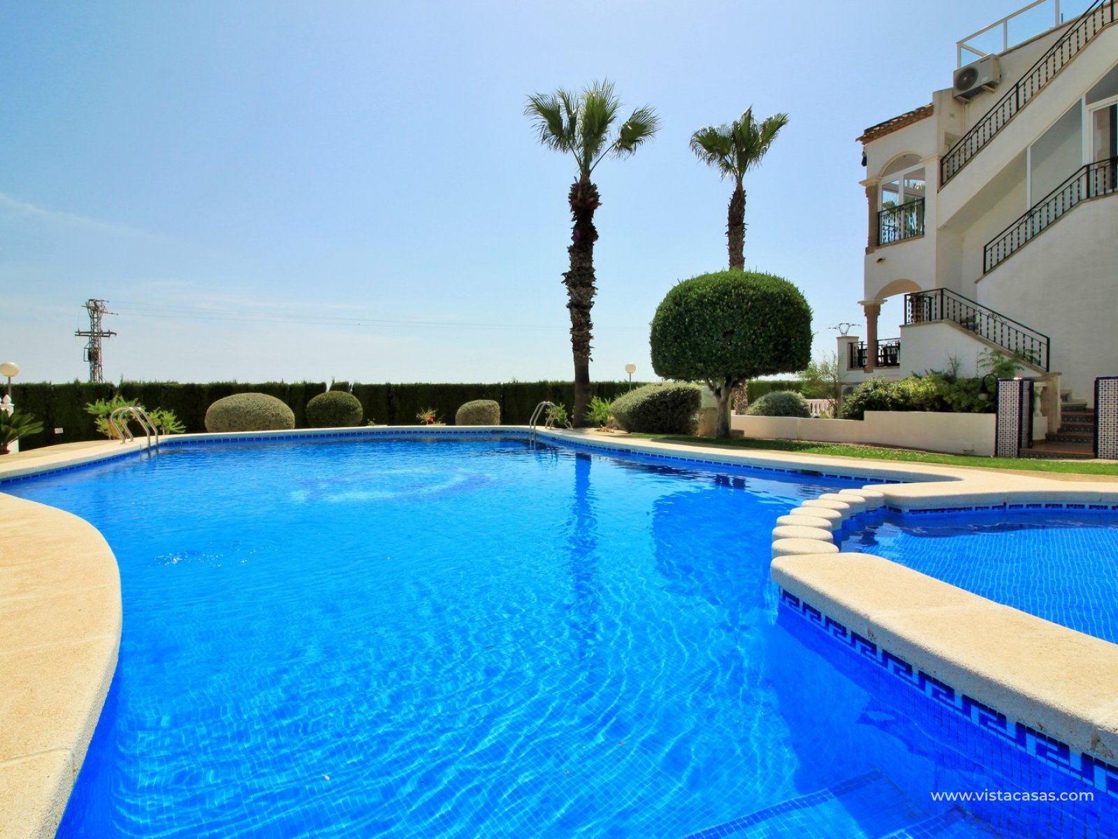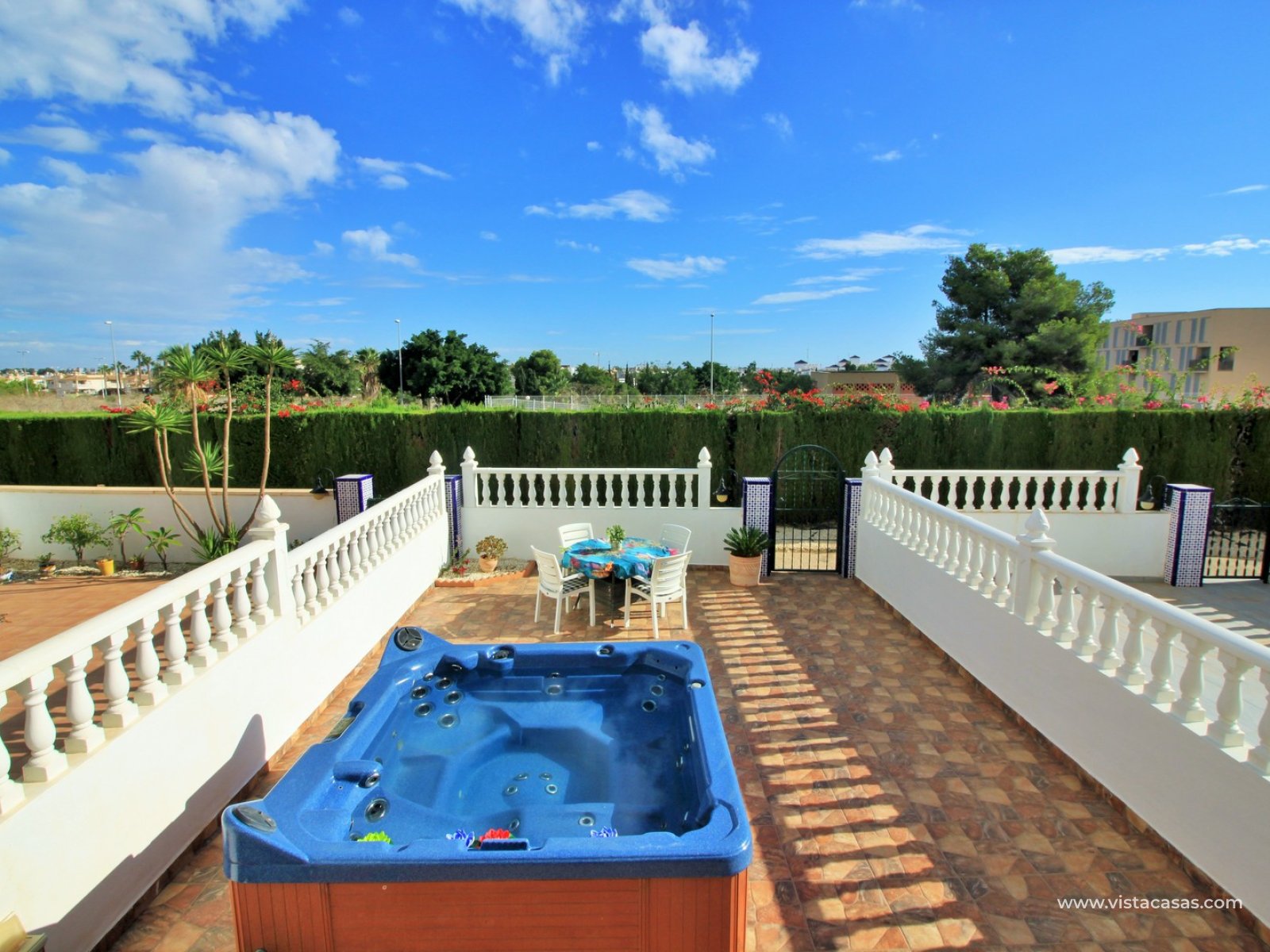 The property is distributed over 2 levels, with the ground floor comprising of a spacious lounge-dining area, with a fully equipped kitchen to the side plus utility area. To the rear are 2 bedrooms with fitted wardrobes, and a family bathroom with walk-in shower. From one of the bedrooms, French doors leads out to the beautiful rear garden, a perfect space to entertain guests. Upstairs you will find the master bedroom, complete with an en-suite bathroom with walk-in shower, plus a large storage area. From the landing, and master bedroom, you can access the roof solarium, which offers further storage areas, and views of the surrounding area and sea. The front garden has a hot tub, and there is a raised terrace area, perfect for your morning coffee! The property is sold furnished, with white goods and air-conditioning. Another added benefit is that the property has a solar water heater (400L tank) which provides hot water throughout the year. There is also central heating. A meticulously maintained property in a prime position. Part of a community with the use of a communal pool and garden areas.