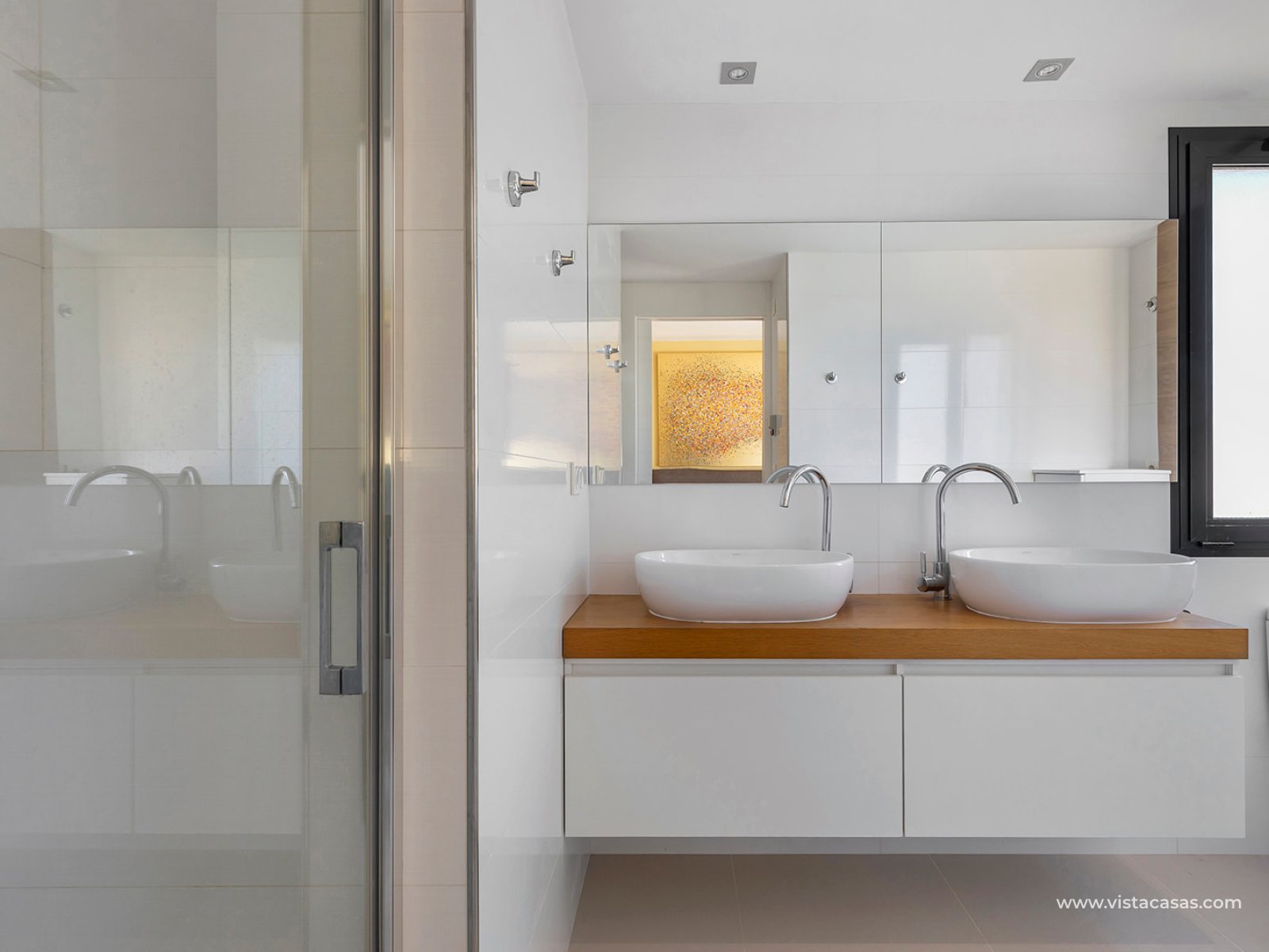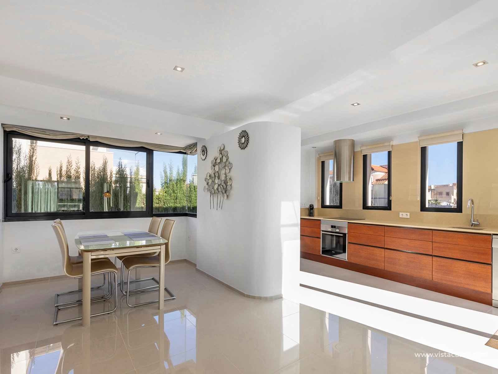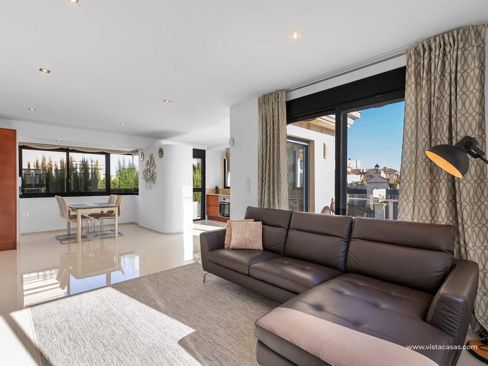 Luxury villa in La Zenia, Orihuela Costa. This villa is situated in an exclusive residential area and has its own private pool and a plot of 410m2. The property has 250m2 built area divided into 4 floors. On the ground floor there is a spacious living room with open plan kitchen, 1 bedroom, 1 bathroom and terrace with access to the pool. On the semi-basement floor there is a living room with open plan kitchen, 2 bedrooms and 1 bathroom. This floor also has a sauna and shower. On the first floor there are 2 bedrooms, each with en-suite bathroom and a large terrace. On the top floor there is a large solarium of 46m2. La Zenia is close to Cabo Roig, Campoamor and Playa Flamenca. It is a tourist area located close to all amenities of the famous La Zenia Boulevard shopping centre. A few minutes from the N-332 and the Mediterranean motorway AP-7 towards Alicante and Cartagena. There are also around the golf courses of Villamartin, Las Ramblas, Campoamor and Las Colinas.