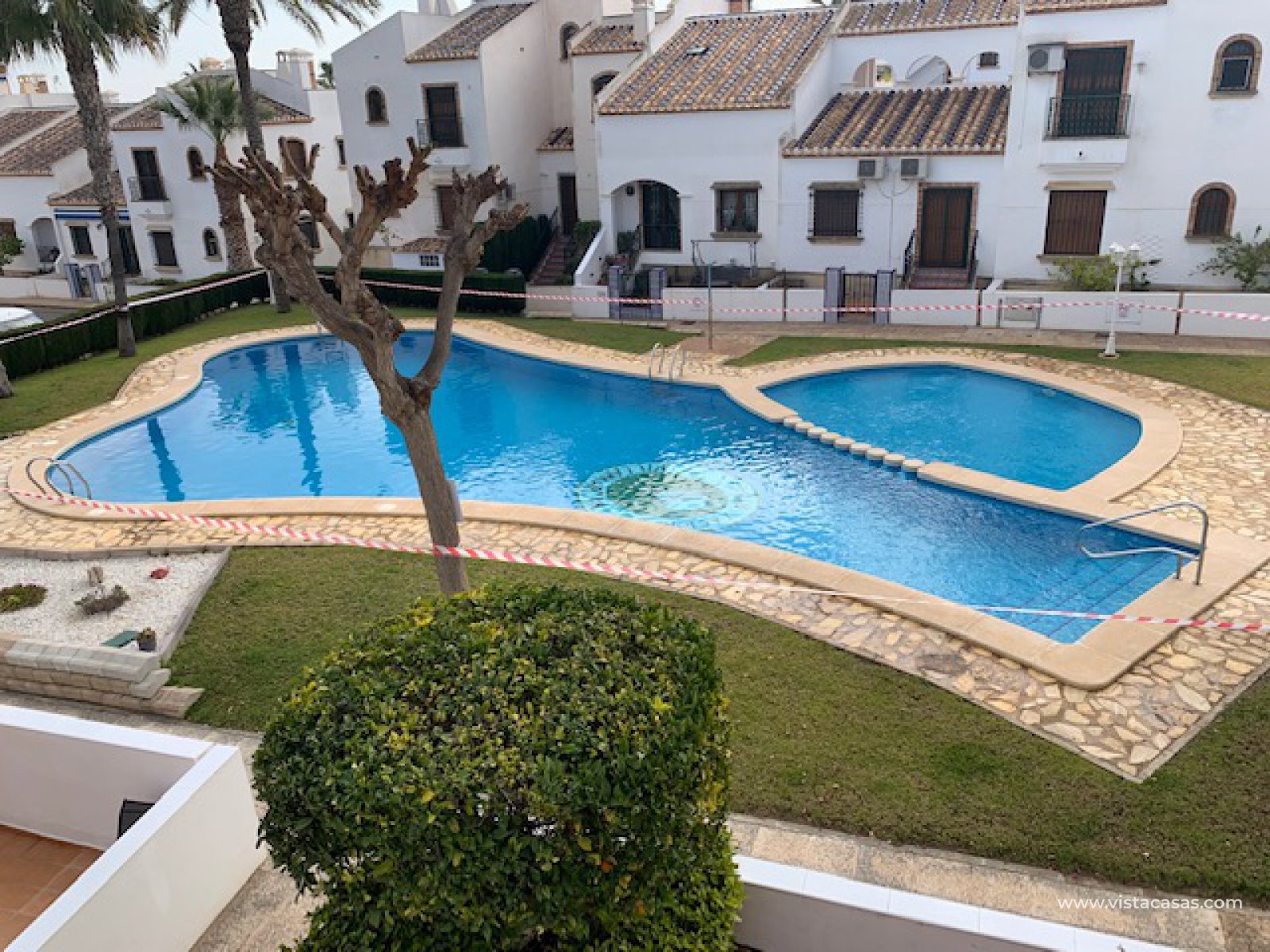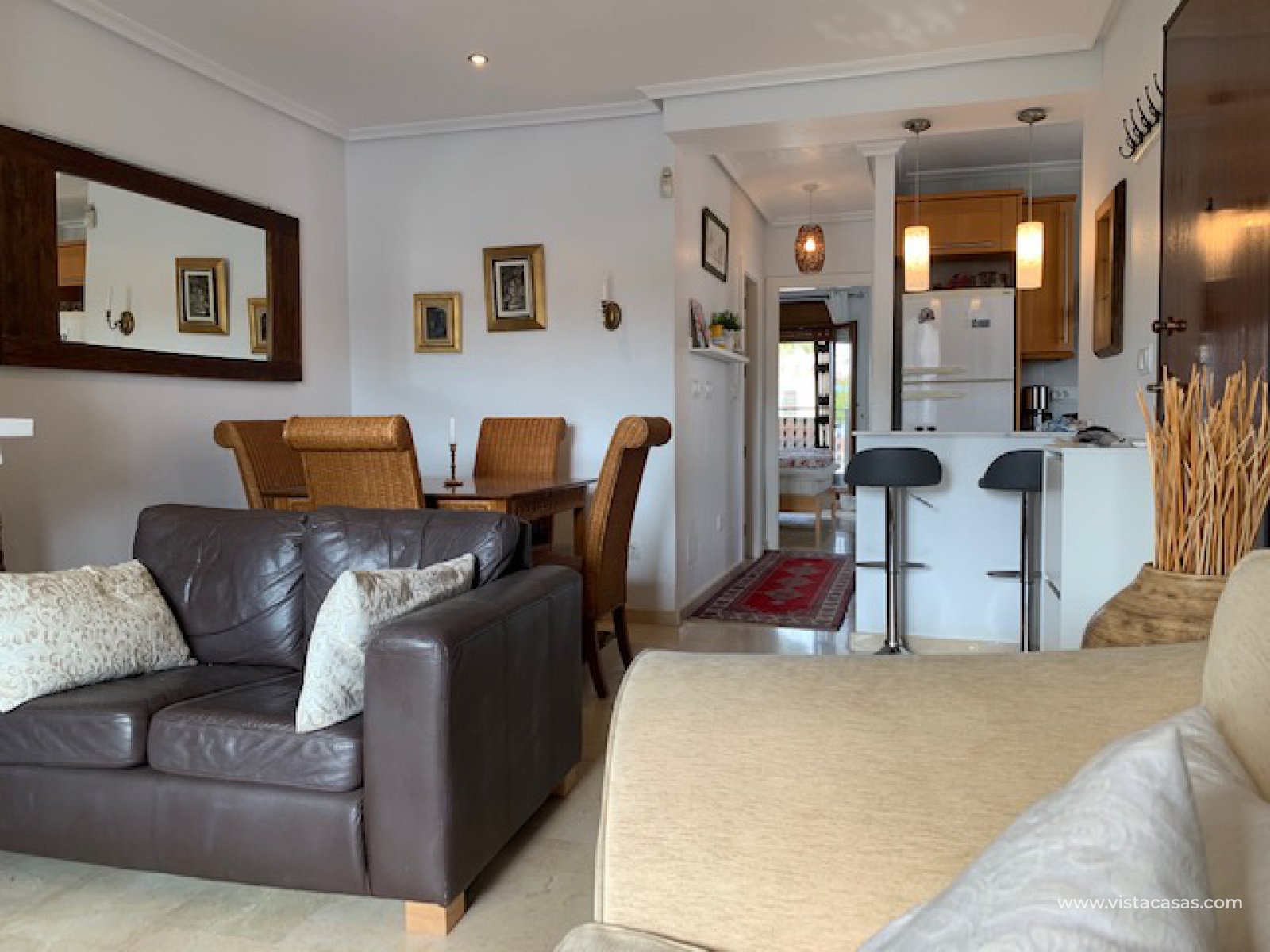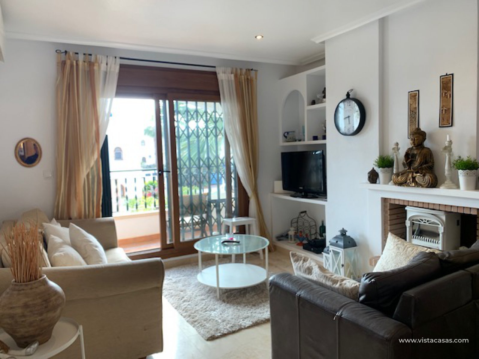 Well presented top floor apartment overlooking the pool, located in a popular area of Pau 8 within walking distance to Villamartin Golf Club and Plaza, which offers various restaurants, bars, shops, banks, etc., and a short drive from beaches of Orihuela Costa. The property consists of living/dining room with fireplace, open plan kitchen with utility room, 2 double bedrooms and 2 bathrooms (master bedroom with ensuite). The property has a private garden and solarium with barbecue. This apartment is perfectly situated in a beautiful community with swimming pool and green areas. The property is ideal for holiday or permanent all year round living.