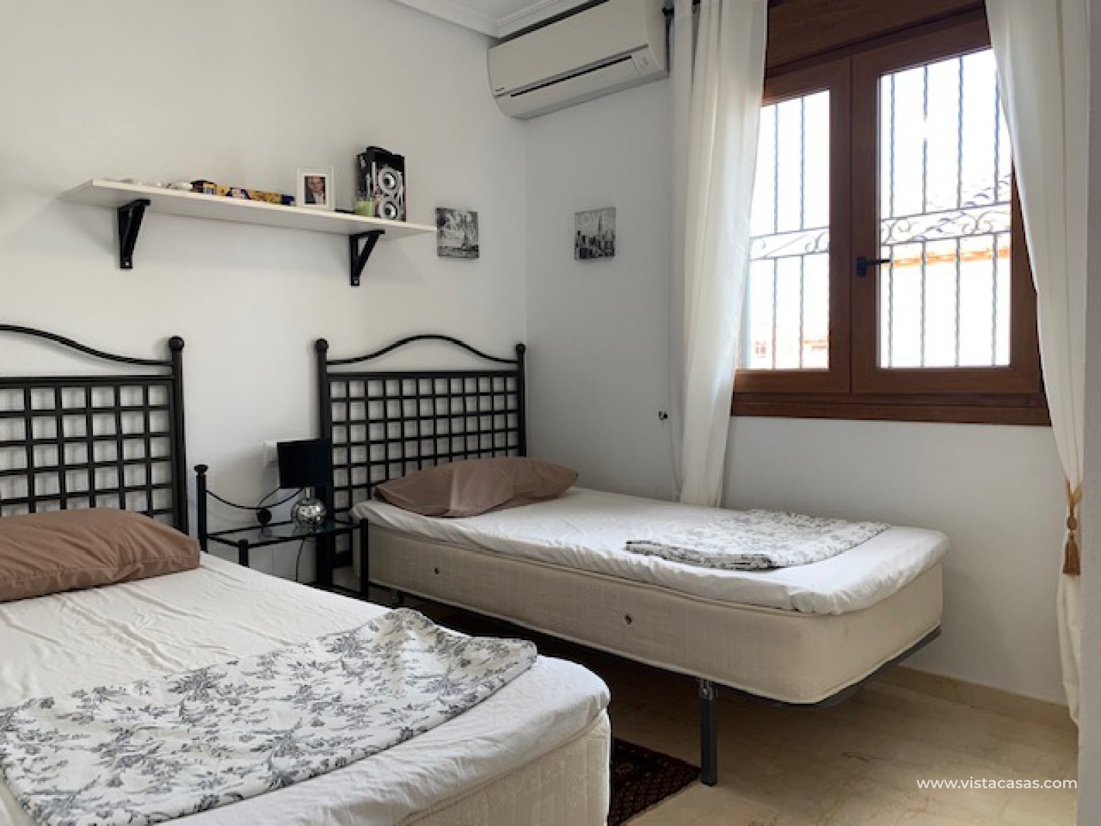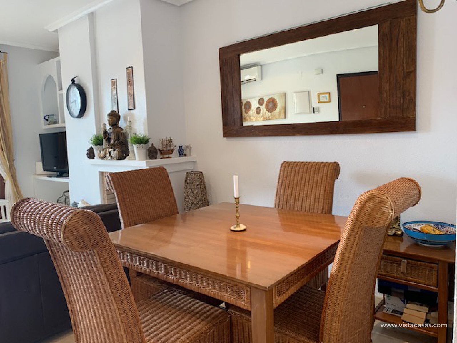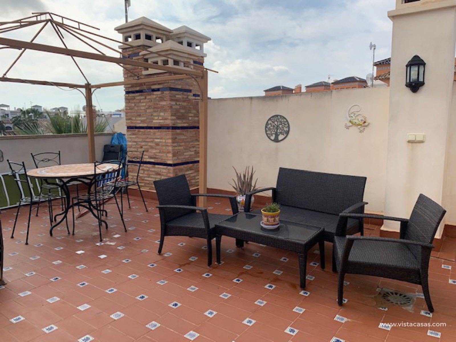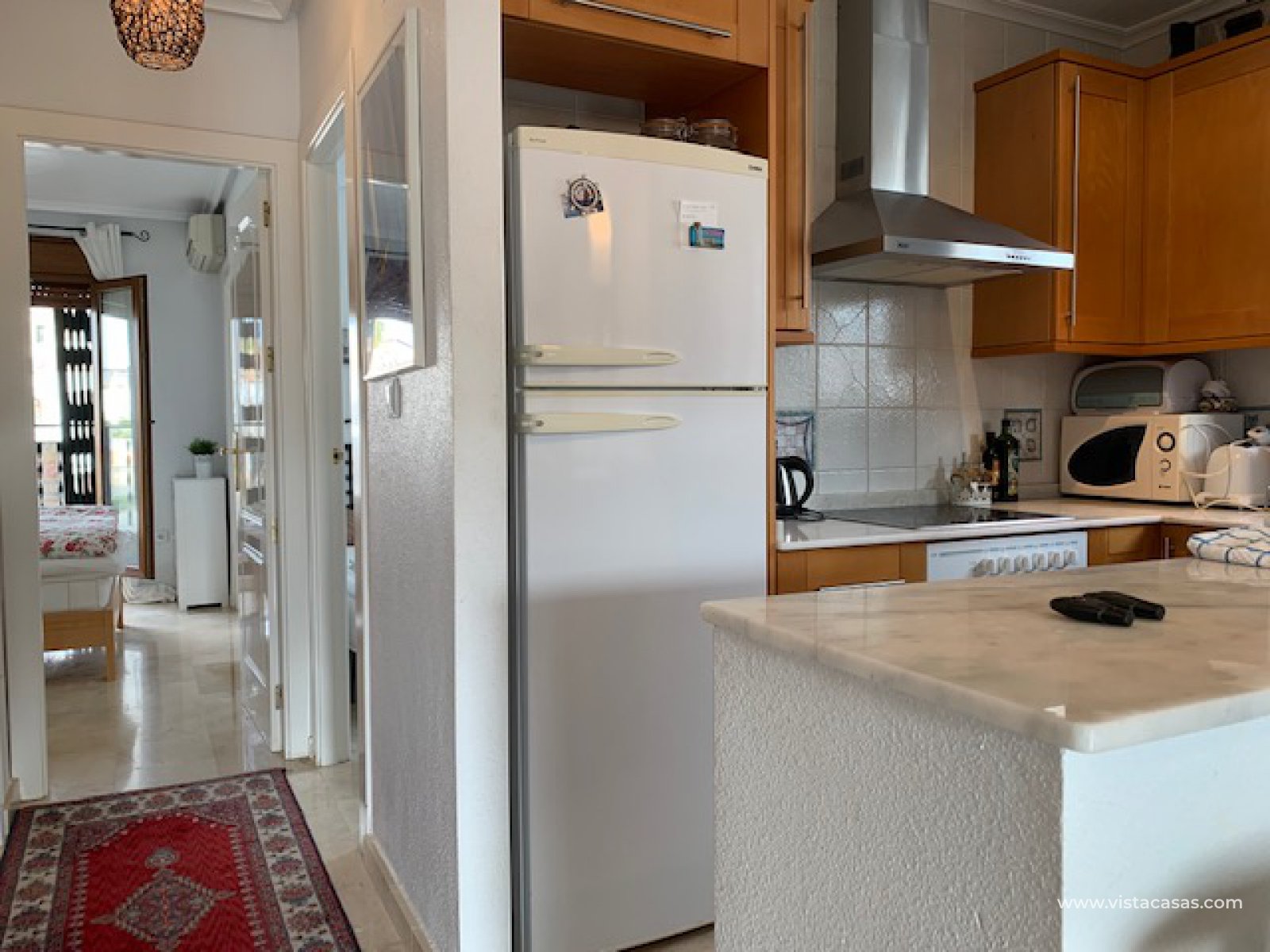 Well presented top floor apartment overlooking the pool, located in a popular area of Pau 8 within walking distance to Villamartin Golf Club and Plaza, which offers various restaurants, bars, shops, banks, etc., and a short drive from beaches of Orihuela Costa. The property consists of living/dining room with fireplace, open plan kitchen with utility room, 2 double bedrooms and 2 bathrooms (master bedroom with ensuite). The property has a private garden and solarium with barbecue. This apartment is perfectly situated in a beautiful community with swimming pool and green areas. The property is ideal for holiday or permanent all year round living.