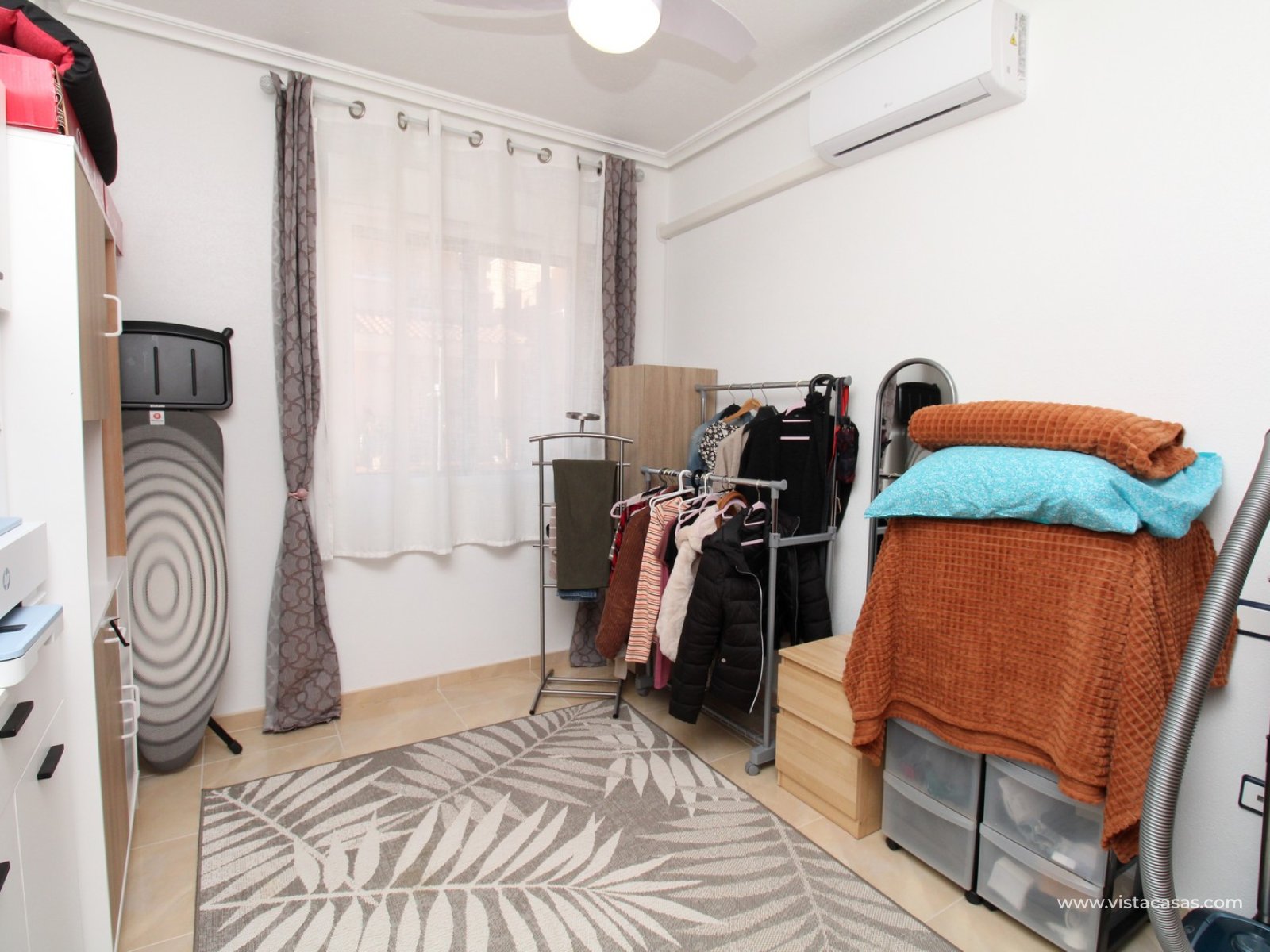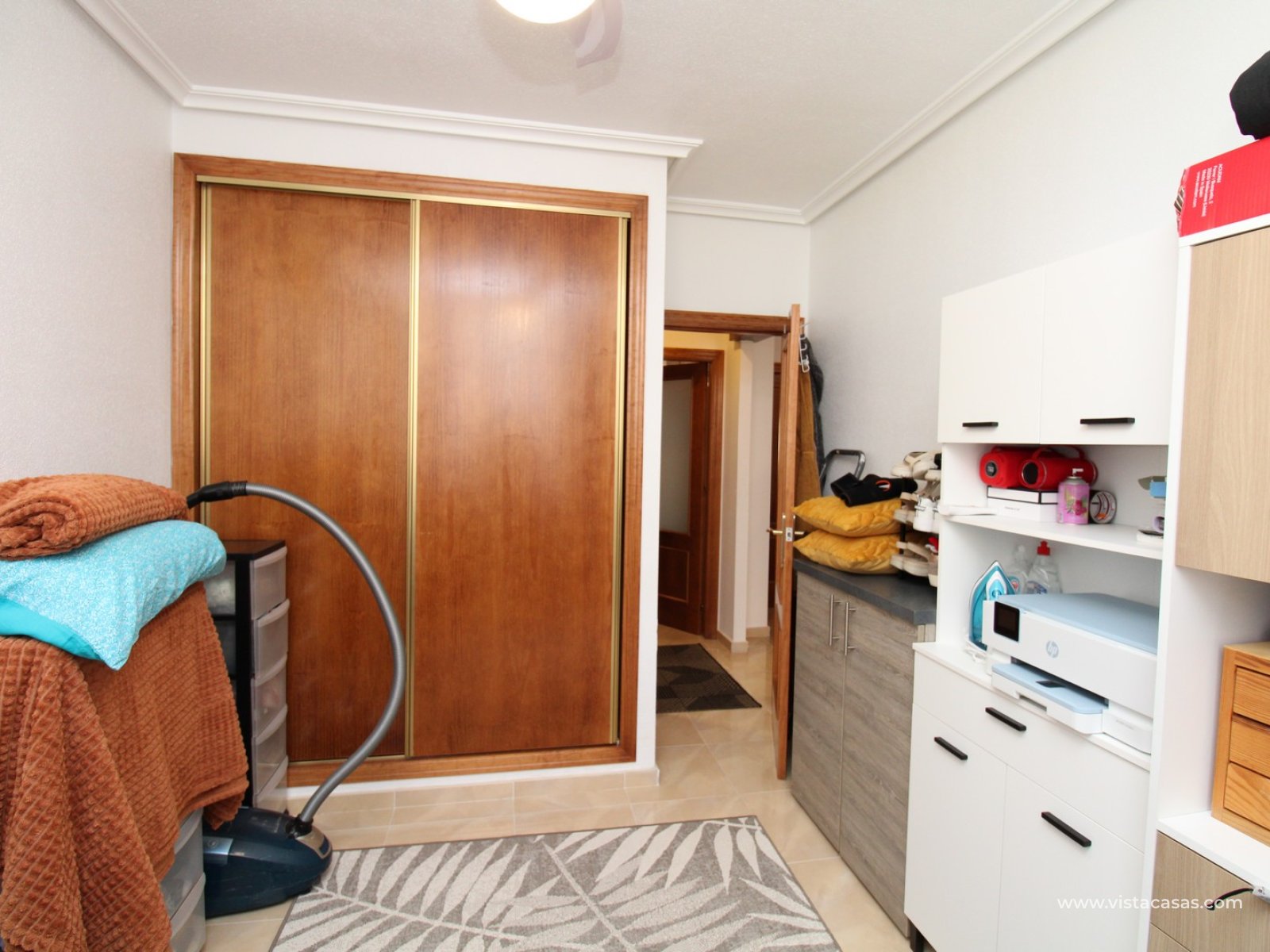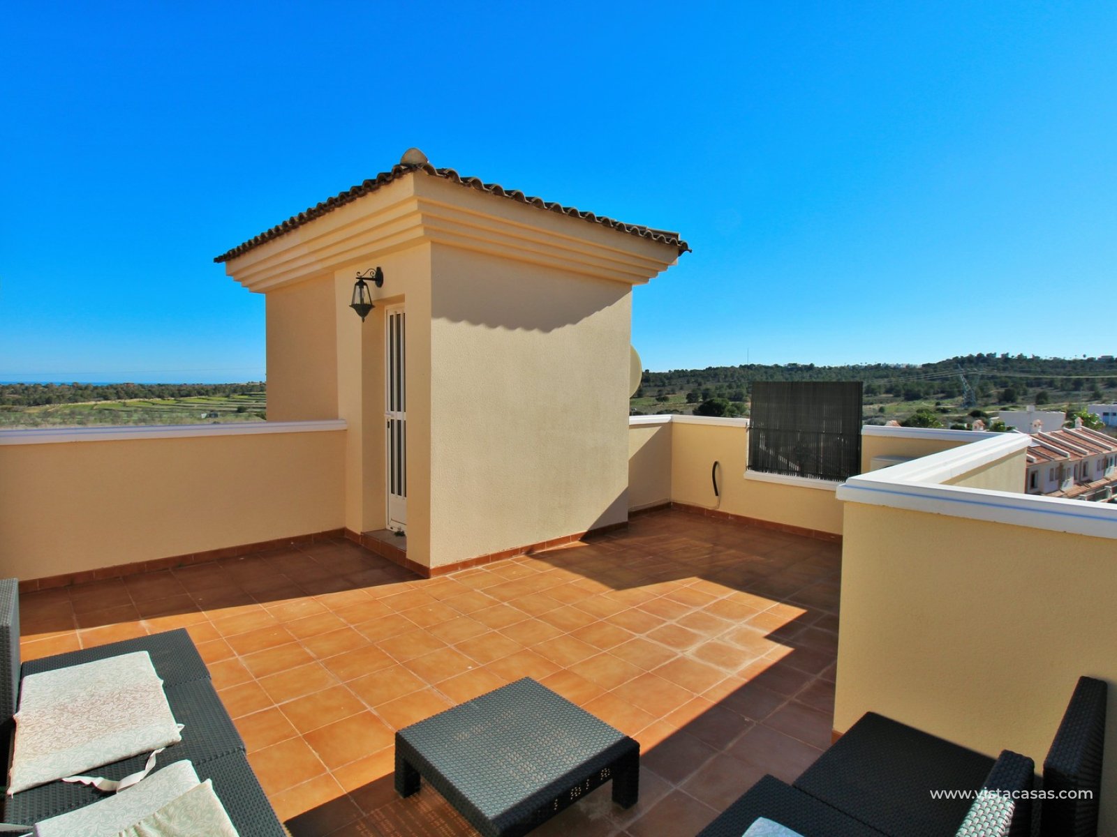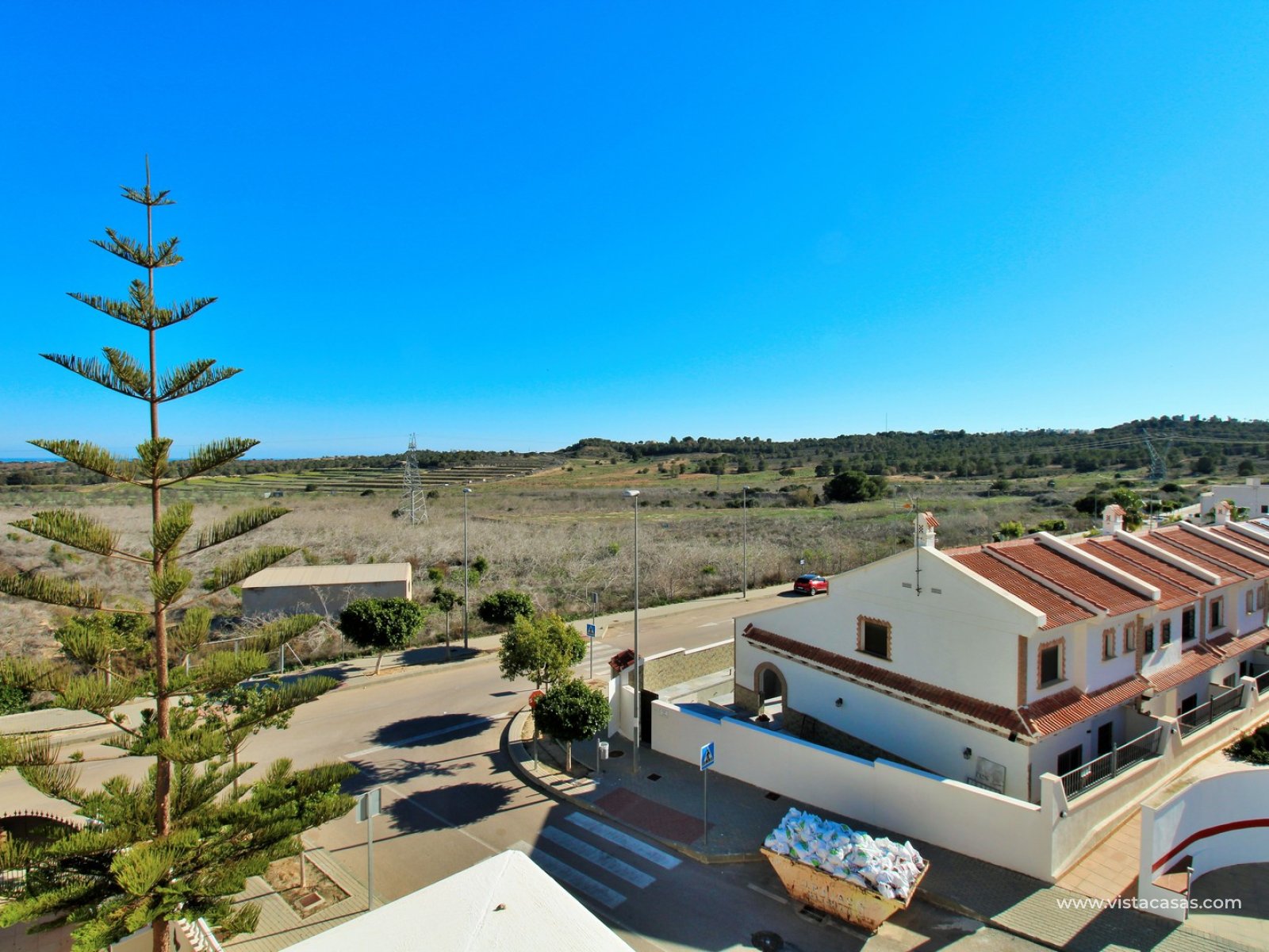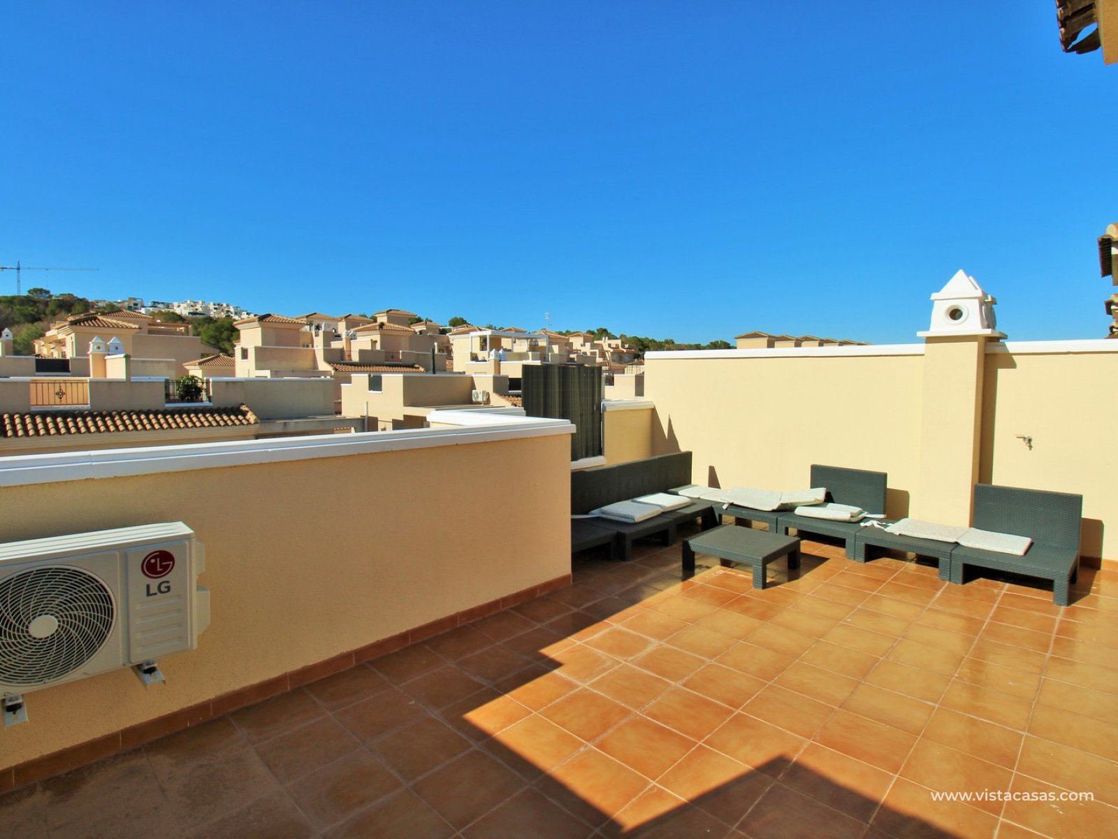 Upstairs, the first floor features two spacious double bedrooms with fitted wardrobes and a family bathroom. The master bedroom opens onto a private balcony, while a second balcony, accessible from the landing, provides yet another quiet outdoor retreat. Crowning the home is the rooftop solarium, offering panoramic views of the Mediterranean coastline, rolling countryside, and the famous Torrevieja salt lakes—a perfect space for soaking in the sunshine and enjoying the scenery.