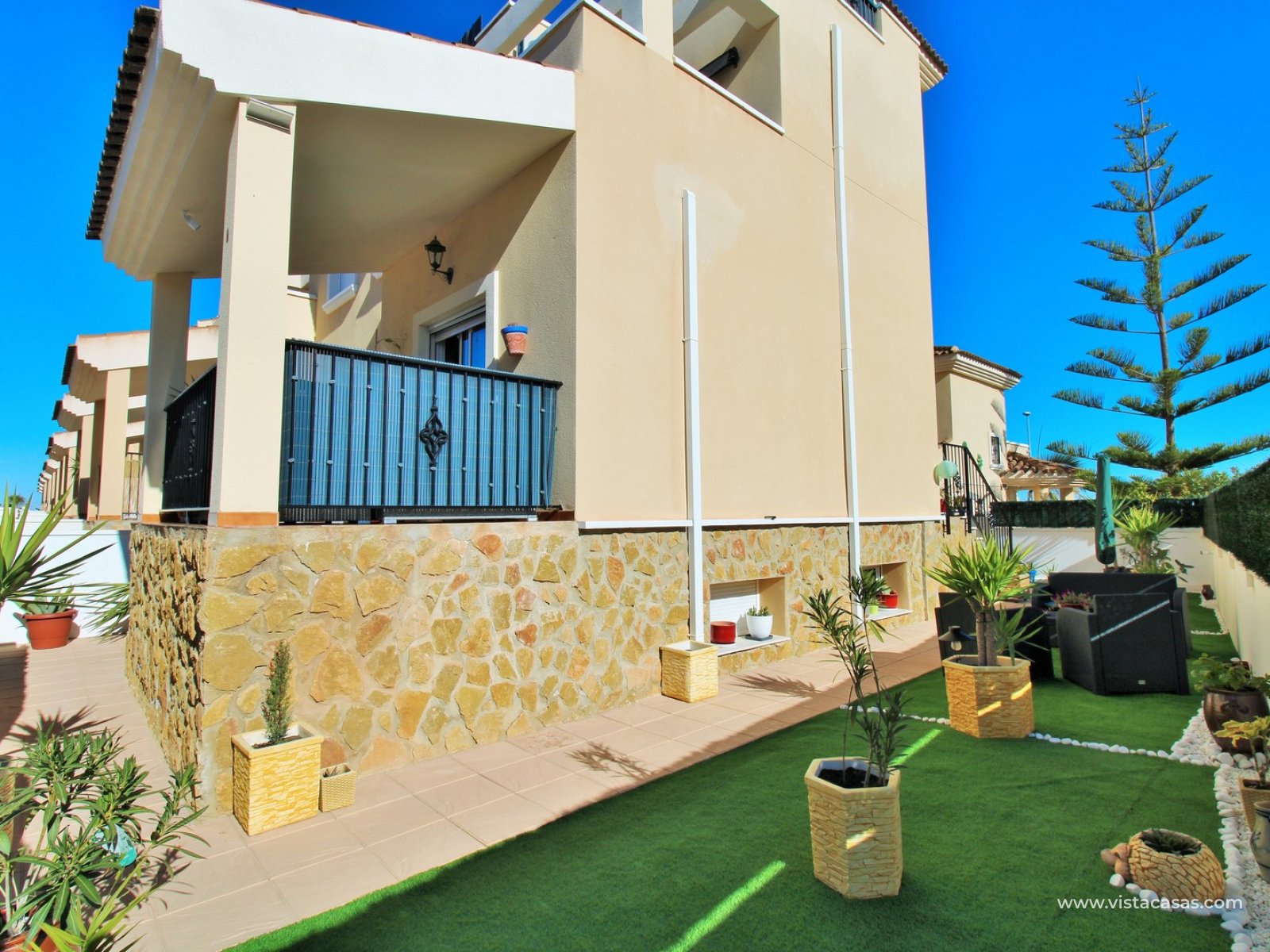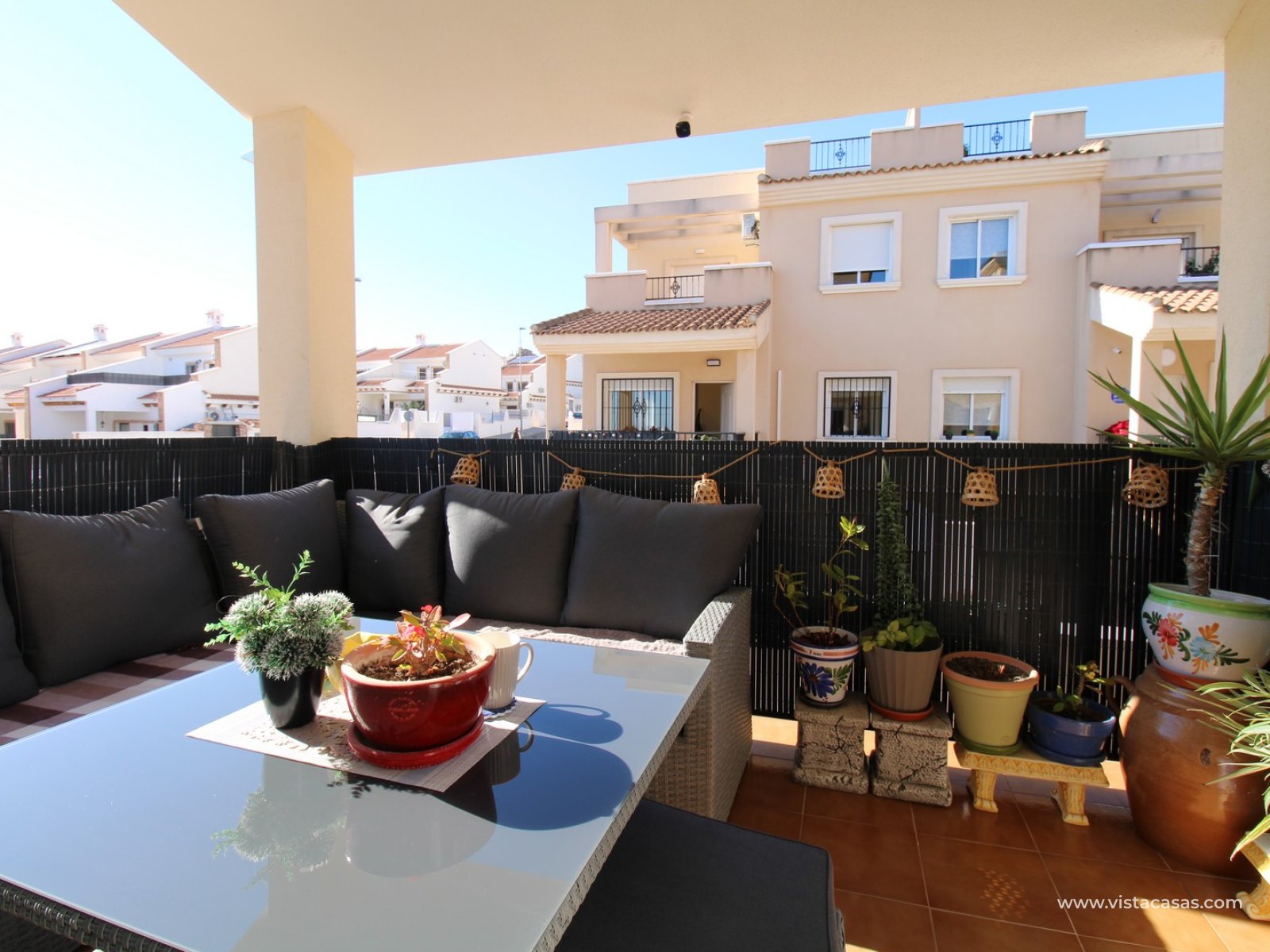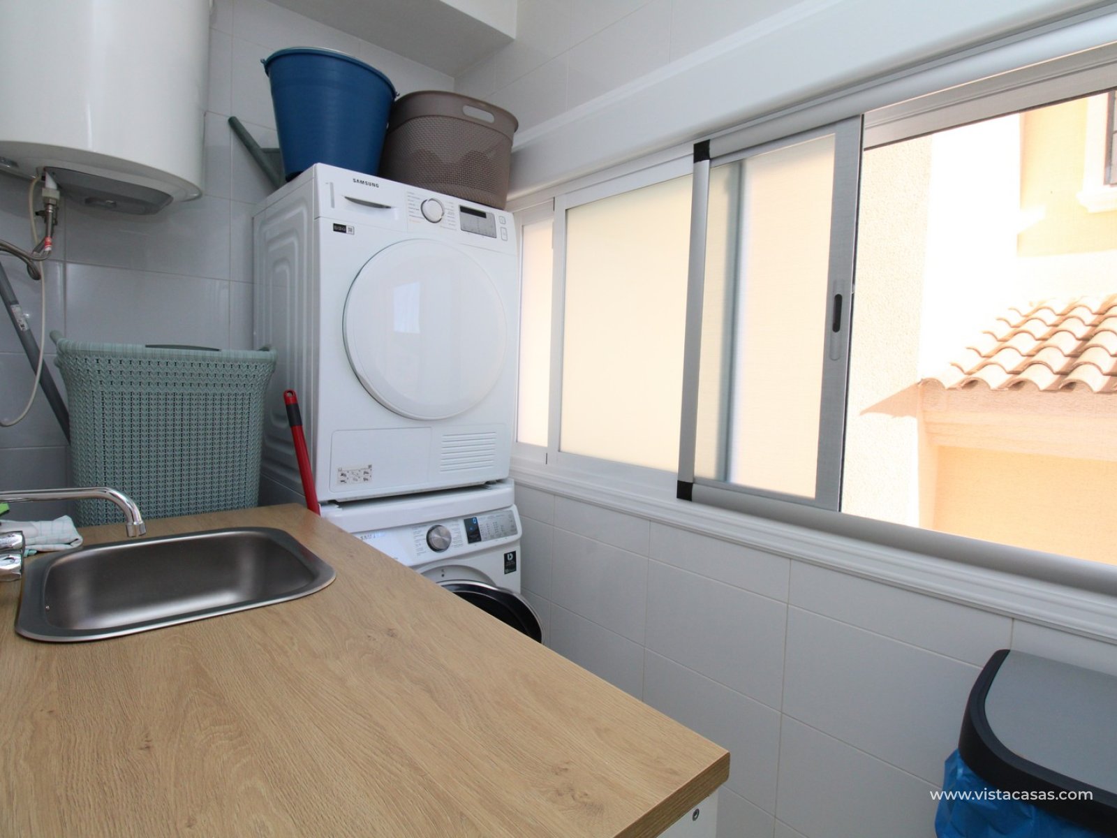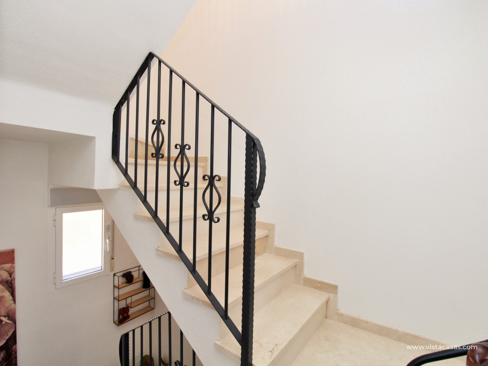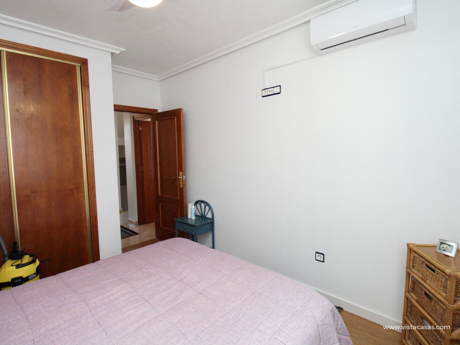 Upstairs, the first floor features two spacious double bedrooms with fitted wardrobes and a family bathroom. The master bedroom opens onto a private balcony, while a second balcony, accessible from the landing, provides yet another quiet outdoor retreat. Crowning the home is the rooftop solarium, offering panoramic views of the Mediterranean coastline, rolling countryside, and the famous Torrevieja salt lakes—a perfect space for soaking in the sunshine and enjoying the scenery.
