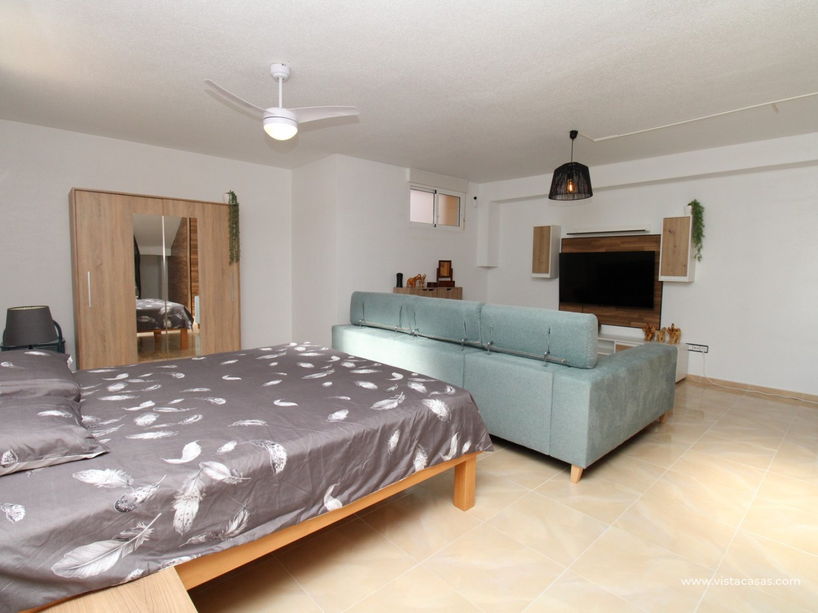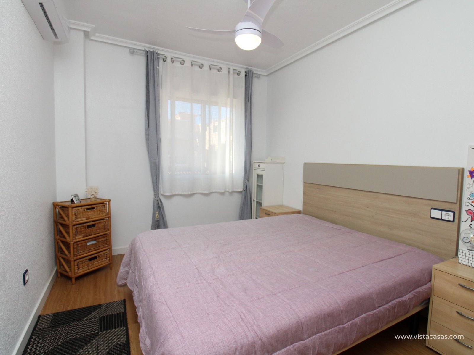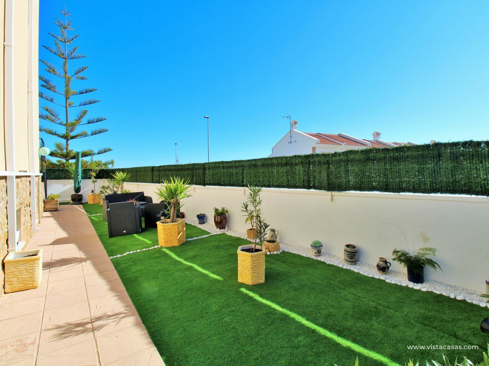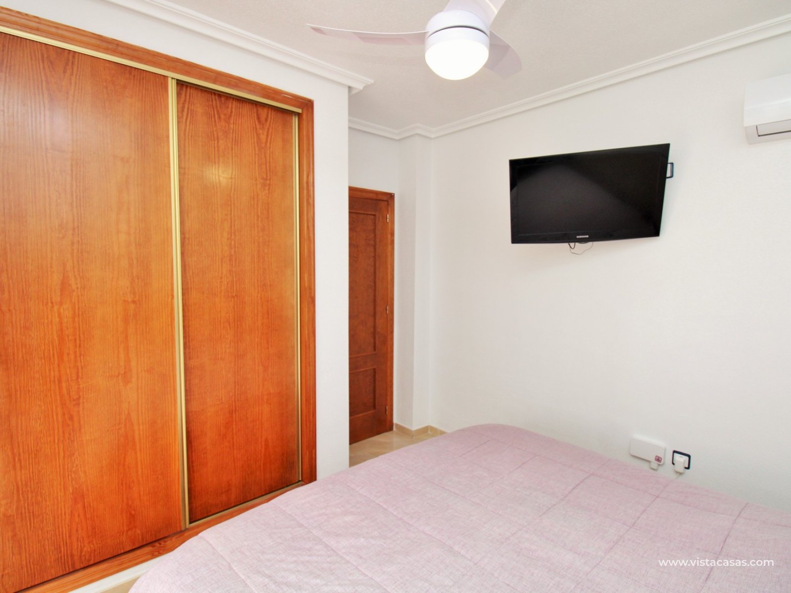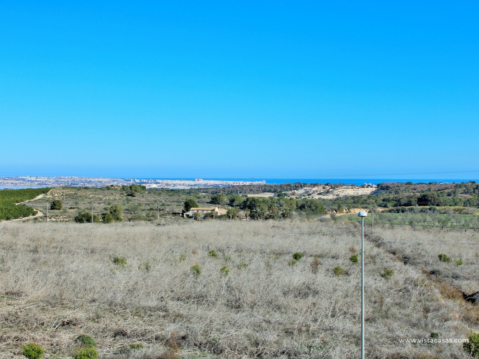 Upstairs, the first floor features two spacious double bedrooms with fitted wardrobes and a family bathroom. The master bedroom opens onto a private balcony, while a second balcony, accessible from the landing, provides yet another quiet outdoor retreat. Crowning the home is the rooftop solarium, offering panoramic views of the Mediterranean coastline, rolling countryside, and the famous Torrevieja salt lakes—a perfect space for soaking in the sunshine and enjoying the scenery.