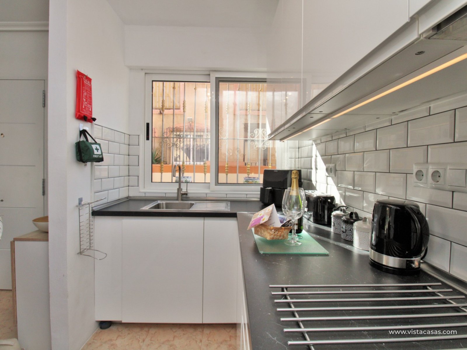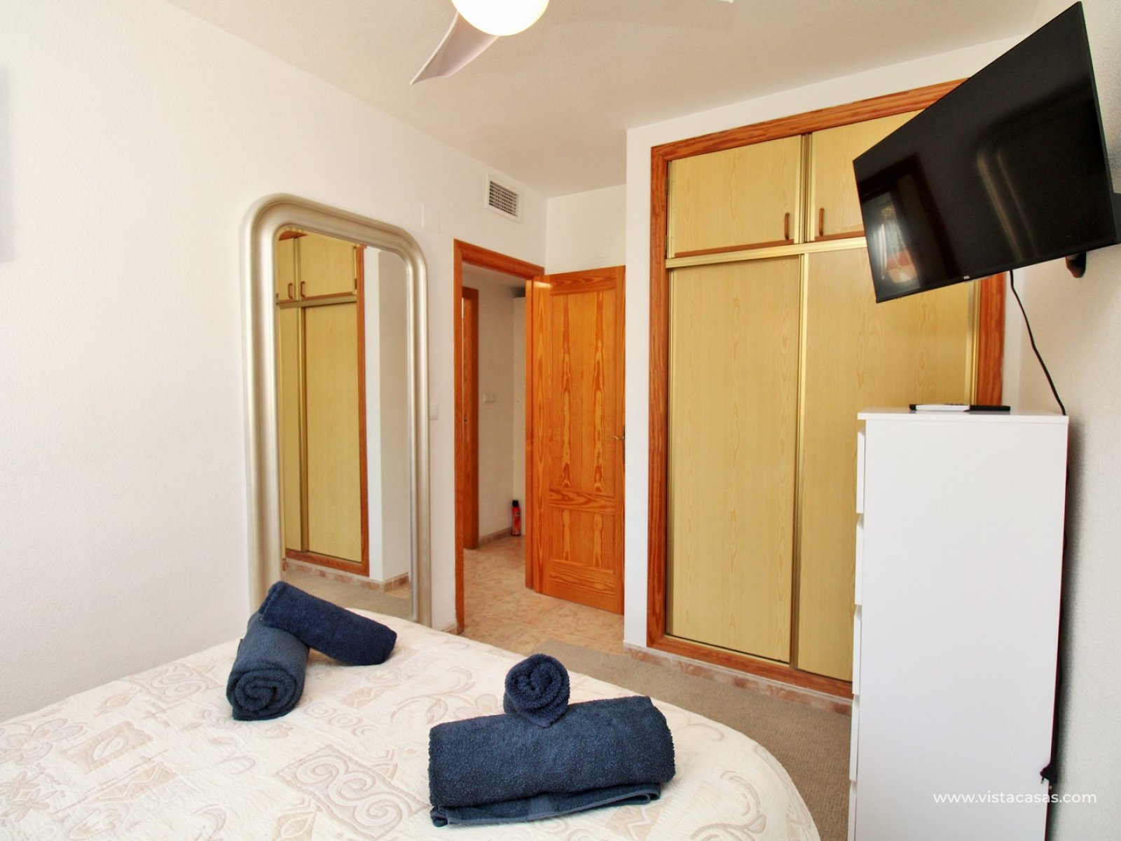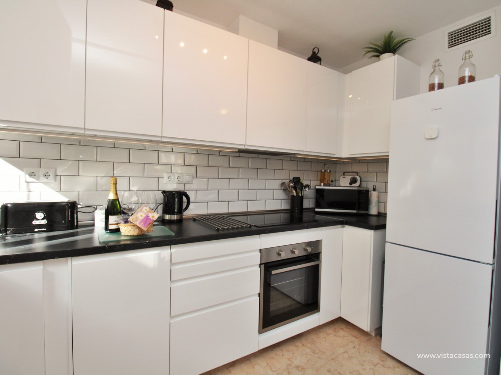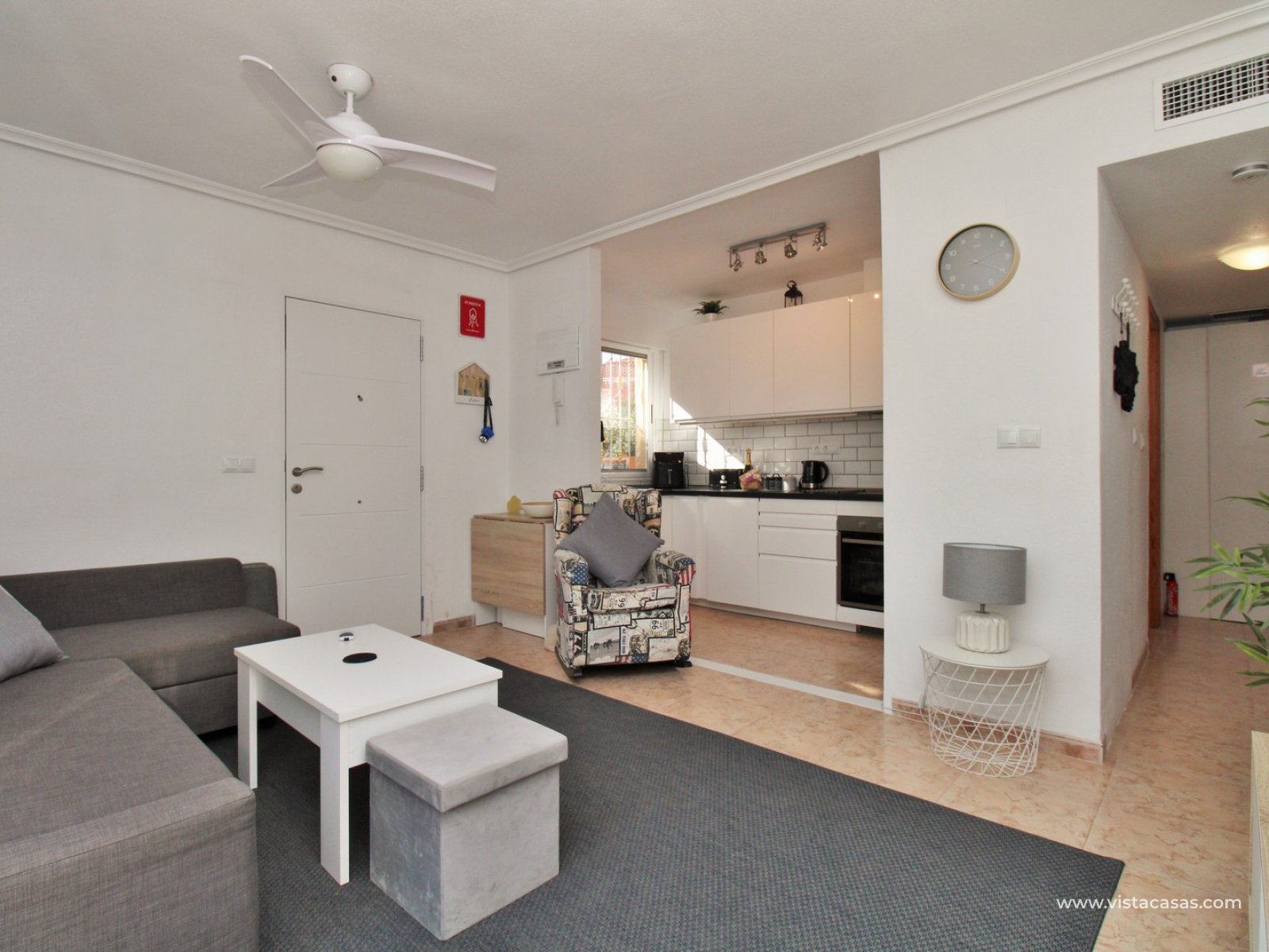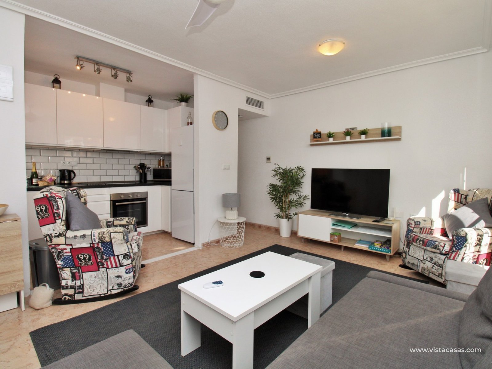The apartment features a spacious L-shaped tiled terrace, an ideal spot for enjoying the Spanish sunshine or al fresco dining. This outdoor space flows seamlessly into the light and airy lounge, which connects to a modernised open-plan kitchen. French sliding doors lead directly from the lounge to the terrace, enhancing the indoor-outdoor living experience. A hallway off the lounge provides access to two well-appointed bedrooms and a contemporary family bathroom with a walk-in shower. The master bedroom benefits from built-in wardrobes.