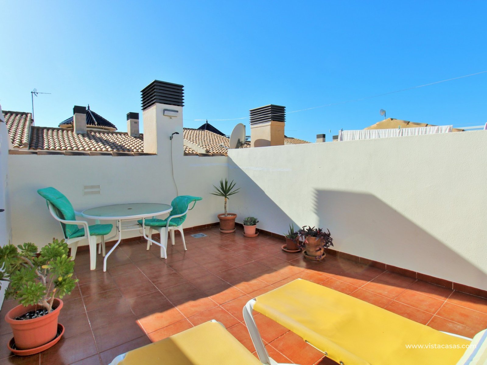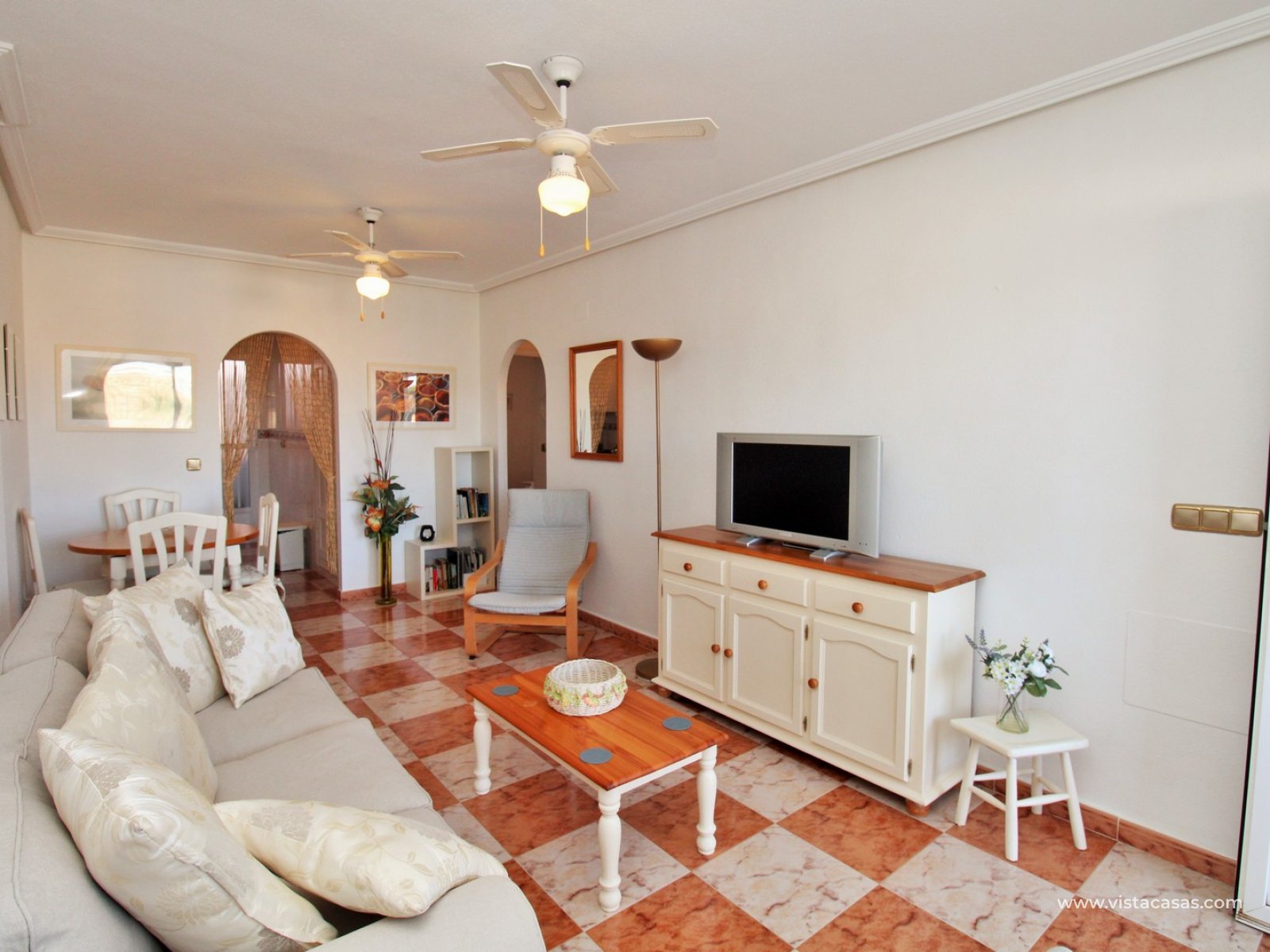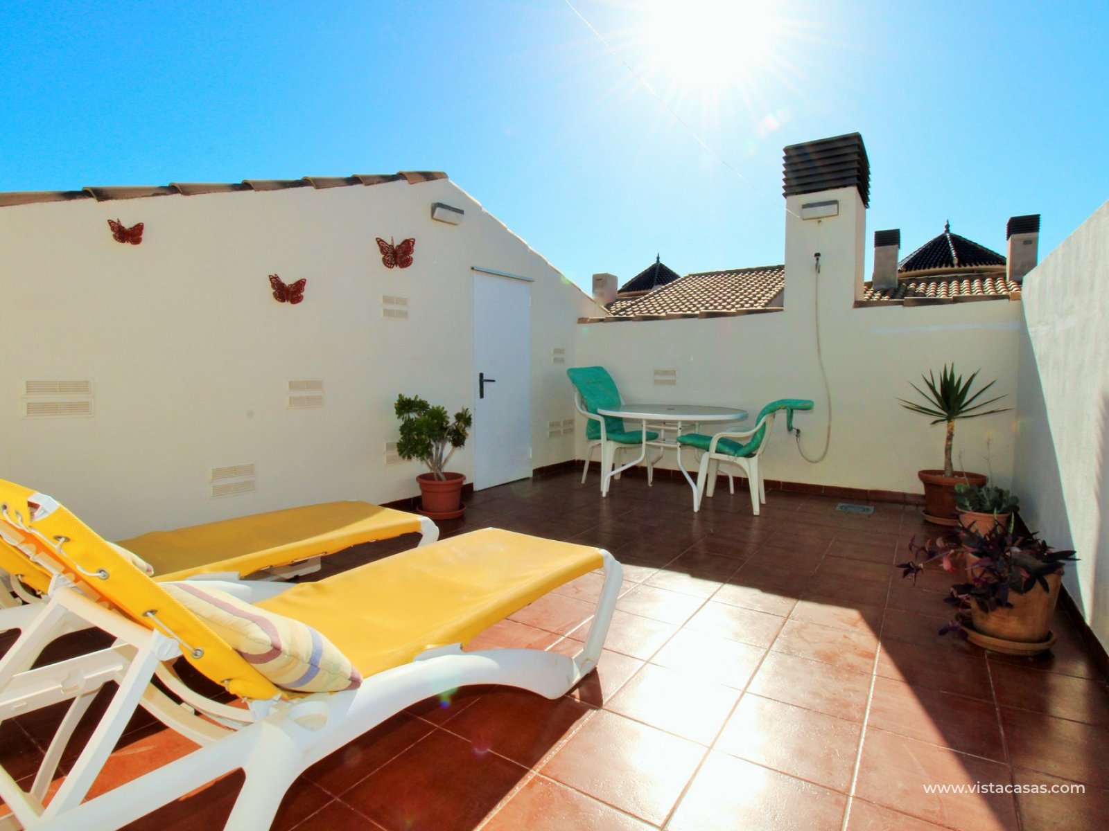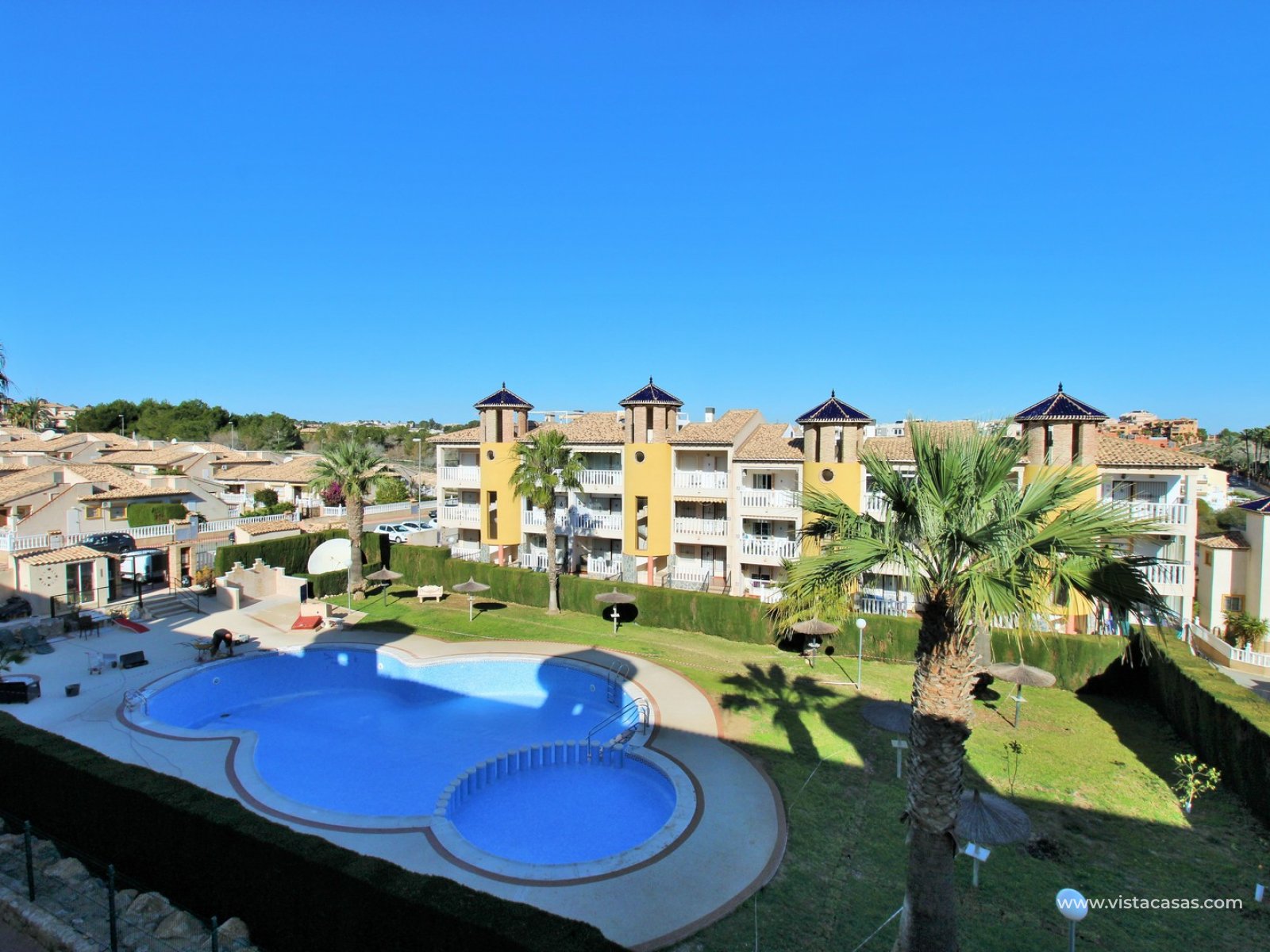 Well presented 2 bedroom top floor Violeta style apartment with an 18,87m2 roof solarium overlooking the communal pool & gardens for sale in the popular urbanisation of Pinada Golf I in Villamartin, just a short stroll to the Villamartin Plaza and golf course. The property has been well kept, with one owner since new, and is sold furnished.