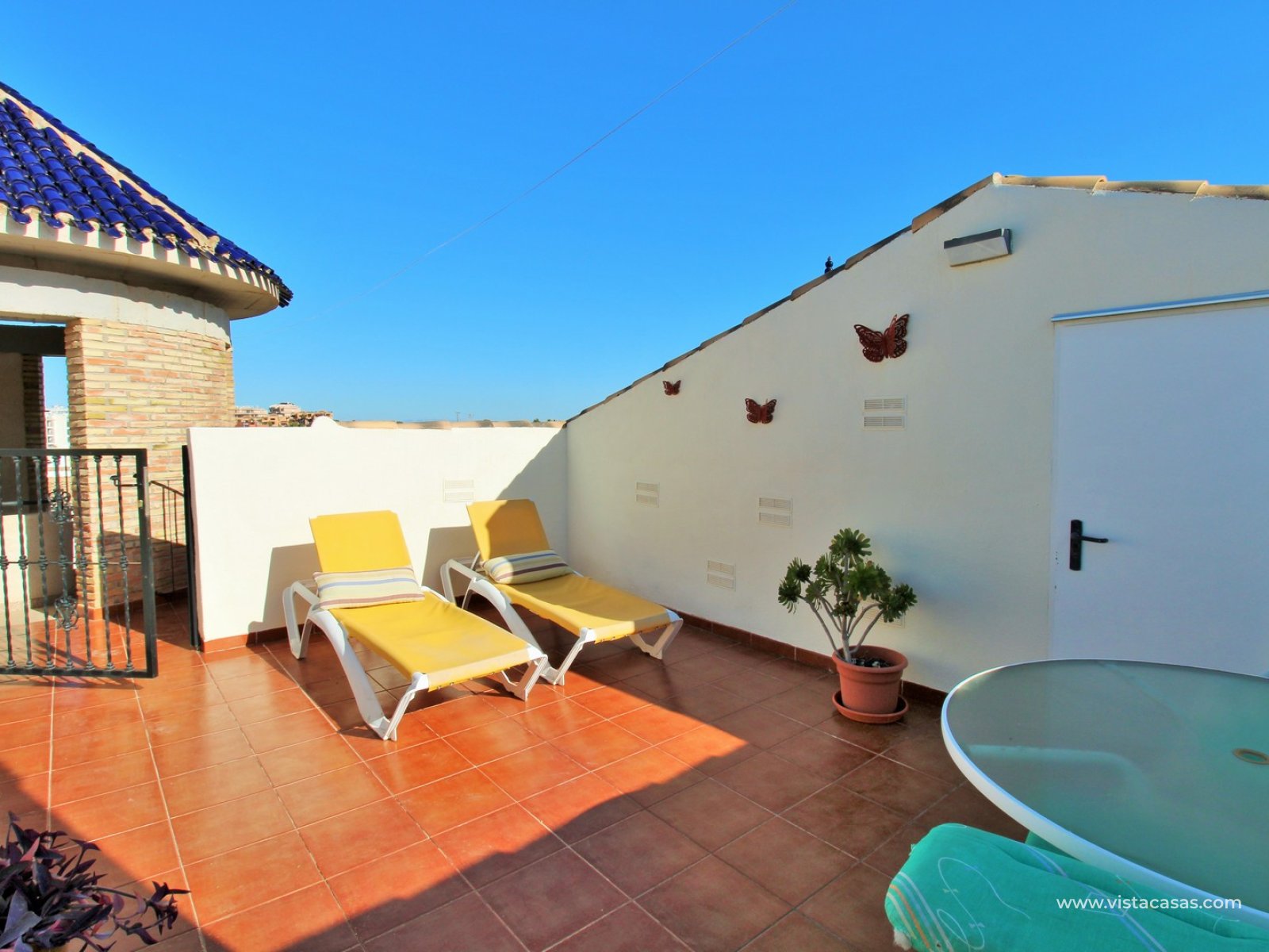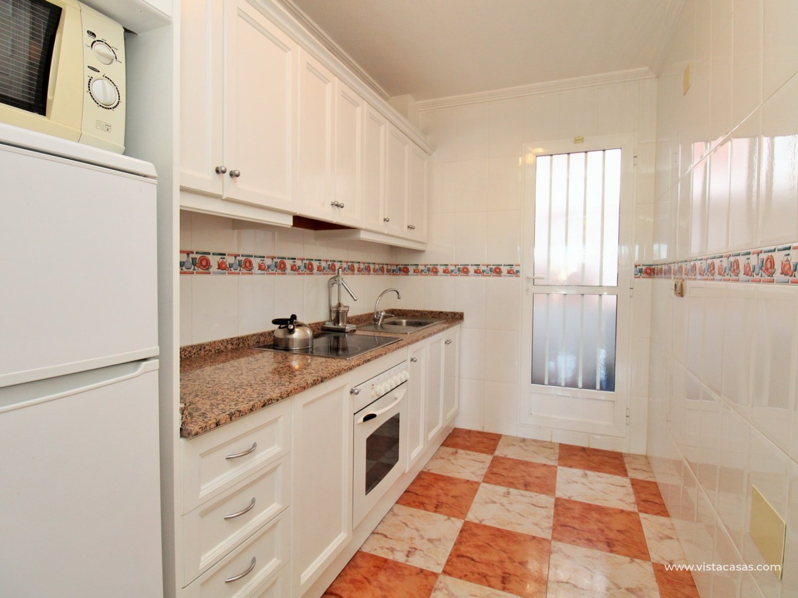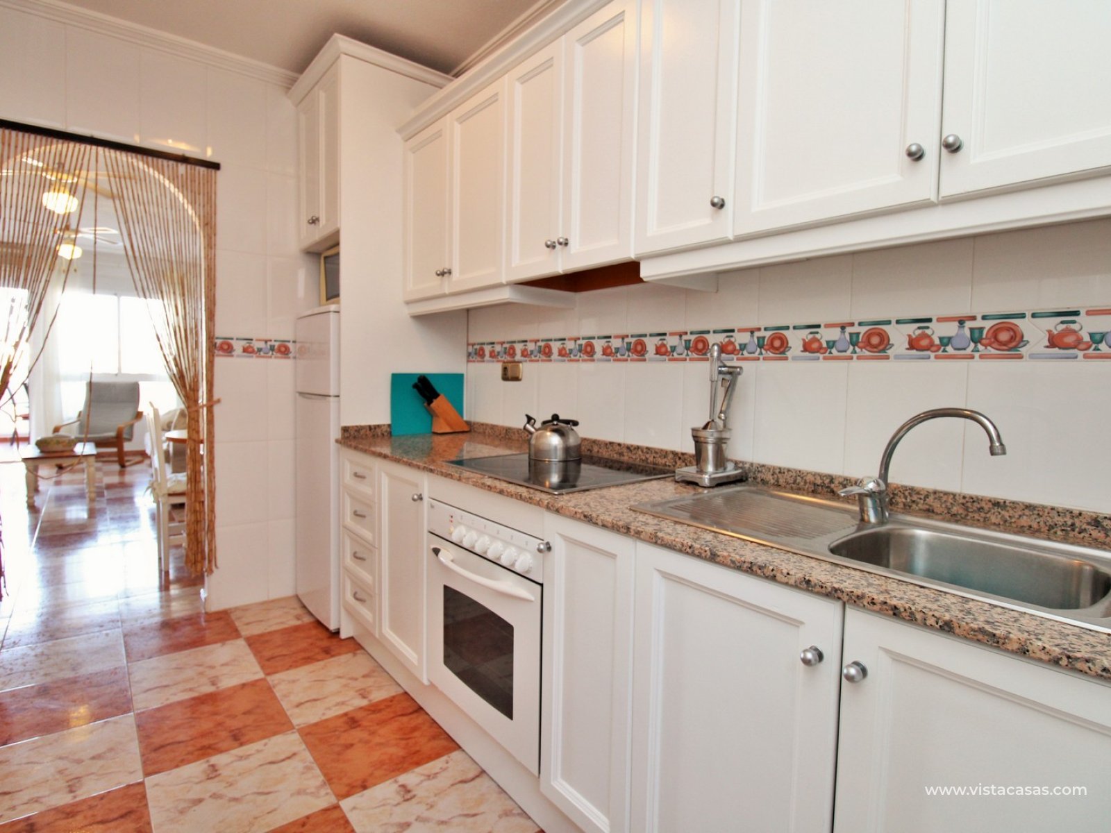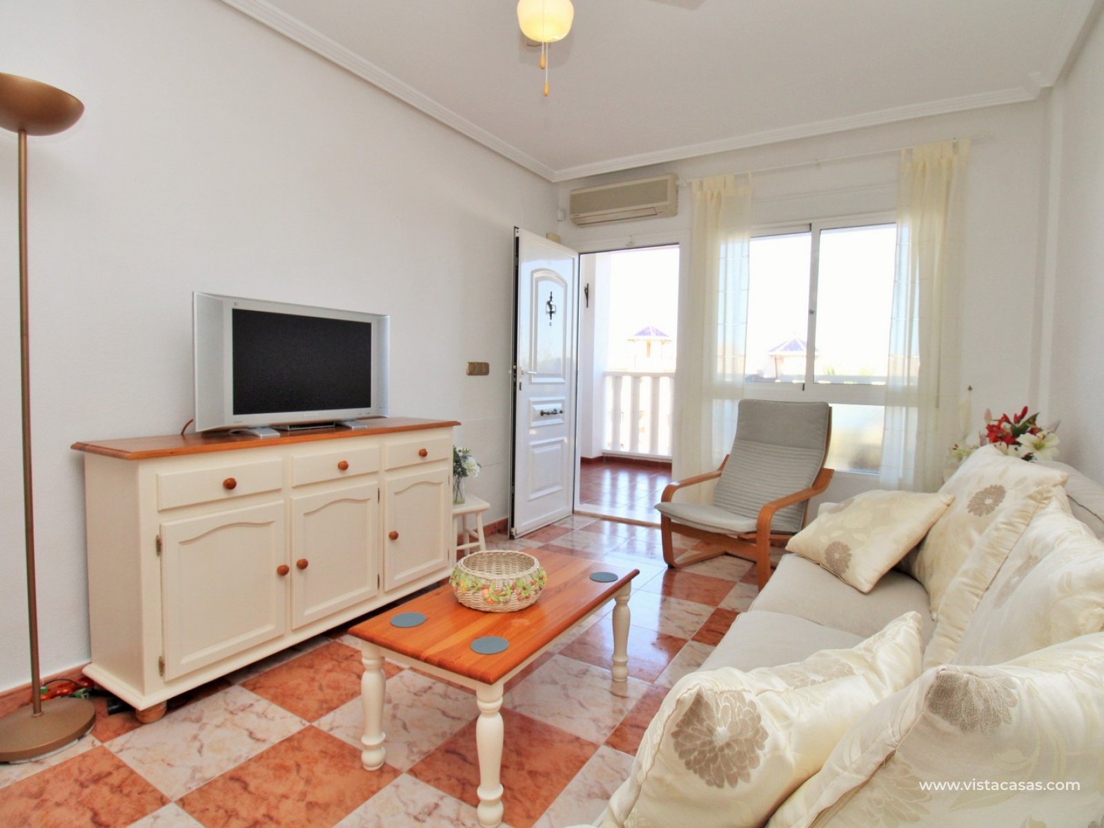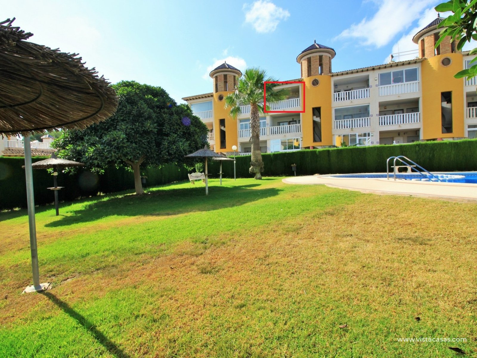 Well presented 2 bedroom top floor Violeta style apartment with an 18,87m2 roof solarium overlooking the communal pool & gardens for sale in the popular urbanisation of Pinada Golf I in Villamartin, just a short stroll to the Villamartin Plaza and golf course. The property has been well kept, with one owner since new, and is sold furnished.