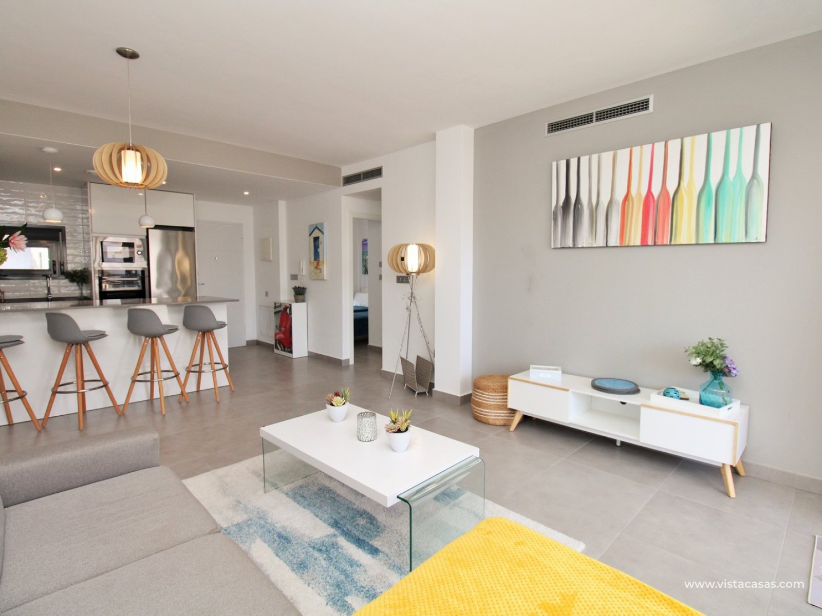 Inside, the spacious and stylish living area is bright and inviting, with large glass doors leading onto the main terrace. The open-plan kitchen is fully fitted with modern appliances, combining practicality with sleek design. Off the living room, you’ll find two well-proportioned bedrooms, both with fitted wardrobes. The master bedroom features an en-suite bathroom with walk-in shower, while a separate bathroom serves the rest of the apartment.