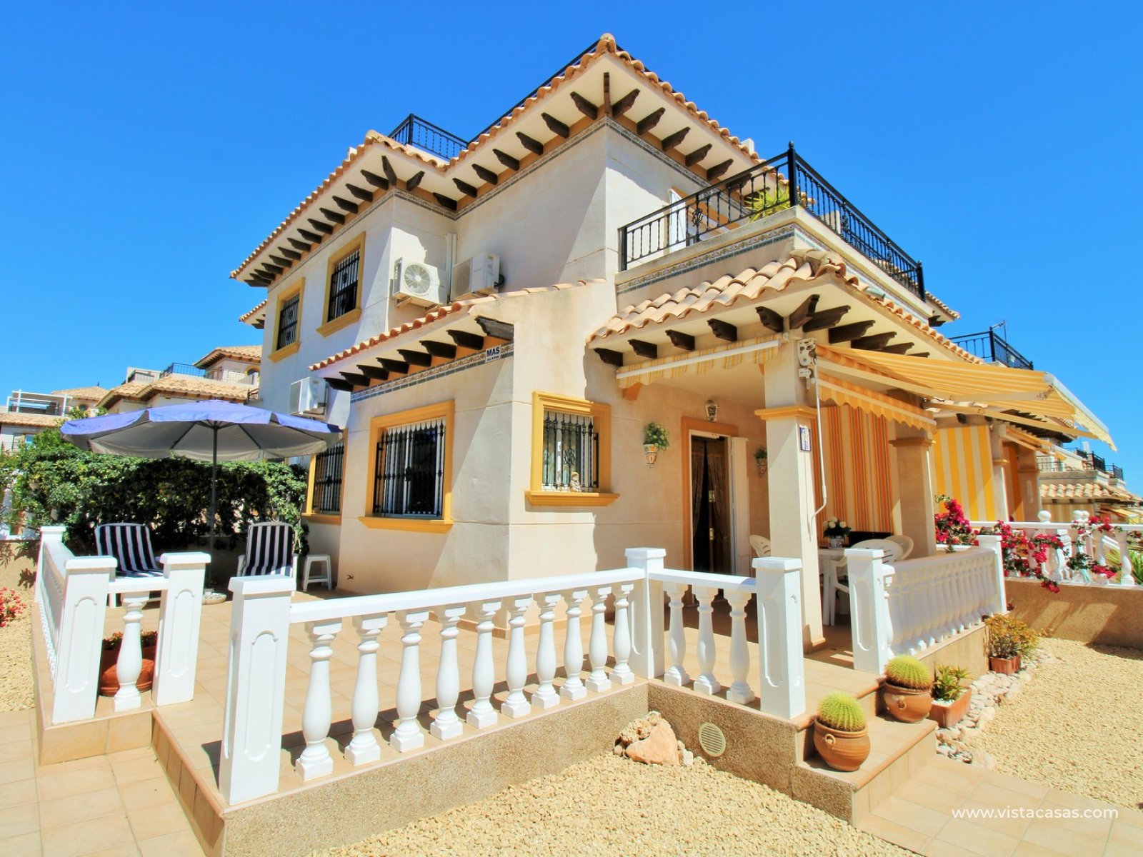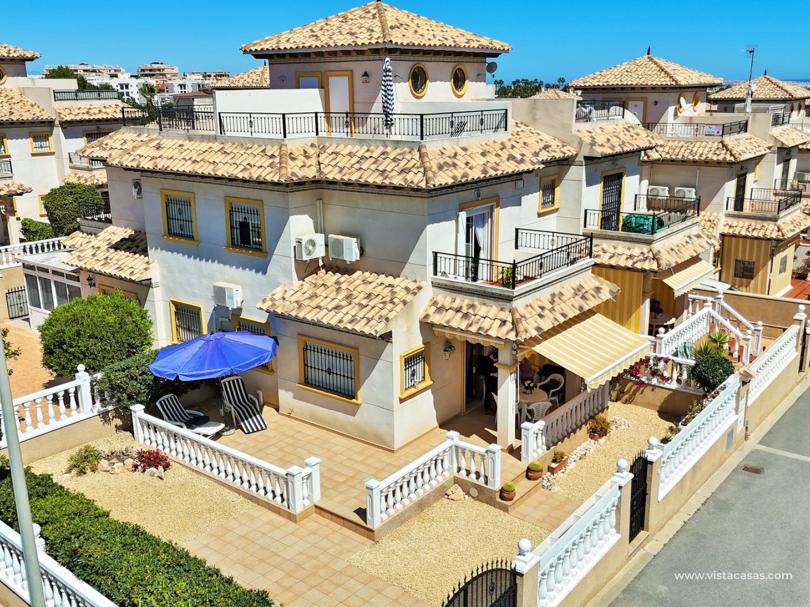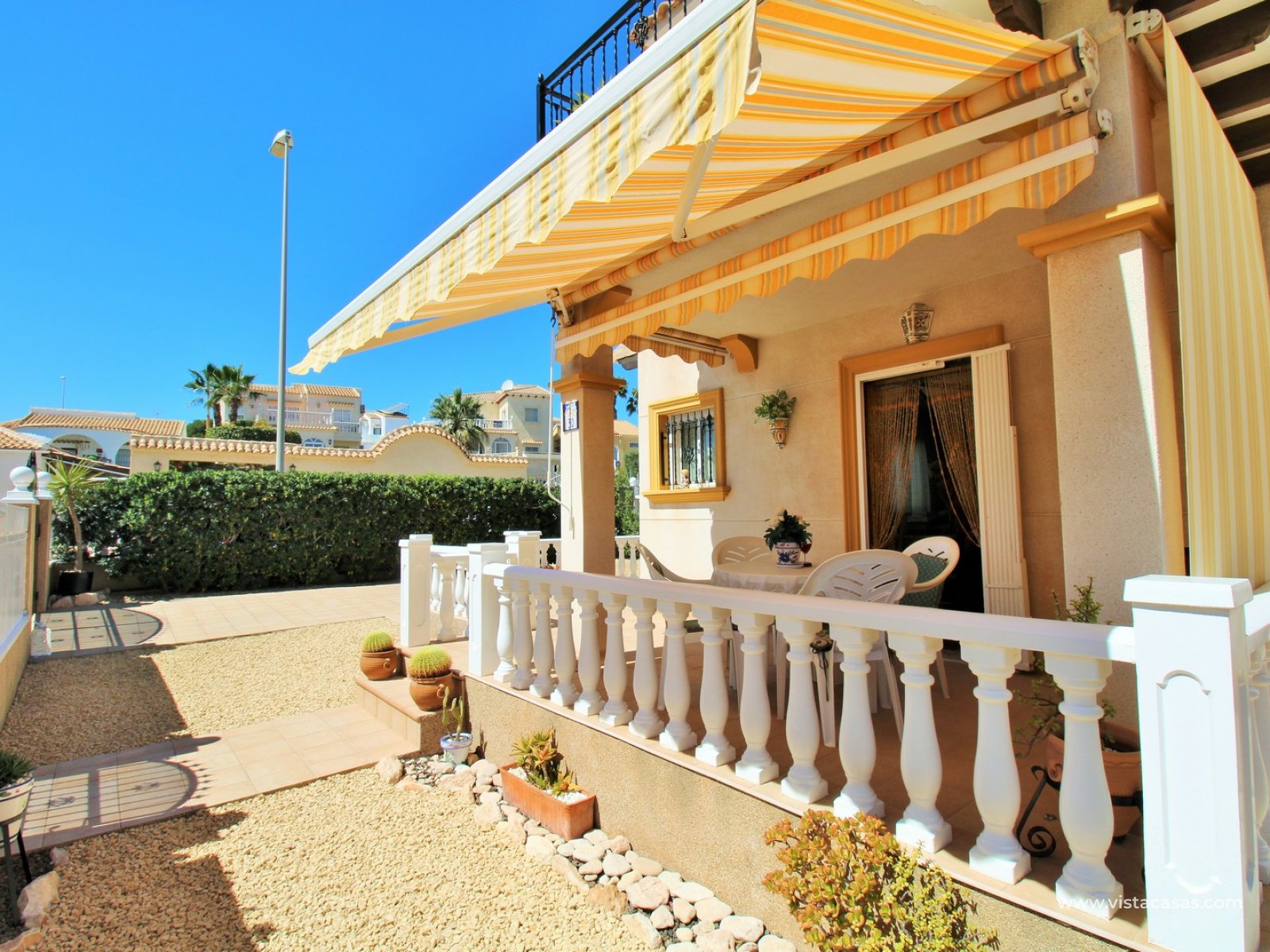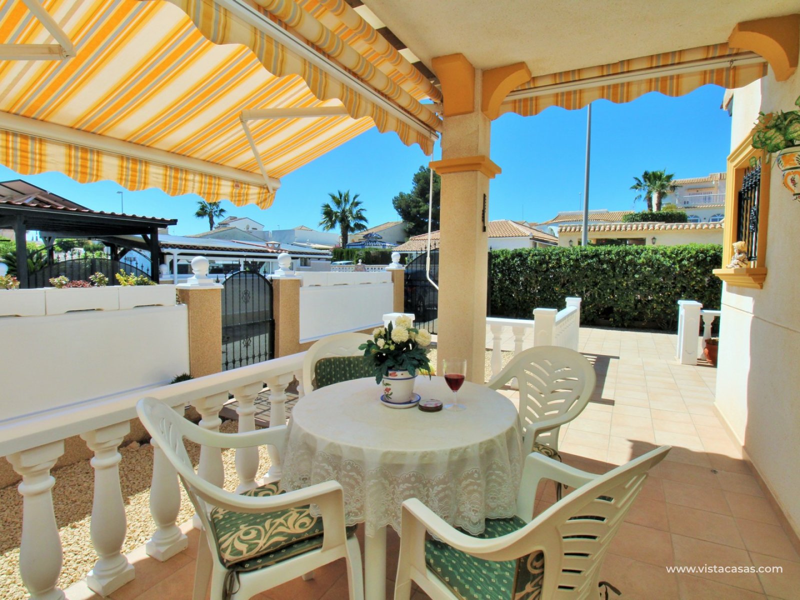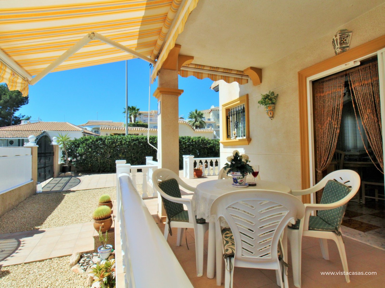 A rare opportunity to purchase this bright and airy south-facing quad, ideally positioned in the quiet and exclusive residential community of Pinada Golf I, Villamartin. Lovingly maintained, never rented, and used for just 10 weeks each year, this property is in excellent condition. Set on a generous and enviable 115m2 plot, there is ample space to add a private pool if desired. The front of the house features a spacious, sun-drenched terrace with four retractable awnings. A communal pool is located nearby, currently undergoing refurbishment in time for Easter.