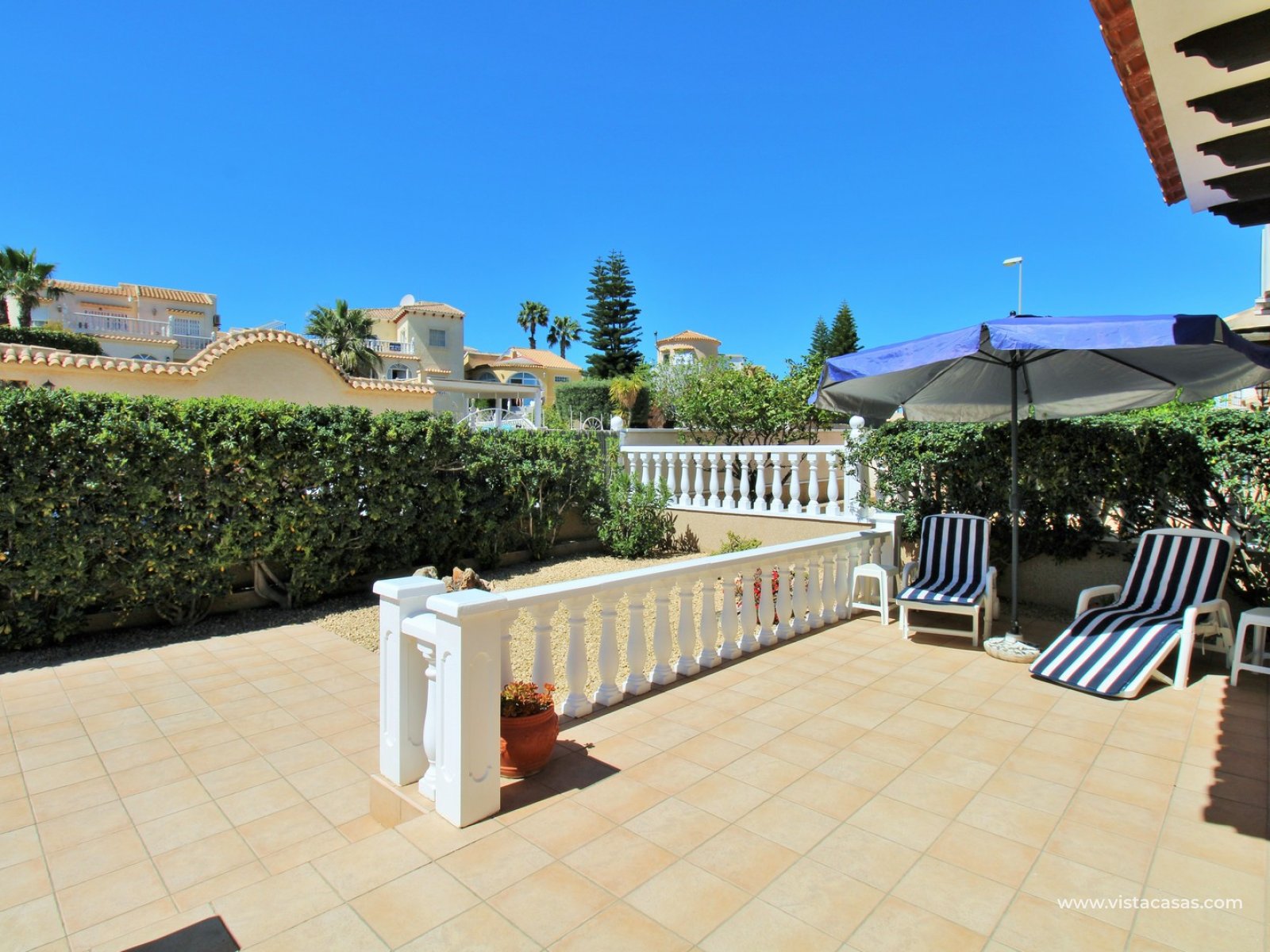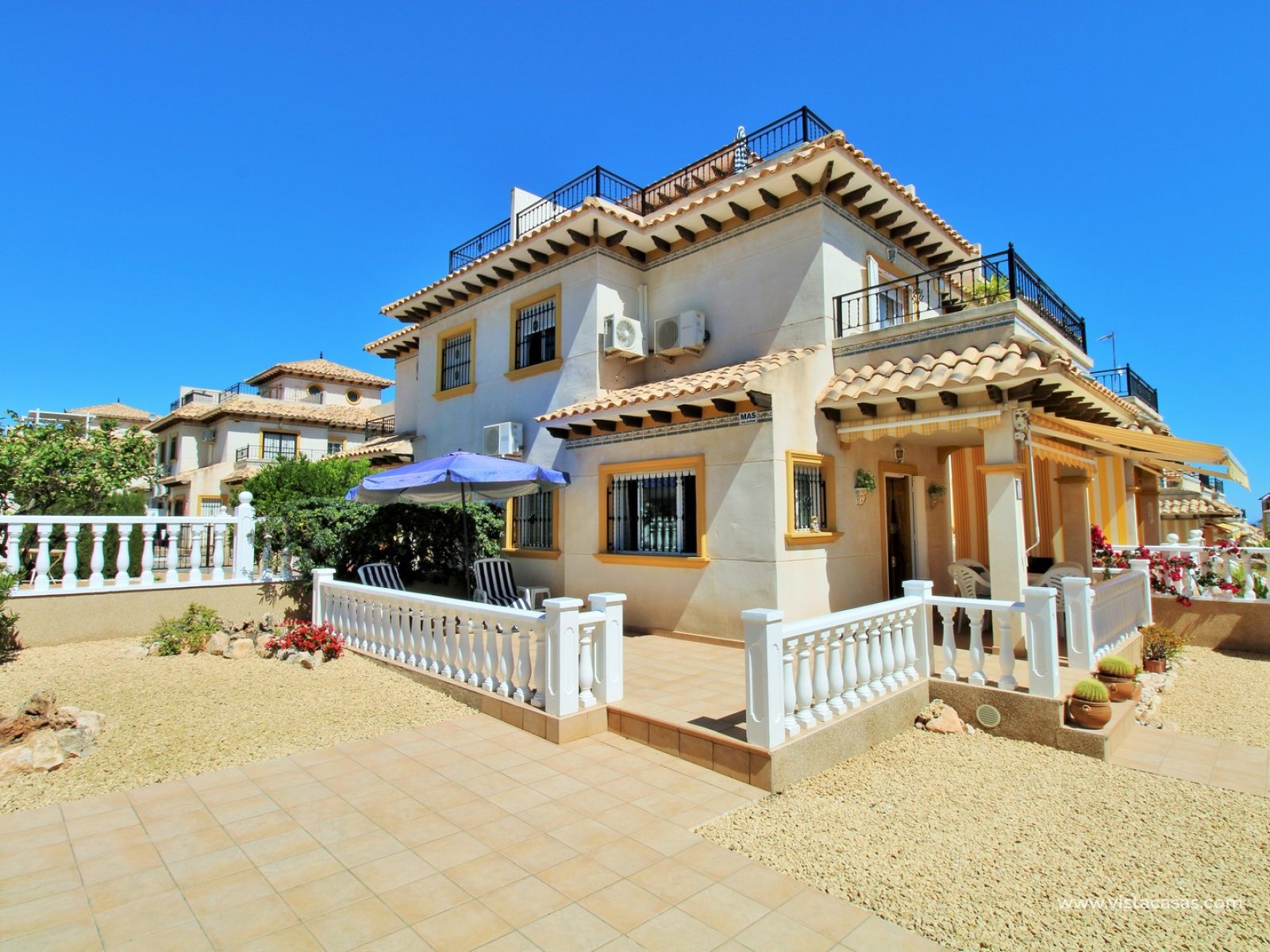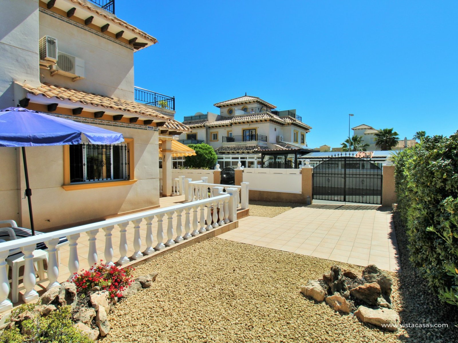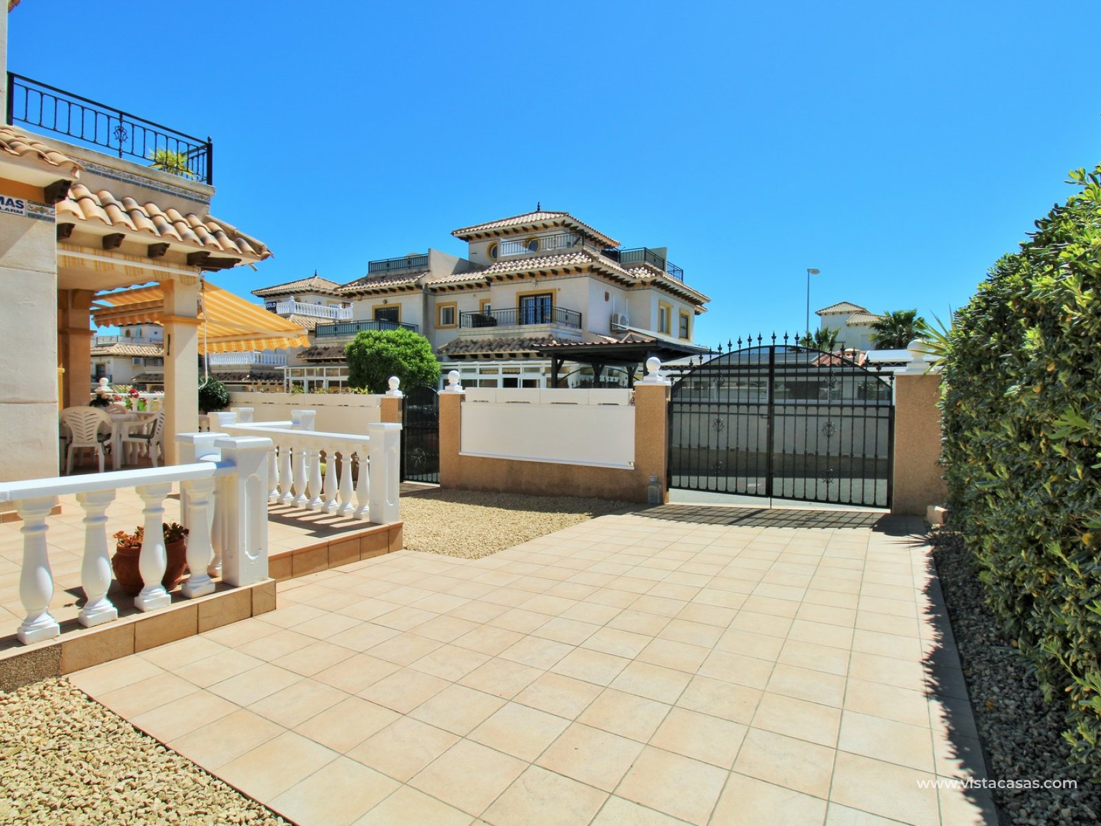 A rare opportunity to purchase this bright and airy south-facing quad, ideally positioned in the quiet and exclusive residential community of Pinada Golf I, Villamartin. Lovingly maintained, never rented, and used for just 10 weeks each year, this property is in excellent condition. Set on a generous and enviable 115m2 plot, there is ample space to add a private pool if desired. The front of the house features a spacious, sun-drenched terrace with four retractable awnings. A communal pool is located nearby, currently undergoing refurbishment in time for Easter.