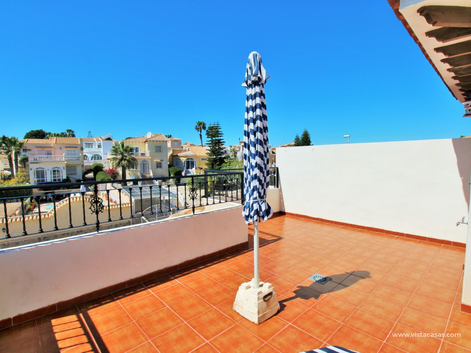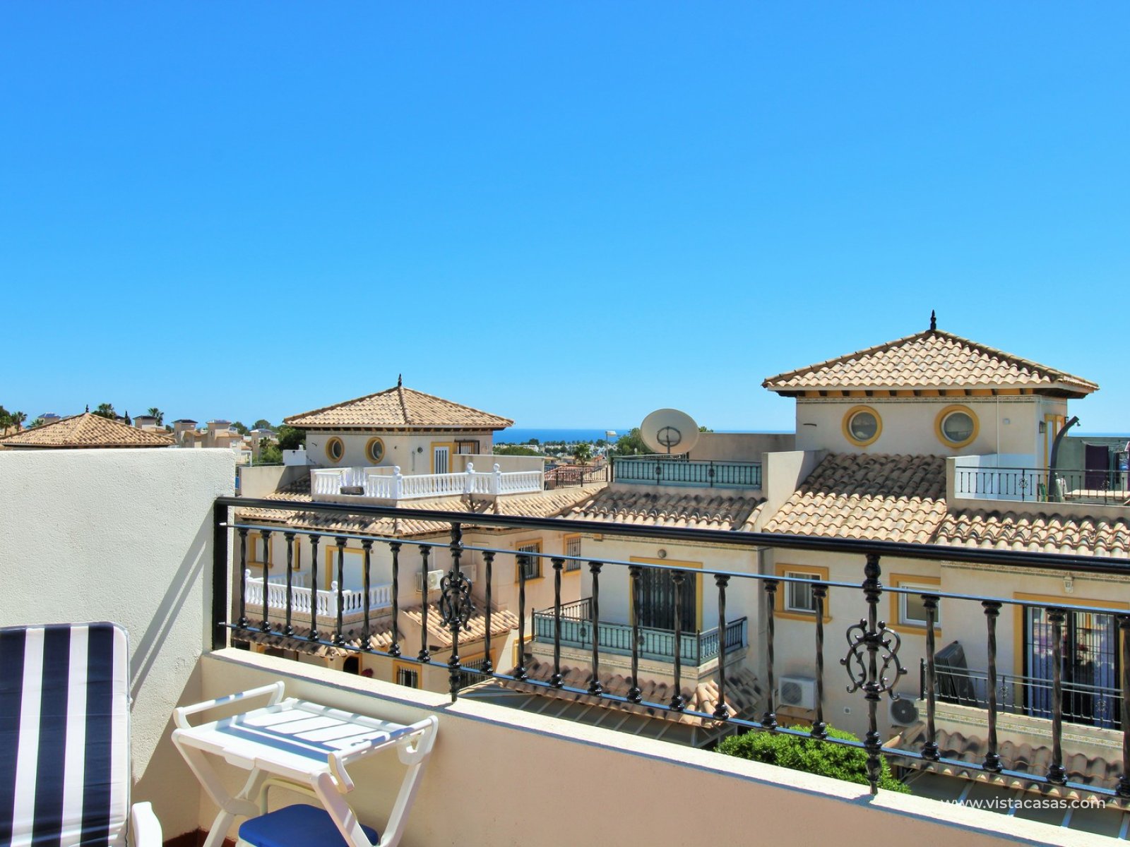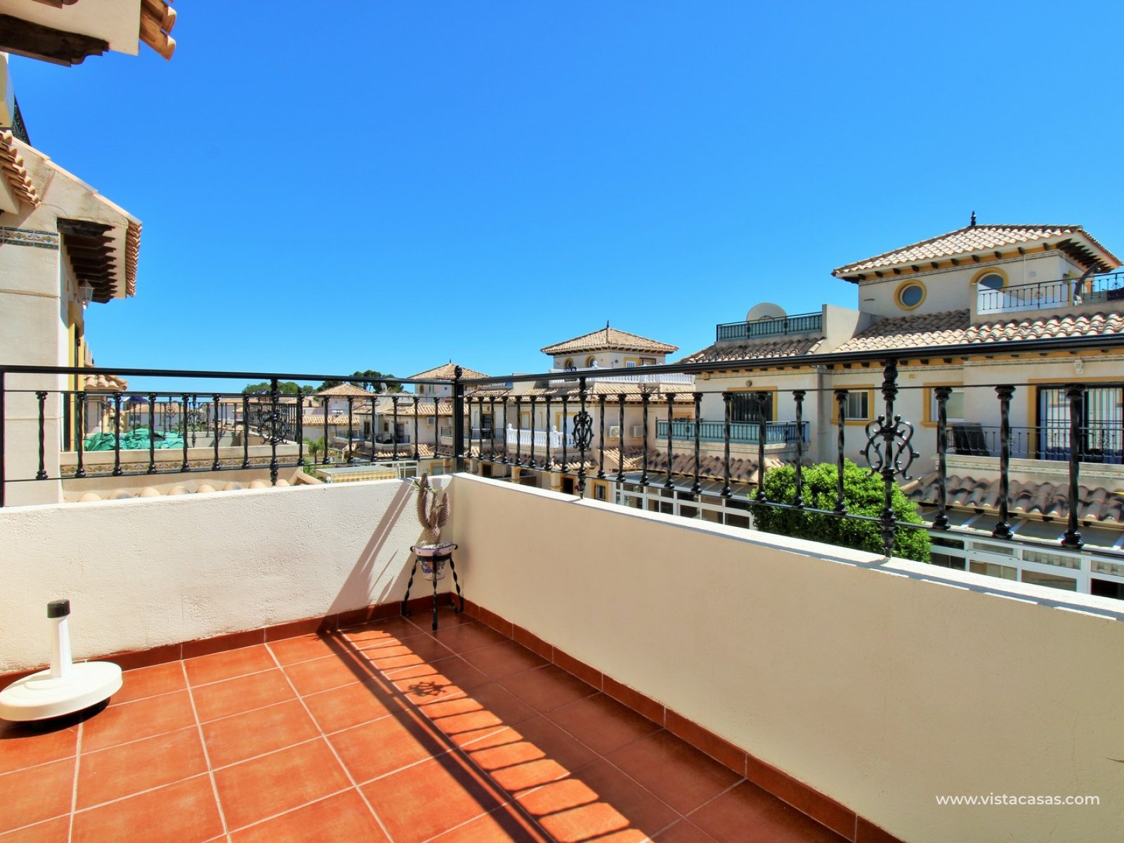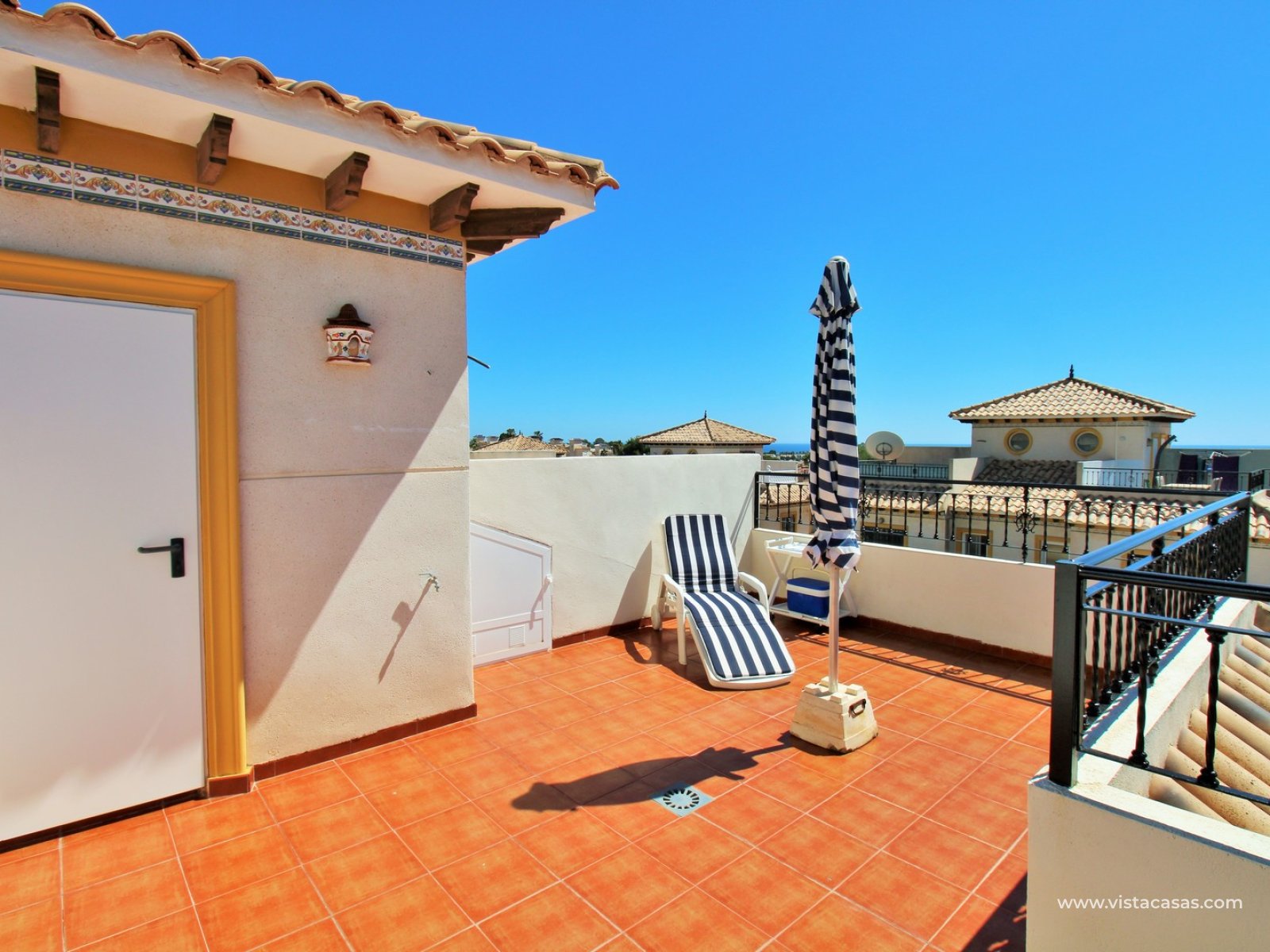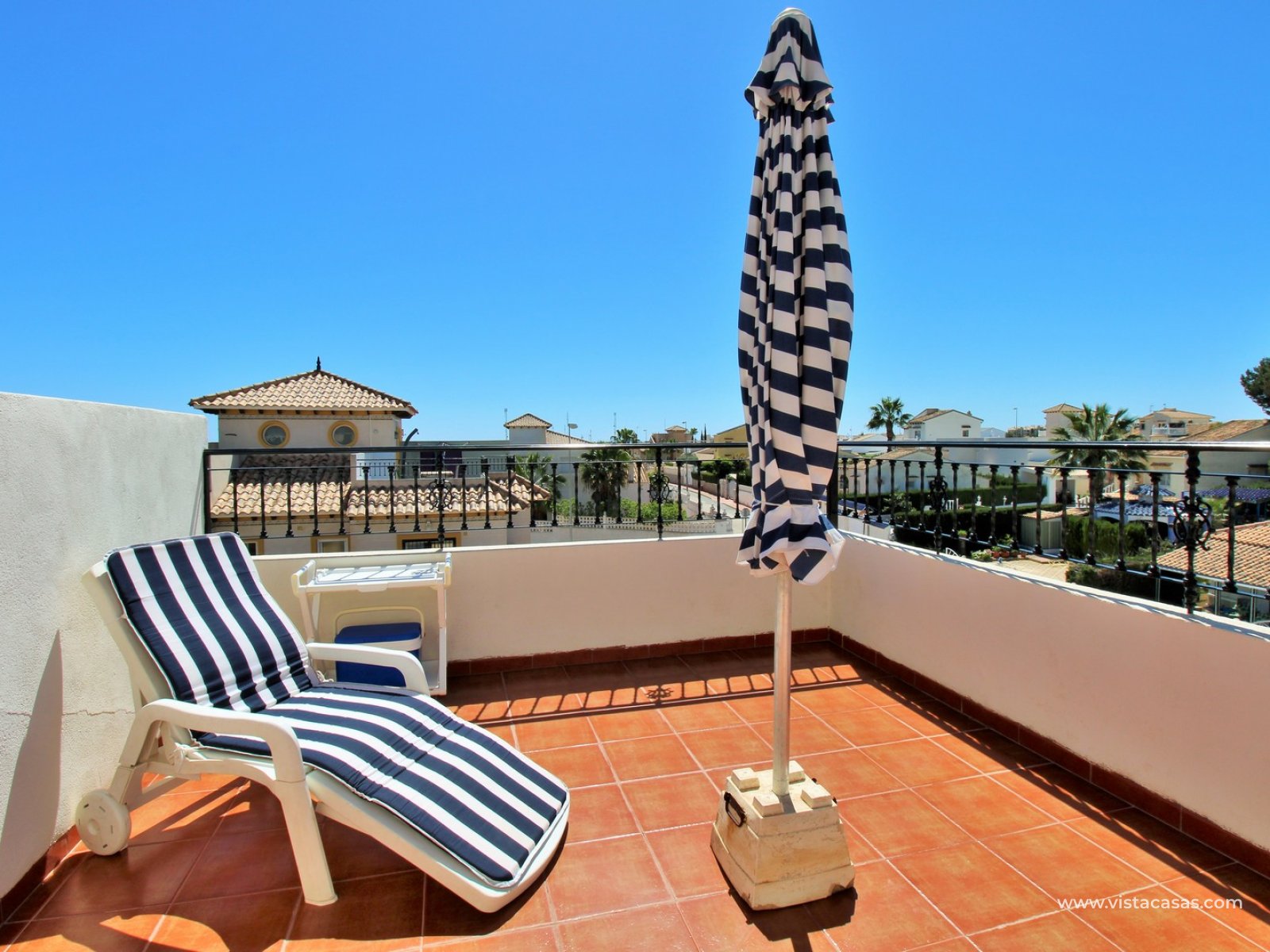Inside, the ground floor boasts an inviting open-plan L-shaped living and dining area, complemented by an American-style kitchen and a convenient downstairs WC. Upstairs, you’ll find two bedrooms with fitted wardrobes and a family bathroom. The master bedroom enjoys a sunny south-facing balcony. From the landing, internal stairs lead to a spacious roof solarium, offering extensive views and a large storage cupboard. Sold furnished, including white goods and air conditioning.