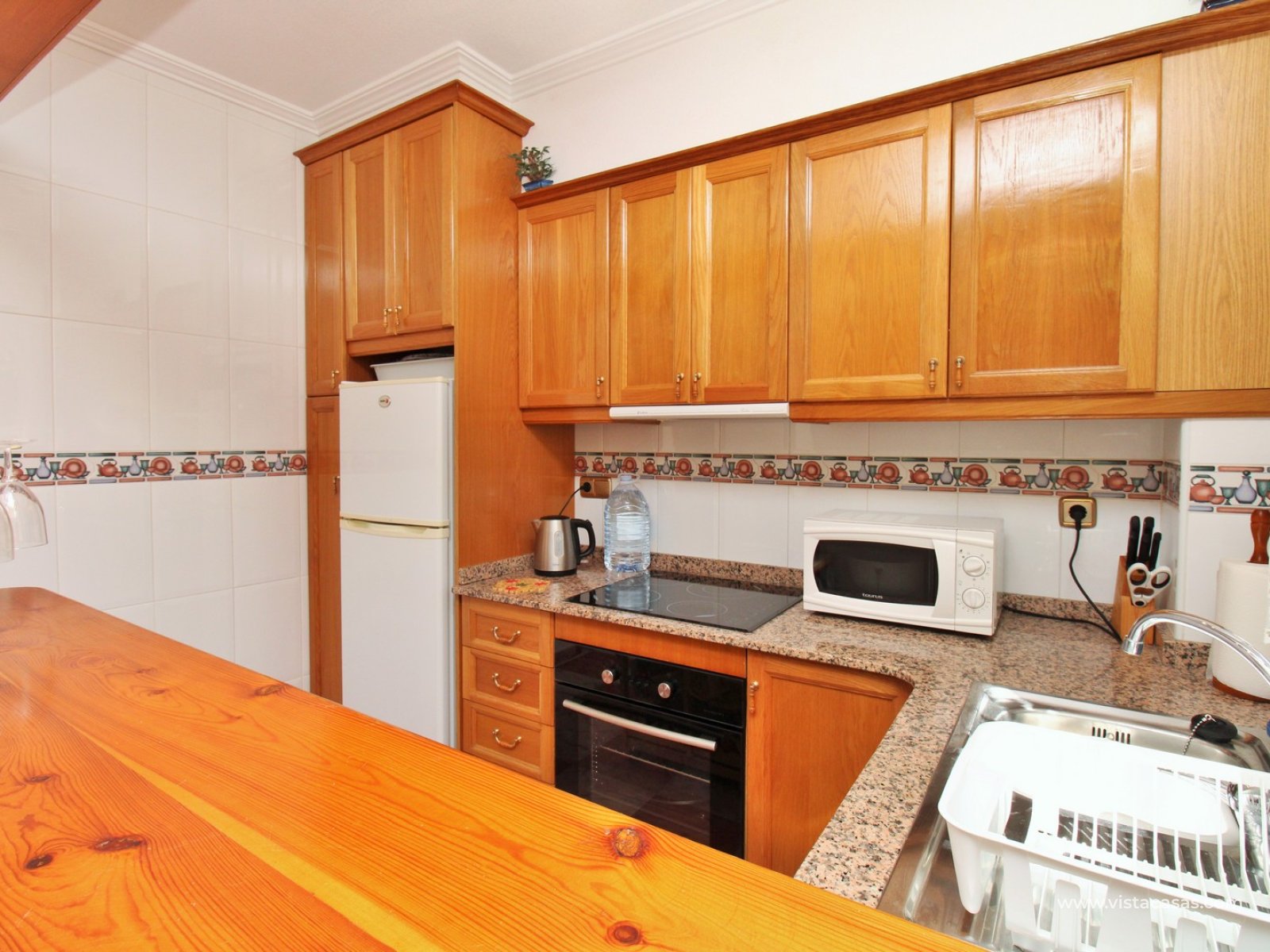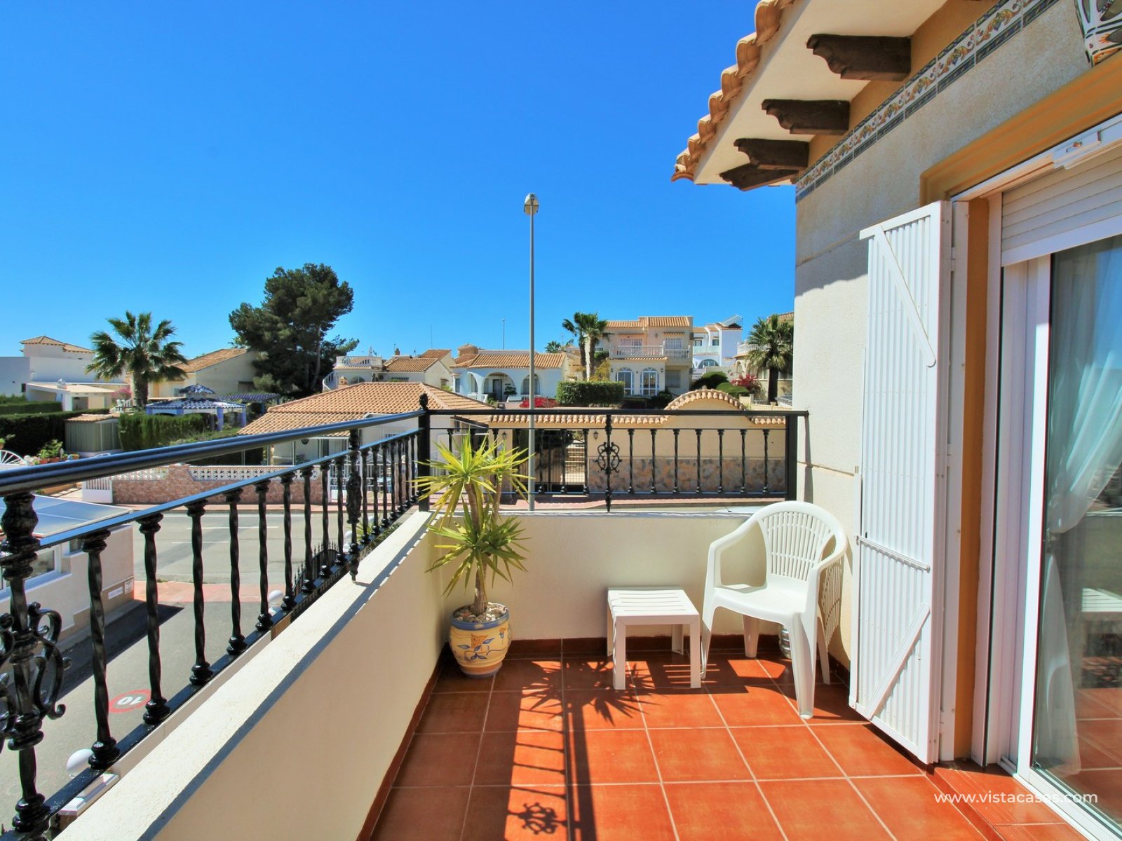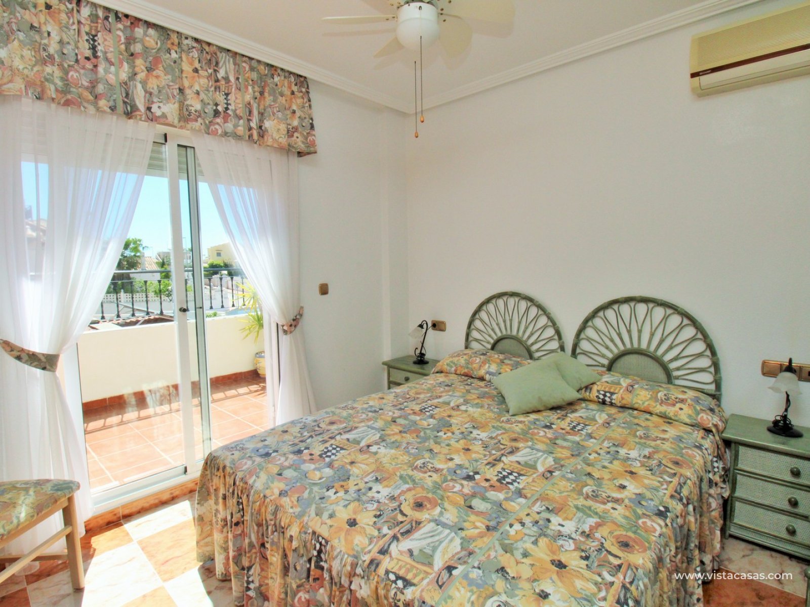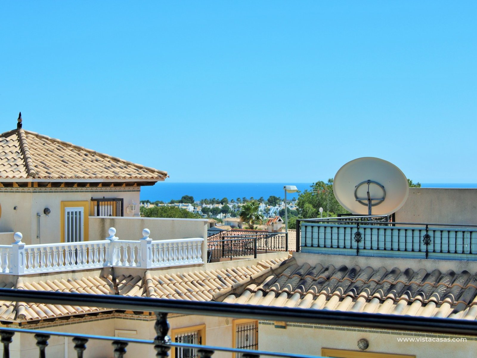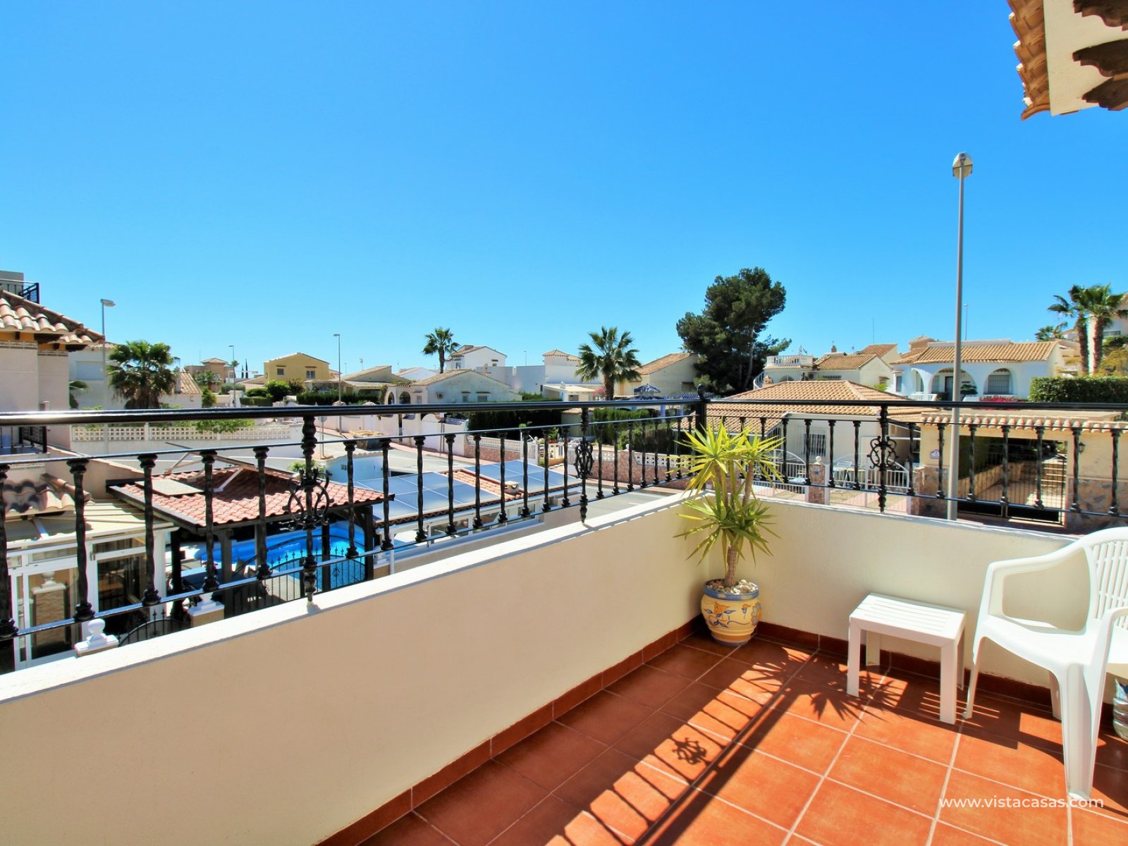 Inside, the ground floor boasts an inviting open-plan L-shaped living and dining area, complemented by an American-style kitchen and a convenient downstairs WC. Upstairs, you’ll find two bedrooms with fitted wardrobes and a family bathroom. The master bedroom enjoys a sunny south-facing balcony. From the landing, internal stairs lead to a spacious roof solarium, offering extensive views and a large storage cupboard. Sold furnished, including white goods and air conditioning.