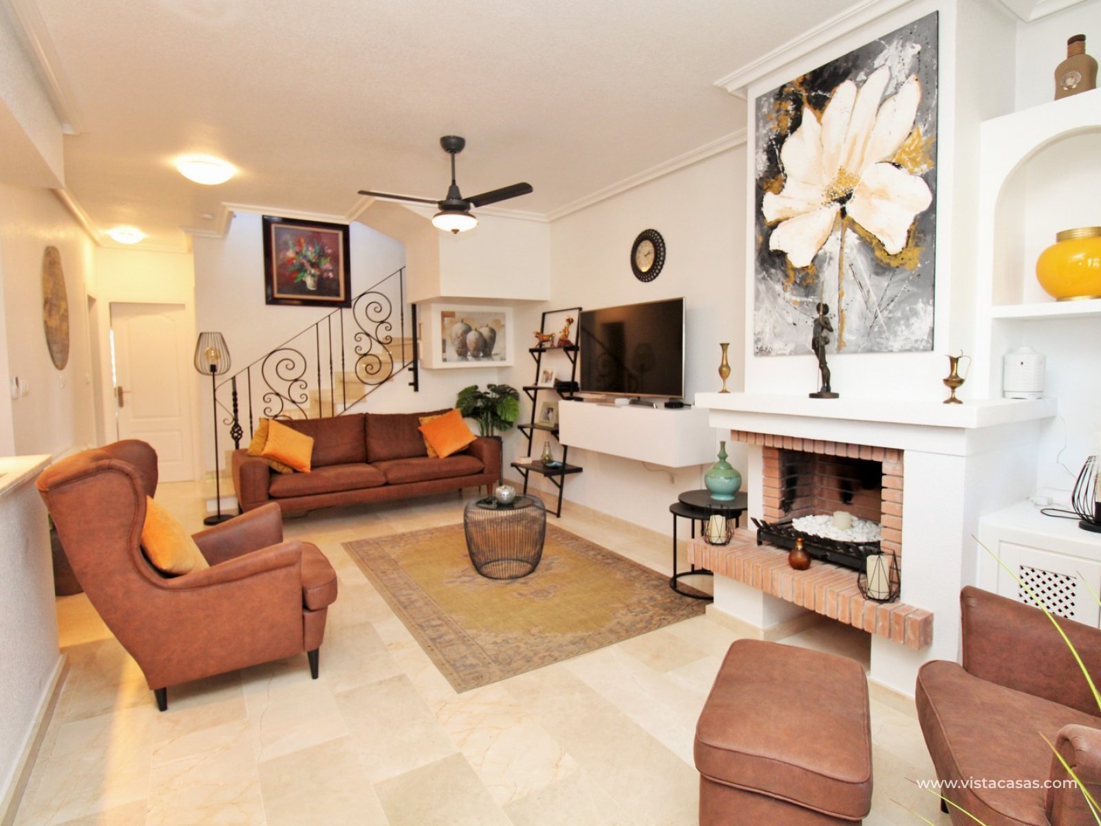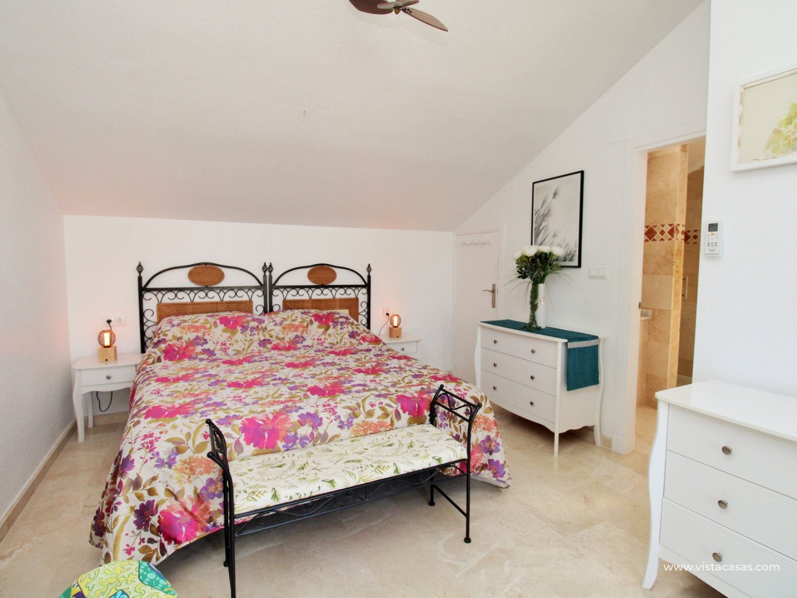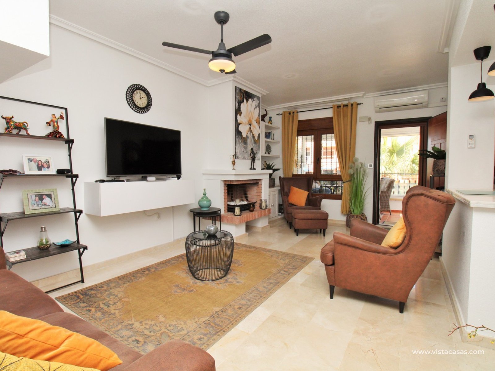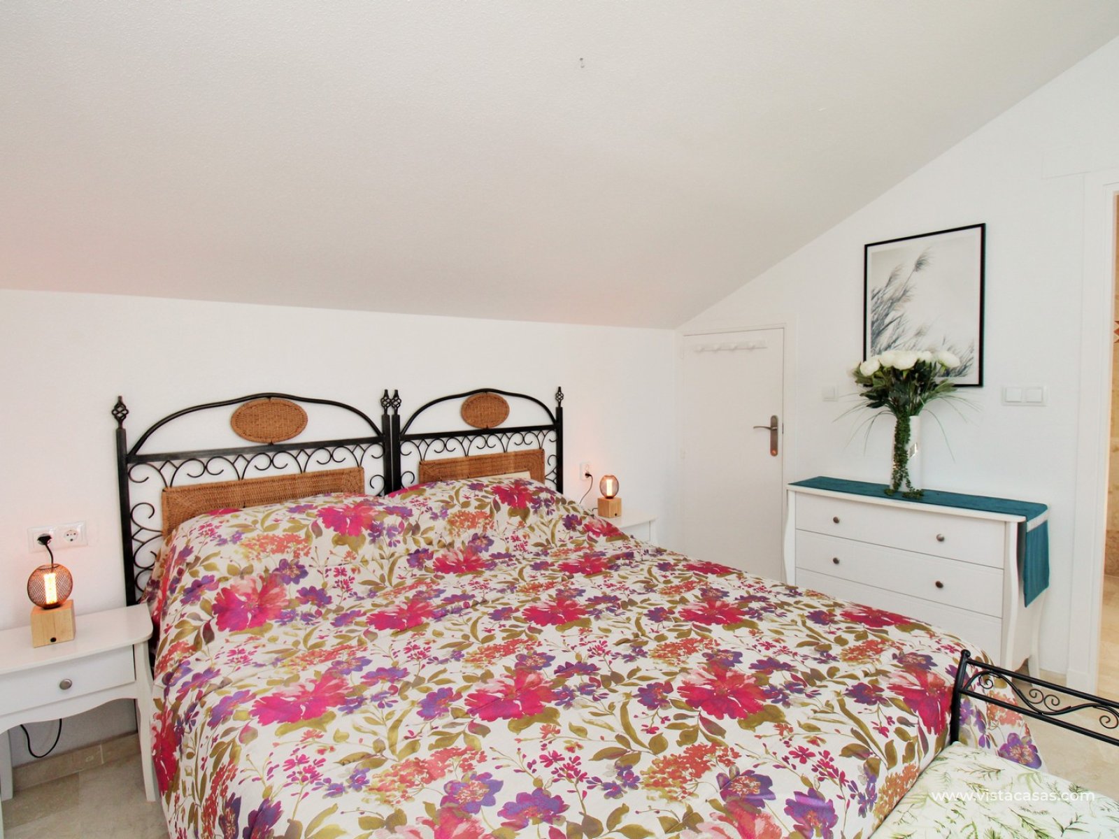 The ground floor features a spacious lounge and dining area with a fireplace, leading into a well-equipped kitchen with generous workspace, storage, and a separate utility area. Two double bedrooms, both with built-in wardrobes, share a large family bathroom with walk-in shower. One of the bedrooms opens onto a private rear garden with direct access to the communal pool—an ideal space for outdoor dining and relaxation. Upstairs, the master bedroom enjoys vaulted ceilings, air conditioning, and an en-suite bathroom with a walk-in shower. The landing and bedroom both provide access to a private sun terrace, perfect for enjoying the Mediterranean climate. At the front of the property, a garden and enclosed terrace create a welcoming space for socialising or unwinding in the sun. Located close to several top golf courses, this property is ideal as a holiday home or permanent residence, and has been kept in immaculate condition - a perfect turn key property!