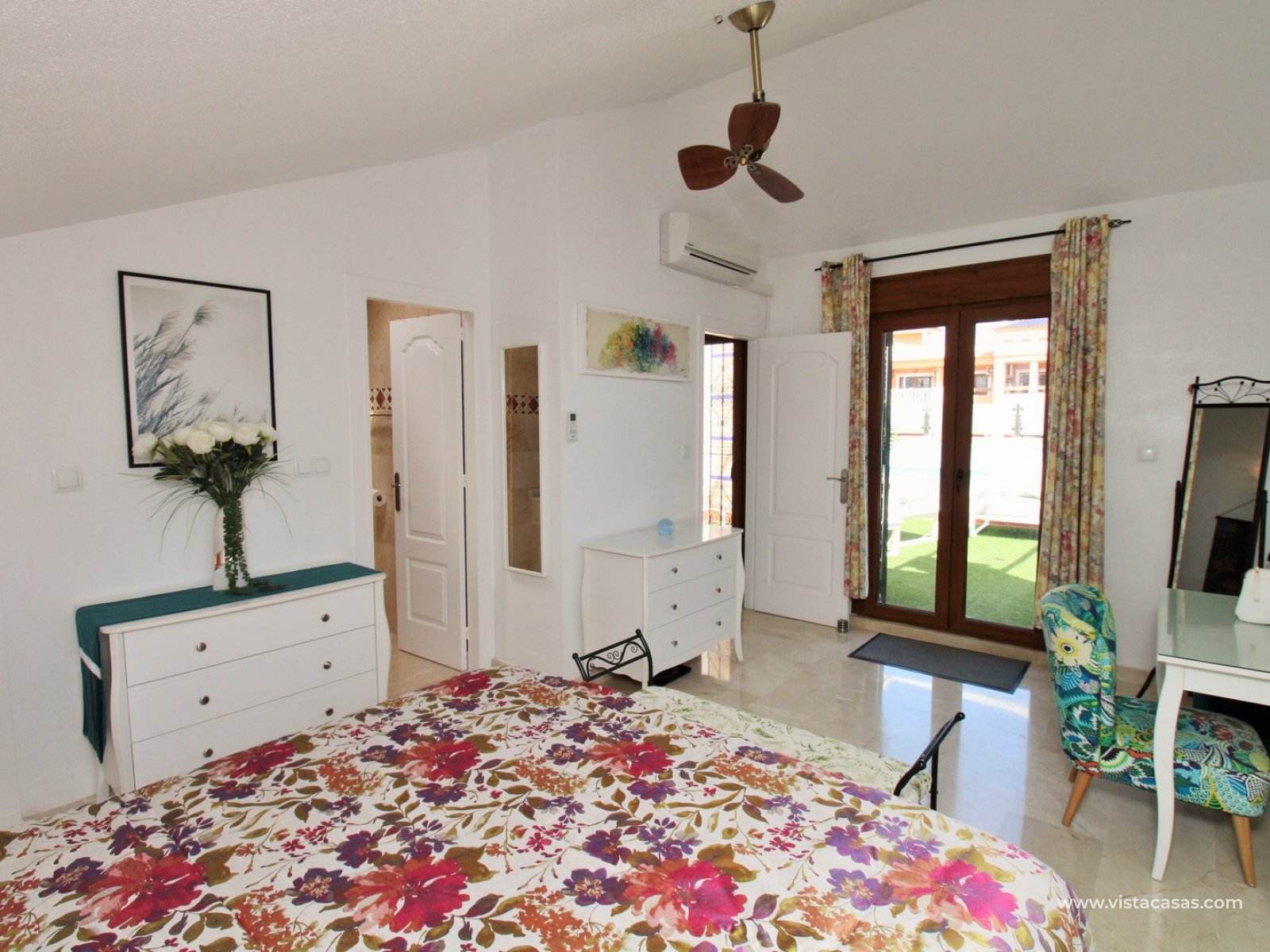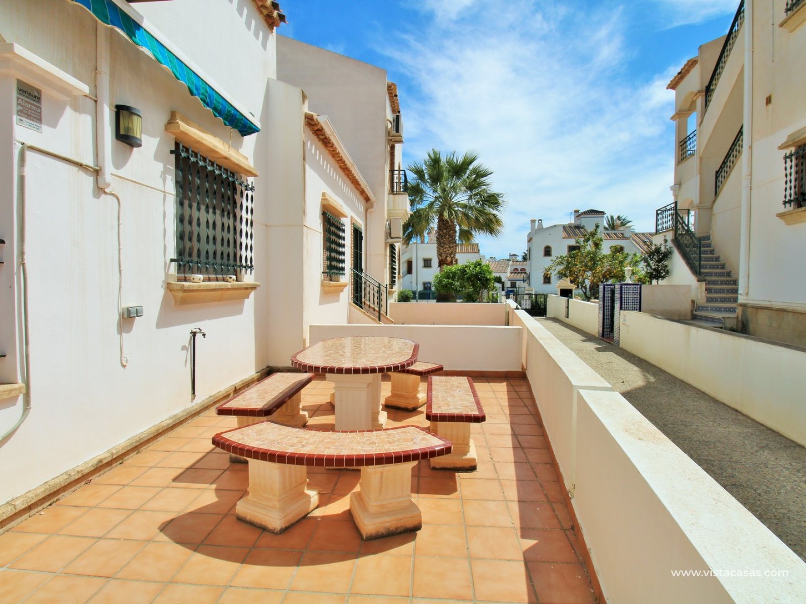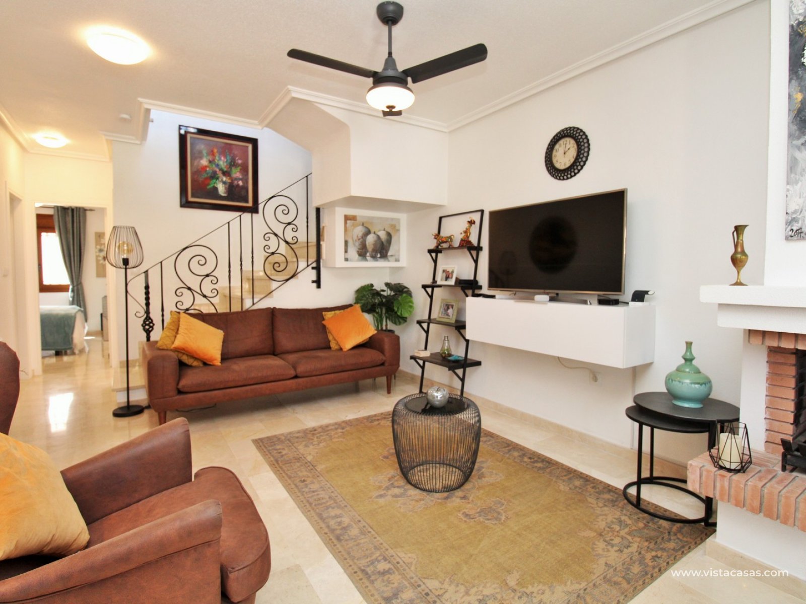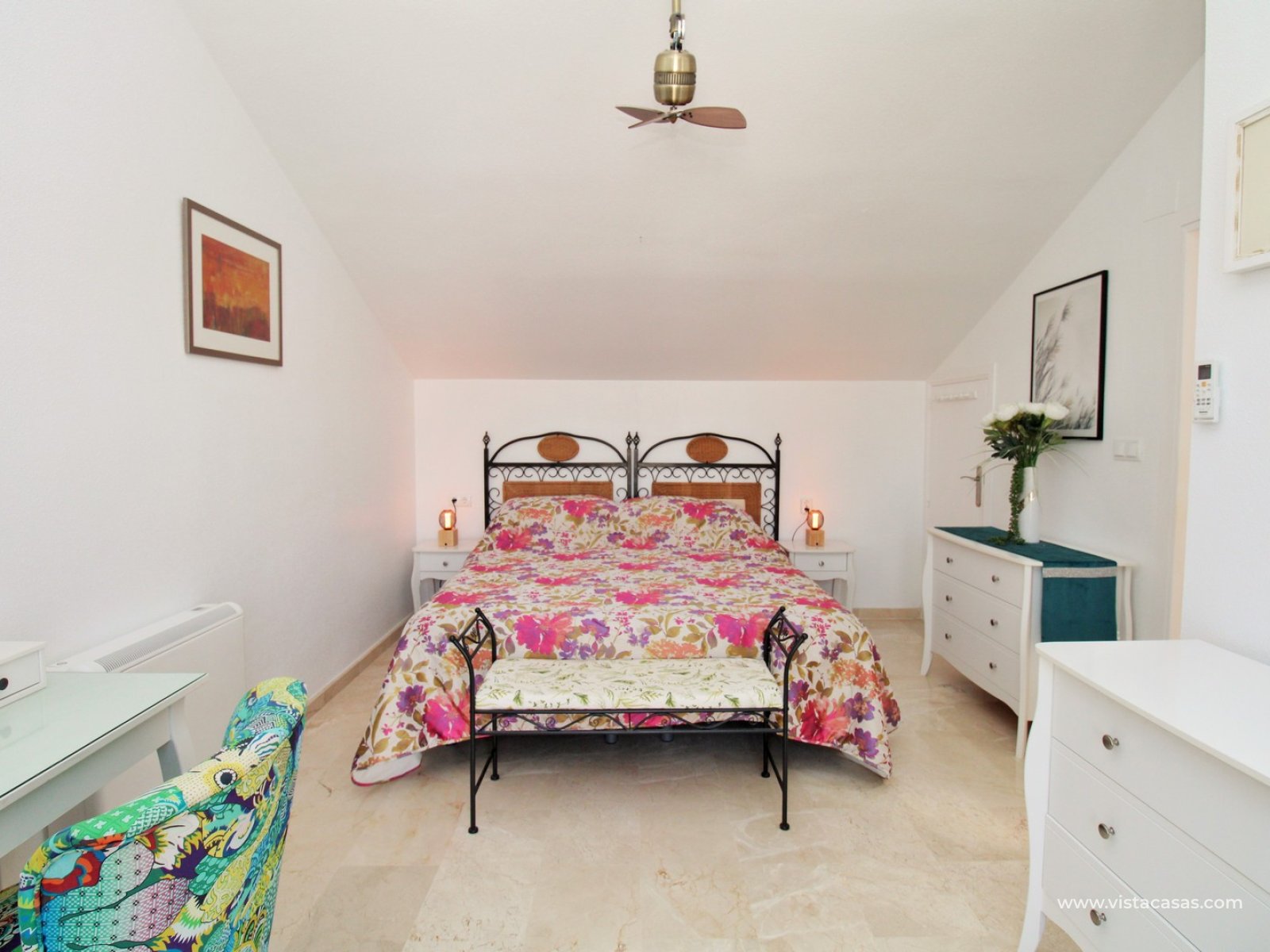 The ground floor features a spacious lounge and dining area with a fireplace, leading into a well-equipped kitchen with generous workspace, storage, and a separate utility area. Two double bedrooms, both with built-in wardrobes, share a large family bathroom with walk-in shower. One of the bedrooms opens onto a private rear garden with direct access to the communal pool—an ideal space for outdoor dining and relaxation. Upstairs, the master bedroom enjoys vaulted ceilings, air conditioning, and an en-suite bathroom with a walk-in shower. The landing and bedroom both provide access to a private sun terrace, perfect for enjoying the Mediterranean climate. At the front of the property, a garden and enclosed terrace create a welcoming space for socialising or unwinding in the sun. Located close to several top golf courses, this property is ideal as a holiday home or permanent residence, and has been kept in immaculate condition - a perfect turn key property!