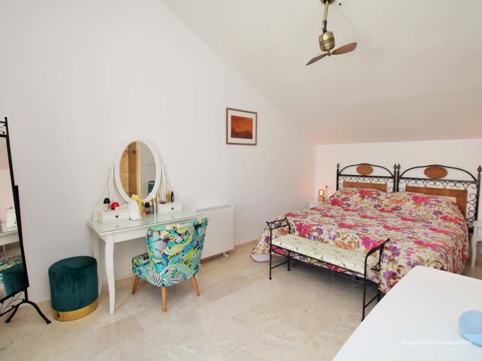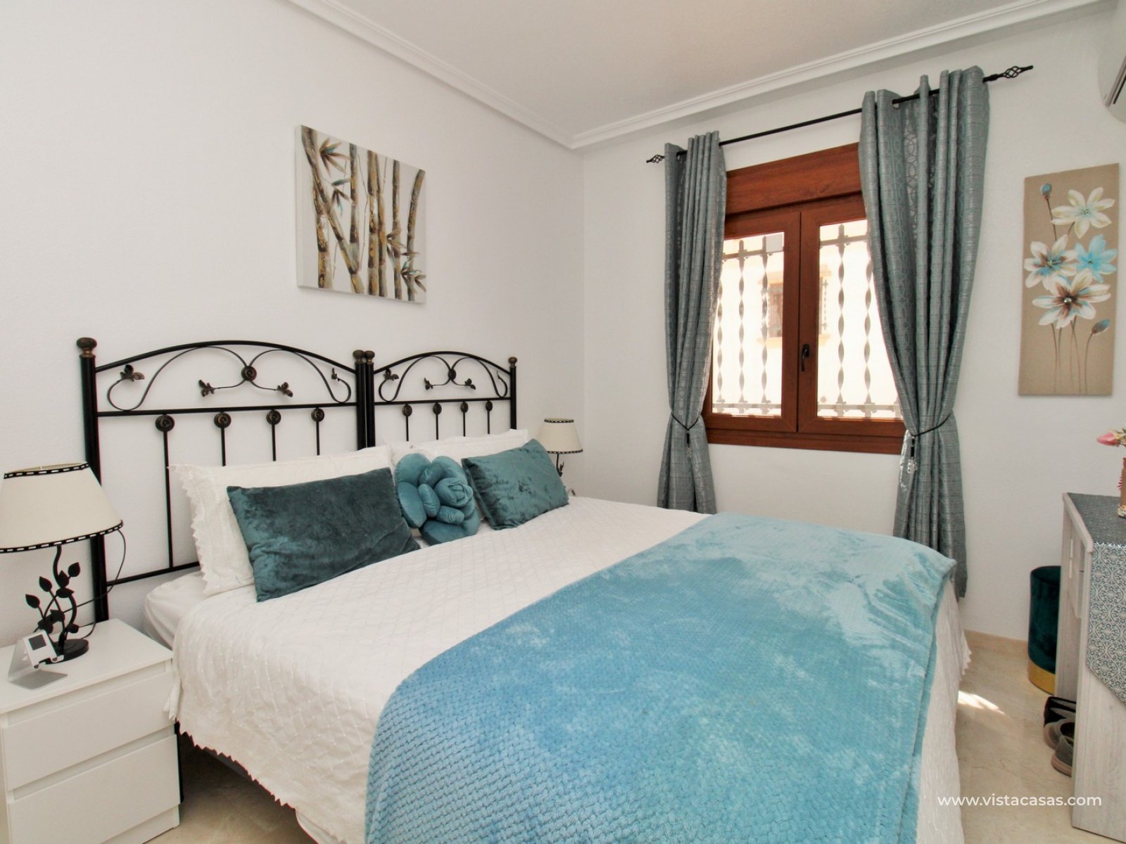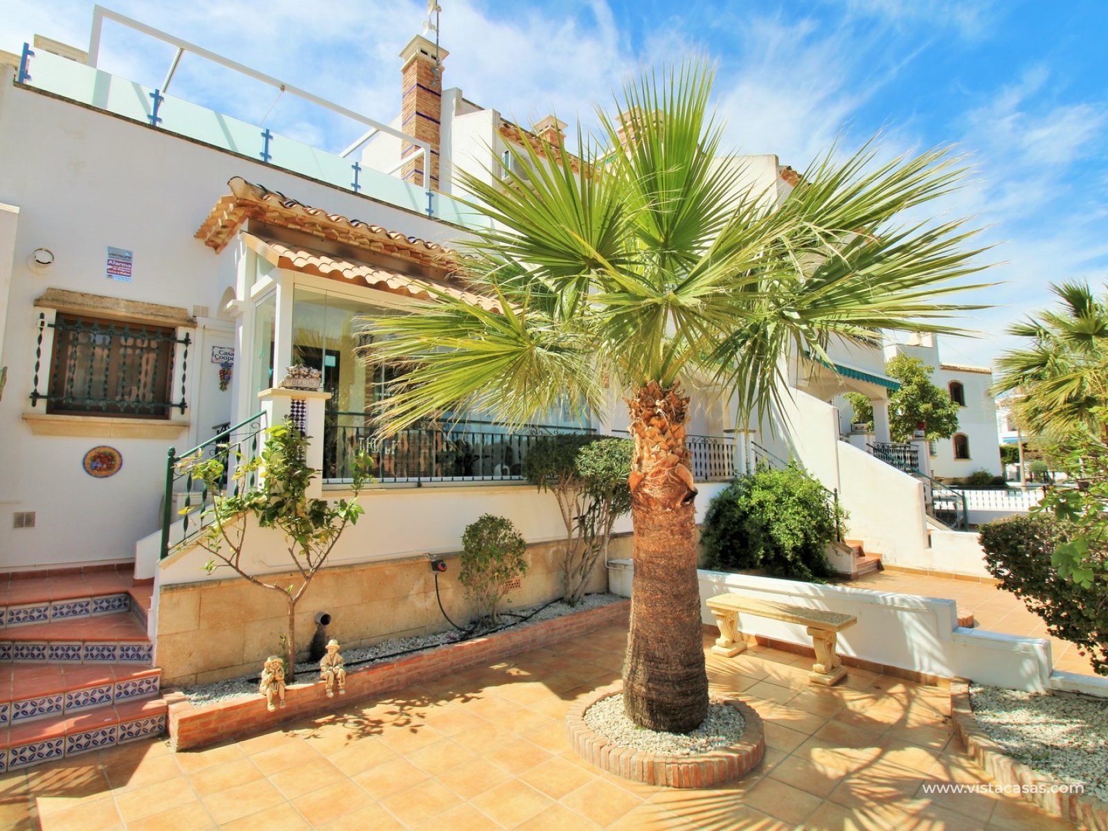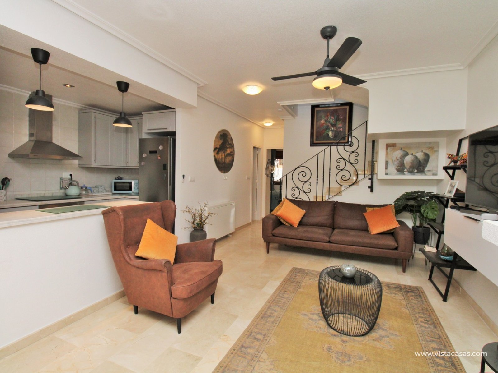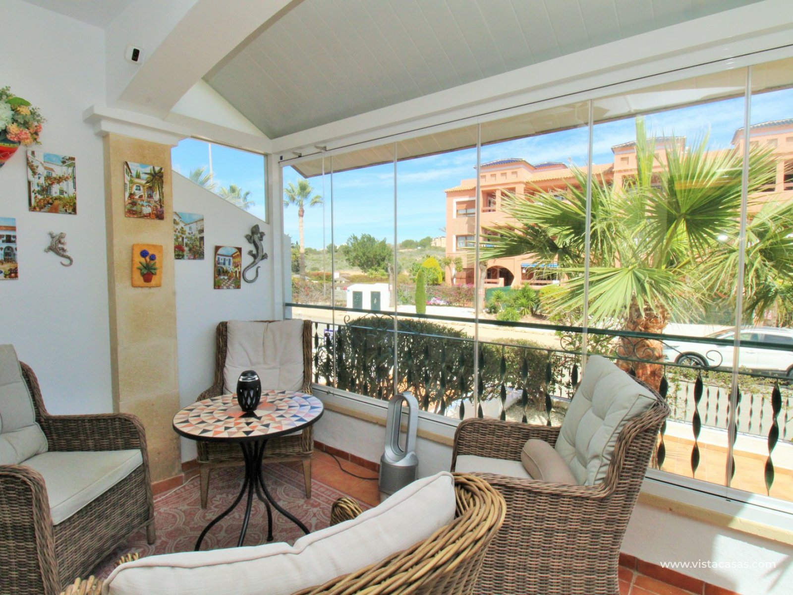 The ground floor features a spacious lounge and dining area with a fireplace, leading into a well-equipped kitchen with generous workspace, storage, and a separate utility area. Two double bedrooms, both with built-in wardrobes, share a large family bathroom with walk-in shower. One of the bedrooms opens onto a private rear garden with direct access to the communal pool—an ideal space for outdoor dining and relaxation. Upstairs, the master bedroom enjoys vaulted ceilings, air conditioning, and an en-suite bathroom with a walk-in shower. The landing and bedroom both provide access to a private sun terrace, perfect for enjoying the Mediterranean climate. At the front of the property, a garden and enclosed terrace create a welcoming space for socialising or unwinding in the sun. Located close to several top golf courses, this property is ideal as a holiday home or permanent residence, and has been kept in immaculate condition - a perfect turn key property!