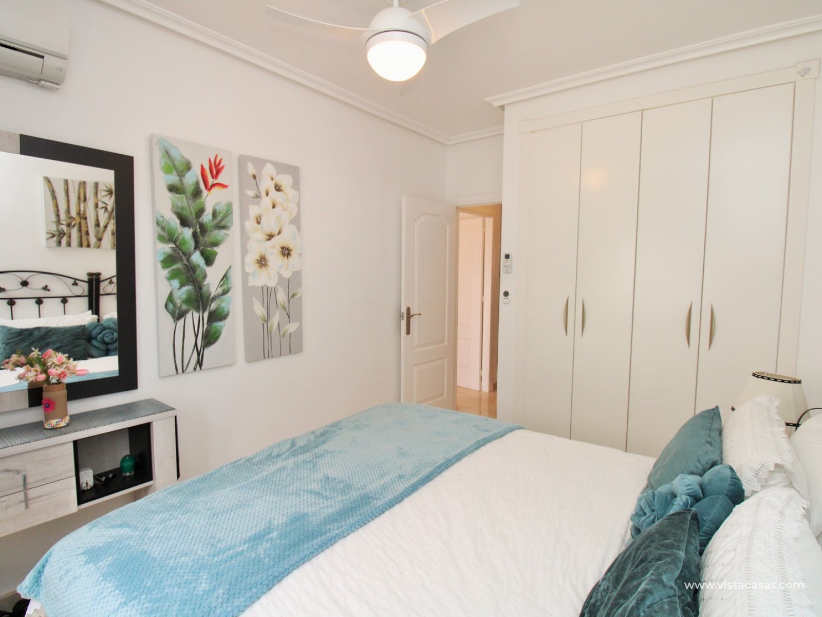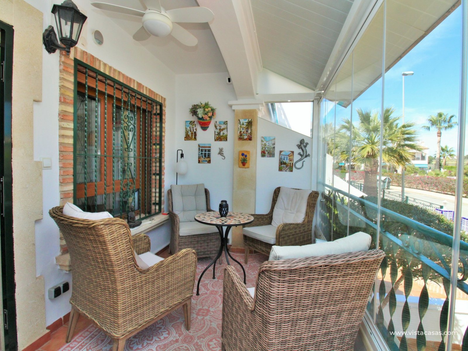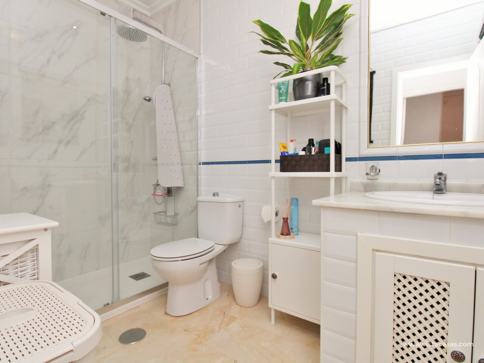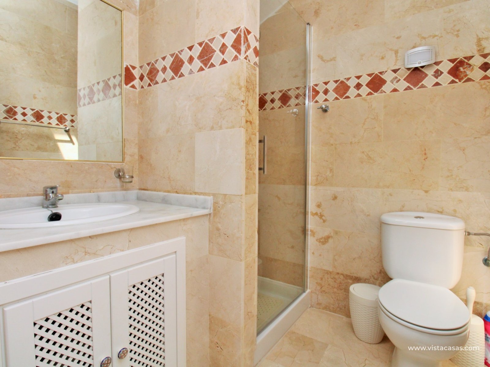 The ground floor features a spacious lounge and dining area with a fireplace, leading into a well-equipped kitchen with generous workspace, storage, and a separate utility area. Two double bedrooms, both with built-in wardrobes, share a large family bathroom with walk-in shower. One of the bedrooms opens onto a private rear garden with direct access to the communal pool—an ideal space for outdoor dining and relaxation. Upstairs, the master bedroom enjoys vaulted ceilings, air conditioning, and an en-suite bathroom with a walk-in shower. The landing and bedroom both provide access to a private sun terrace, perfect for enjoying the Mediterranean climate. At the front of the property, a garden and enclosed terrace create a welcoming space for socialising or unwinding in the sun. Located close to several top golf courses, this property is ideal as a holiday home or permanent residence, and has been kept in immaculate condition - a perfect turn key property!