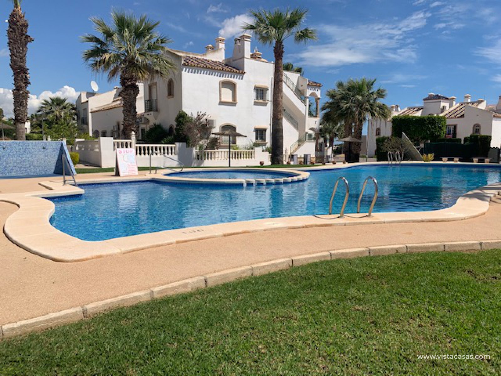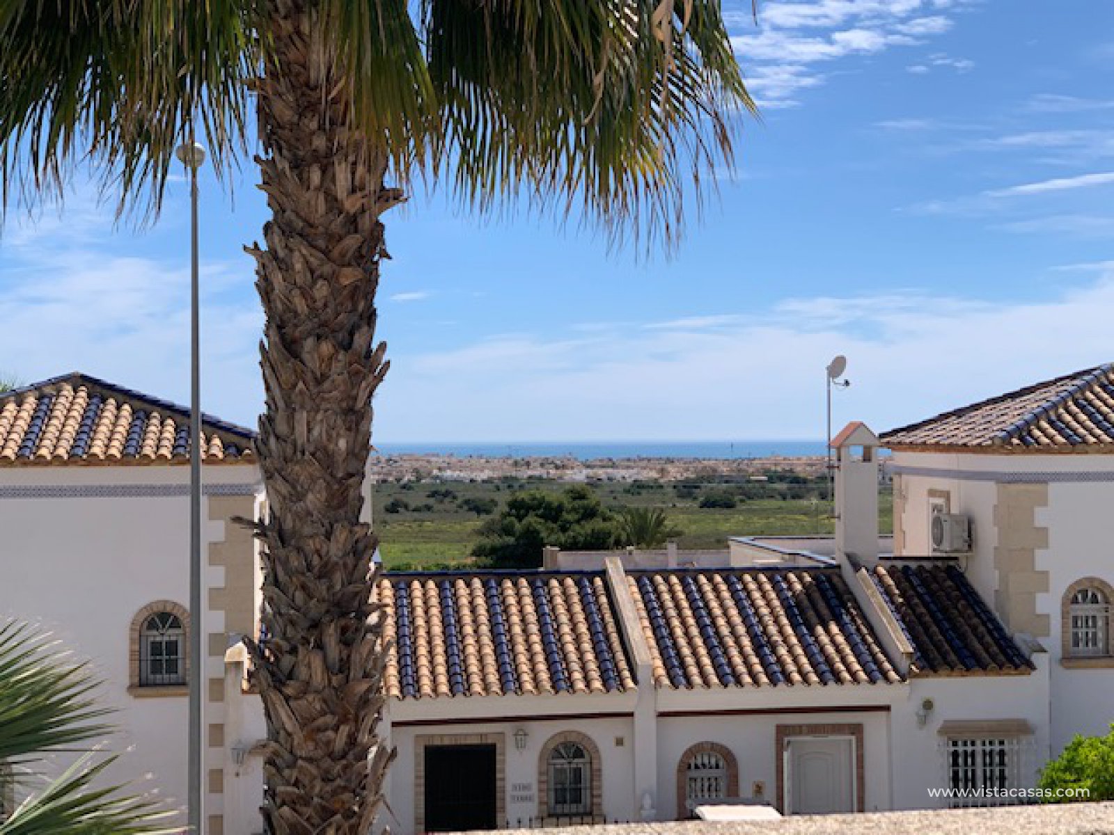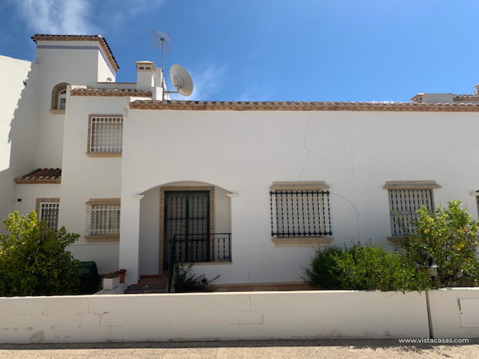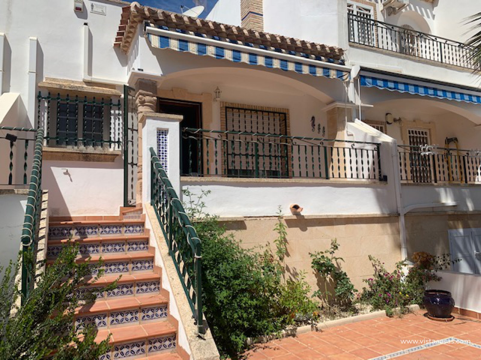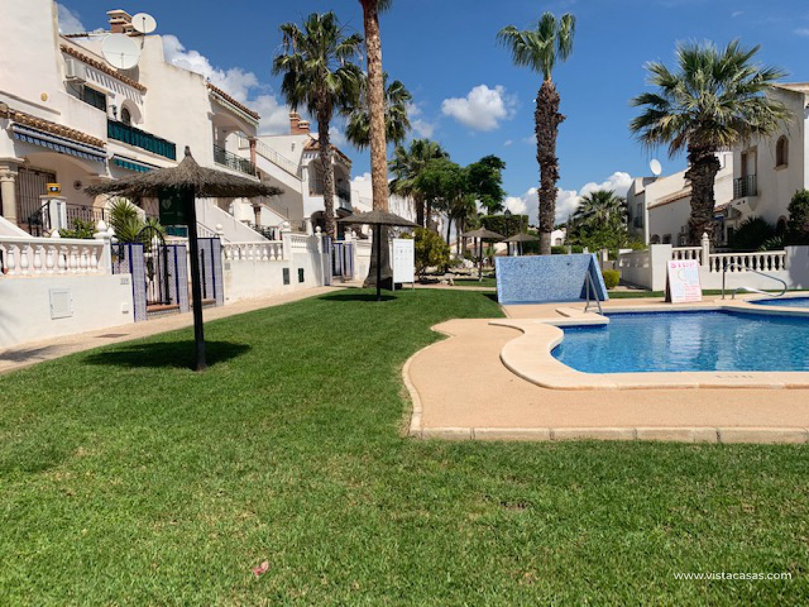 This south-east facing 3 bedrooms, 2 bathrooms Buhardilla model townhouse is situated in sought after Las Violetas, a short walk to the Golf and famous Villamartin Plaza with its many restaurants and bars, shops and supermarket. The property offers a large living area while having front and back gardens. There are 2 bedrooms on the ground floor and a master bedroom on the 1st floor. Positioned in a beautiful community with off-road parking and communal pool.