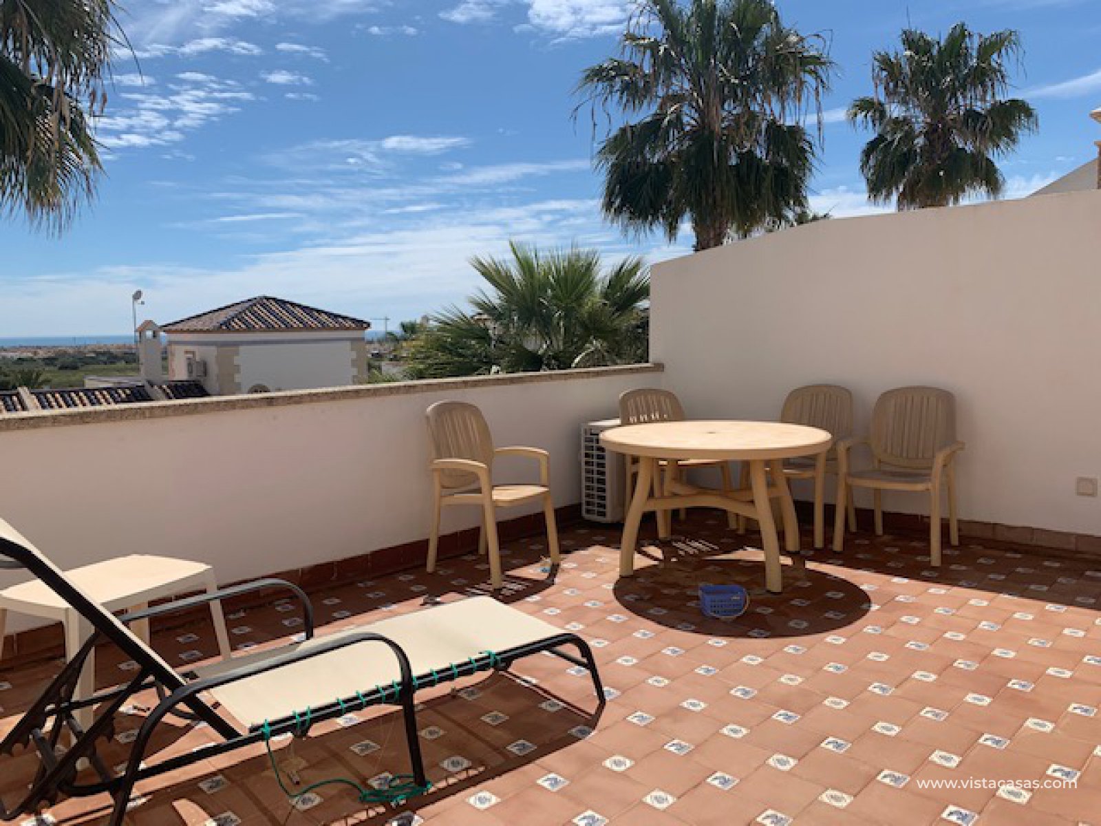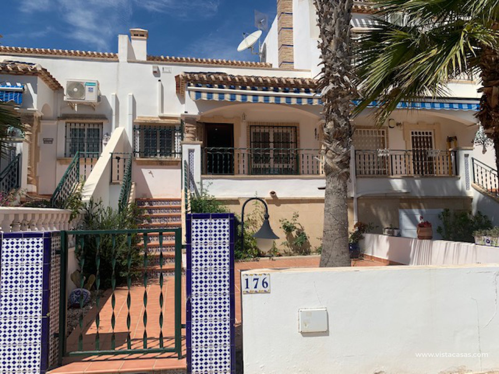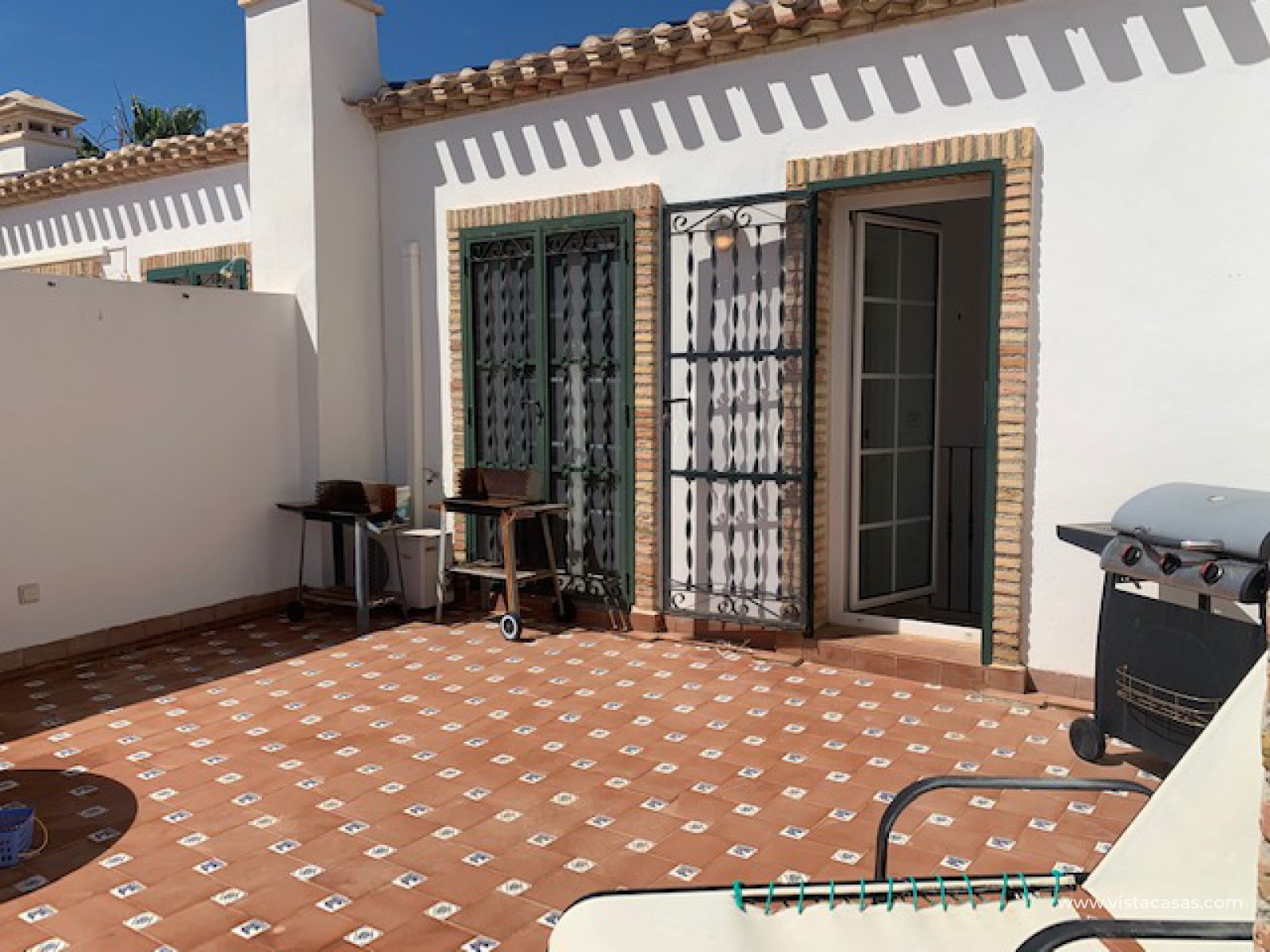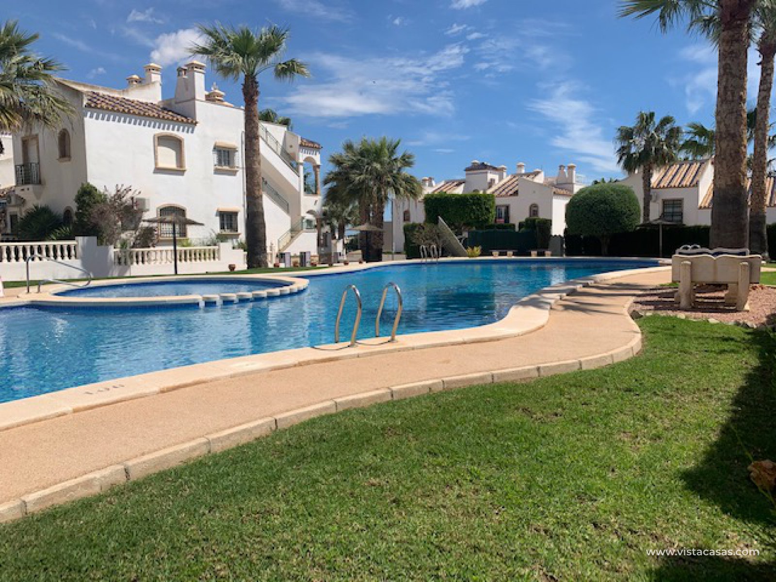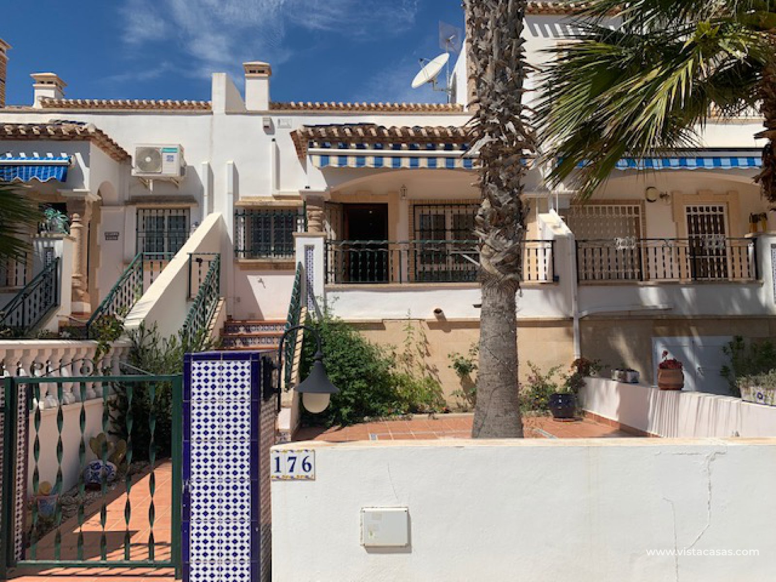 This south-east facing 3 bedrooms, 2 bathrooms Buhardilla model townhouse is situated in sought after Las Violetas, a short walk to the Golf and famous Villamartin Plaza with its many restaurants and bars, shops and supermarket. The property offers a large living area while having front and back gardens. There are 2 bedrooms on the ground floor and a master bedroom on the 1st floor. Positioned in a beautiful community with off-road parking and communal pool.