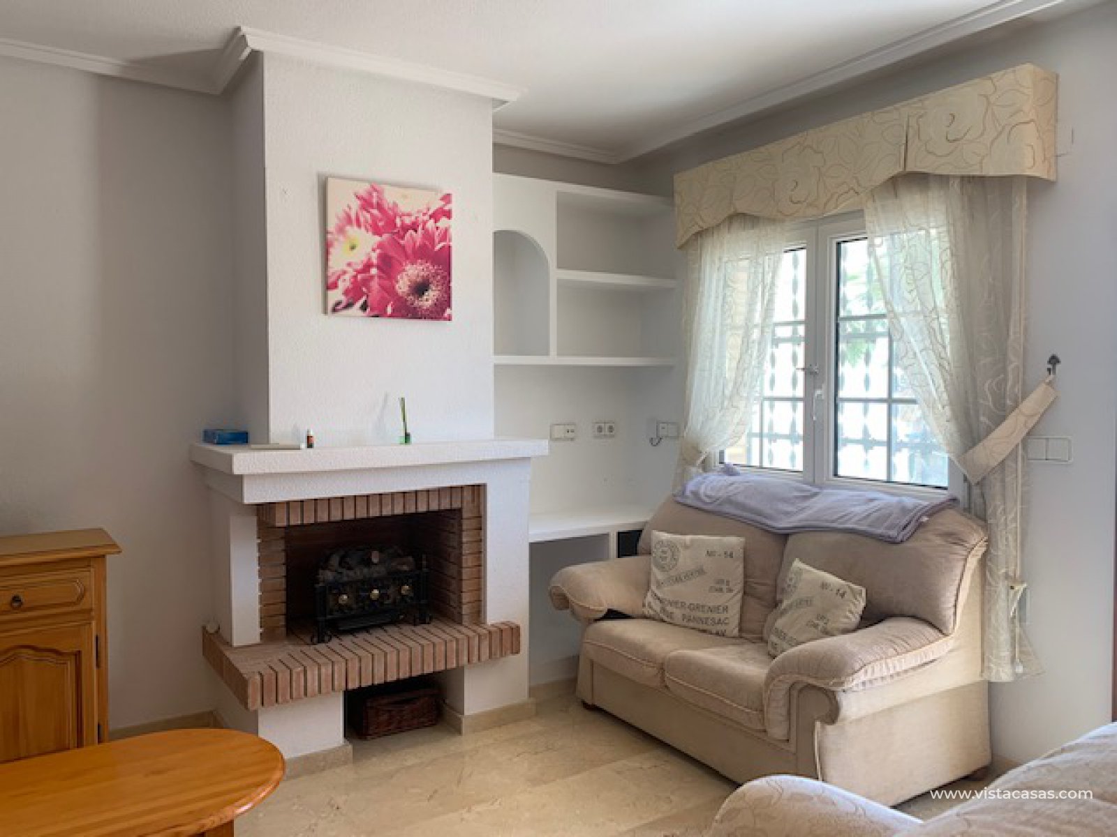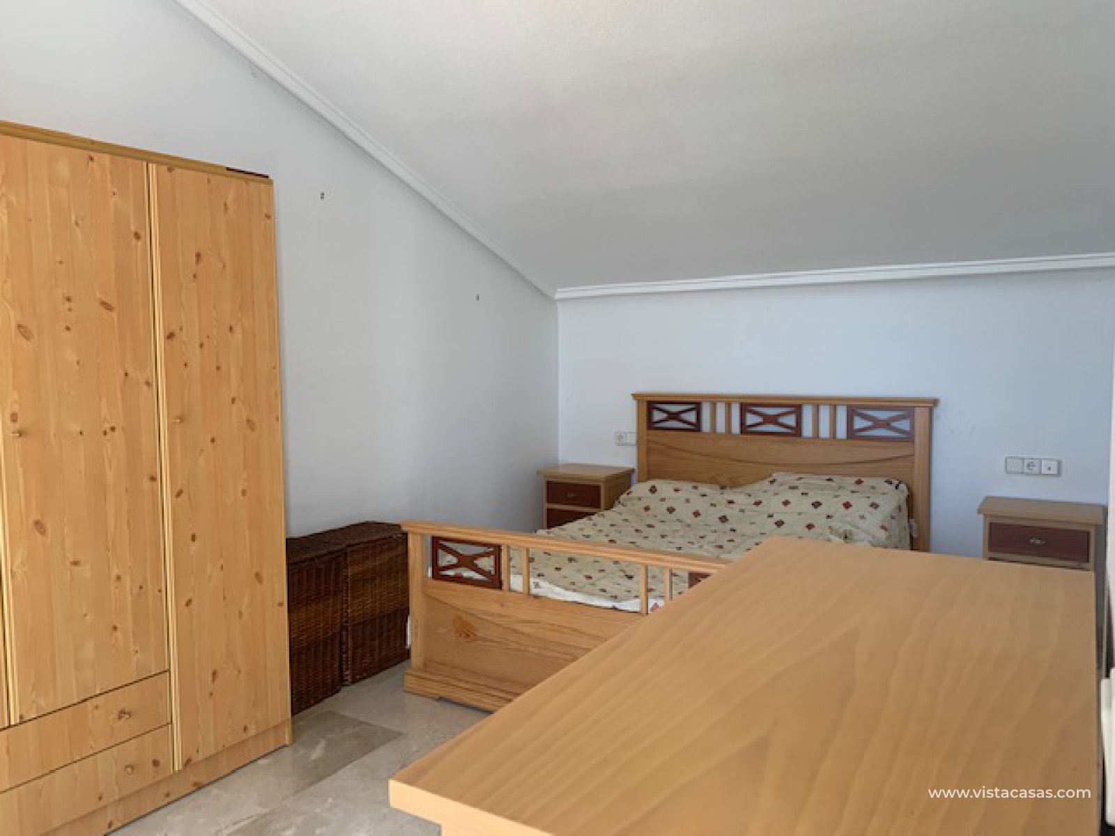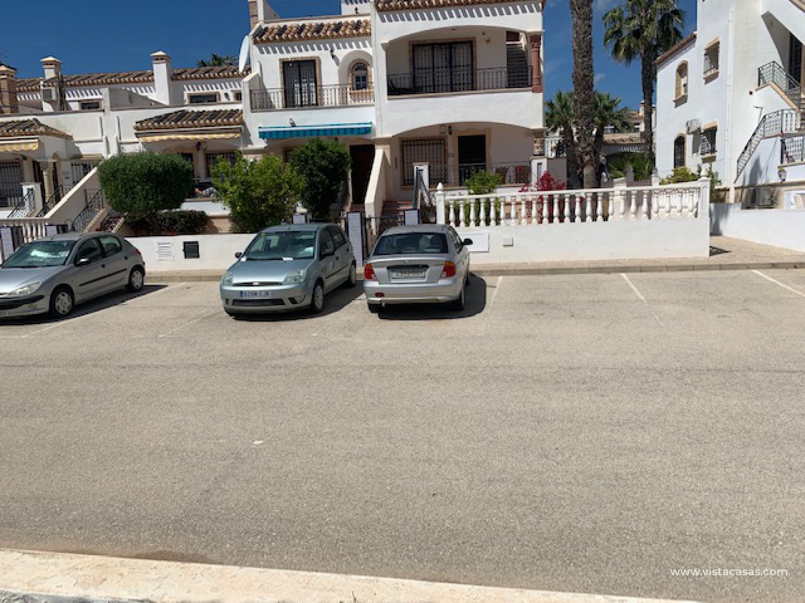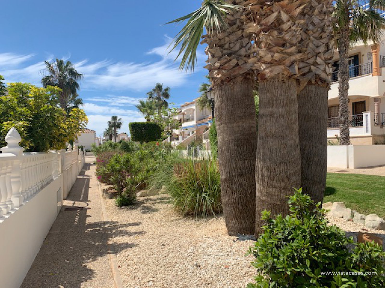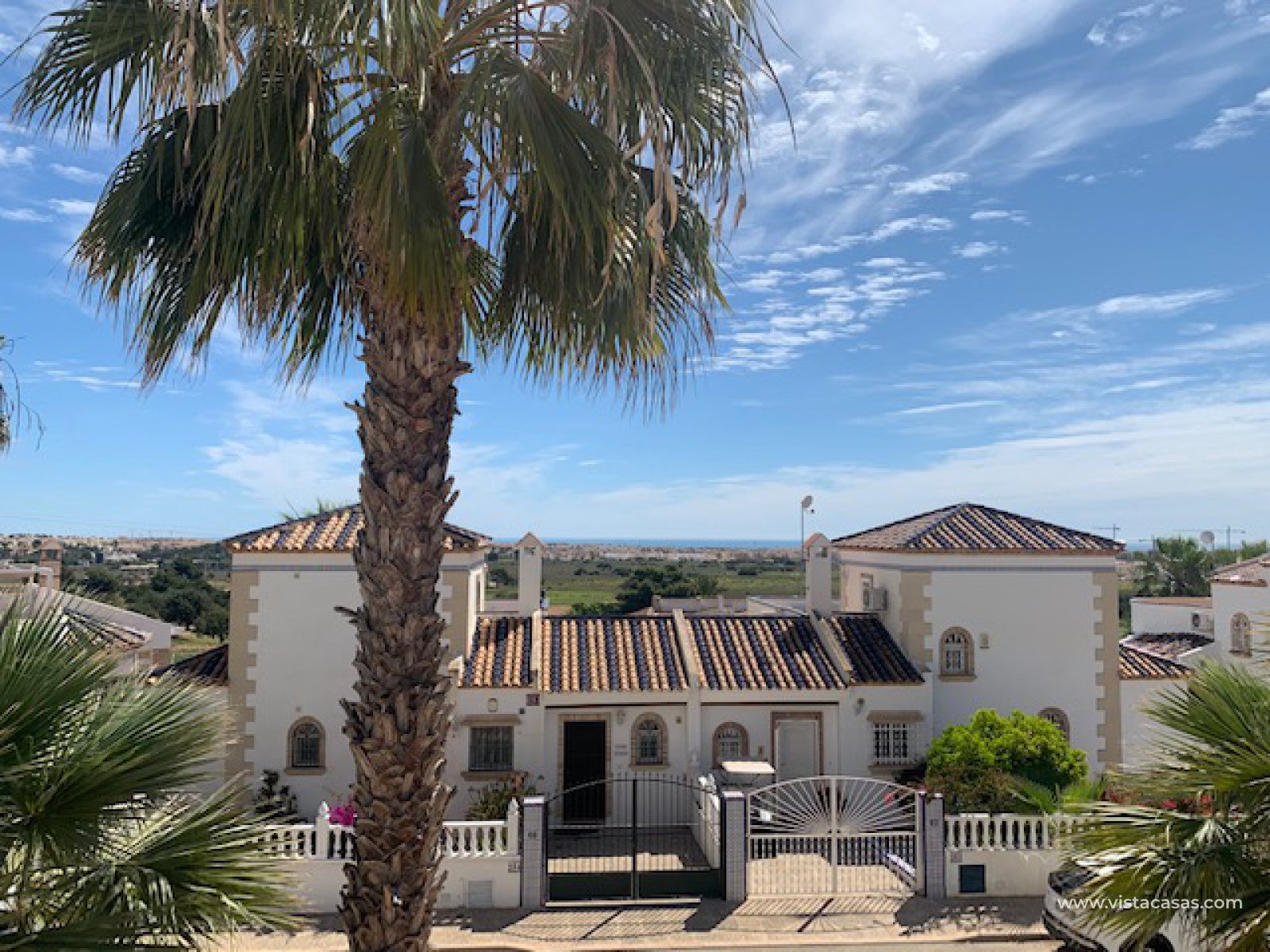 This south-east facing 3 bedrooms, 2 bathrooms Buhardilla model townhouse is situated in sought after Las Violetas, a short walk to the Golf and famous Villamartin Plaza with its many restaurants and bars, shops and supermarket. The property offers a large living area while having front and back gardens. There are 2 bedrooms on the ground floor and a master bedroom on the 1st floor. Positioned in a beautiful community with off-road parking and communal pool.