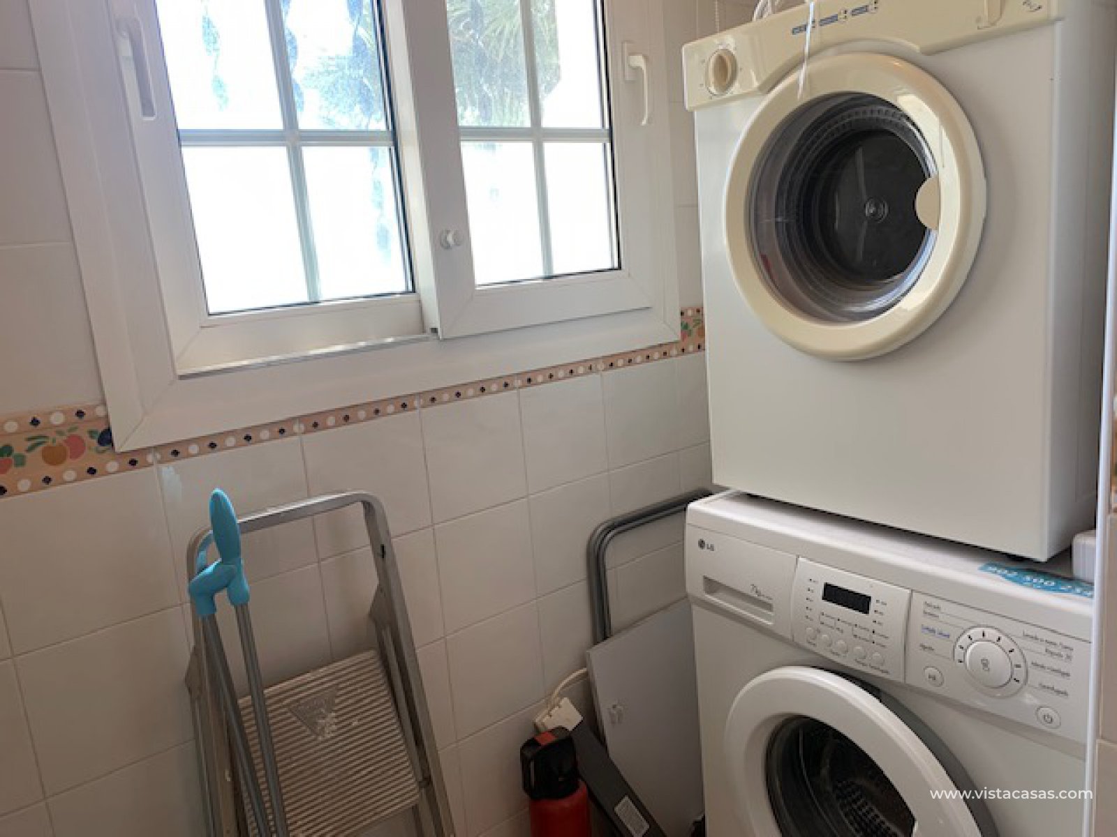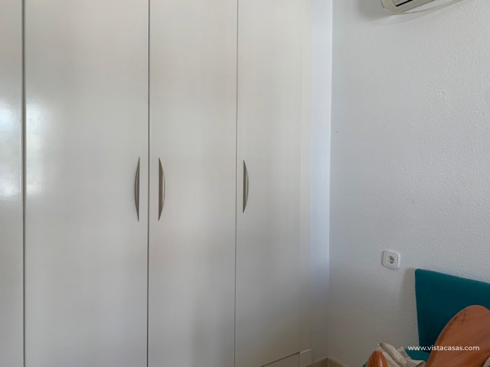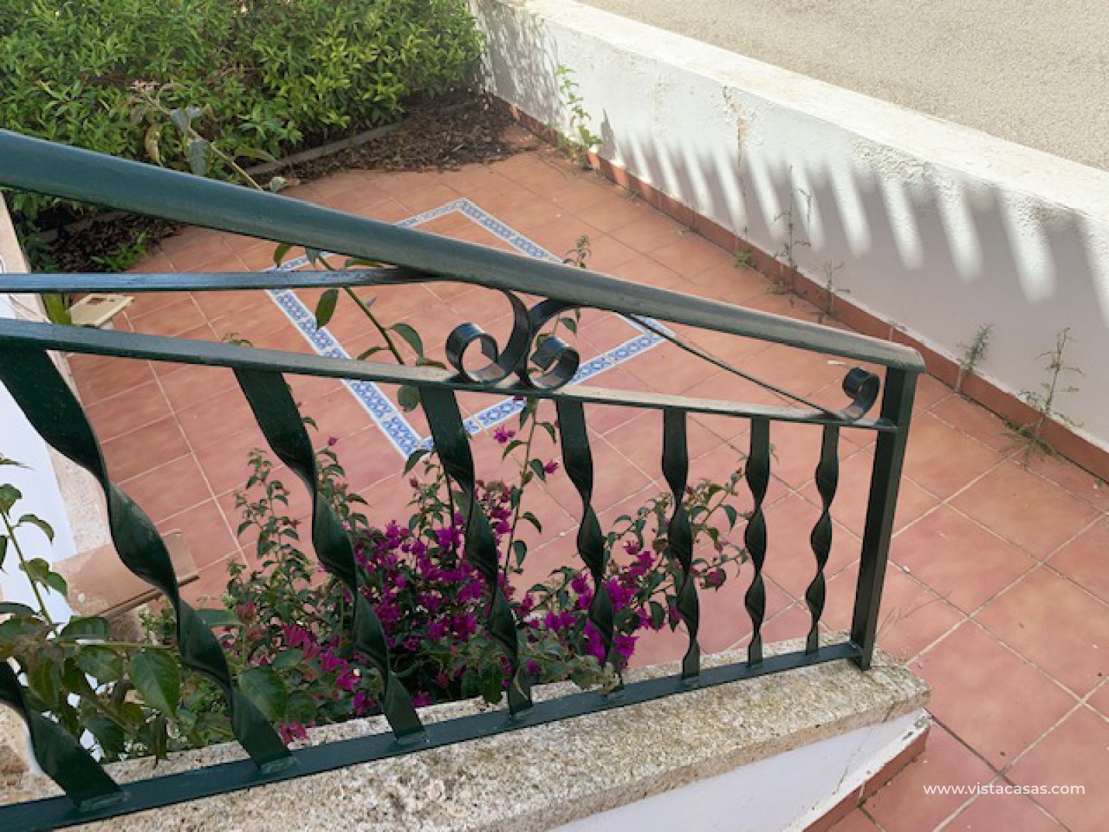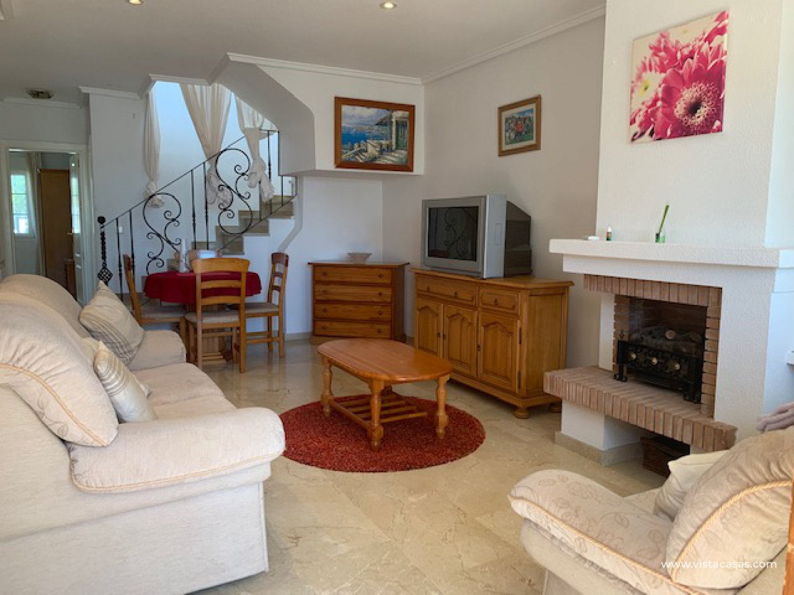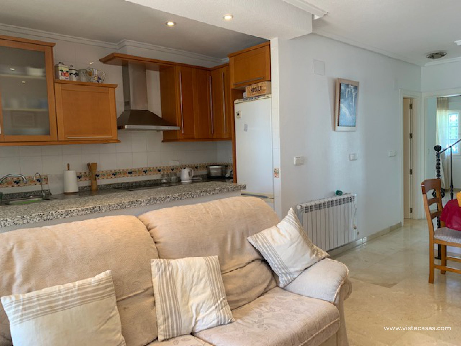 This south-east facing 3 bedrooms, 2 bathrooms Buhardilla model townhouse is situated in sought after Las Violetas, a short walk to the Golf and famous Villamartin Plaza with its many restaurants and bars, shops and supermarket. The property offers a large living area while having front and back gardens. There are 2 bedrooms on the ground floor and a master bedroom on the 1st floor. Positioned in a beautiful community with off-road parking and communal pool.