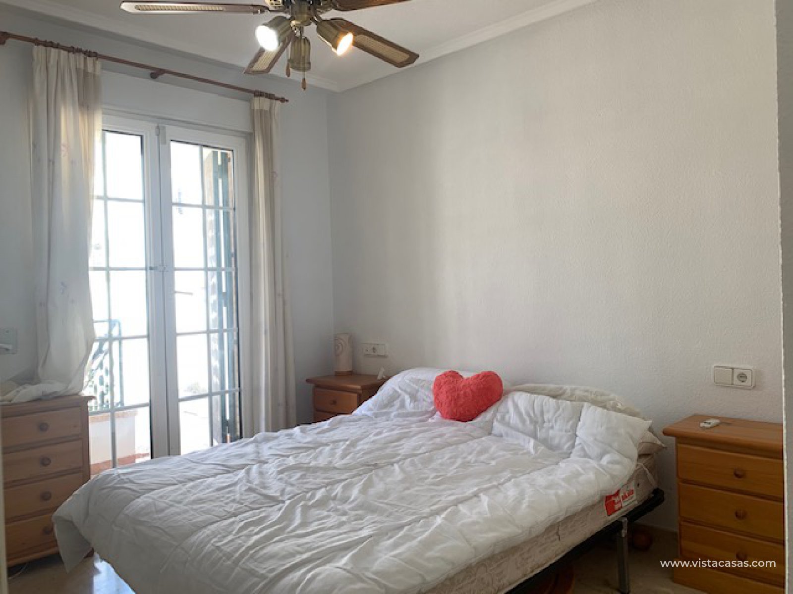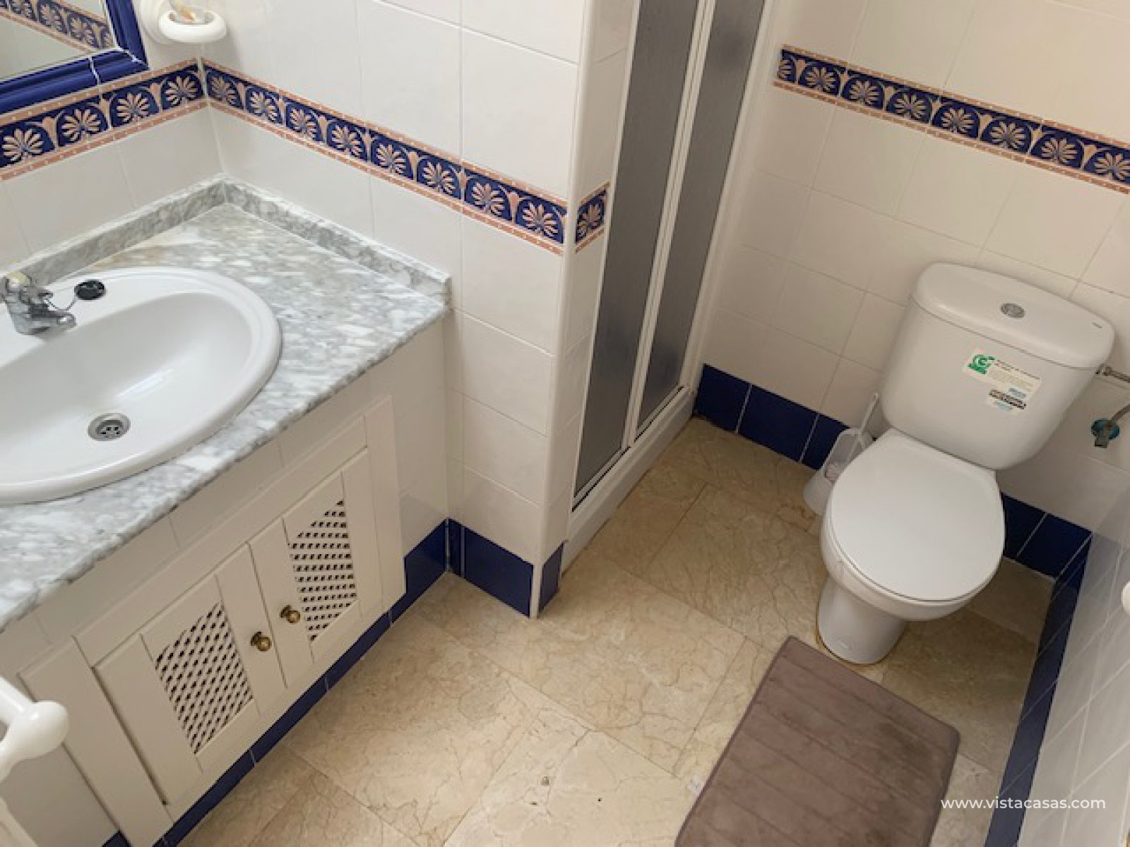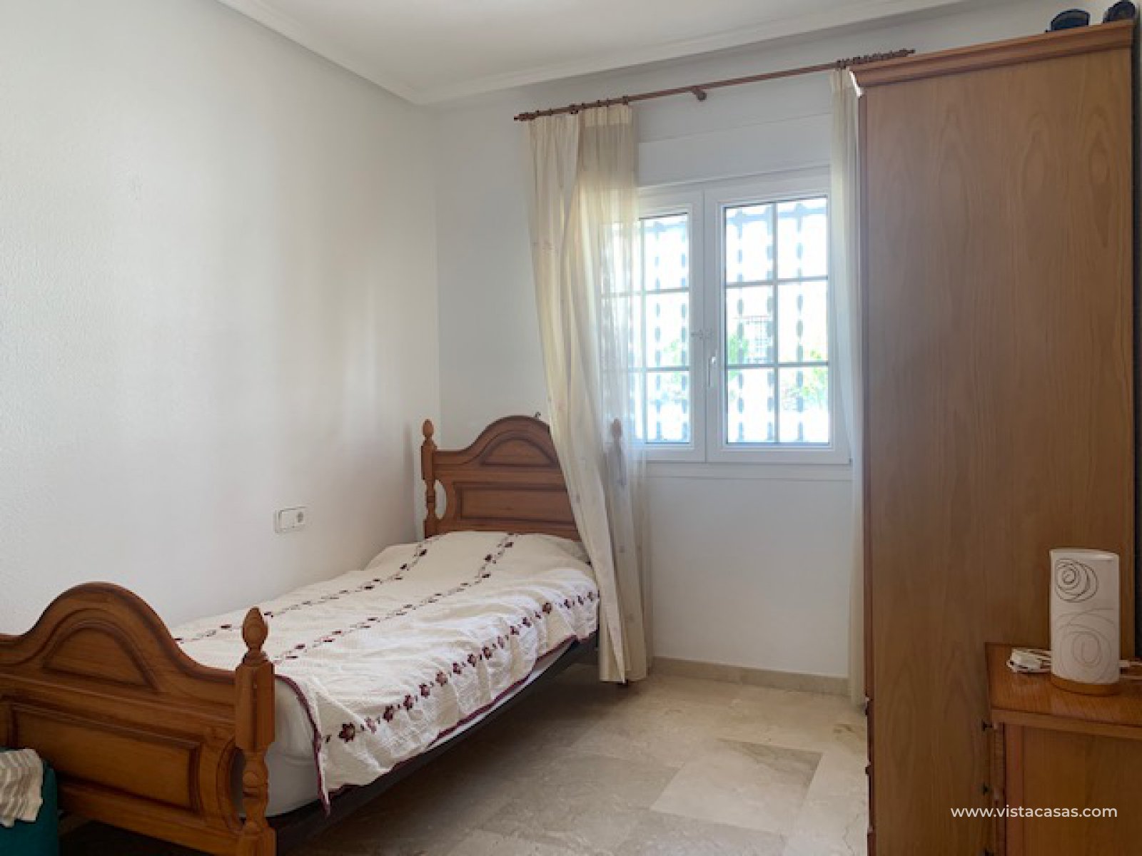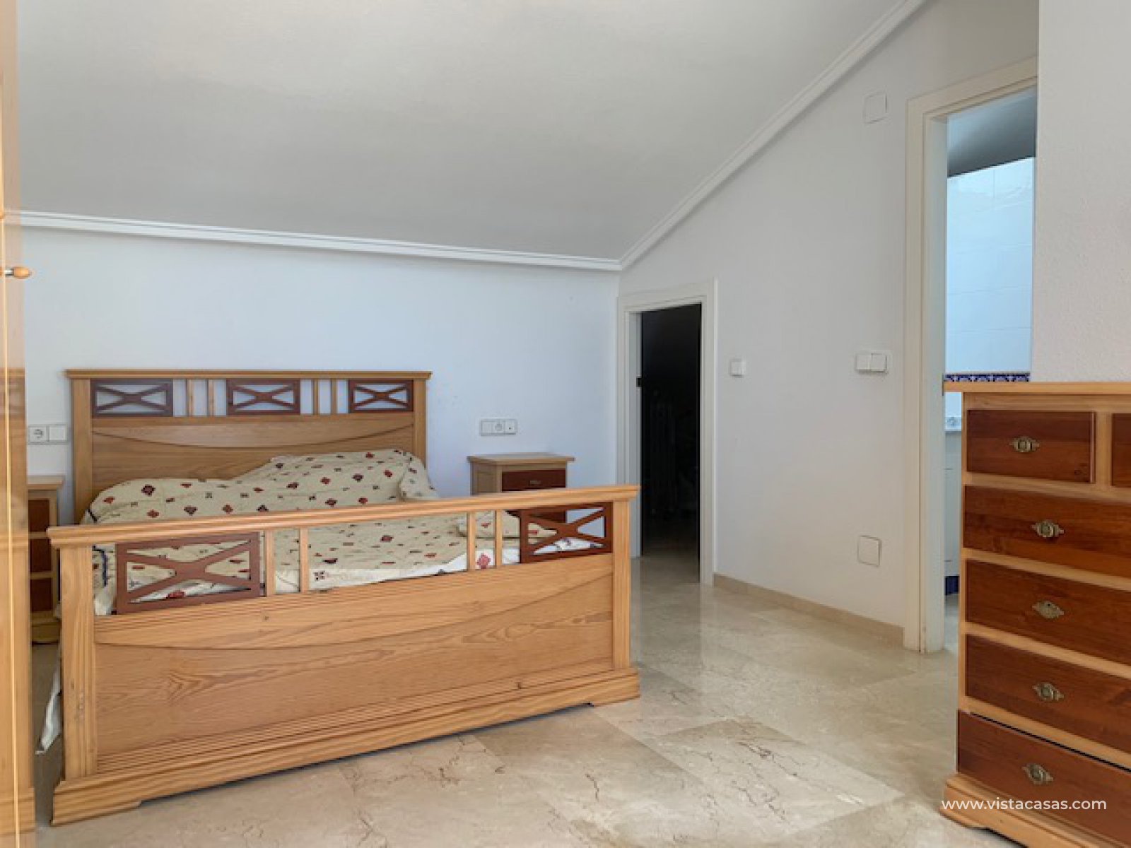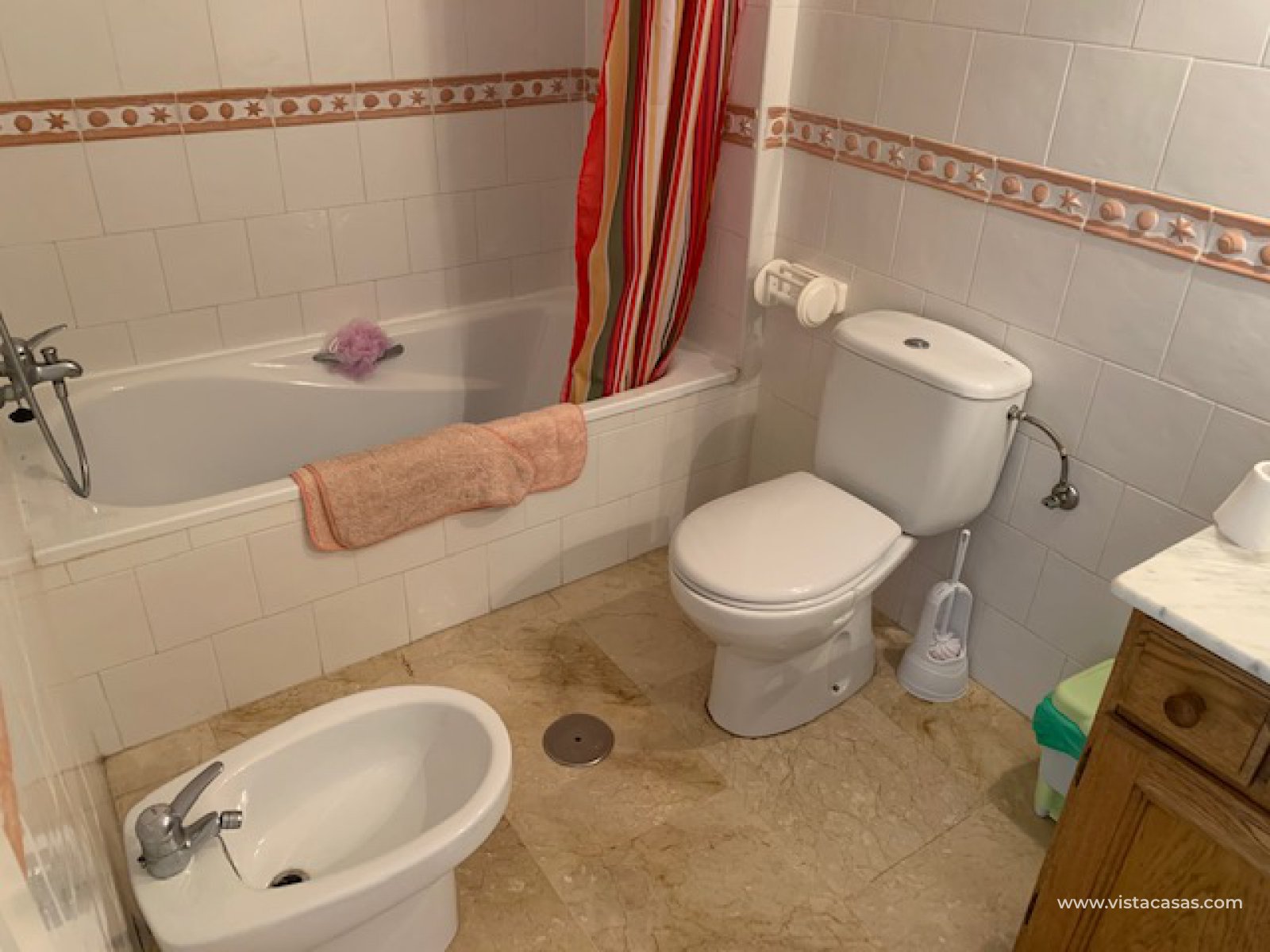 This south-east facing 3 bedrooms, 2 bathrooms Buhardilla model townhouse is situated in sought after Las Violetas, a short walk to the Golf and famous Villamartin Plaza with its many restaurants and bars, shops and supermarket. The property offers a large living area while having front and back gardens. There are 2 bedrooms on the ground floor and a master bedroom on the 1st floor. Positioned in a beautiful community with off-road parking and communal pool.