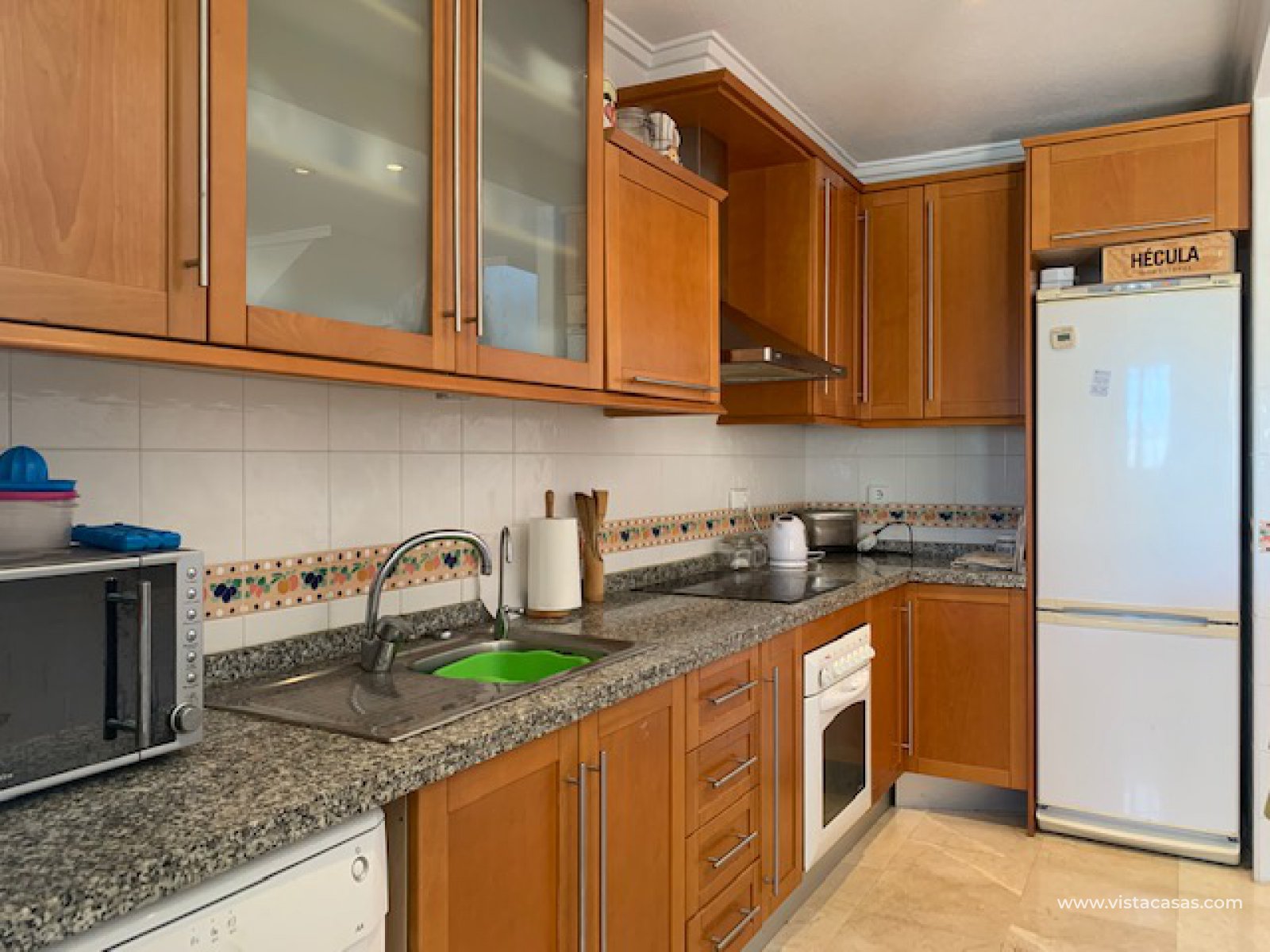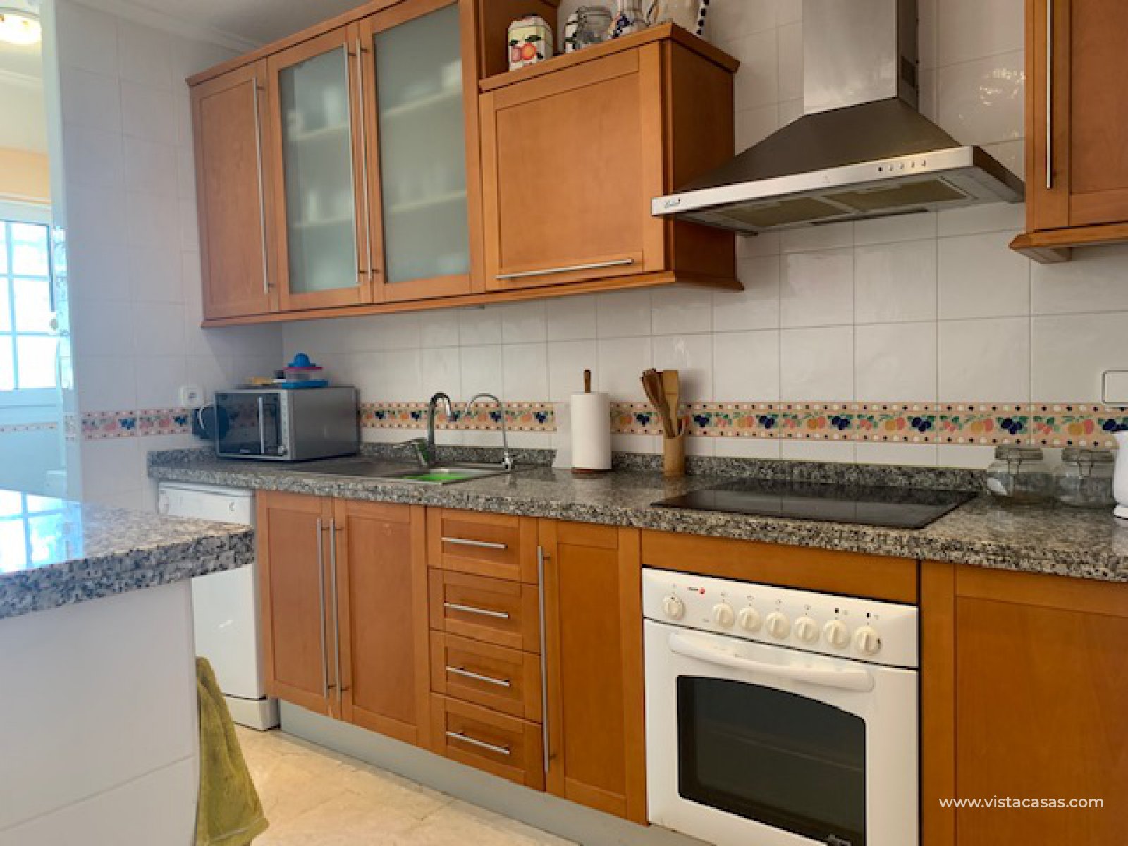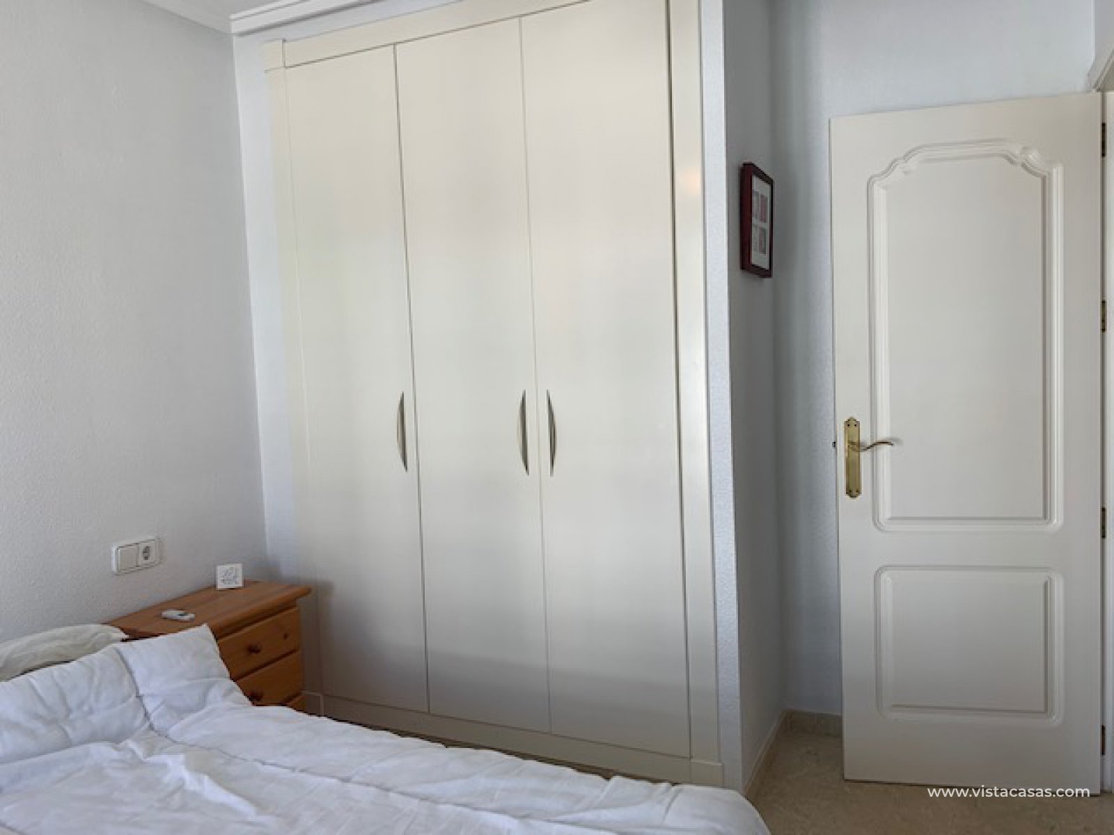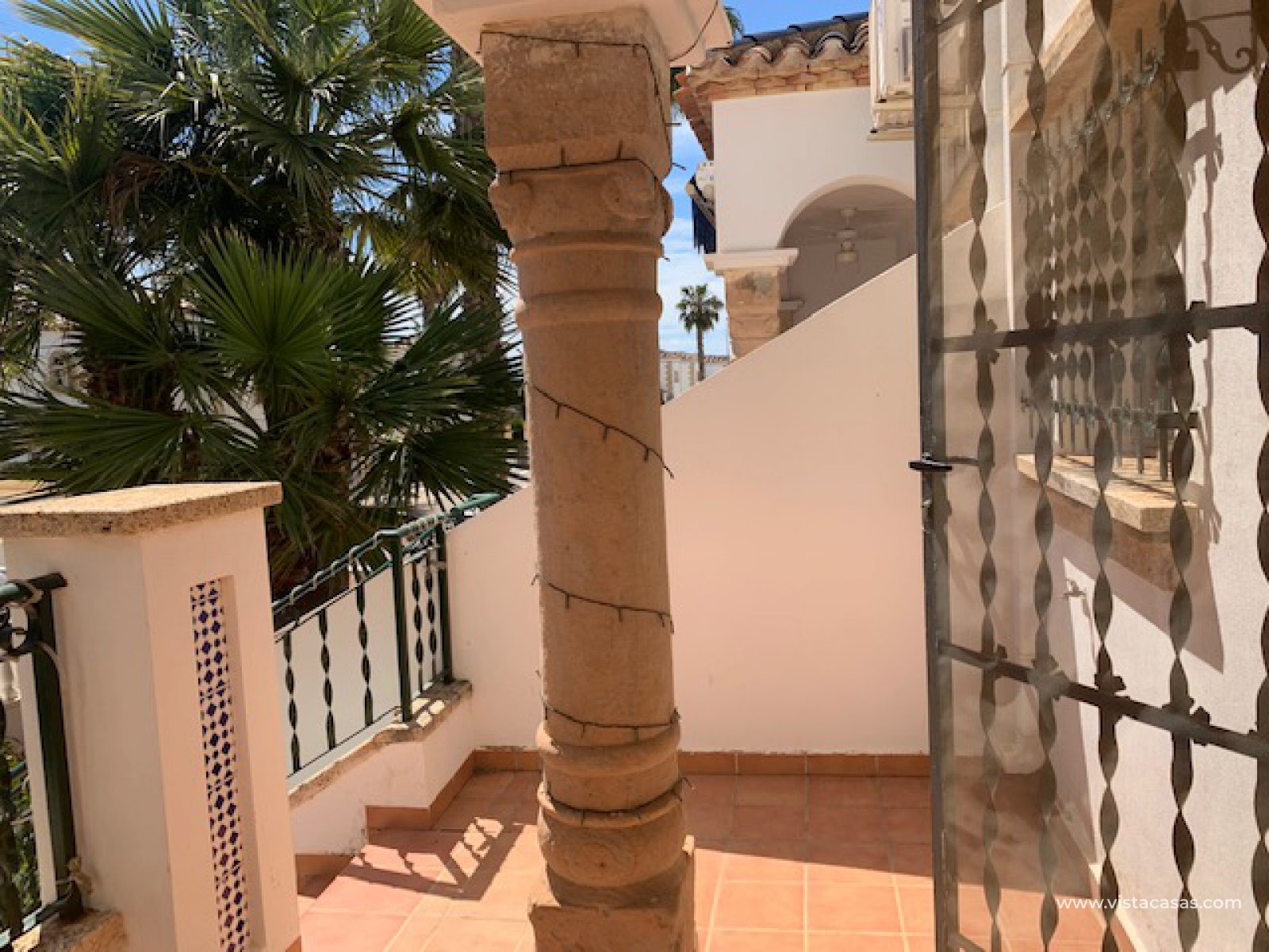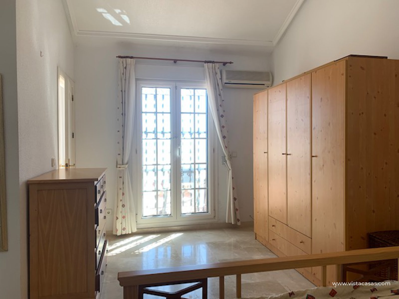 This south-east facing 3 bedrooms, 2 bathrooms Buhardilla model townhouse is situated in sought after Las Violetas, a short walk to the Golf and famous Villamartin Plaza with its many restaurants and bars, shops and supermarket. The property offers a large living area while having front and back gardens. There are 2 bedrooms on the ground floor and a master bedroom on the 1st floor. Positioned in a beautiful community with off-road parking and communal pool.