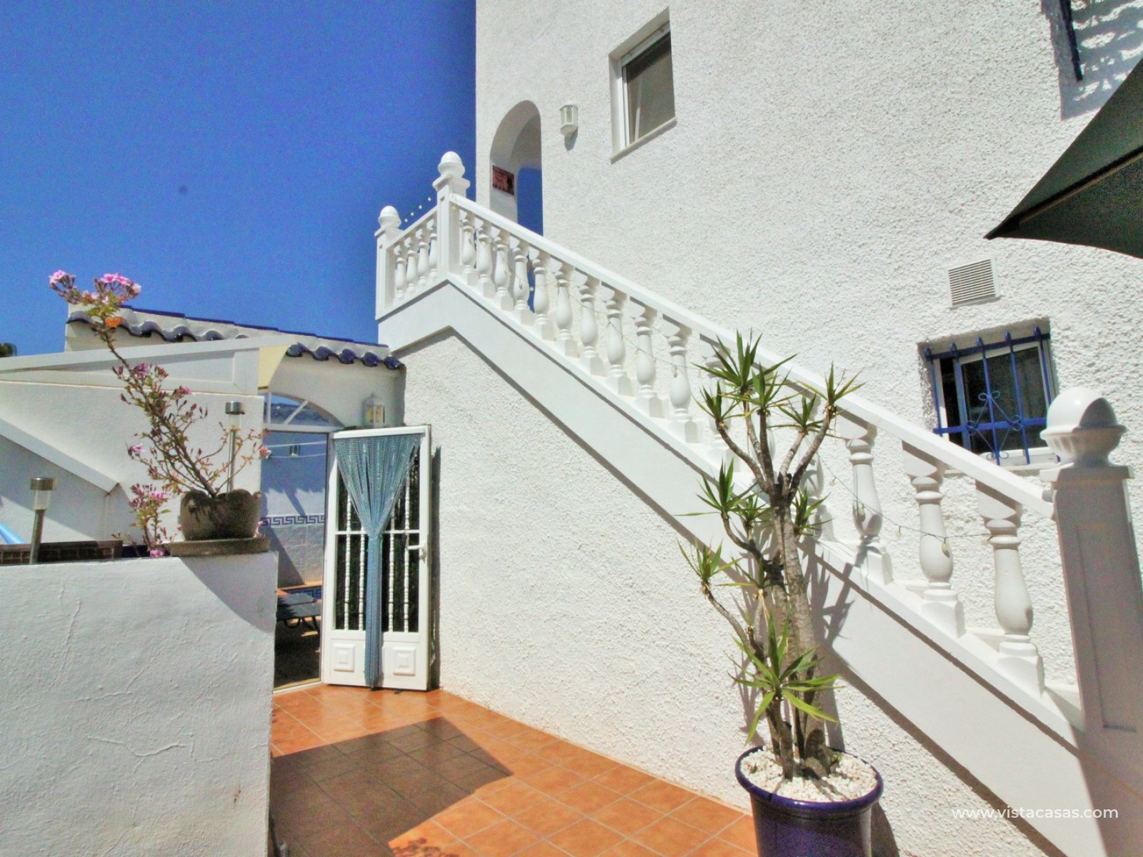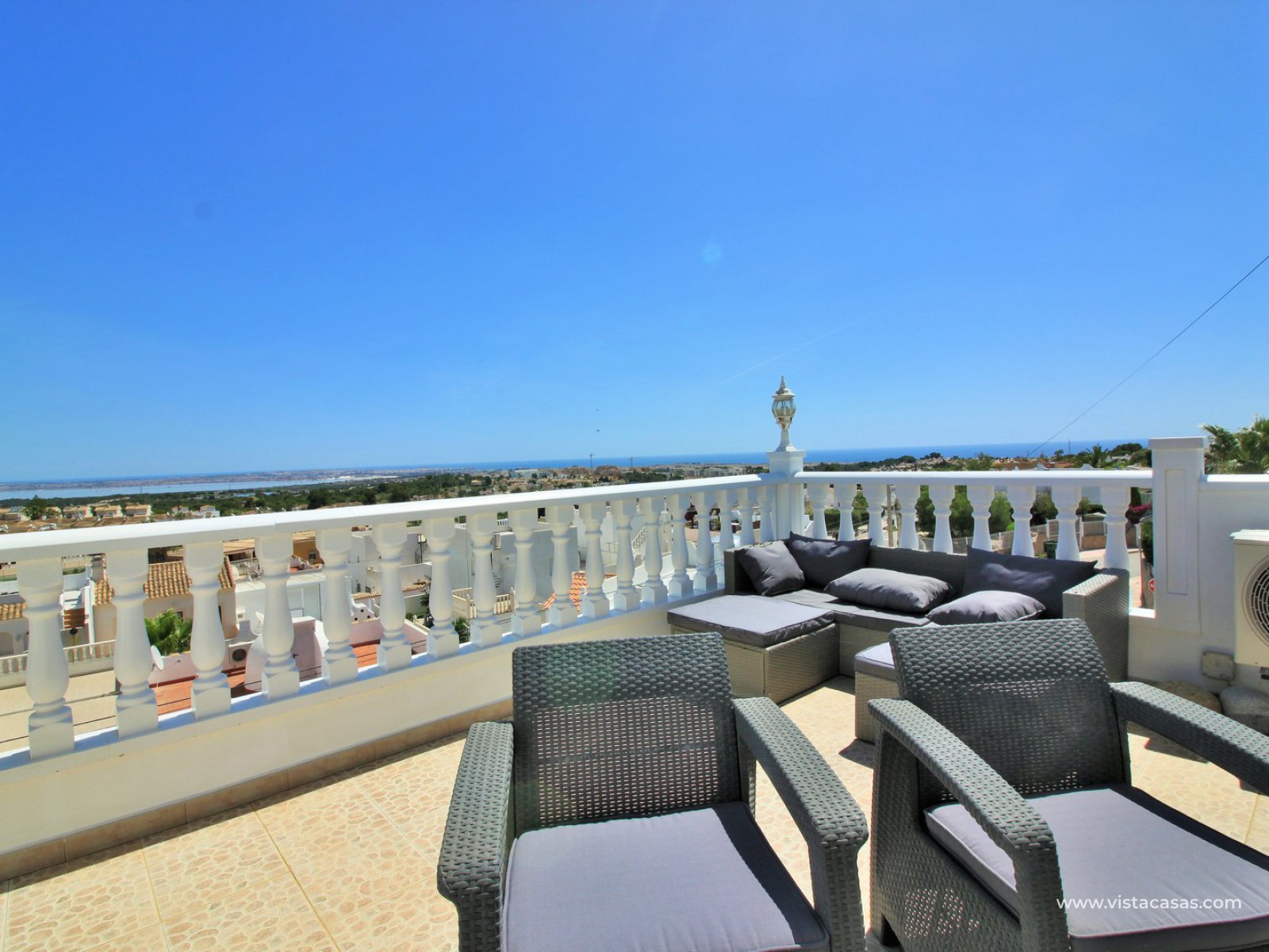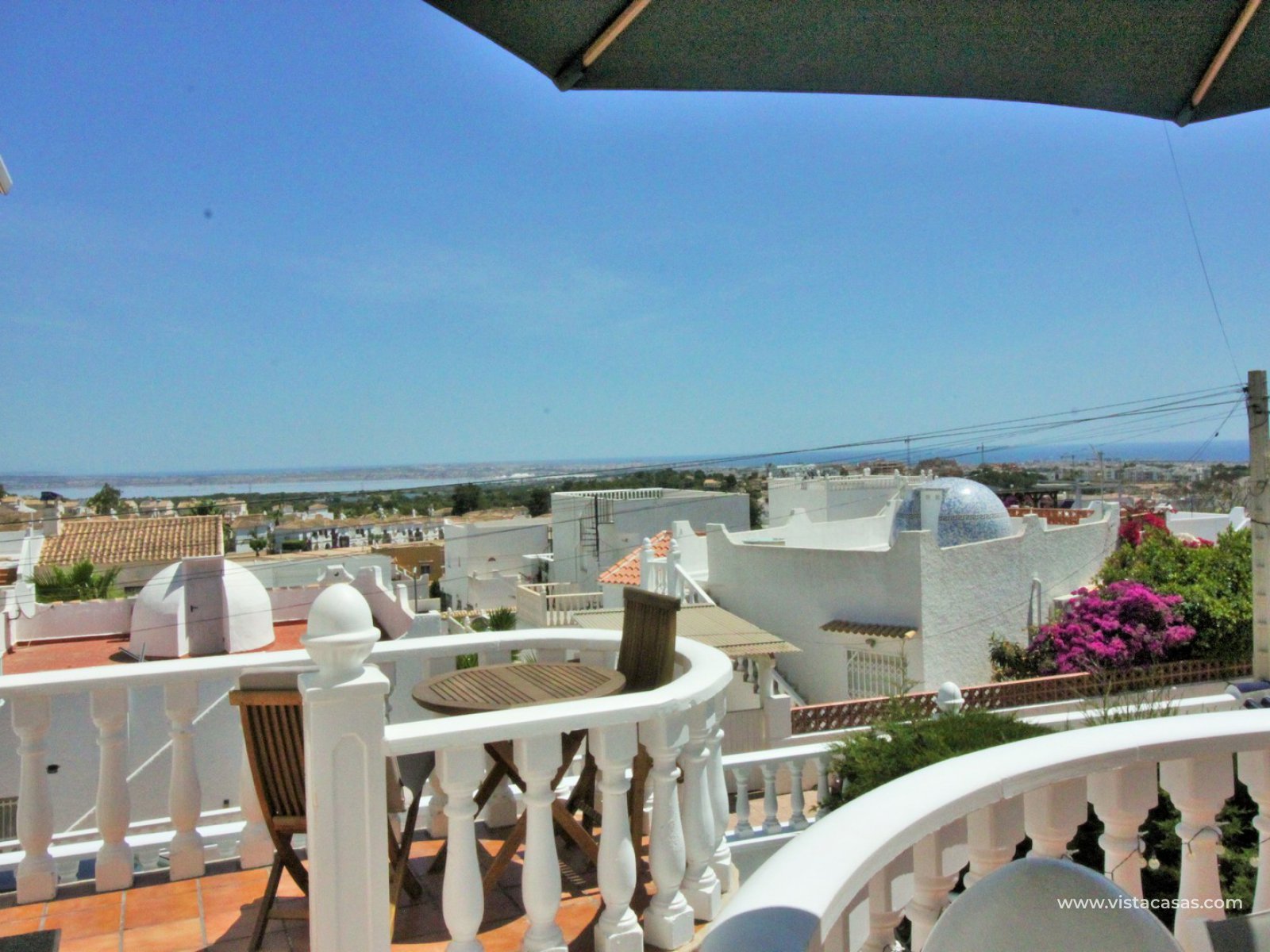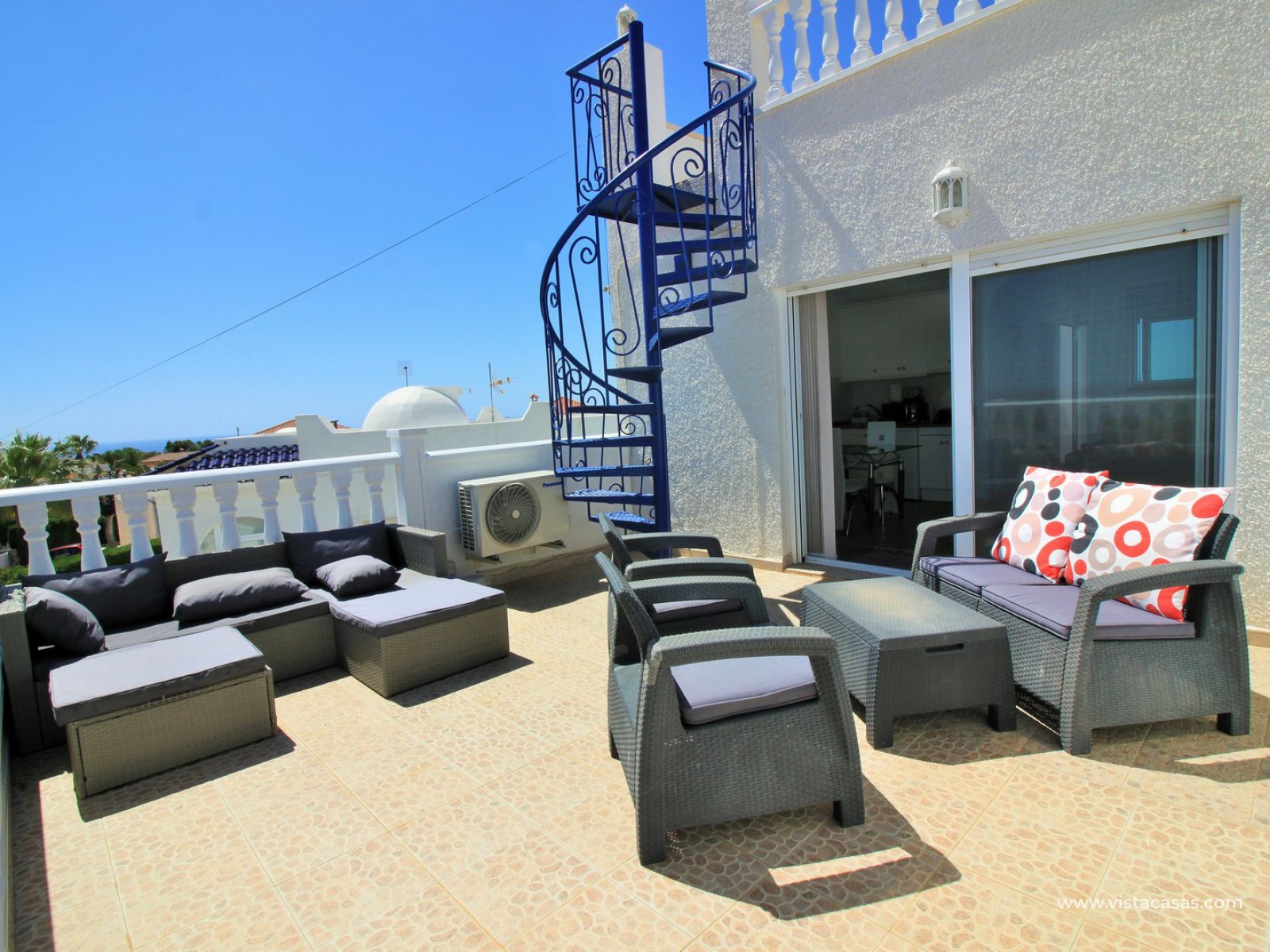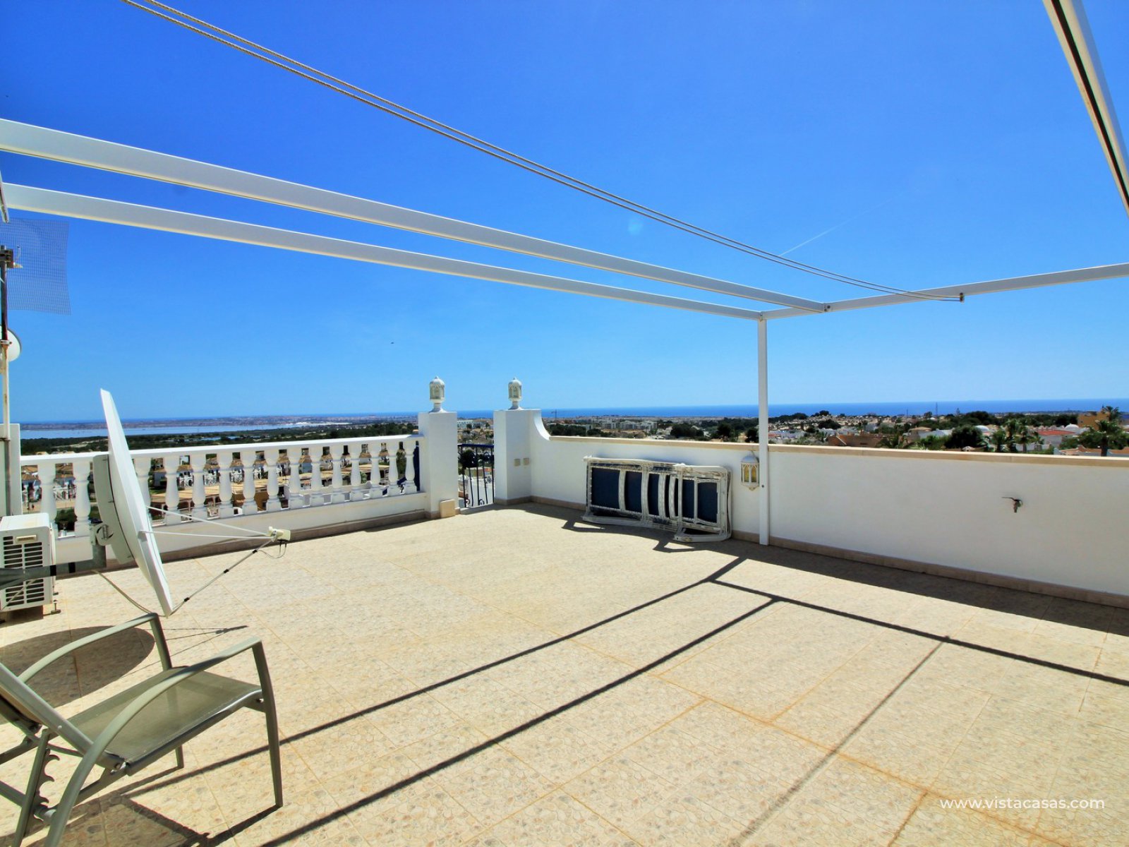 On the third level you will find the first separate annex which is accessible via an external staircase, and has an open plan lounge with dining area and kitchen, 1 bedroom with fitted wardrobes and a bathroom with corner shower. Patio doors from the living area leads to a large balcony with direct views of the salt lakes of Torrevieja and the sea. A spiral staircase leads to the roof solarium with stunning panoramic views of the Mediterranean Sea and countryside.