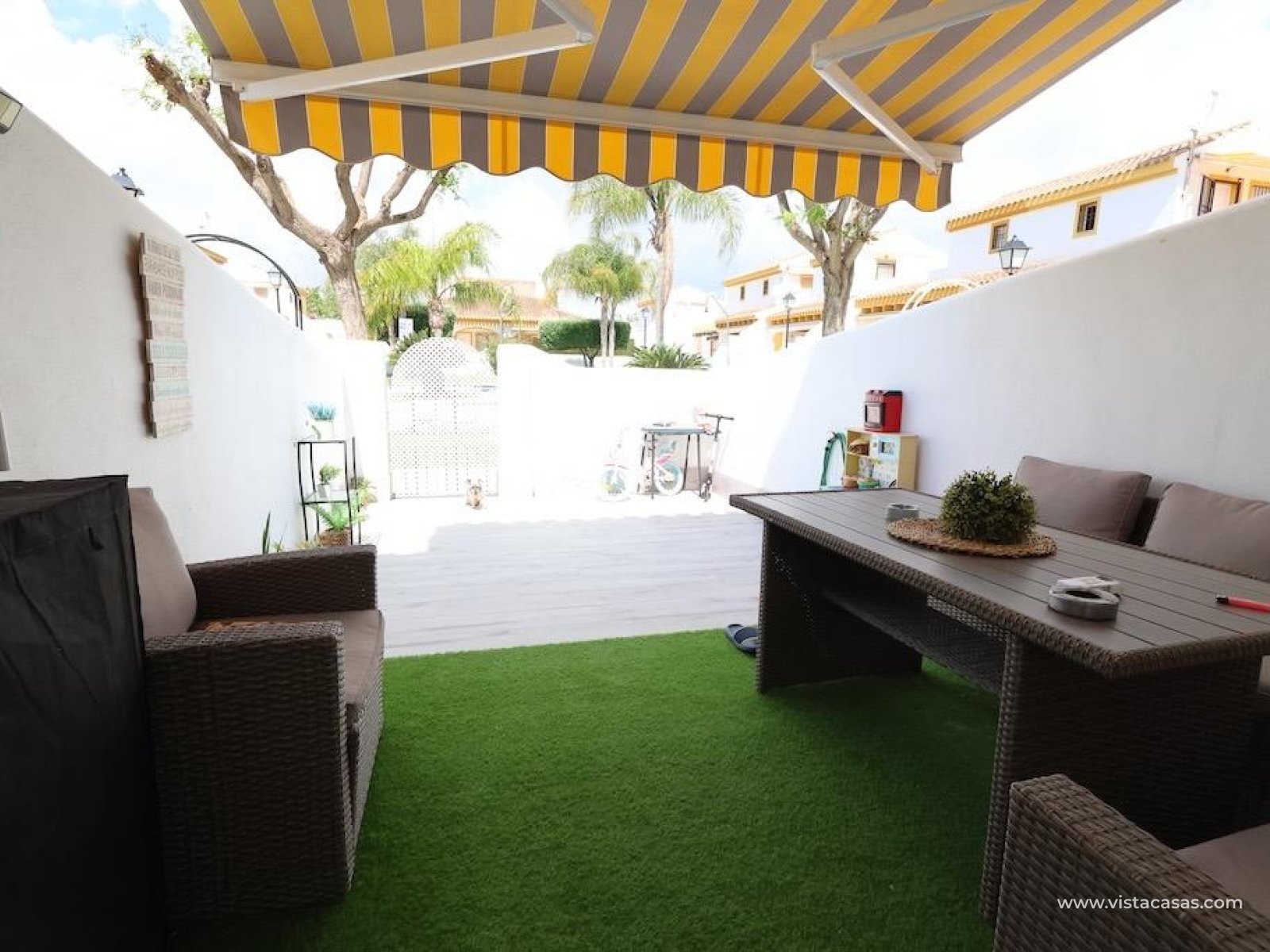 Torre de la Horadada – Residencial Cañada Real . We present this charming duplex townhouse located directly in front of the communal pool, in one of the most pleasant residential complexes in the area.. . The property offers a built area of 70 m2, distributed over two bedrooms, two bathrooms, a bright living-dining room, a fully equipped open-plan kitchen, and a spacious rear patio—ideal for laundry or storage.. . At the front, there is a large tiled terrace of approximately 20 m2 with direct access to the pool, perfect for enjoying the sun and landscaped surroundings. . The home is sold fully furnished and equipped, including air conditioning.. . The residential complex features extensive green areas and two communal pools, offering a quiet, well-maintained, and family-friendly environment just minutes from the beach and all essential services.