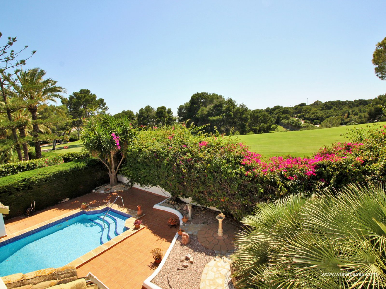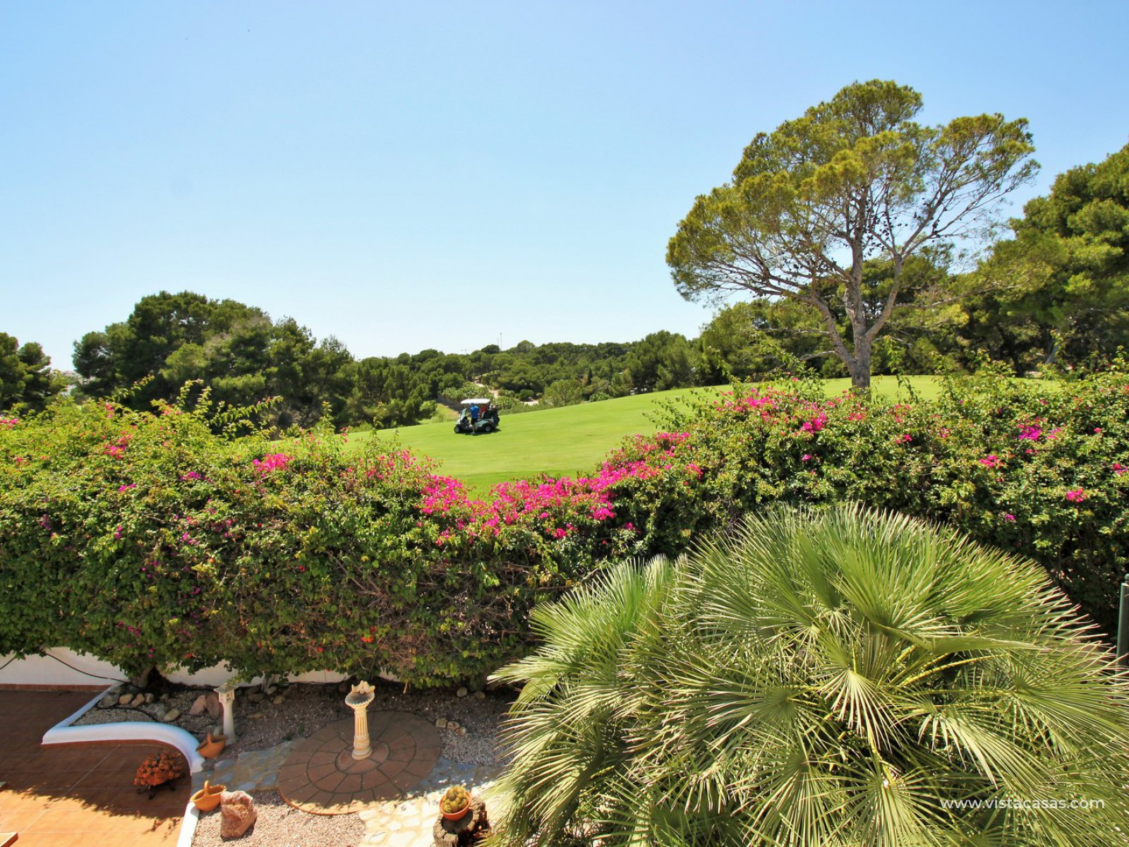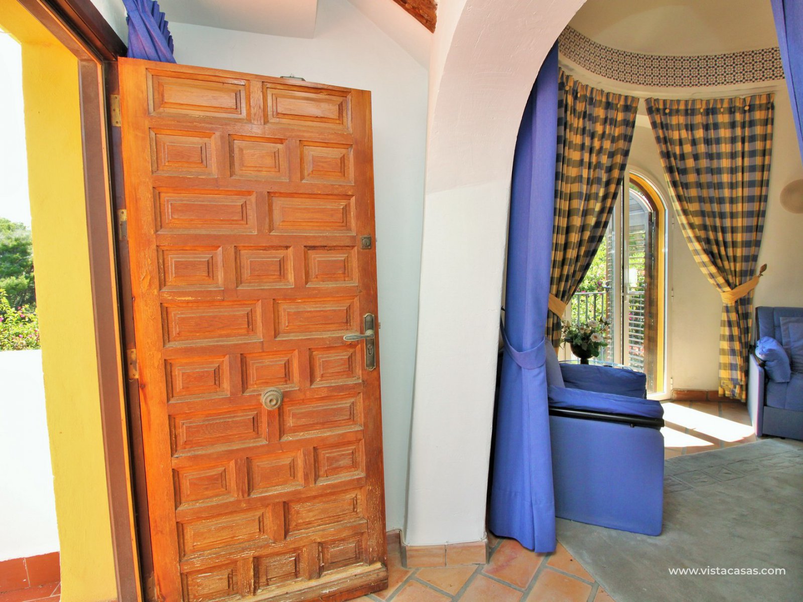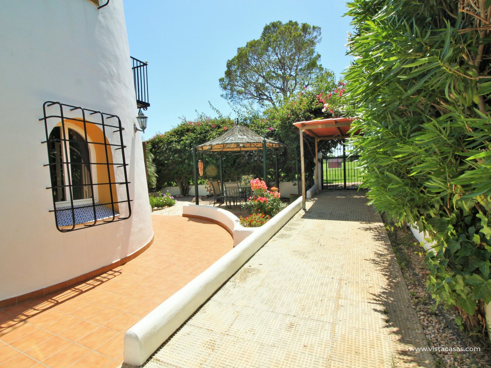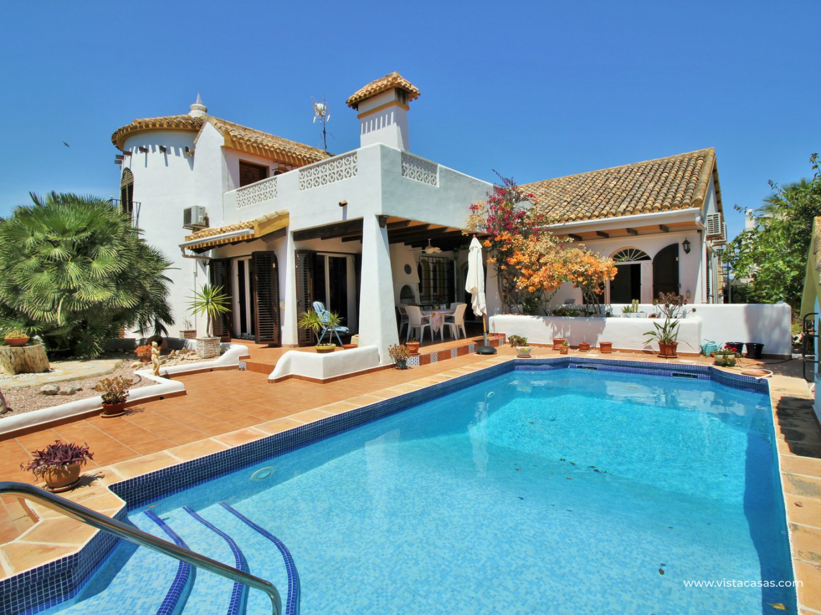 Beautiful first-line golf Mediterranean style villa directly facing the Villamartin golf course with access to the golf course from the garden. You enter the property into a large entrance hall which leads into the open lounge area with fireplace and a lovely circular dining room. There is a separate kitchen with high ceilings and a good size utility room. There are 3 bedrooms which are all located on the ground floor, with 2 of them benefitting from en-suite bathrooms, and direct access to the pool and garden area. The master bedroom also has a walk-in wardrobe. Upstairs there is a round shaped tower room with a Juliet balcony, and a roof solarium offering stunning views of the Villamartin golf course. This tower room could serve as a 4th bedroom if desired. The villa has a large garden that wraps around the entire property and offers a private pool, covered porch area with built-in BBQ, 2 seating areas with gazebo, and gated off-road parking with garage. There is a gate located at the rear of the garden with a covered parking area for a golf buggy that leads directly onto the Villamartin golf course.